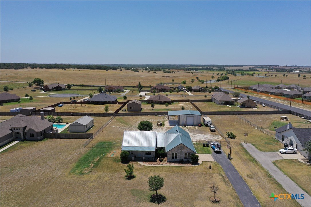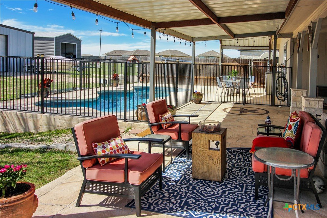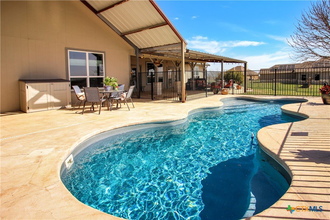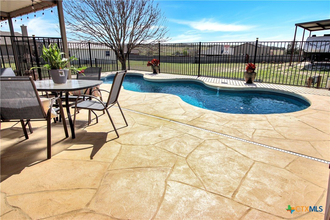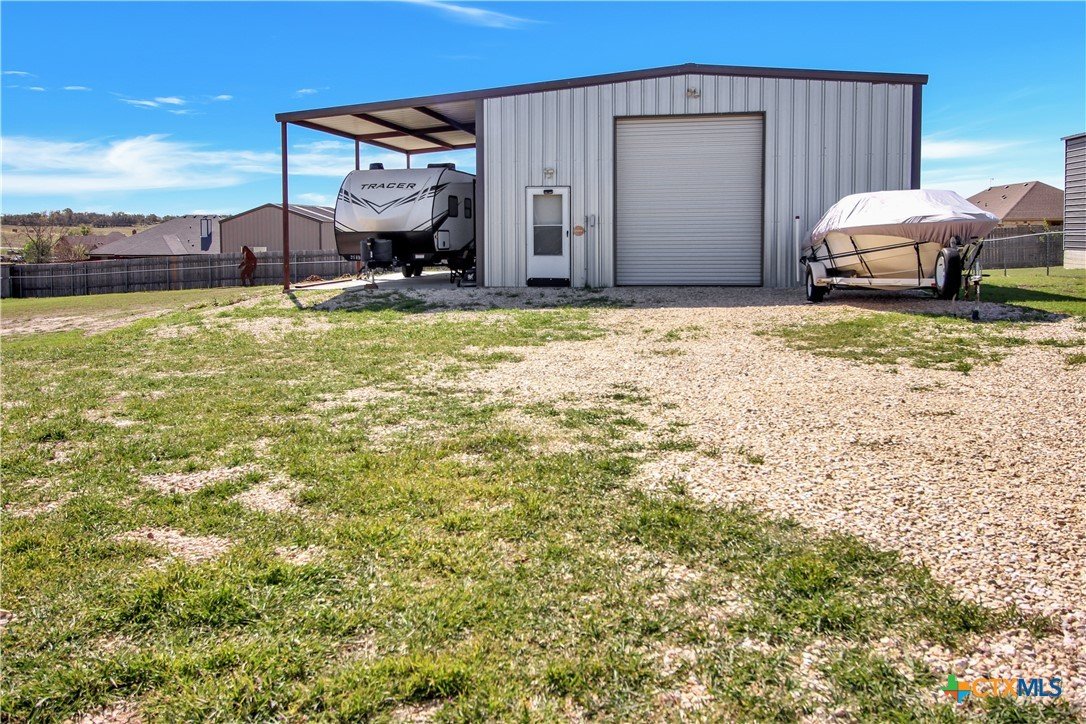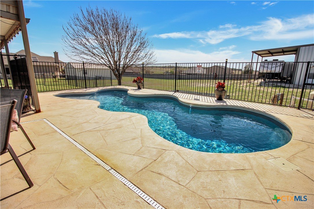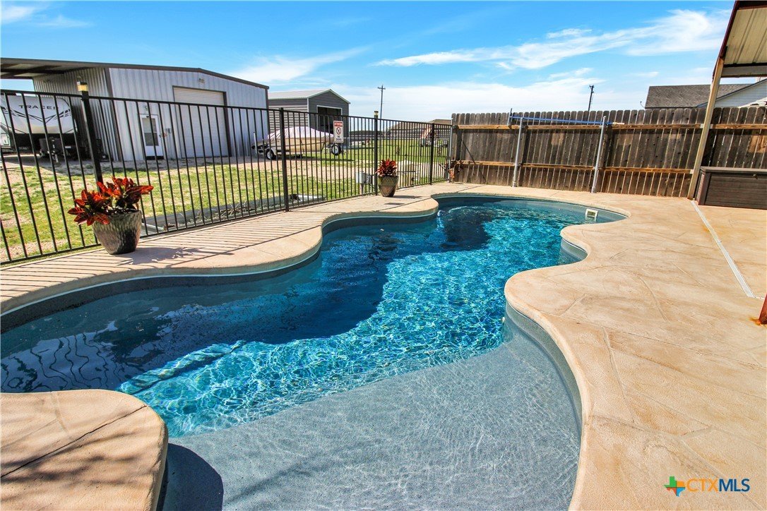 This charming home at 104 Oak Stone in the desirable community of Jarrell offers a fantastic blend of upgrades and unique features that will appeal to everyone in the family. Nestled on 1.17 acres, it boasts a 30x30 metal shop with a 15-foot lean-to, perfect for shielding your RV or recreational vehicles from the Texas sun. With two RV hookups—one for you and one for your guests—there's plenty of space for everyone to enjoy. Step outside to an expansive extended patio and a sparkling saltwater pool, perfect for those warm Texas summers. The rod iron fencing around the pool ensures safety for pets and small children. Additional highlights include solar panels, new windows throughout, gutters, a storm shelter storm door, and a 2024 hot water heater. The custom blinds, tile floors, and stainless steel appliances add an extra touch of elegance. The inclusion of 2 community swimming pools, sports courts, playgrounds, and walking trails makes it a well-rounded place for recreation and socializing. This home is truly one of a kind, with NO active HOA, and a must-see for anyone seeking comfort, style, and functionality!