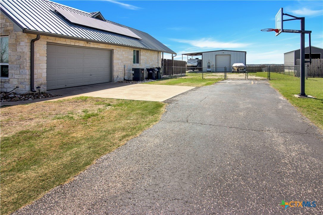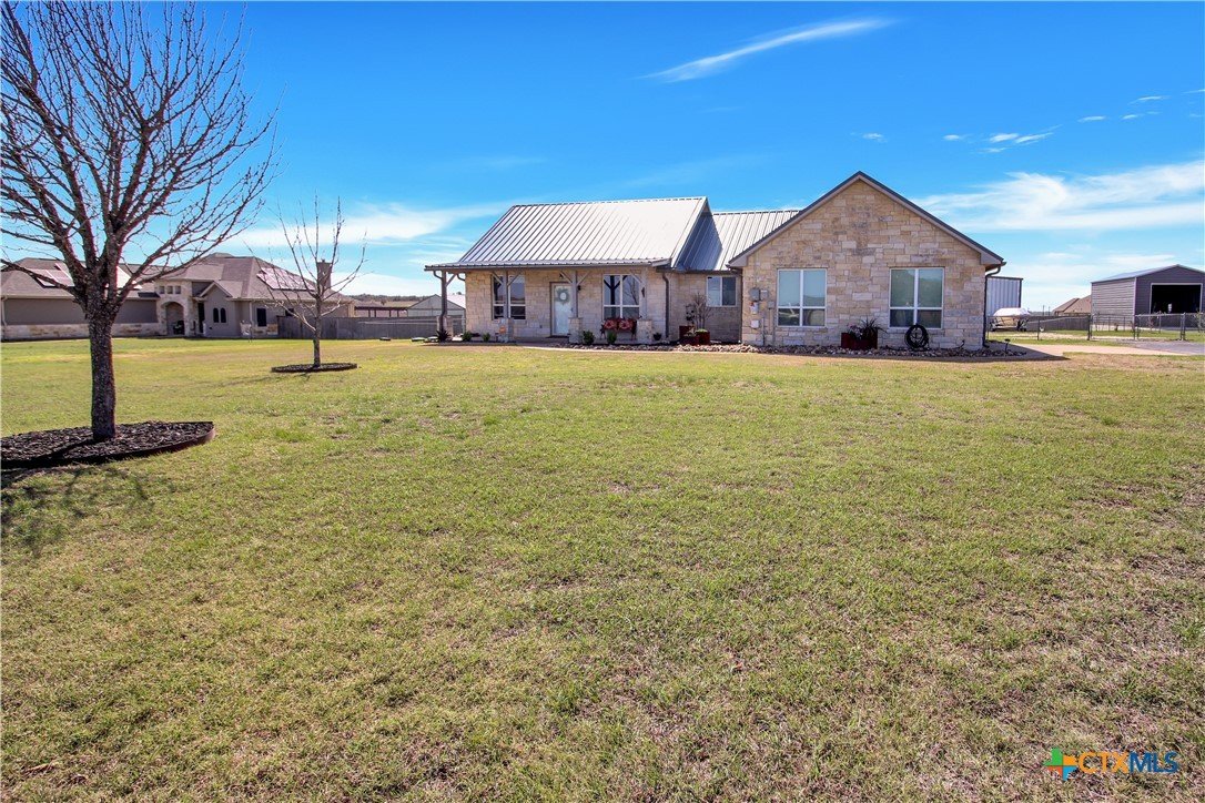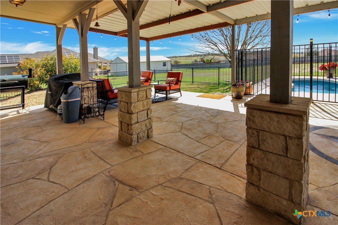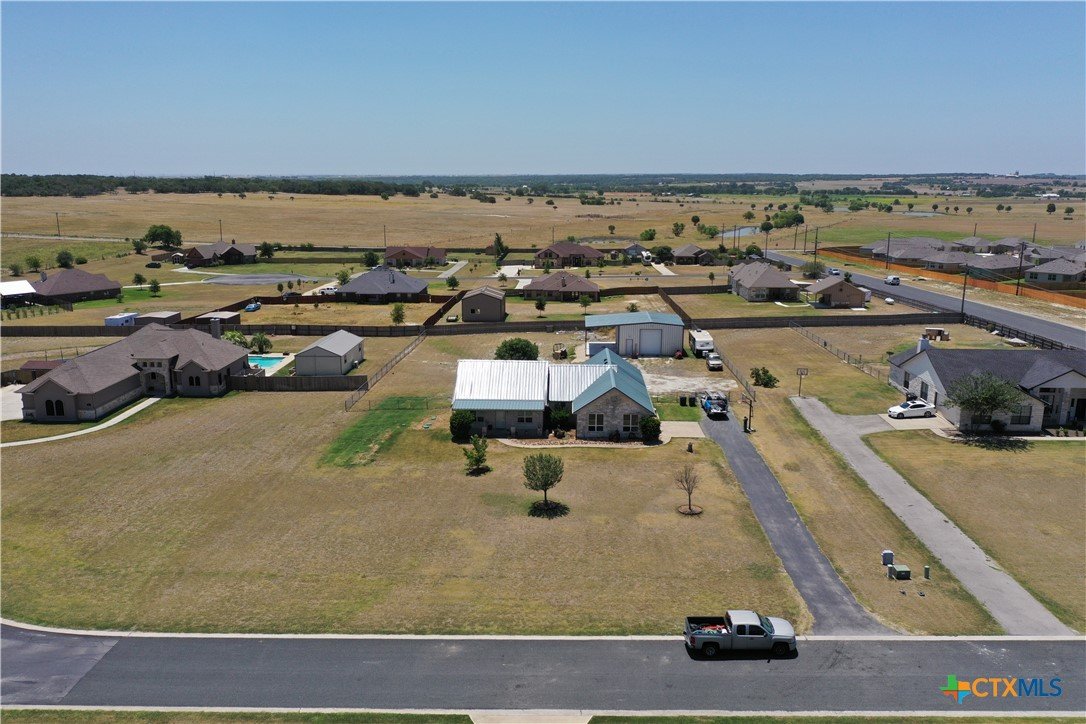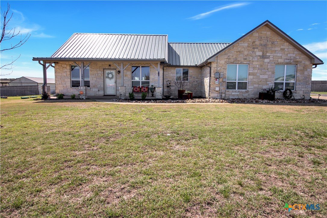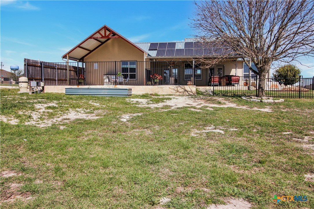 This charming home at 104 Oak Stone in the desirable community of Jarrell offers a fantastic blend of upgrades and unique features that will appeal to everyone in the family. Nestled on 1.17 acres, it boasts a 30x30 metal shop with a 15-foot lean-to, perfect for shielding your RV or recreational vehicles from the Texas sun. With two RV hookups—one for you and one for your guests—there's plenty of space for everyone to enjoy. Step outside to an expansive extended patio and a sparkling saltwater pool, perfect for those warm Texas summers. The rod iron fencing around the pool ensures safety for pets and small children. Additional highlights include solar panels, new windows throughout, gutters, a storm shelter storm door, and a 2024 hot water heater. The custom blinds, tile floors, and stainless steel appliances add an extra touch of elegance. The inclusion of 2 community swimming pools, sports courts, playgrounds, and walking trails makes it a well-rounded place for recreation and socializing. This home is truly one of a kind, with NO active HOA, and a must-see for anyone seeking comfort, style, and functionality!
