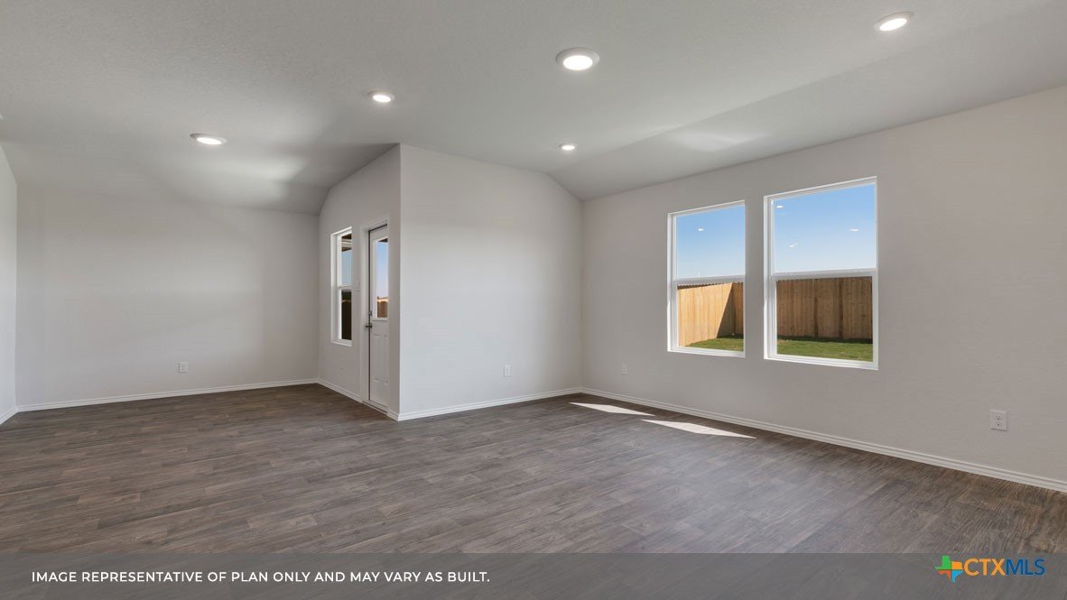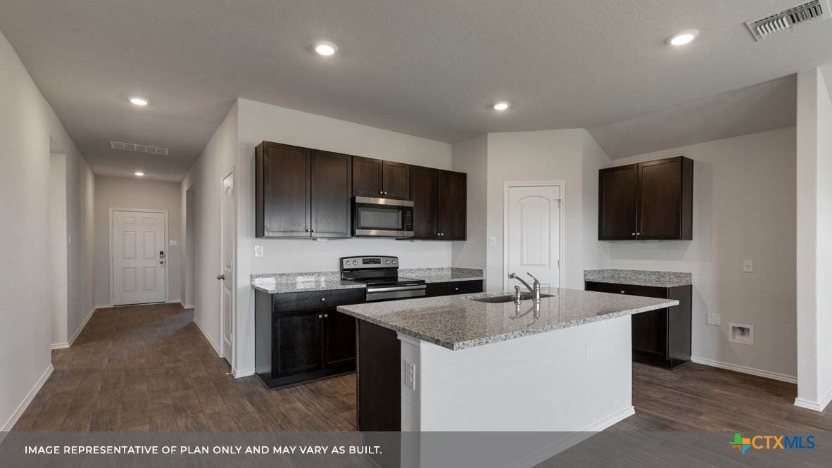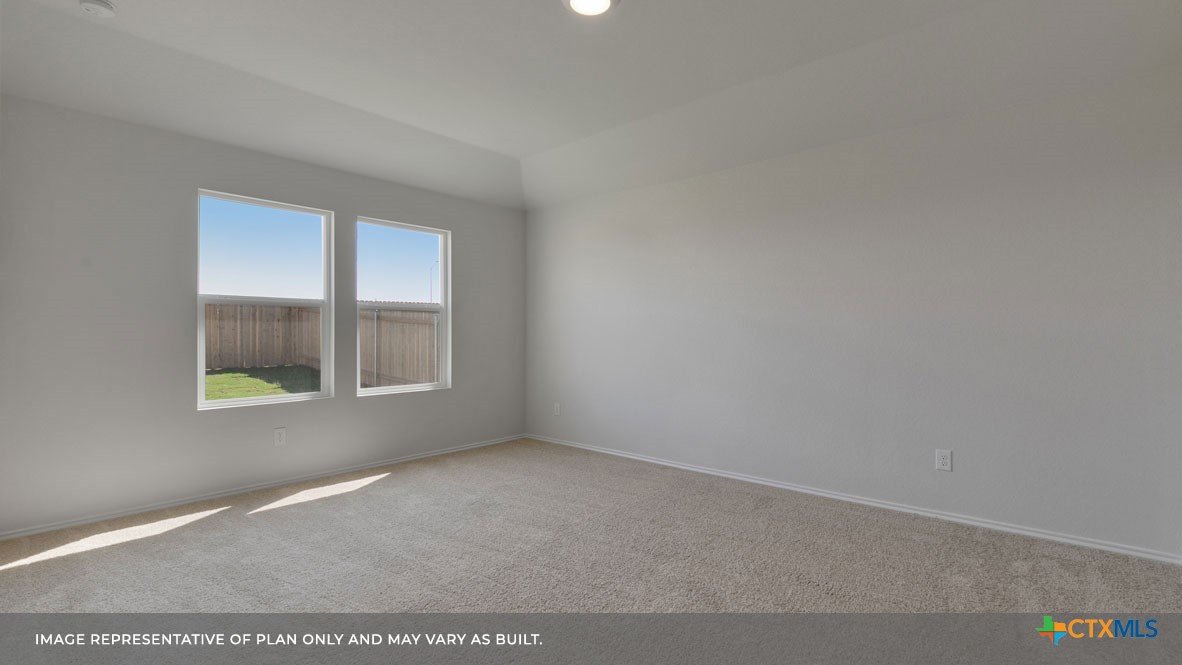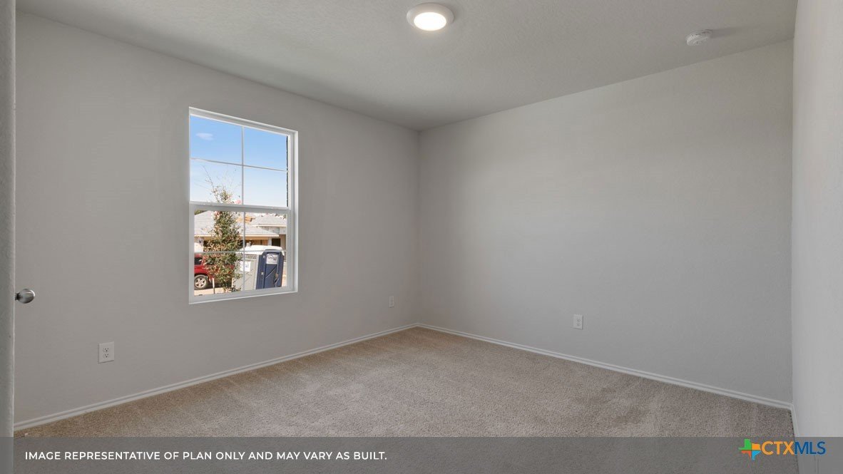 MOVE IN READY! INCLUDES REFRIGERATOR, BLINDS, GARAGE DOOR OPENER AND WASHER/DRYER ALONG WITH STANDARD APPLIANCE PACKAGE. The Irvine is one of our one-story floorplans offered at Arroyo Ranch in Seguin, Texas. This 4-bedroom, 2-bathroom home includes a 2-car garage within its 1,796 square feet of comfortable living space. Step into this home from the covered entryway and make your way down the hall to the main living space. The open kitchen looks out to your dining area and family room, allowing for conversations to easily flow from all spaces. The L-shaped kitchen includes granite countertops, a large island with an undermount sink, a corner pantry closet, stainless-steel appliances and 36’’ upper cabinets. Off the family room is the primary bedroom, with its own private bathroom. This relaxing bathroom space features a 5’ walk in shower, double sink vanity, private toilet area with a door, and an oversized walk-in closet. At the front of the house, you will find bedroom 2 and 3, with the secondary bathroom conveniently located between the rooms. Bathroom 2 includes a tub/shower combination and open shelving for extra storage or décor. Across the foyer and down a short hall is the utility room and bedroom 4. Whether you use these rooms as an office, child’s room or guest room, there is enough space for work, sleep, and play. The Irvine includes vinyl flooring throughout the common areas of the home, and carpet in the bedrooms. All our new homes feature a covered back patio, full sod, and an irrigation system in the front and back yard, and a 6’ privacy fence around the back yard. This home includes our America’s Smart Home base package, which includes the Amazon Echo Pop, Front Doorbell, Front Door Deadbolt Lock, Home Hub, Thermostat, and Deako® Smart Switches.