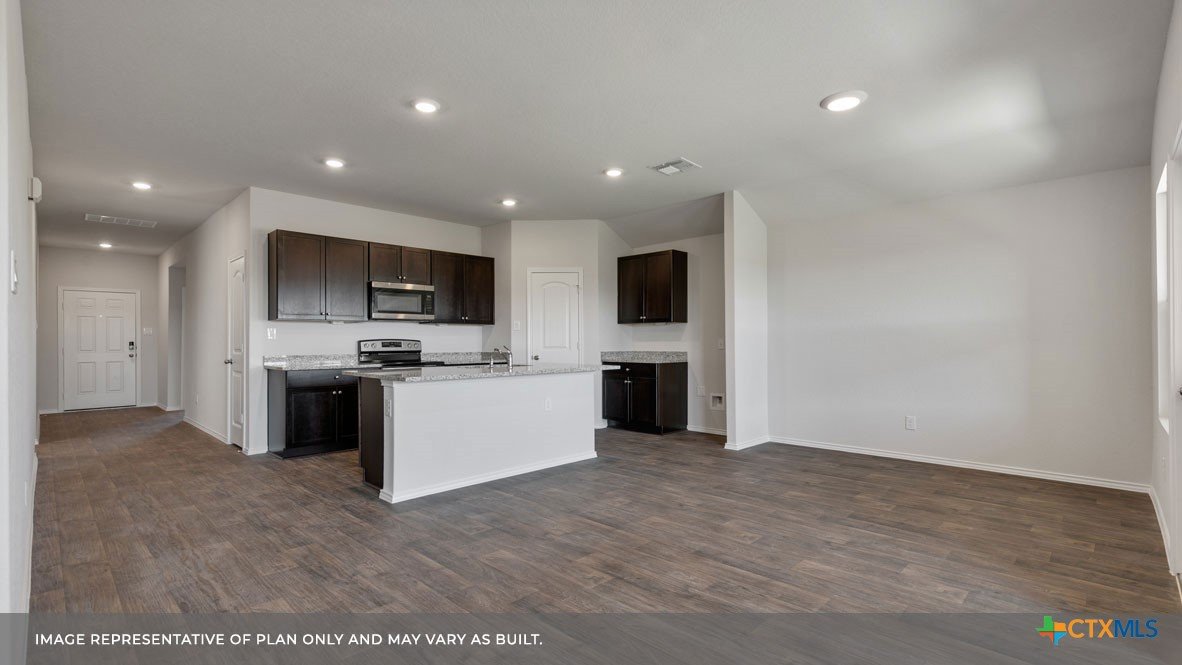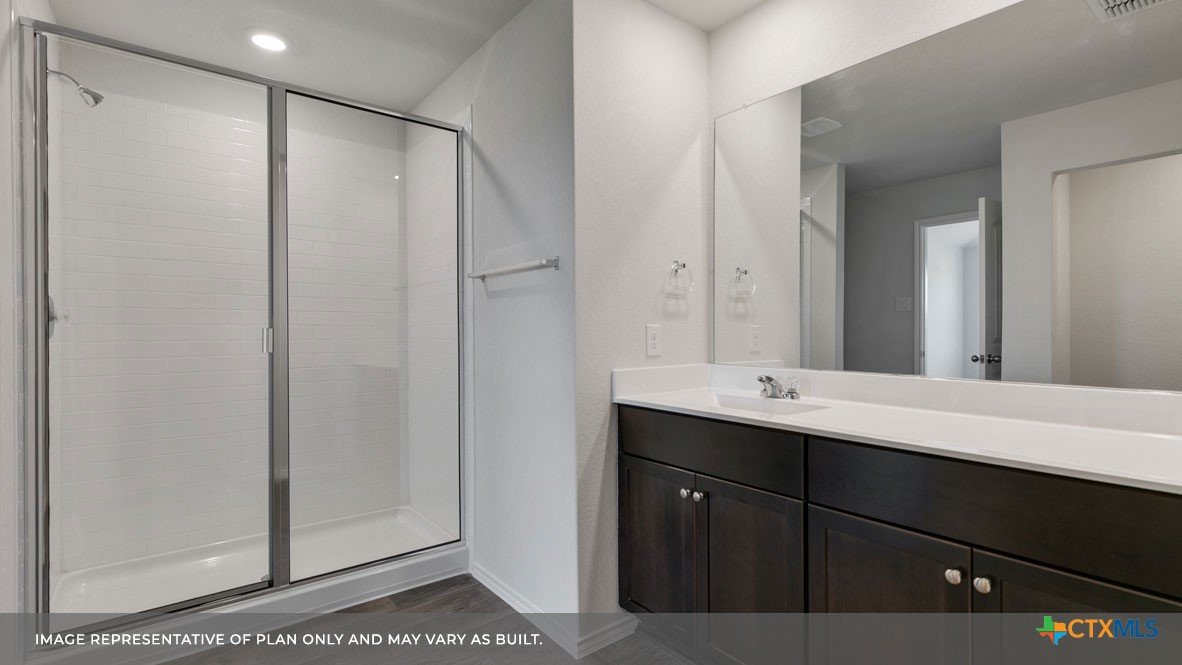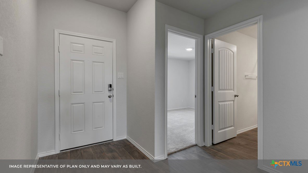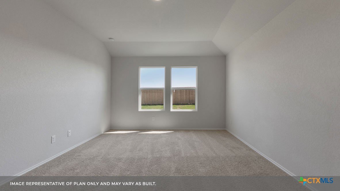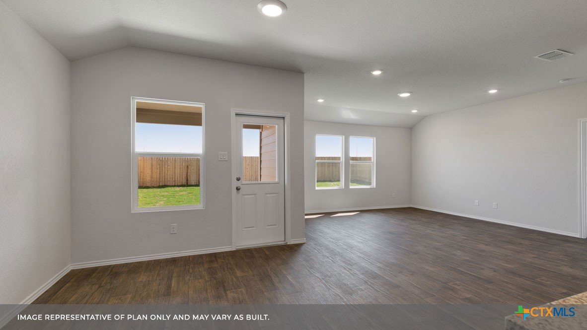 MOVE IN READY! INCLUDES REFRIGERATOR, BLINDS, GARAGE DOOR OPENER AND WASHER/DRYER ALONG WITH STANDARD APPLIANCE PACKAGE. The Irvine is one of our one-story floorplans offered at Arroyo Ranch in Seguin, Texas. This 4-bedroom, 2-bathroom home includes a 2-car garage within its 1,796 square feet of comfortable living space. Step into this home from the covered entryway and make your way down the hall to the main living space. The open kitchen looks out to your dining area and family room, allowing for conversations to easily flow from all spaces. The L-shaped kitchen includes granite countertops, a large island with an undermount sink, a corner pantry closet, stainless-steel appliances and 36’’ upper cabinets. Off the family room is the primary bedroom, with its own private bathroom. This relaxing bathroom space features a 5’ walk in shower, double sink vanity, private toilet area with a door, and an oversized walk-in closet. At the front of the house, you will find bedroom 2 and 3, with the secondary bathroom conveniently located between the rooms. Bathroom 2 includes a tub/shower combination and open shelving for extra storage or décor. Across the foyer and down a short hall is the utility room and bedroom 4. Whether you use these rooms as an office, child’s room or guest room, there is enough space for work, sleep, and play. The Irvine includes vinyl flooring throughout the common areas of the home, and carpet in the bedrooms. All our new homes feature a covered back patio, full sod, and an irrigation system in the front and back yard, and a 6’ privacy fence around the back yard. This home includes our America’s Smart Home base package, which includes the Amazon Echo Pop, Front Doorbell, Front Door Deadbolt Lock, Home Hub, Thermostat, and Deako® Smart Switches.
