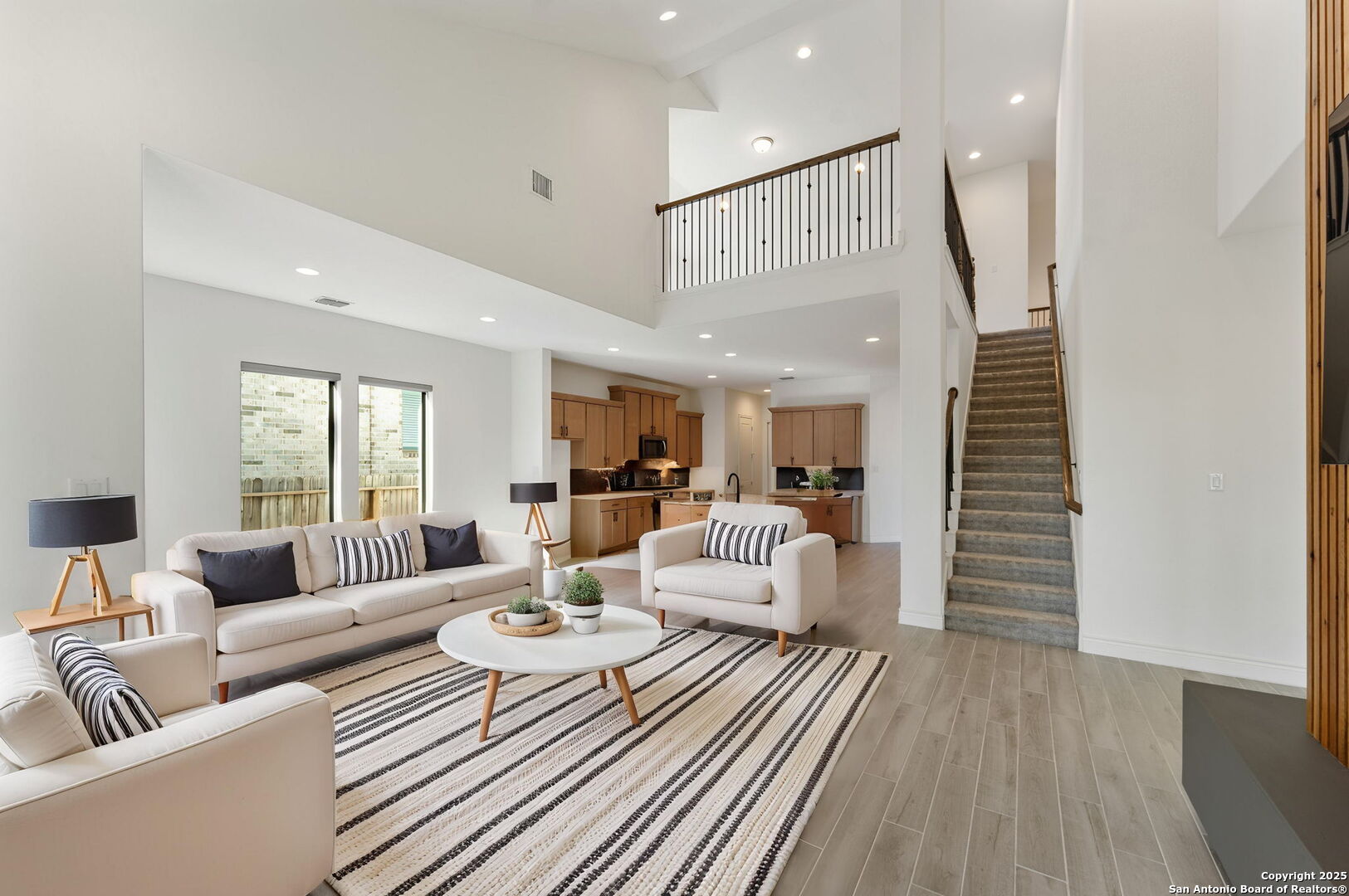 OPEN HOUSE Sunday 4/13 from 12:00-2:00PM! Welcome to 1041 Cadogan Squire, a striking two-story 4 bedroom, 3 bathroom home nestled in the Sunday Creek at Kinder Ranch community. This property offers standout curb appeal with a welcoming entry and mature landscaping. Step inside to an open-concept layout filled with natural light from tall, expansive windows and anchored by a modern wood-accented fireplace in the living room. The spacious kitchen is both stylish and functional, featuring a large center island, natural wood cabinetry, and a beautifully updated backsplash. The first-floor primary suite offers a relaxing retreat with a generous layout, soaking tub, separate shower, and dual vanities. Upstairs, a flex room overlooks the main living area, adding a touch of architectural charm and extra versatility. Additional bedrooms and baths provide ample space throughout the home. A water softener is also installed, adding convenience and comfort to this already exceptional home. Out back, the large, beautifully maintained yard is shaded by mature trees and includes a sprinkler system. With access to community amenities like, a pool, clubhouse, and park, this home perfectly balances comfort, design, and location!