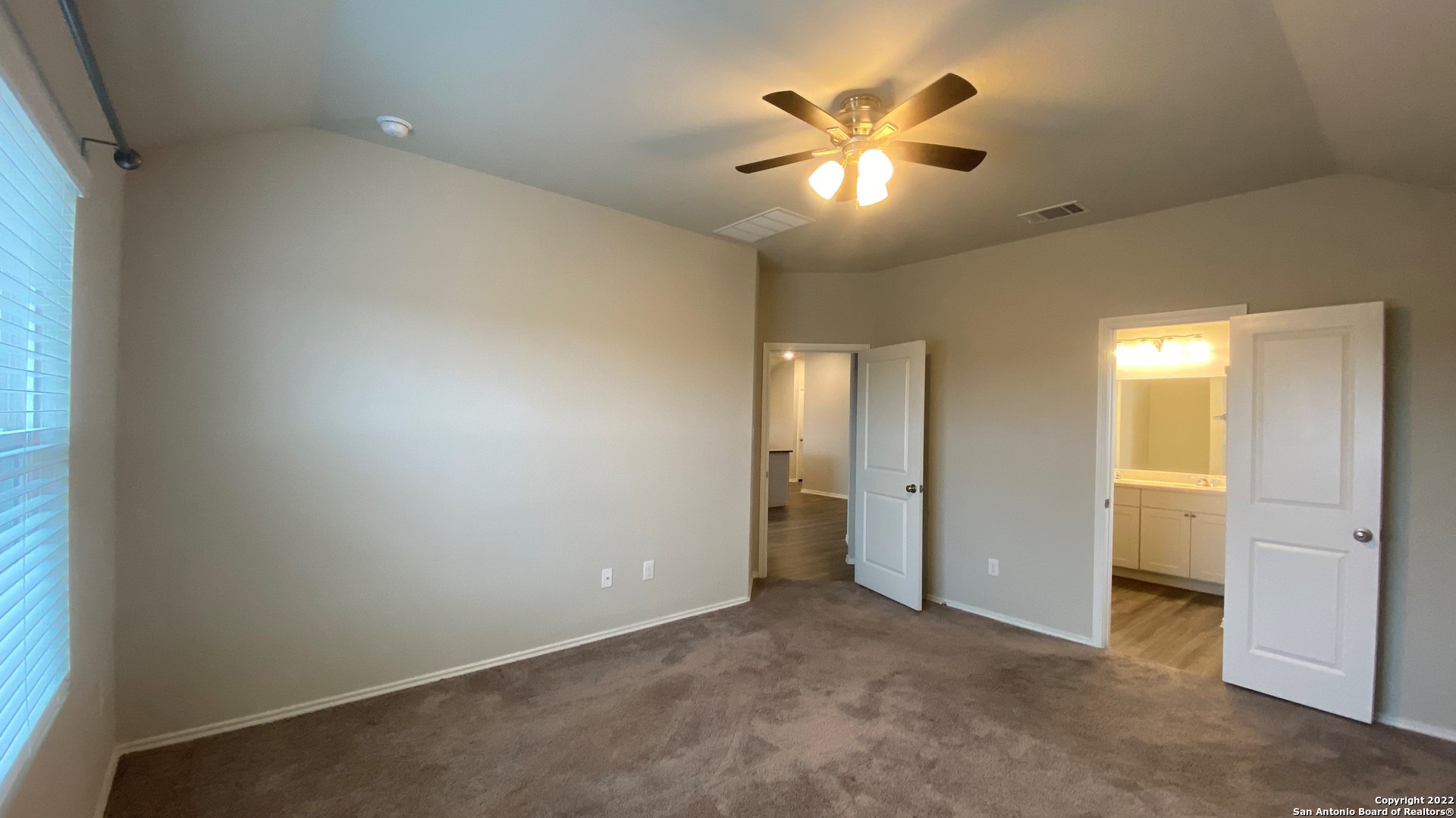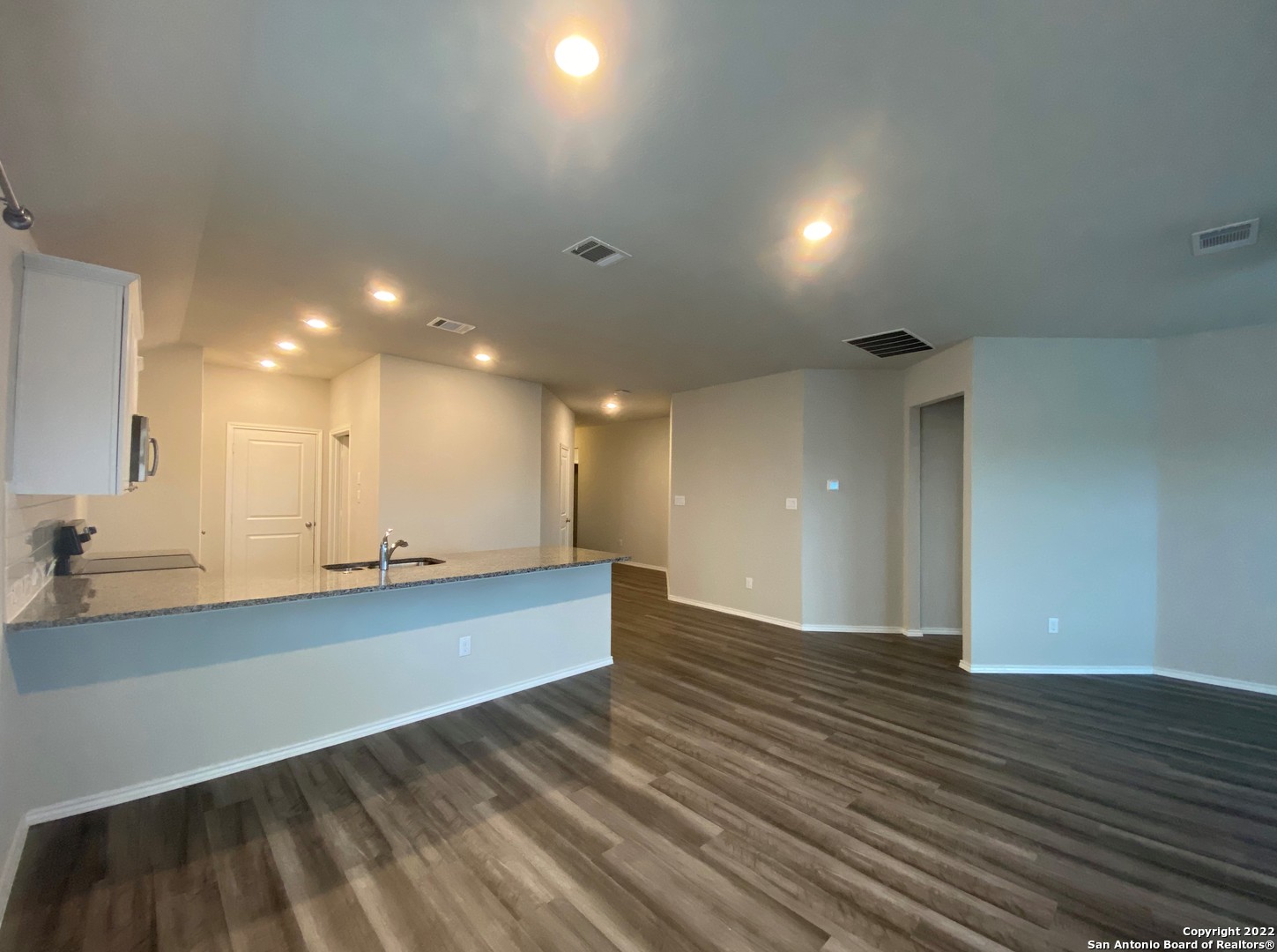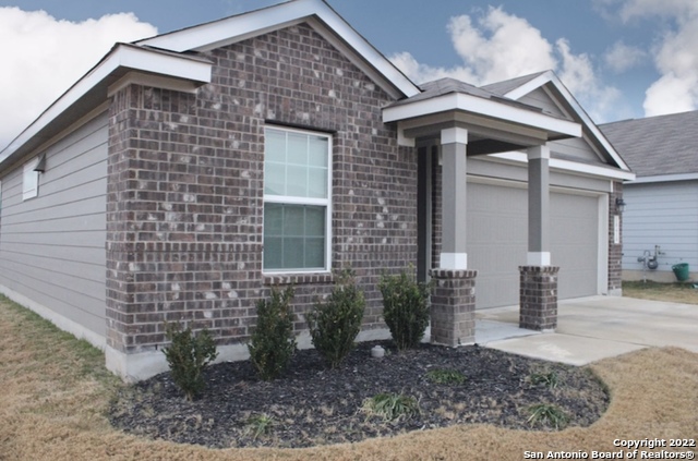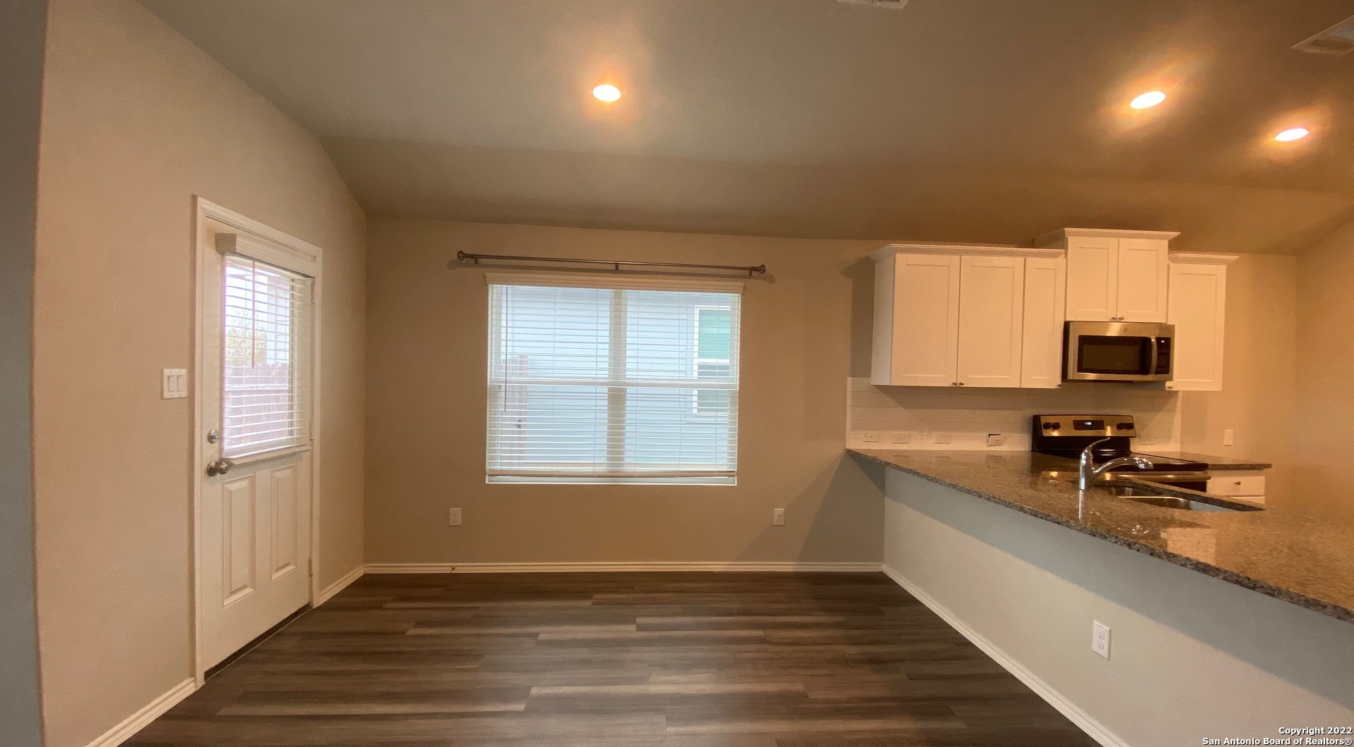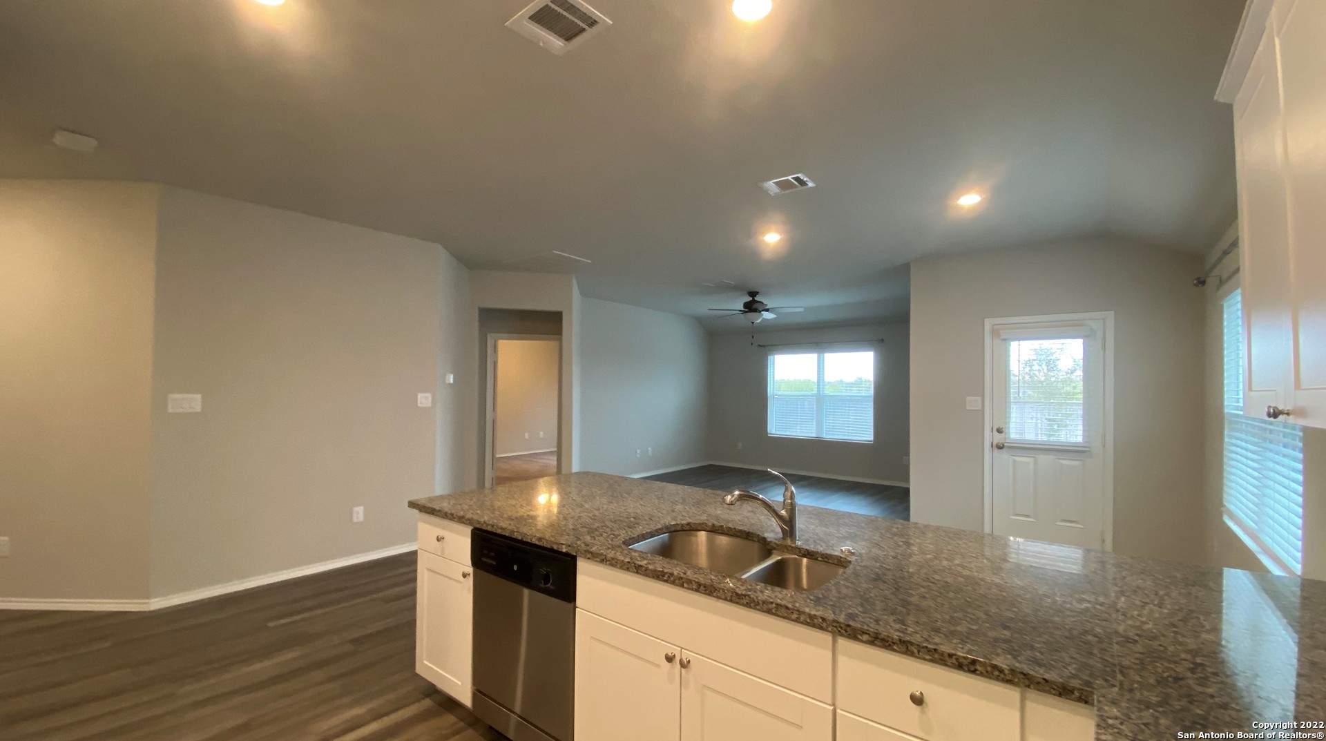 Inside the home you'll notice lots of natural light and an open kitchen with a large granite peninsula perfect for a quick meal or entertaining. This home offers an open floor plan. The main suite is tucked away at the back end of the home and features tall ceilings, dual sinks and a large walk in shower with more natural light. Enjoy the peace and quiet of your private backyard that backs up to a greenbelt.