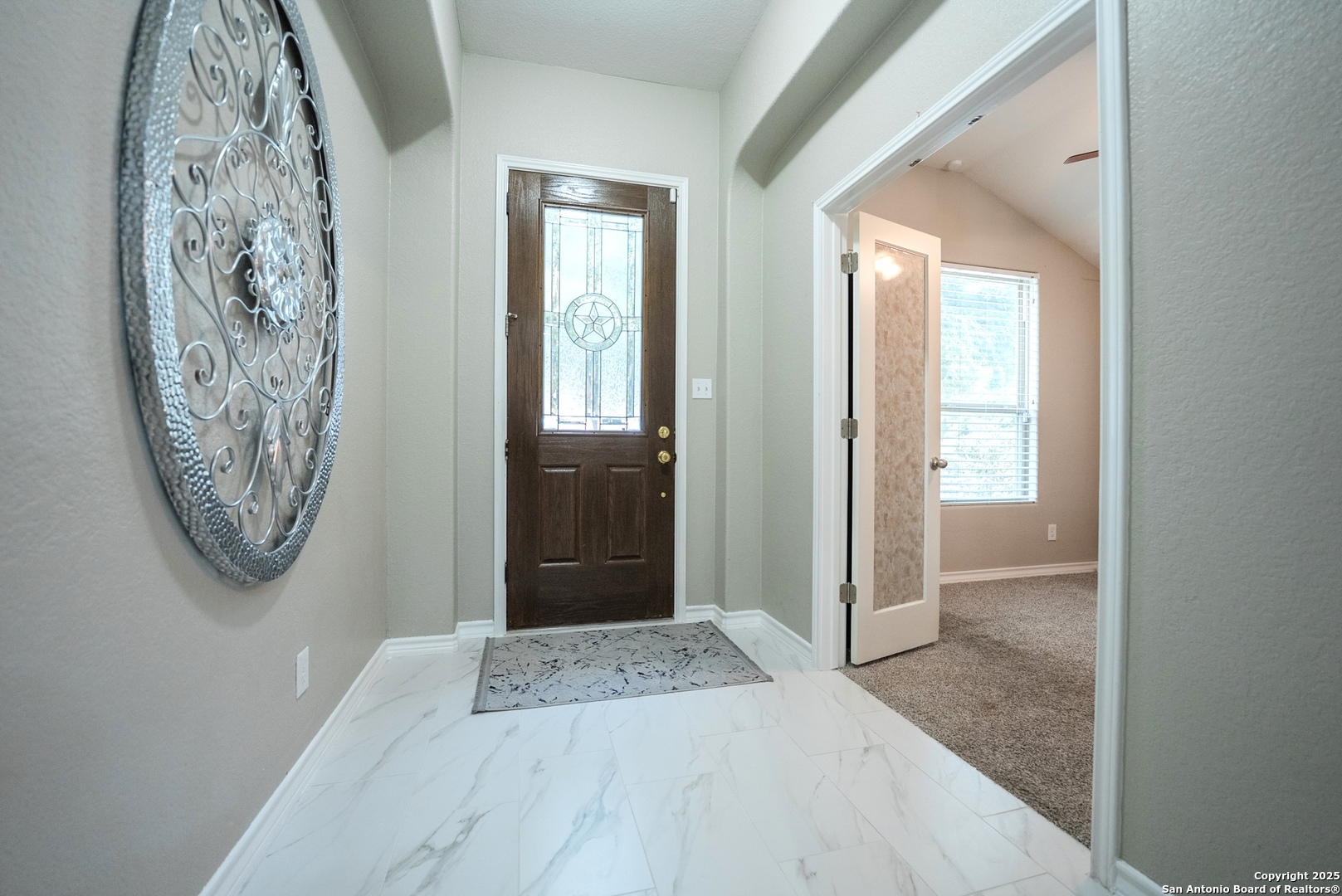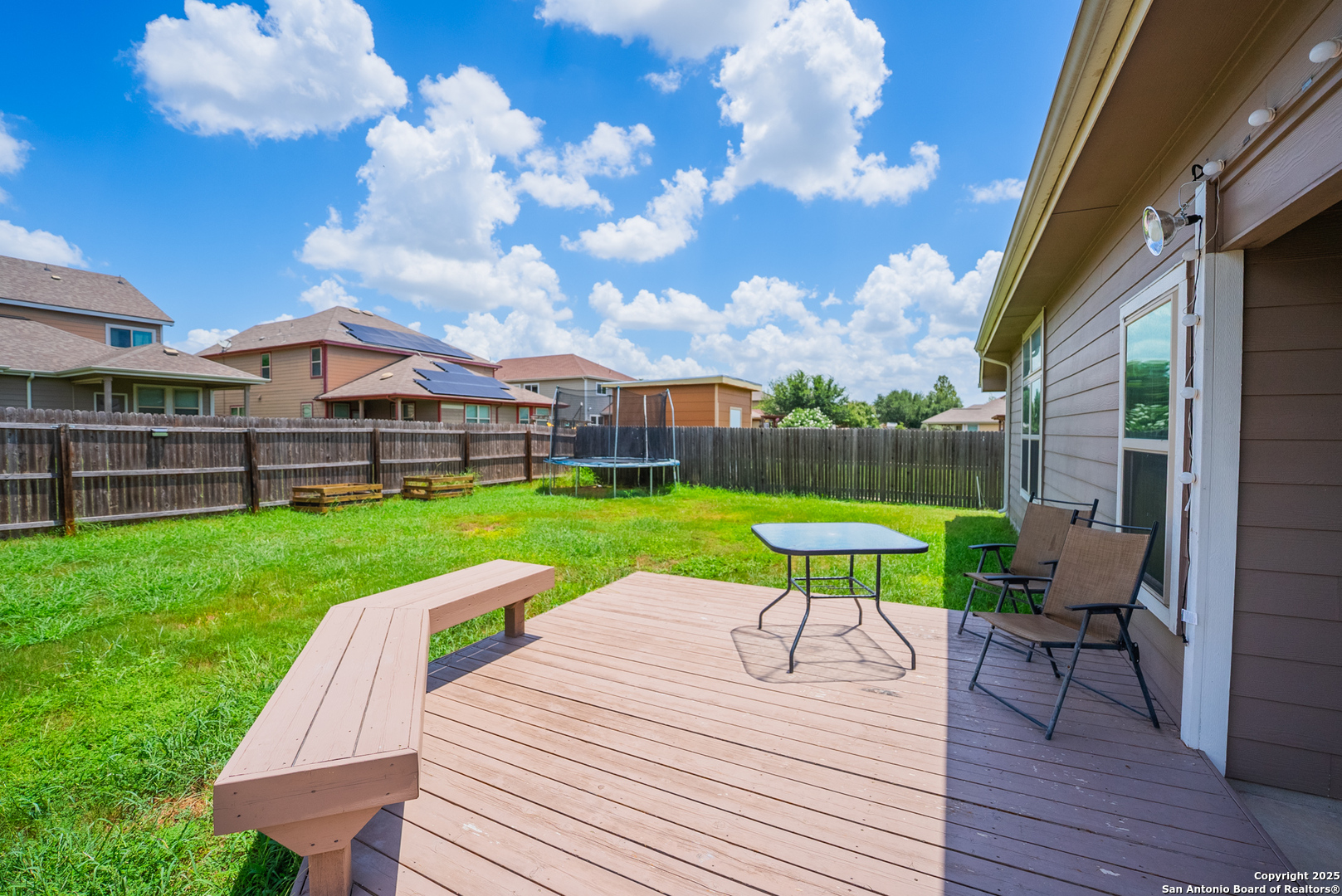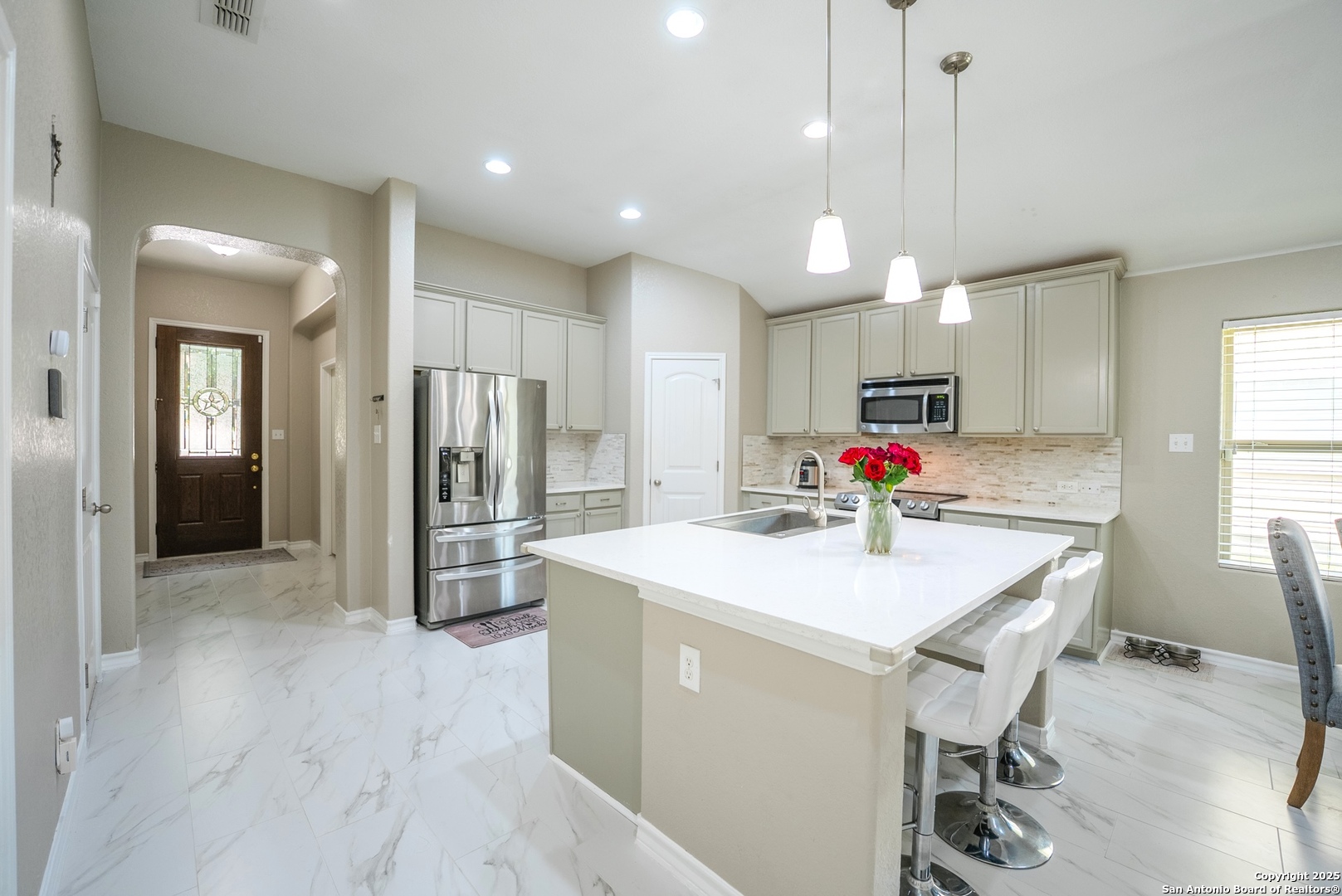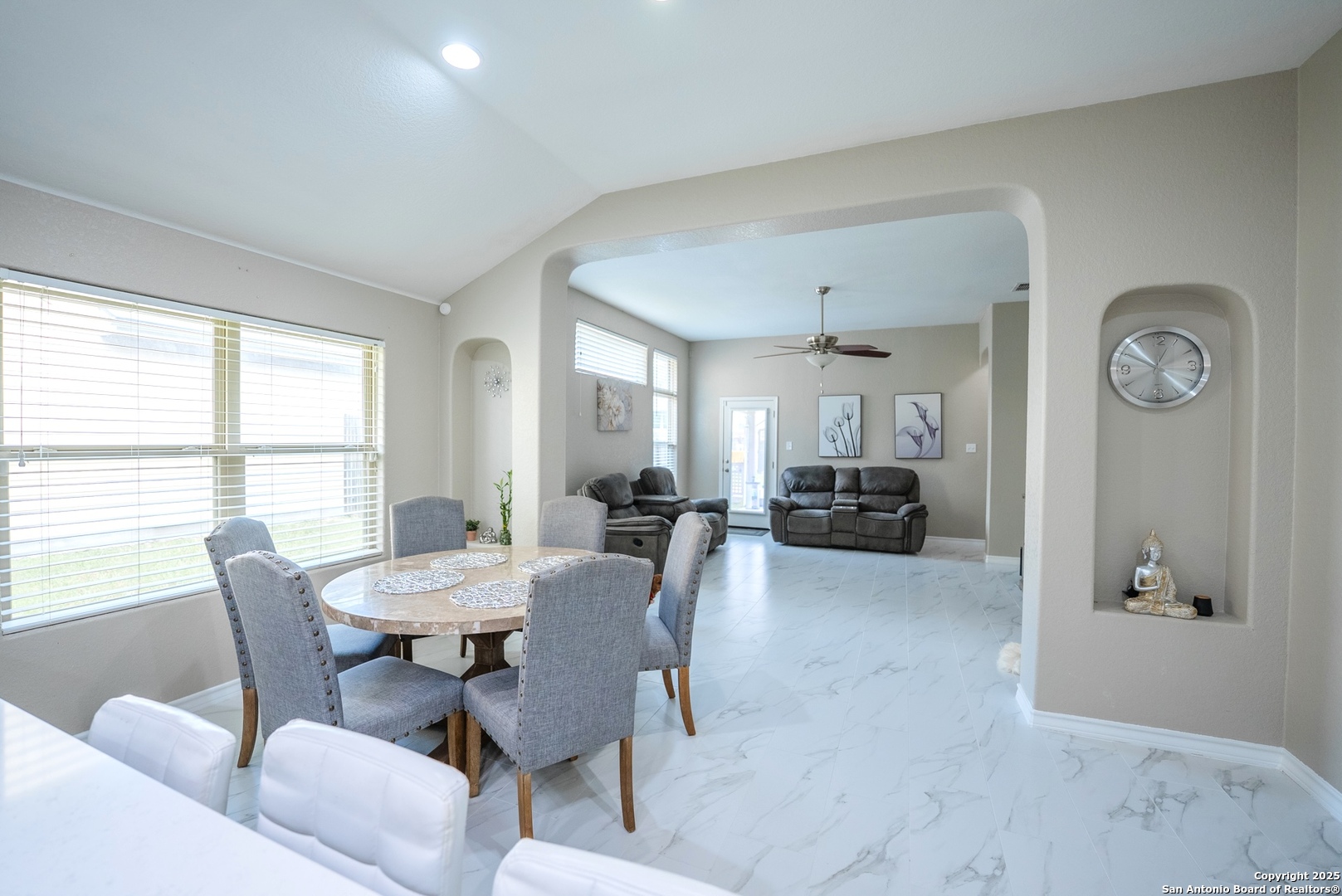 A crisp, 5 bedroom 2 full bath home. This home blends a stucco and stone exterior with bright interior colors. The 8 foot entry door creates a bold and expansive first impression. Step inside and you're greeted by high ceilings and a gracefully rounded archway. To the left through the French doors you'll find a versatile space designed for your specific needs. Through the archway is leads you into the heart of the home-accentuating the inviting open concept flow. Natural light floods the space, bouncing off white marbled tile flooring that extends throughout the main living areas and the primary suite. Discover the gourmet kitchen-stunning quartz countertops, a mosaic sleek white backsplash, stainless steel appliances, and ample cabinetry. Three pendant lights hover above a central island, perfectly balancing form and function. This area flows seamlessly into the connected dining and living zones, making it ideal for entertaining and everyday living. The living room's walls of windows and high ceiling draw the eye upward, creating a sense of spacious tranquility. Follow the corridor to the luxurious primary suite. Flooded with natural light, this room sits beneath the same elegant tile flooring and continues the bright, airy palette of the home. Through the French doors walk into an ensuite retreat featuring dual vanities, a separate framed shower, and a deep soaking tub designed to help wash away the day in comfort. The four additional bedrooms-offer cozy, private retreats. Each with spacious closets and naturally well lit. One of the additional bedrooms features wood like flooring. The additional bedrooms are all softly carpeted. A well-appointed full bathroom features an extended single vanity and large enough for multiple users. Outside, enjoy a covered patio shaded by a deck extension and builtin wooden bench. This outdoor oasis blends function with relaxation. Situated near a neighborhood pool, jogging trails, and a playground, this location offers a lifestyle of active outdoor enjoyment and neighborhood charm.