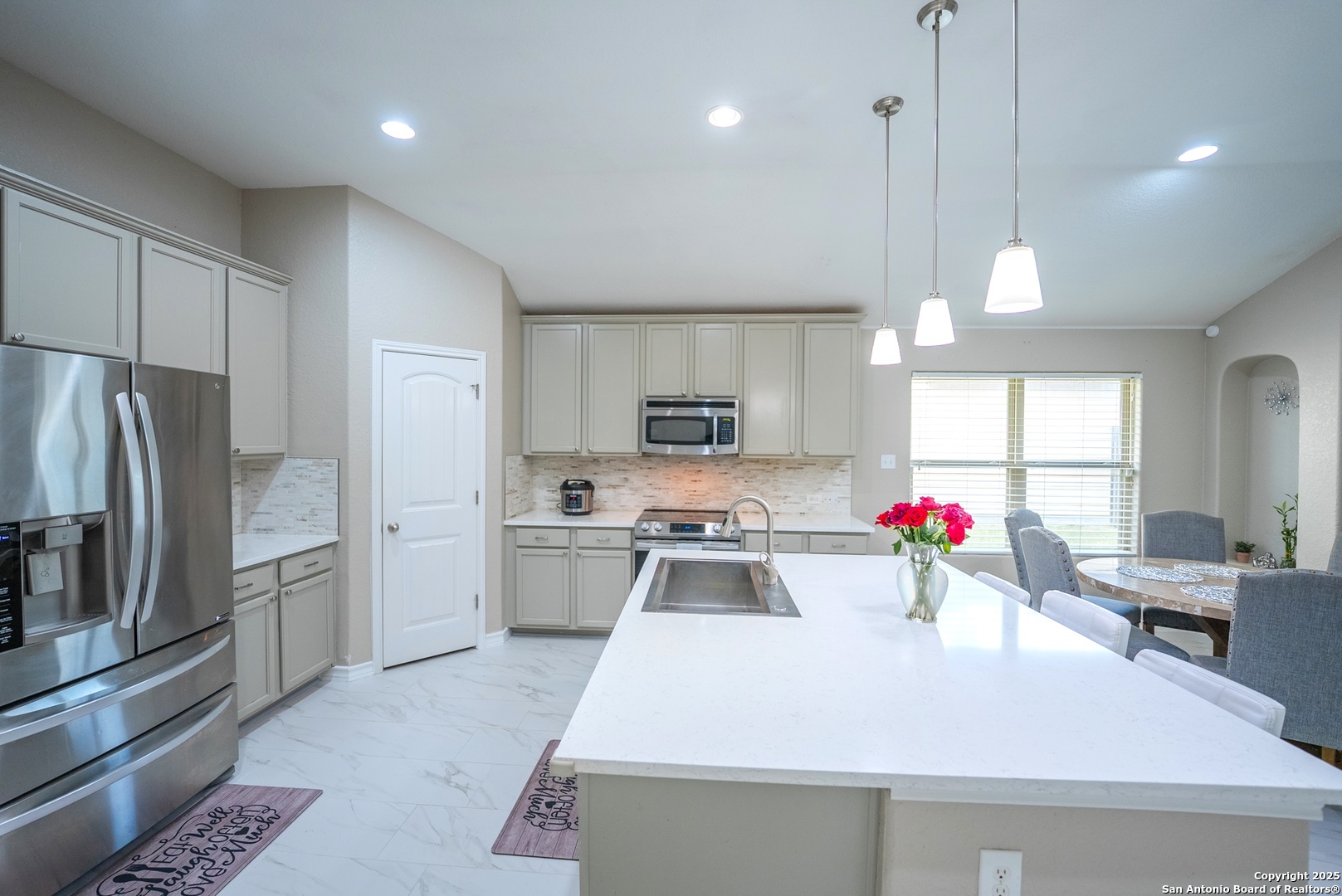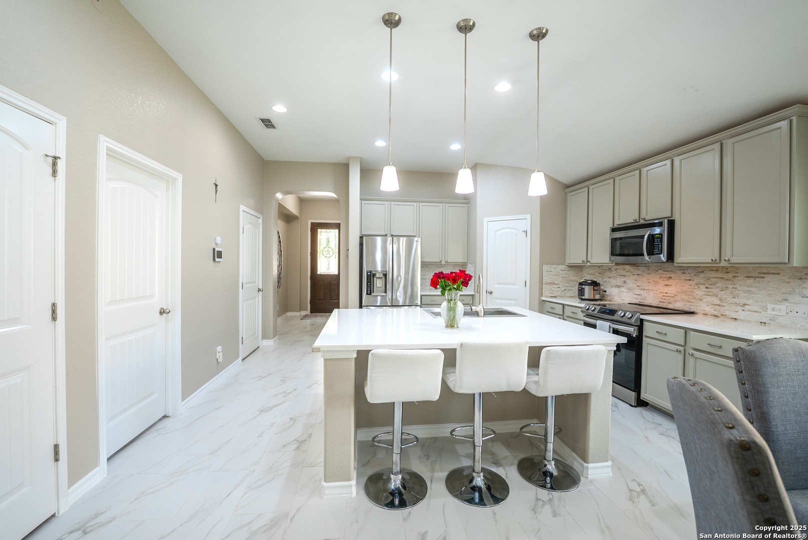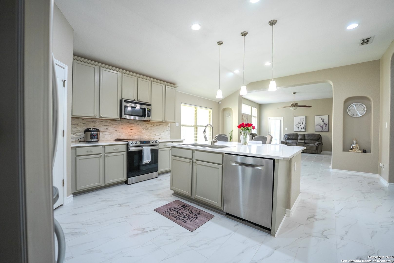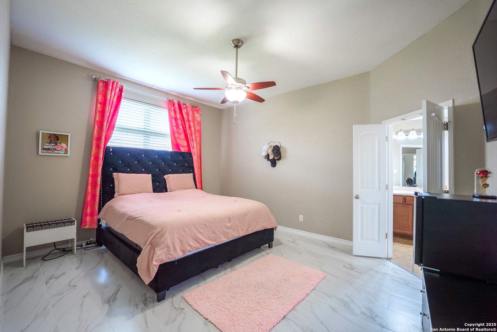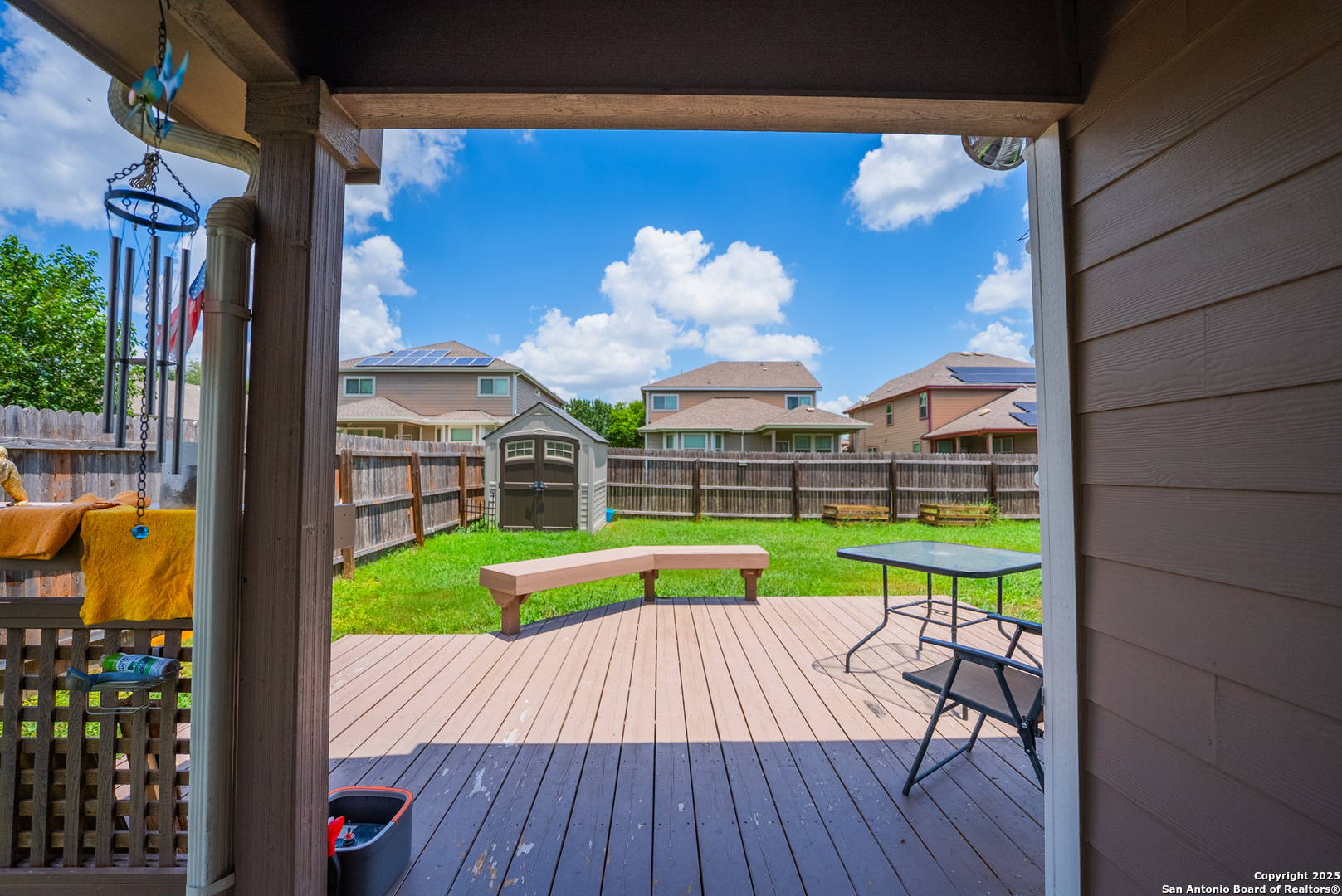 A crisp, 5 bedroom 2 full bath home. This home blends a stucco and stone exterior with bright interior colors. The 8 foot entry door creates a bold and expansive first impression. Step inside and you're greeted by high ceilings and a gracefully rounded archway. To the left through the French doors you'll find a versatile space designed for your specific needs. Through the archway is leads you into the heart of the home-accentuating the inviting open concept flow. Natural light floods the space, bouncing off white marbled tile flooring that extends throughout the main living areas and the primary suite. Discover the gourmet kitchen-stunning quartz countertops, a mosaic sleek white backsplash, stainless steel appliances, and ample cabinetry. Three pendant lights hover above a central island, perfectly balancing form and function. This area flows seamlessly into the connected dining and living zones, making it ideal for entertaining and everyday living. The living room's walls of windows and high ceiling draw the eye upward, creating a sense of spacious tranquility. Follow the corridor to the luxurious primary suite. Flooded with natural light, this room sits beneath the same elegant tile flooring and continues the bright, airy palette of the home. Through the French doors walk into an ensuite retreat featuring dual vanities, a separate framed shower, and a deep soaking tub designed to help wash away the day in comfort. The four additional bedrooms-offer cozy, private retreats. Each with spacious closets and naturally well lit. One of the additional bedrooms features wood like flooring. The additional bedrooms are all softly carpeted. A well-appointed full bathroom features an extended single vanity and large enough for multiple users. Outside, enjoy a covered patio shaded by a deck extension and builtin wooden bench. This outdoor oasis blends function with relaxation. Situated near a neighborhood pool, jogging trails, and a playground, this location offers a lifestyle of active outdoor enjoyment and neighborhood charm.