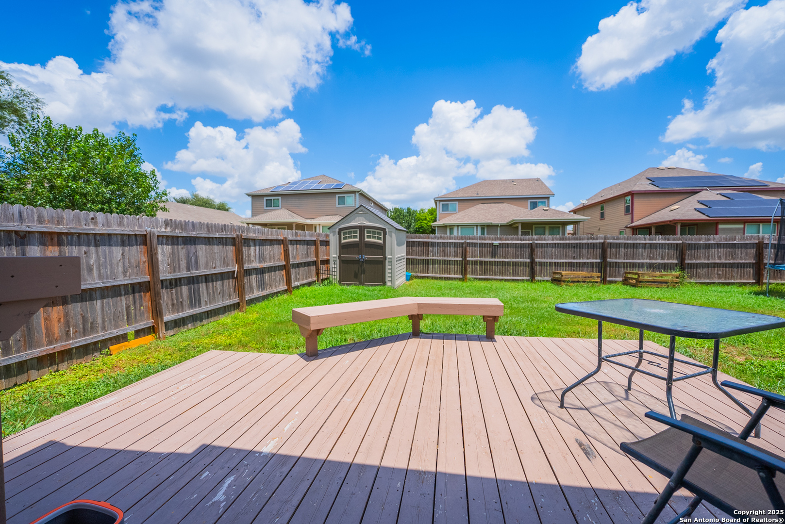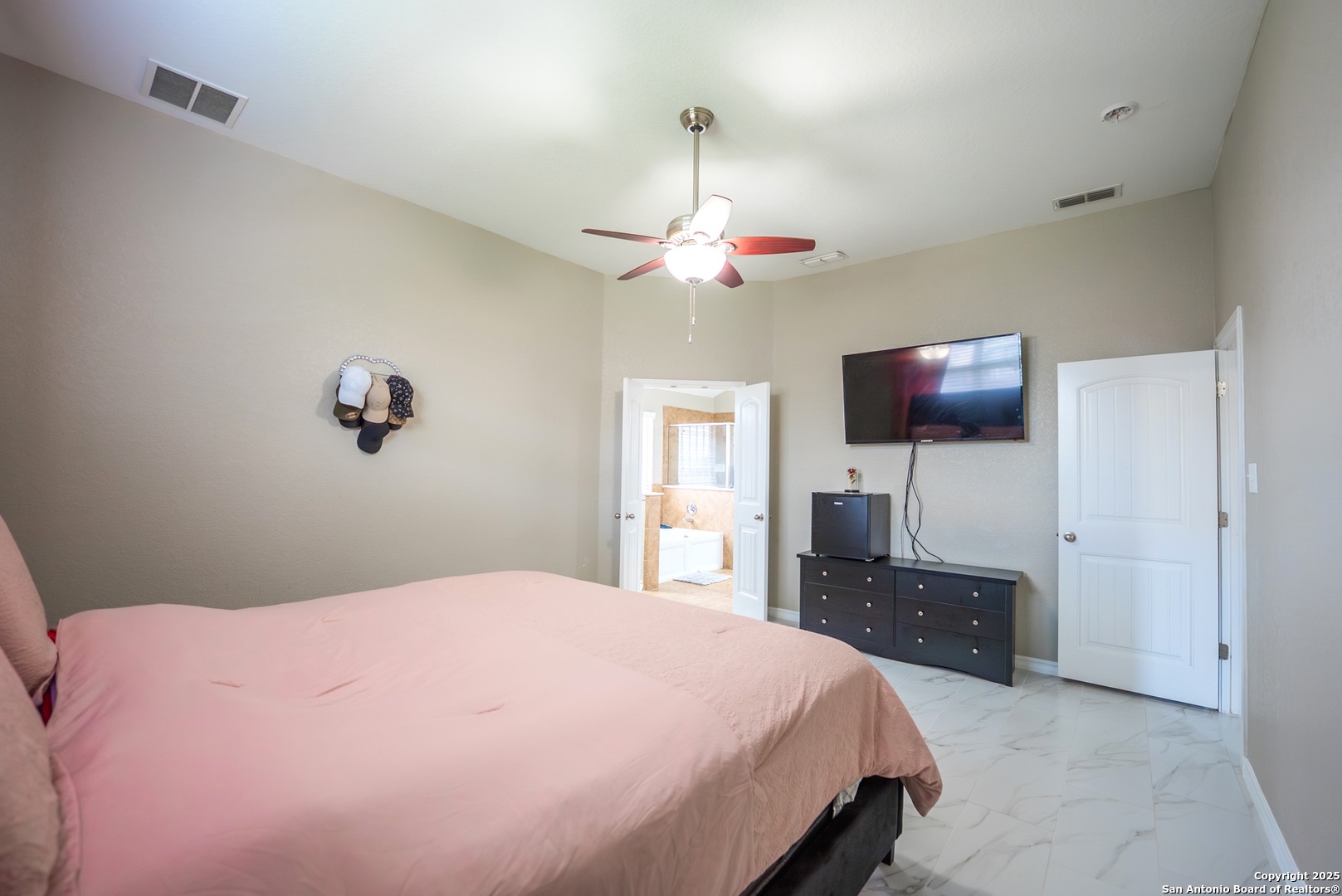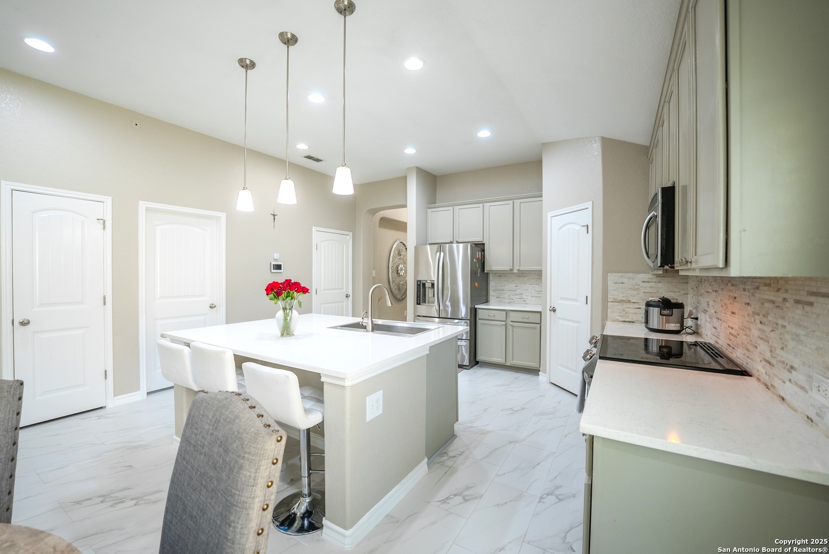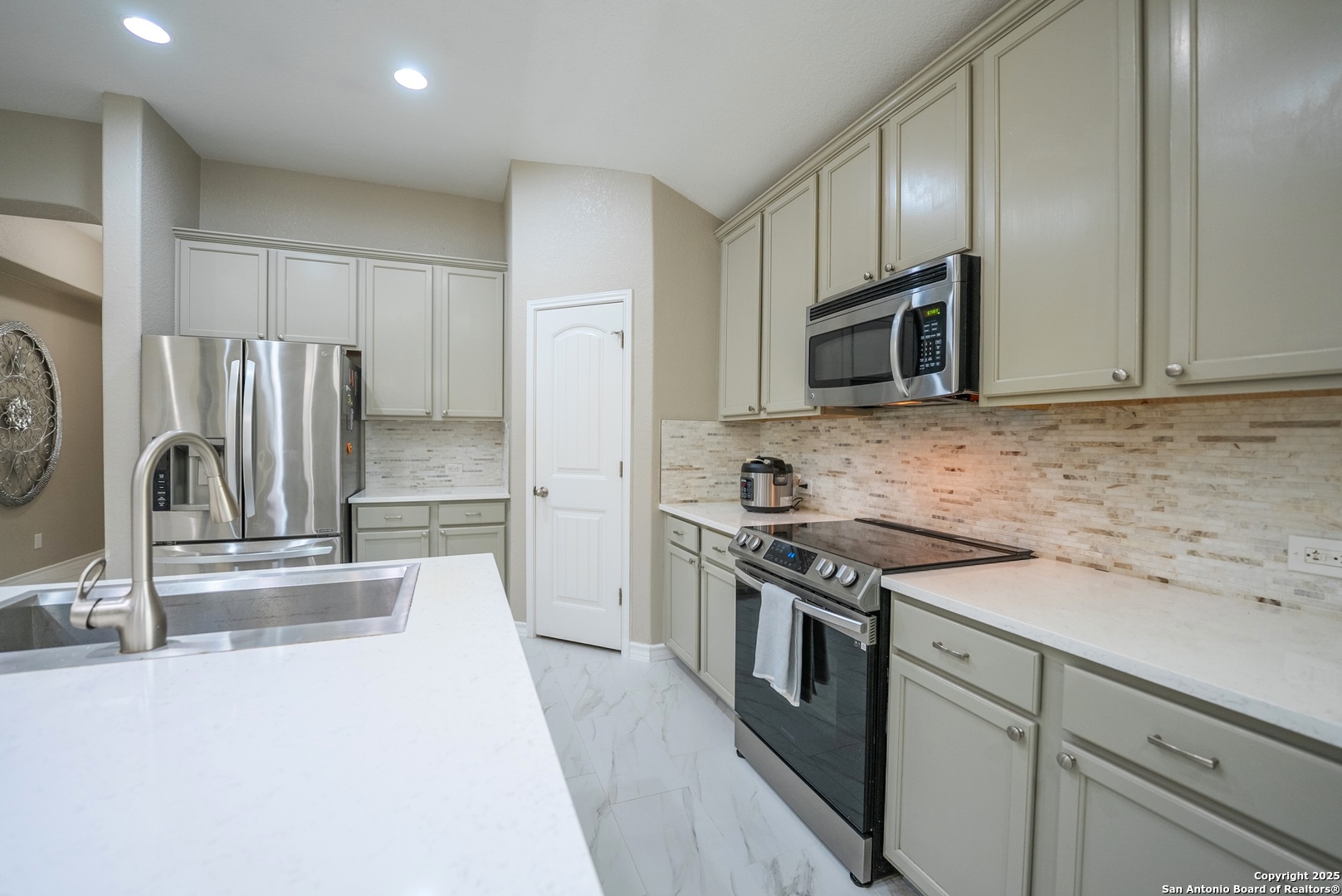 A crisp, 5 bedroom 2 full bath home. This home blends a stucco and stone exterior with bright interior colors. The 8 foot entry door creates a bold and expansive first impression. Step inside and you're greeted by high ceilings and a gracefully rounded archway. To the left through the French doors you'll find a versatile space designed for your specific needs. Through the archway is leads you into the heart of the home-accentuating the inviting open concept flow. Natural light floods the space, bouncing off white marbled tile flooring that extends throughout the main living areas and the primary suite. Discover the gourmet kitchen-stunning quartz countertops, a mosaic sleek white backsplash, stainless steel appliances, and ample cabinetry. Three pendant lights hover above a central island, perfectly balancing form and function. This area flows seamlessly into the connected dining and living zones, making it ideal for entertaining and everyday living. The living room's walls of windows and high ceiling draw the eye upward, creating a sense of spacious tranquility. Follow the corridor to the luxurious primary suite. Flooded with natural light, this room sits beneath the same elegant tile flooring and continues the bright, airy palette of the home. Through the French doors walk into an ensuite retreat featuring dual vanities, a separate framed shower, and a deep soaking tub designed to help wash away the day in comfort. The four additional bedrooms-offer cozy, private retreats. Each with spacious closets and naturally well lit. One of the additional bedrooms features wood like flooring. The additional bedrooms are all softly carpeted. A well-appointed full bathroom features an extended single vanity and large enough for multiple users. Outside, enjoy a covered patio shaded by a deck extension and builtin wooden bench. This outdoor oasis blends function with relaxation. Situated near a neighborhood pool, jogging trails, and a playground, this location offers a lifestyle of active outdoor enjoyment and neighborhood charm.