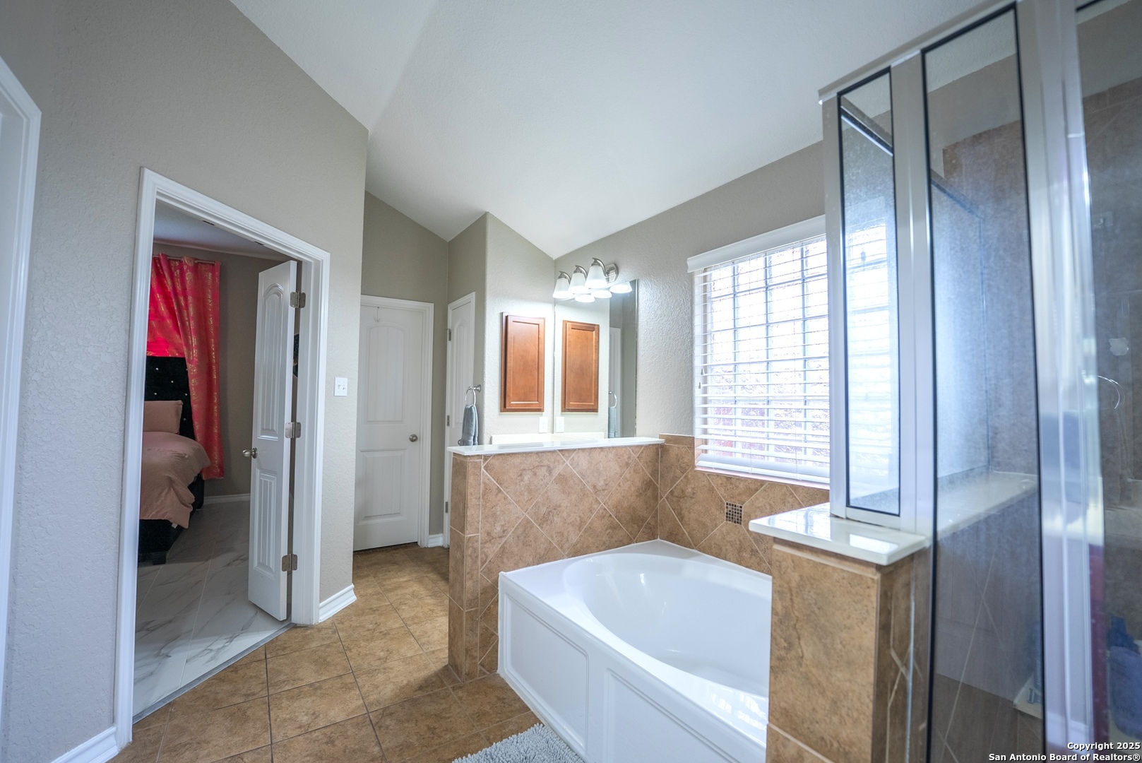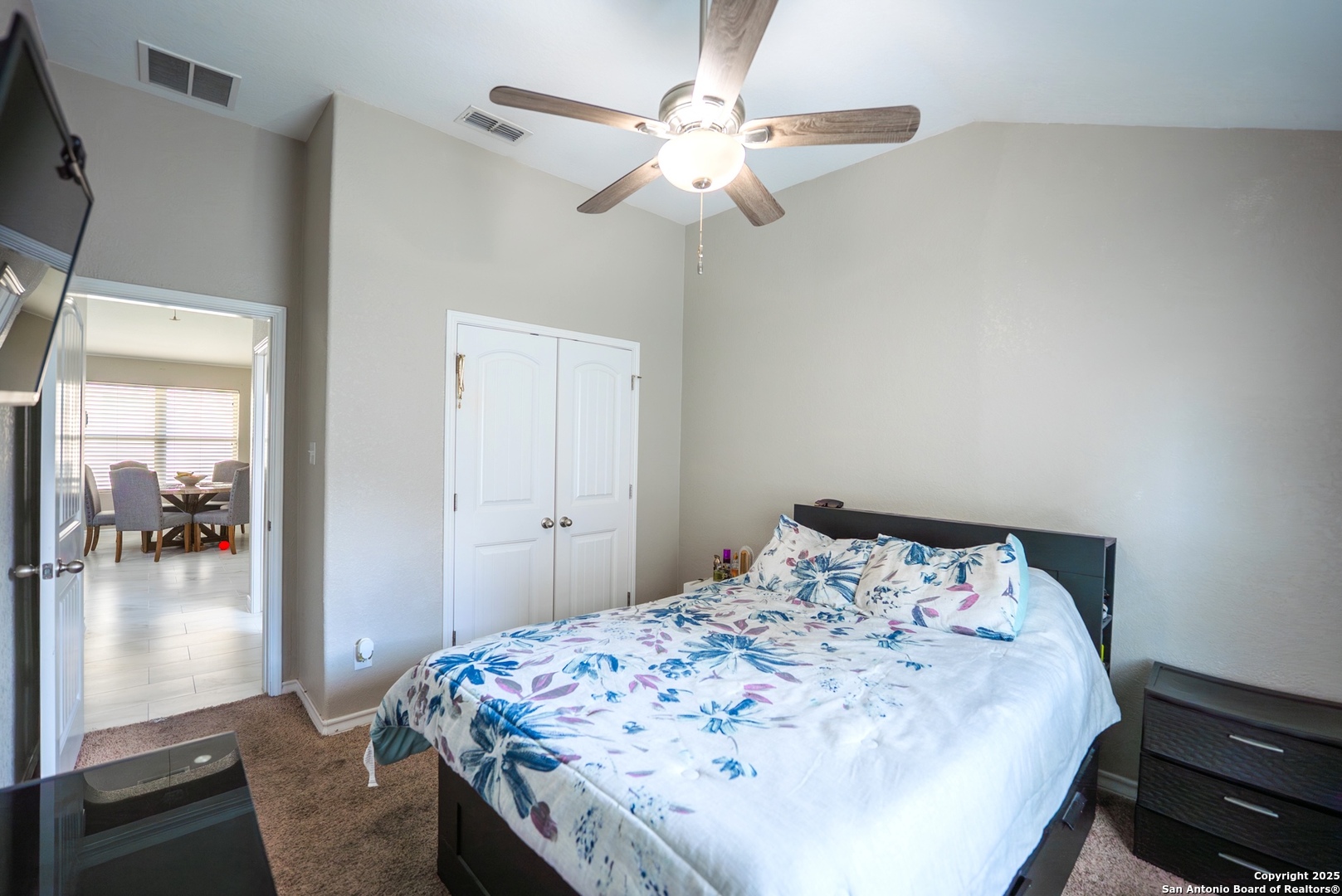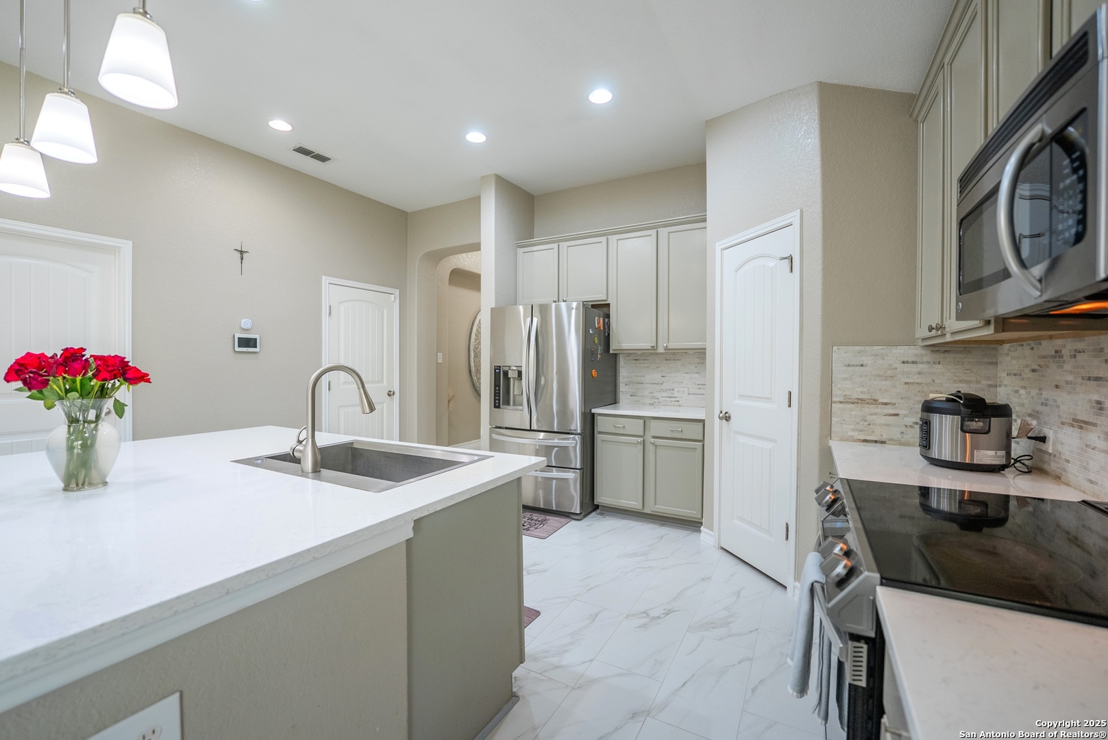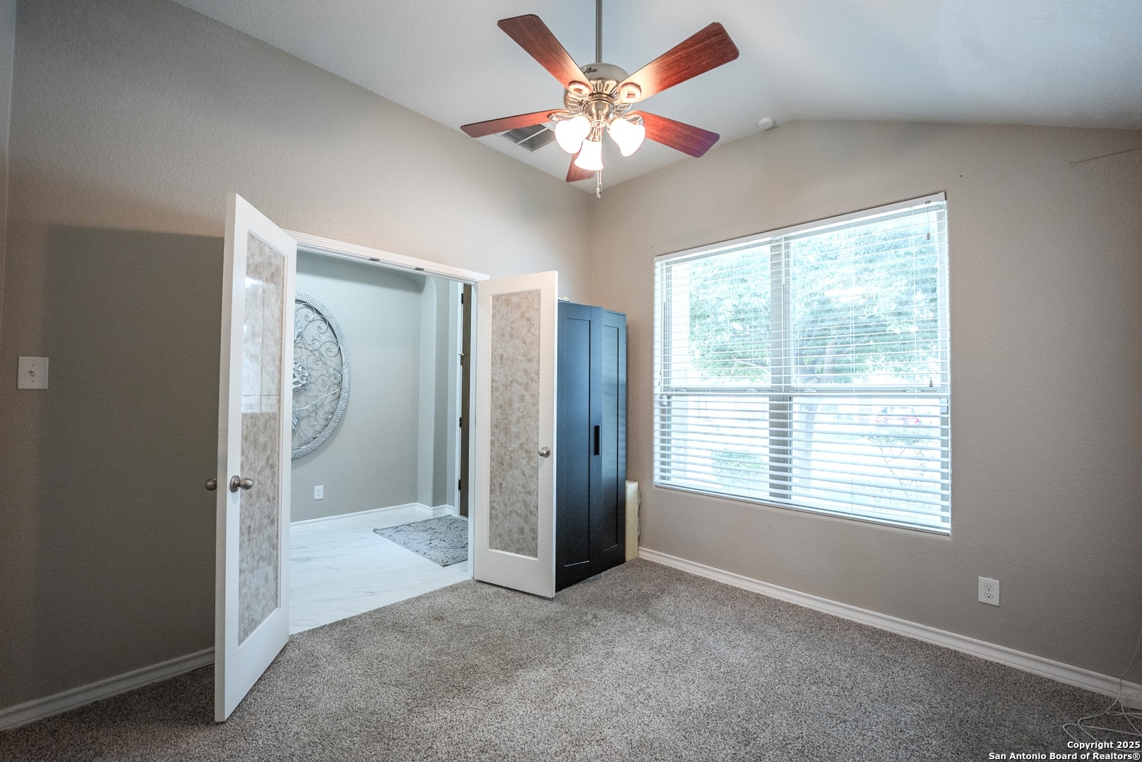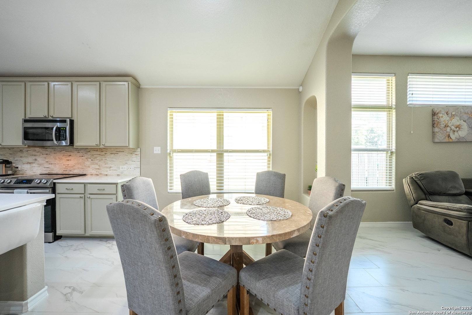 A crisp, 5 bedroom 2 full bath home. This home blends a stucco and stone exterior with bright interior colors. The 8 foot entry door creates a bold and expansive first impression. Step inside and you're greeted by high ceilings and a gracefully rounded archway. To the left through the French doors you'll find a versatile space designed for your specific needs. Through the archway is leads you into the heart of the home-accentuating the inviting open concept flow. Natural light floods the space, bouncing off white marbled tile flooring that extends throughout the main living areas and the primary suite. Discover the gourmet kitchen-stunning quartz countertops, a mosaic sleek white backsplash, stainless steel appliances, and ample cabinetry. Three pendant lights hover above a central island, perfectly balancing form and function. This area flows seamlessly into the connected dining and living zones, making it ideal for entertaining and everyday living. The living room's walls of windows and high ceiling draw the eye upward, creating a sense of spacious tranquility. Follow the corridor to the luxurious primary suite. Flooded with natural light, this room sits beneath the same elegant tile flooring and continues the bright, airy palette of the home. Through the French doors walk into an ensuite retreat featuring dual vanities, a separate framed shower, and a deep soaking tub designed to help wash away the day in comfort. The four additional bedrooms-offer cozy, private retreats. Each with spacious closets and naturally well lit. One of the additional bedrooms features wood like flooring. The additional bedrooms are all softly carpeted. A well-appointed full bathroom features an extended single vanity and large enough for multiple users. Outside, enjoy a covered patio shaded by a deck extension and builtin wooden bench. This outdoor oasis blends function with relaxation. Situated near a neighborhood pool, jogging trails, and a playground, this location offers a lifestyle of active outdoor enjoyment and neighborhood charm.