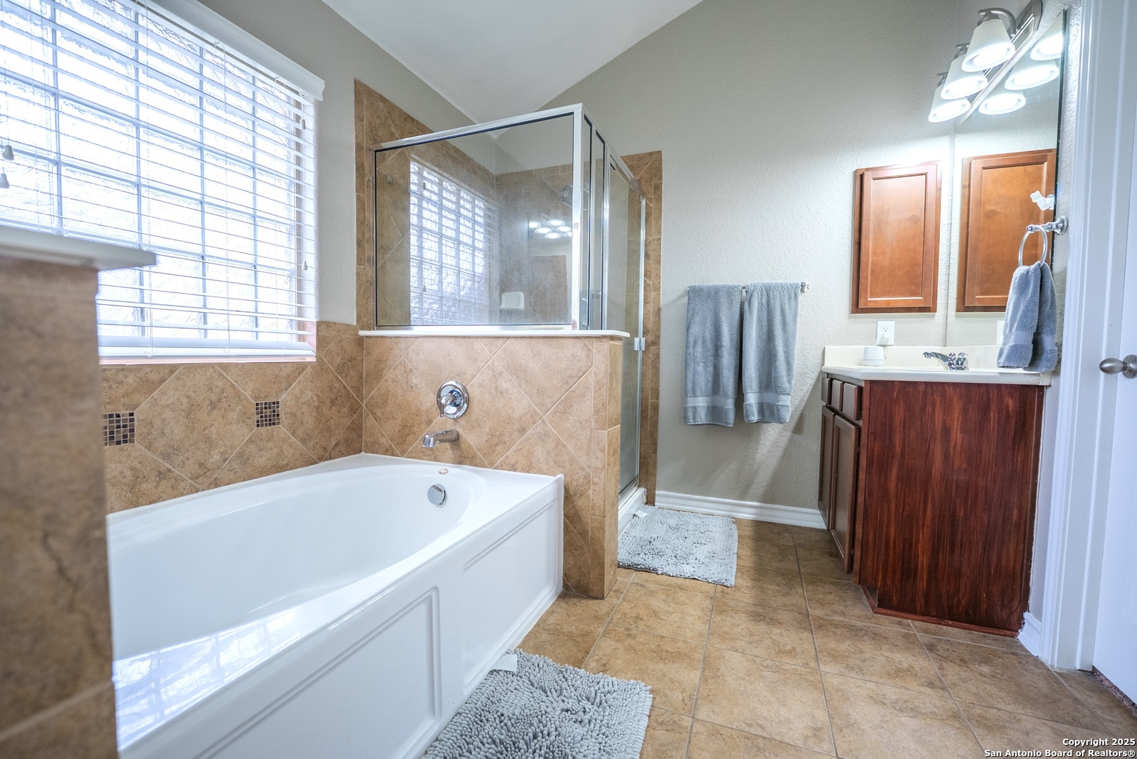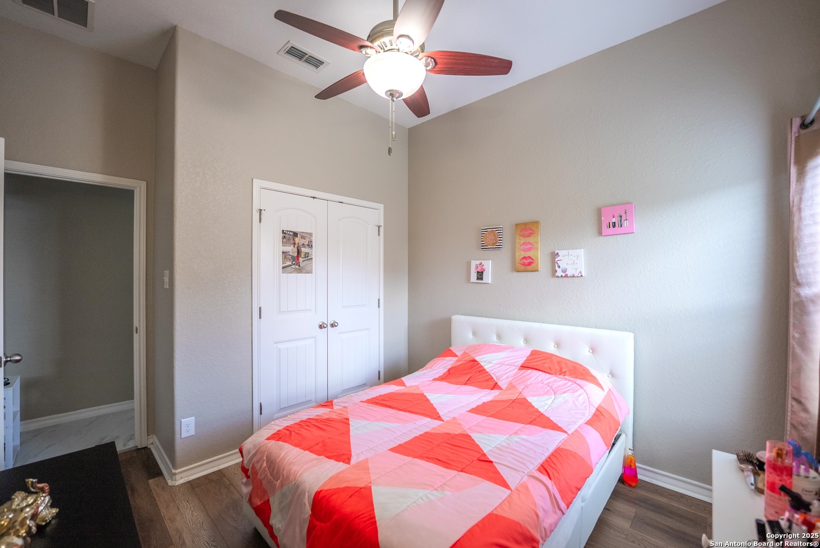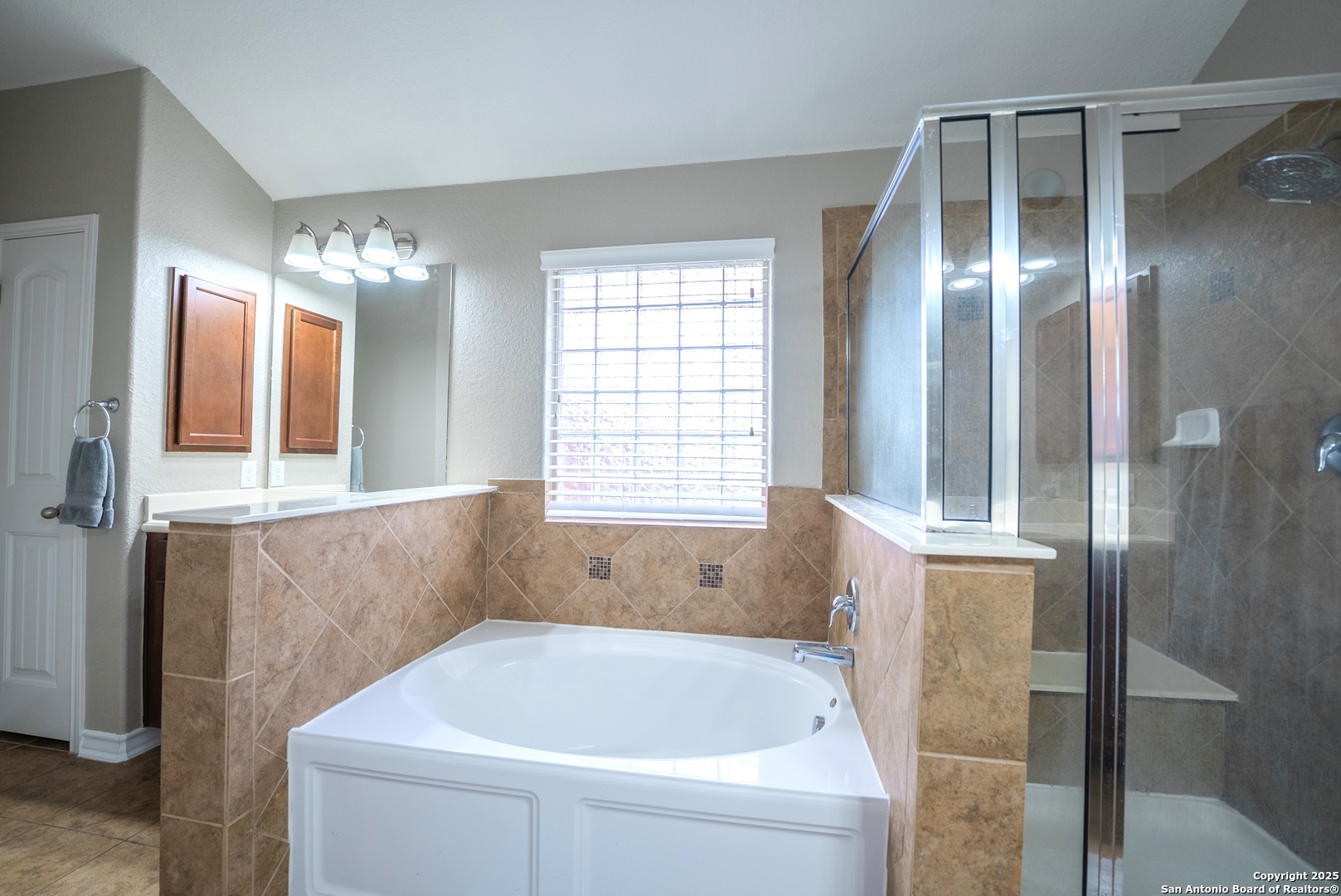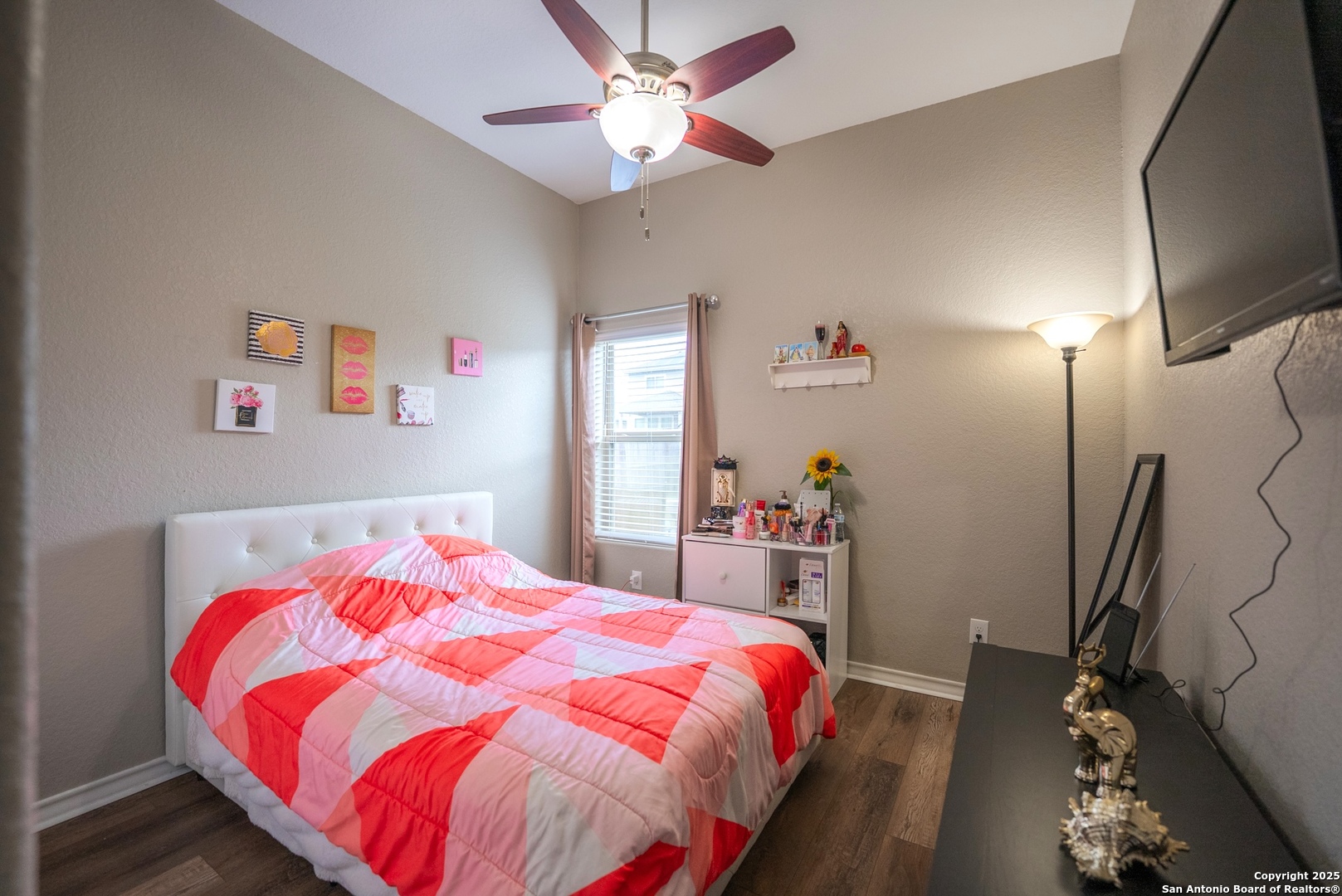 A crisp, 5 bedroom 2 full bath home. This home blends a stucco and stone exterior with bright interior colors. The 8 foot entry door creates a bold and expansive first impression. Step inside and you're greeted by high ceilings and a gracefully rounded archway. To the left through the French doors you'll find a versatile space designed for your specific needs. Through the archway is leads you into the heart of the home-accentuating the inviting open concept flow. Natural light floods the space, bouncing off white marbled tile flooring that extends throughout the main living areas and the primary suite. Discover the gourmet kitchen-stunning quartz countertops, a mosaic sleek white backsplash, stainless steel appliances, and ample cabinetry. Three pendant lights hover above a central island, perfectly balancing form and function. This area flows seamlessly into the connected dining and living zones, making it ideal for entertaining and everyday living. The living room's walls of windows and high ceiling draw the eye upward, creating a sense of spacious tranquility. Follow the corridor to the luxurious primary suite. Flooded with natural light, this room sits beneath the same elegant tile flooring and continues the bright, airy palette of the home. Through the French doors walk into an ensuite retreat featuring dual vanities, a separate framed shower, and a deep soaking tub designed to help wash away the day in comfort. The four additional bedrooms-offer cozy, private retreats. Each with spacious closets and naturally well lit. One of the additional bedrooms features wood like flooring. The additional bedrooms are all softly carpeted. A well-appointed full bathroom features an extended single vanity and large enough for multiple users. Outside, enjoy a covered patio shaded by a deck extension and builtin wooden bench. This outdoor oasis blends function with relaxation. Situated near a neighborhood pool, jogging trails, and a playground, this location offers a lifestyle of active outdoor enjoyment and neighborhood charm.