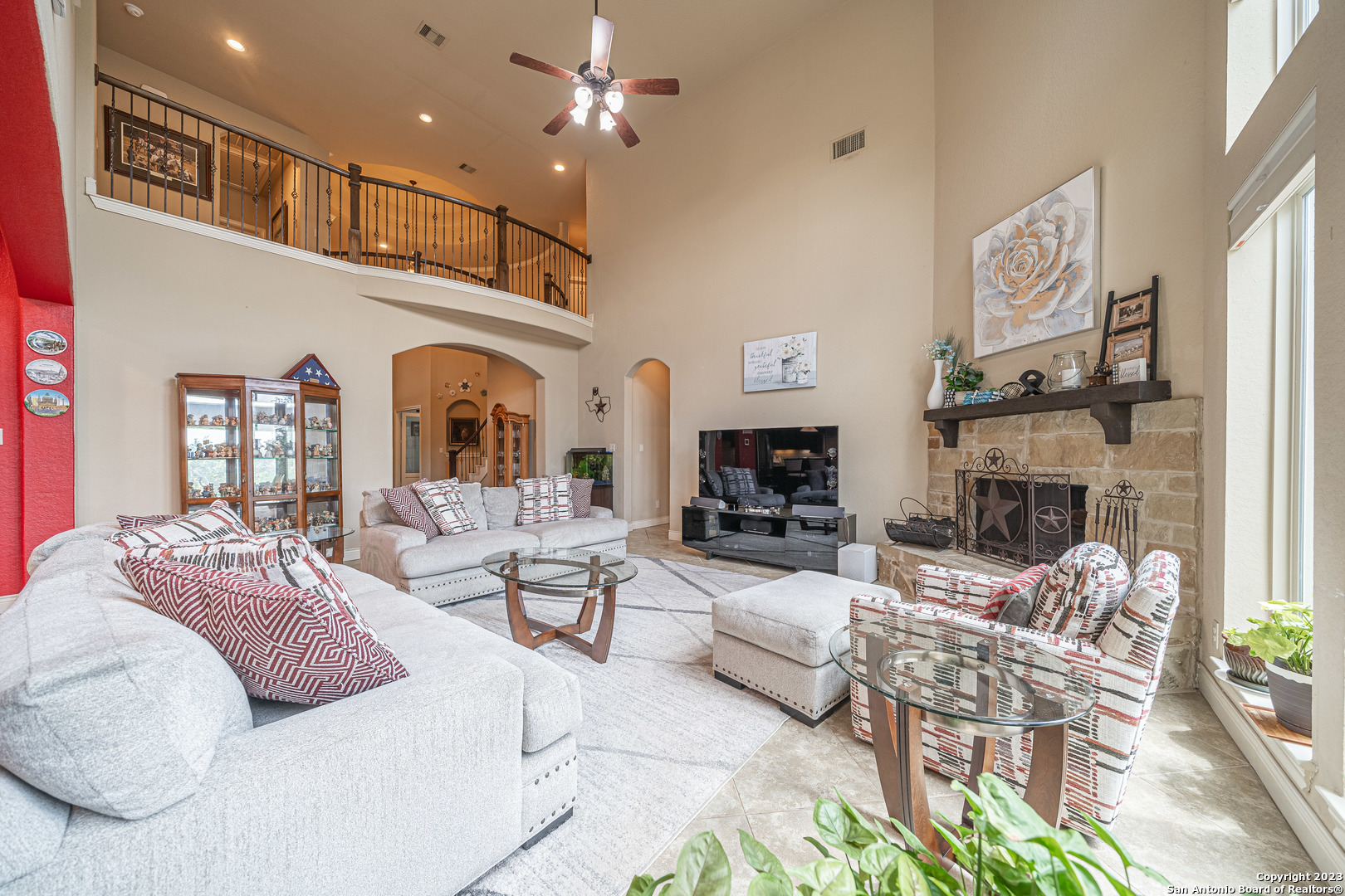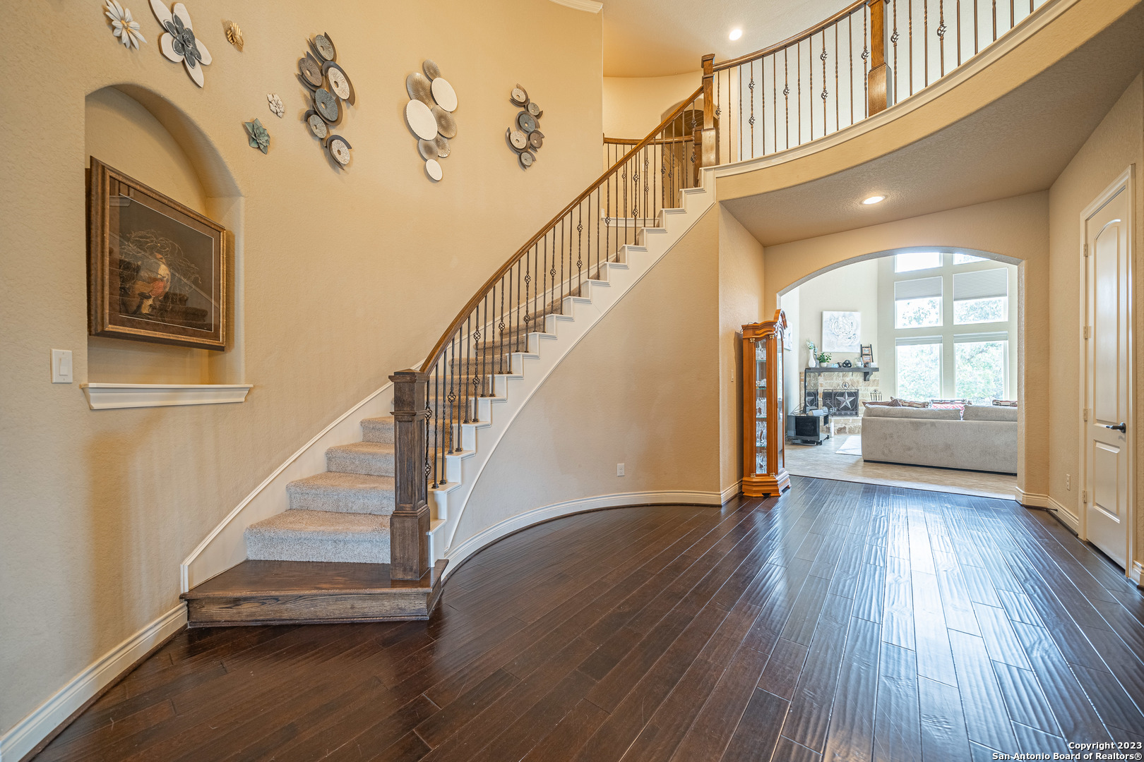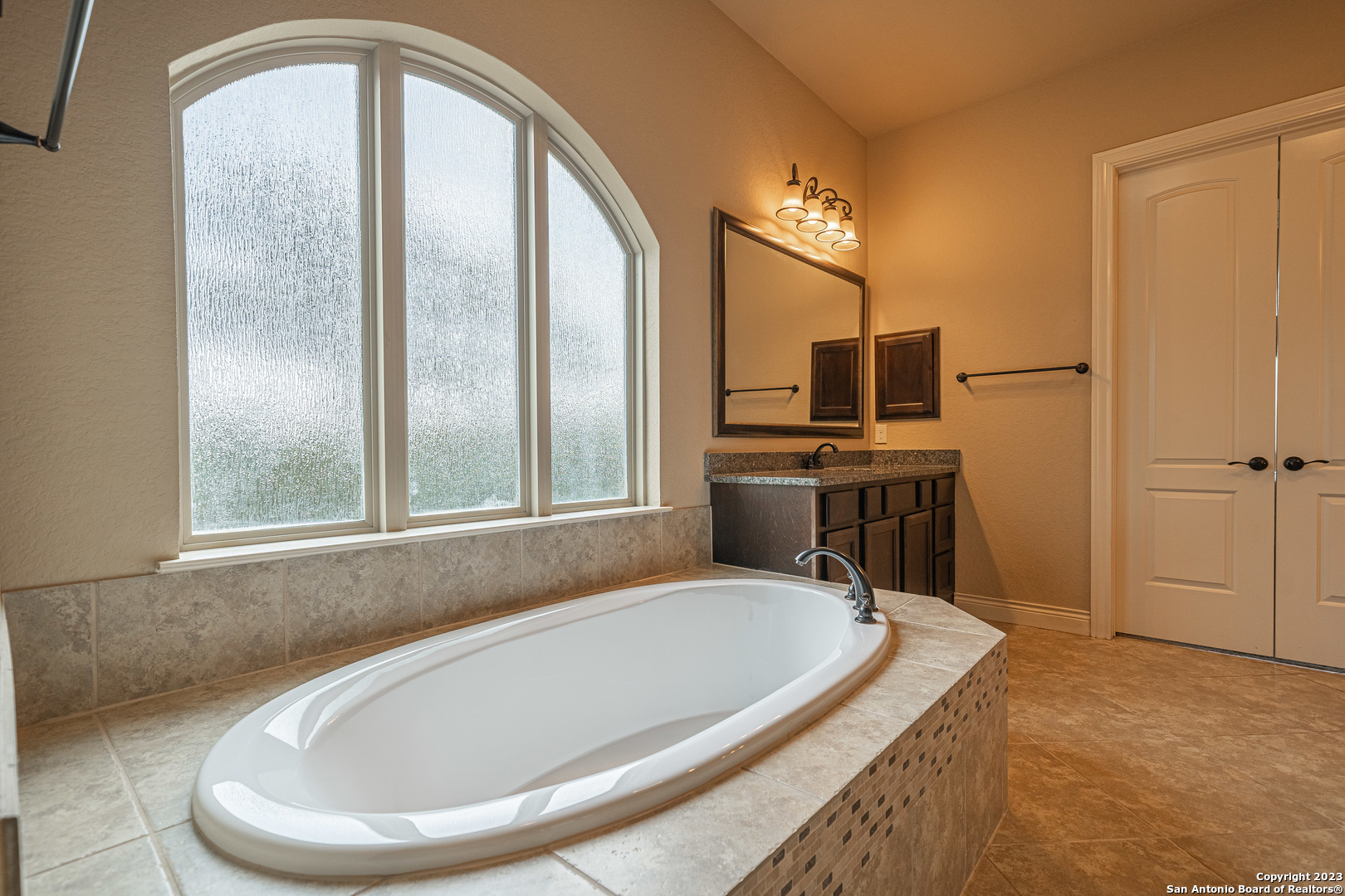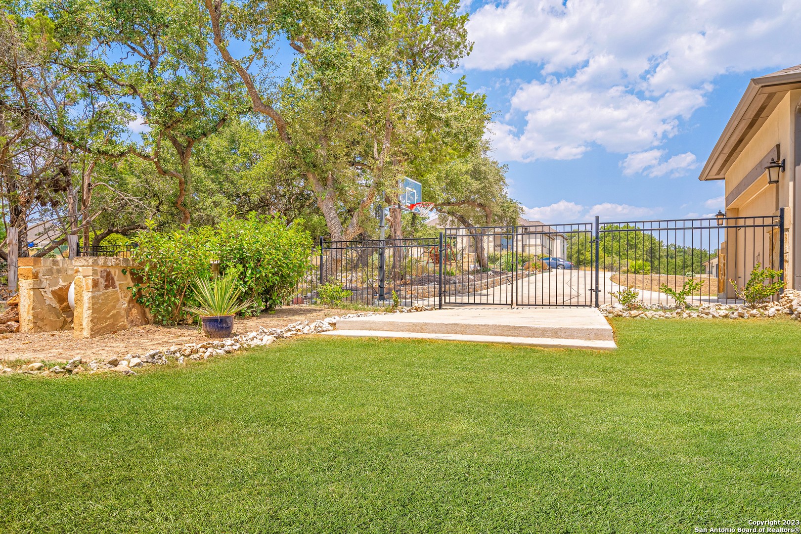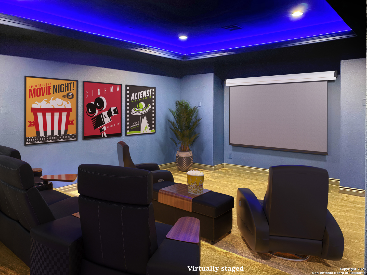 Why wait to build when you can own this meticulously maintained home sooner? Inviting & abundance are the cornerstones of this Gem nestled in the highly desirable community of Vintage Oaks! 1+ acres and Slightly shy of 5000 sqft, with 5 bedrooms and 4.5 baths & 4-Car Garage, there's plenty of space for your whole family to spread out & enjoy. As you enter the home, you'll be greeted by a Grand Mahogany front door and stunning hardwood floors. The Rotunda foyer & curved staircase w/ iron balusters add elegance while the study/library w/French doors and the formal dining room provide space for work & fine dining. The various arched entries throughout the home are intrinsic to the soaring ceilings, open floorplan, and exquisite features creating a spacious welcoming atmosphere. Whether for relaxation or socializing, the living room exudes a sense of refined aesthetics. The plethora of large windows allows an abundance of natural light to fill the space, highlighting the room's expansive & creative layout. The placement of the cast stone fireplace blends harmoniously, not only providing a functional purpose but also serving as a visually appealing centerpiece. The overall architectural design creates a balance between modern elegance and timeless charm. Not only is this home stunning, but it is also energy-efficient. With features such as a New Water heater, FreshAir Intake system, Techshield radiant barrier, Energy Star appliances, and a PEX plumbing system for water quality, you can enjoy a comfortable eco-friendly lifestyle and savings year-round! The stunning Owner's suite allows for a serene escape after a long day. Thoughtfully located on the first level, offers privacy & elegance w/ its sense of grandeur beveled ceilings & large bay windows, allowing for picturesque views of nature. The bedroom exudes a sense of tranquility w/ an enhanced atmosphere of comfort. Indulge in luxurious relaxation as you step into this spa-like oasis -where a gorgeous walk-in shower & the enchanting garden tub awaits beneath the gentle glow of natural light. The Guest suite also located on the first level offers convenience & privacy for your guests, providing the ultimate retreat experience. Entertain family & friends as this home also features a massive game room and a theater room, complete with a built-in state-of-the-art surround sound speaker system, elevated flooring, & ambient changing hue lighting. Bringing the unparalleled cinematic experience home & enjoying endless entertainment options! Ignite your culinary creativity in the bold & vibrant kitchen, where the warm embrace of crimson walls sets the stage for delicious creations & lively conversations. With granite countertops, a beautiful backsplash, rich cabinetry & stainless-steel appliances including a gas stove, it's a chef's dream! The refrigerator is a special order for a custom fit. 1 of the 2 refrigerators conveys! The Extraordinary arched entry, island w/ built-in seating space, and butler's pantry add to its opulence & beauty. Take in the beauty of nature & deer from the large extended covered patio which is perfect for enjoying a cup of coffee or engaging in conversations with/ loved ones. The lot boasts mature trees & includes planted lemon & lime trees, cherry blossom, fragrant lavender, and Fully Covered Gutters to help eliminate leaf cleaning. A spectacular Pool plan w/ extended decking & concrete is also available for review. Let your imagination soar as you picture yourself in this luxurious abode, enjoying all that the Historic Hill Country of New Braunfels has to offer. Located w/in a convenient commute to the neighboring cities of San Antonio & Austin, as well as the historic town of Gruene & Canyon Lake. The List goes on! Definitely a MUST SEE!! **A seller's Concession to assist with Closing costs, Interest Rate buy-downs, etc. may be available with an acceptable offer**