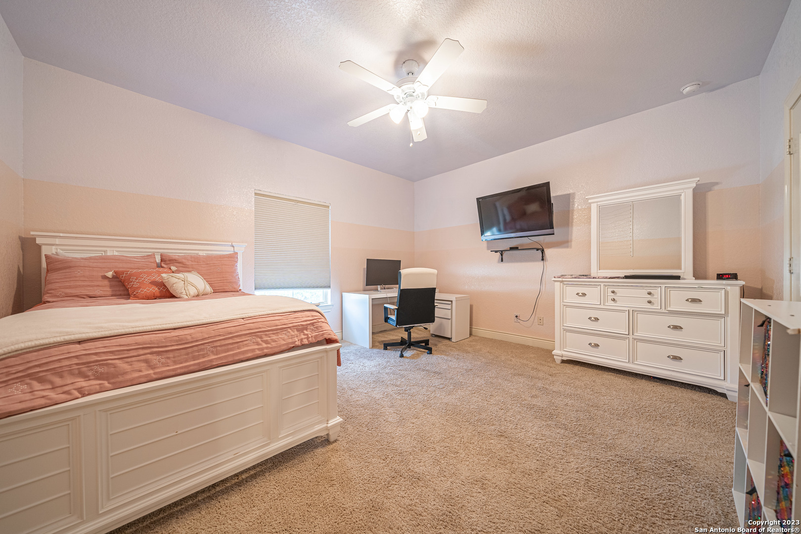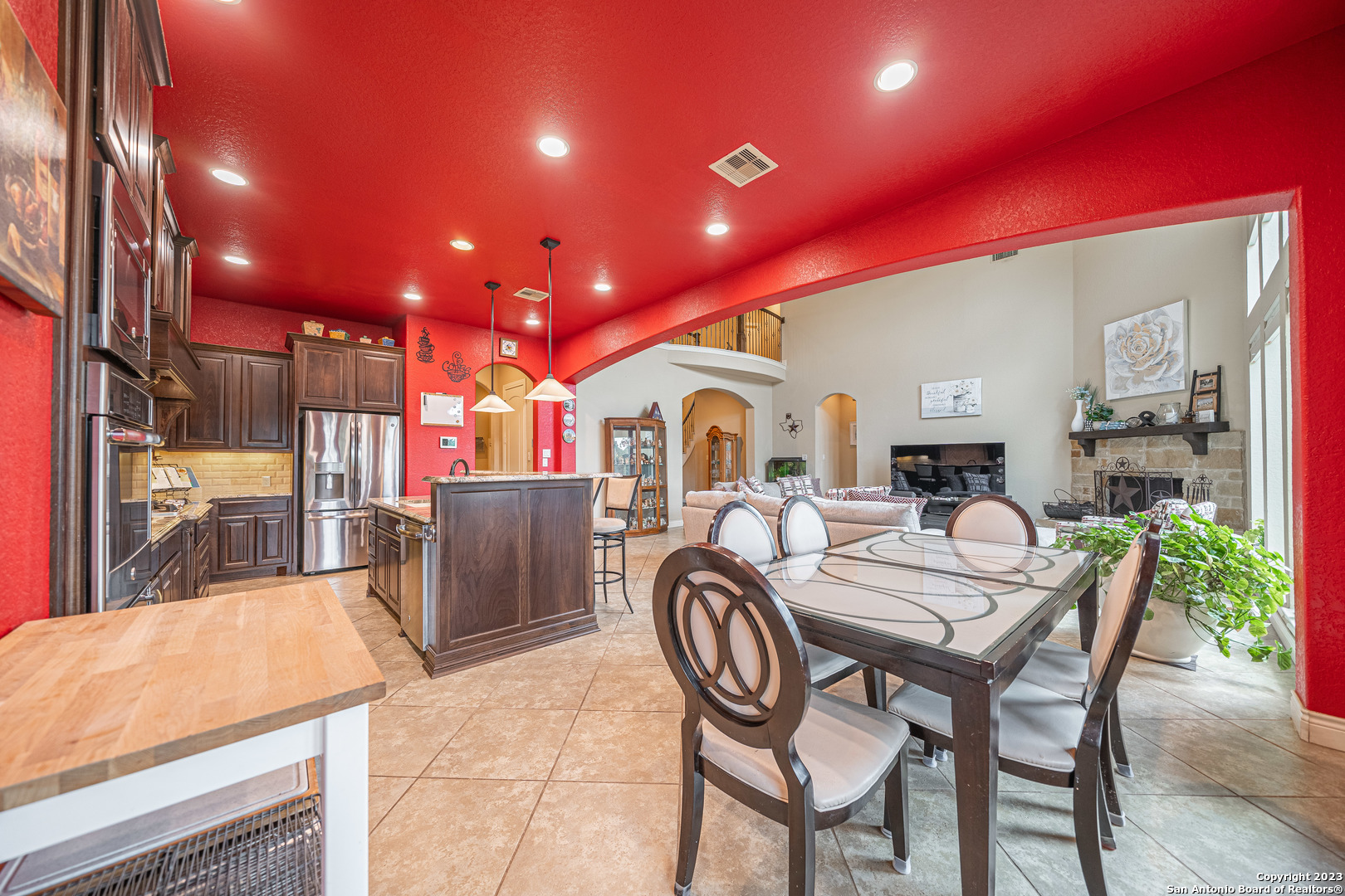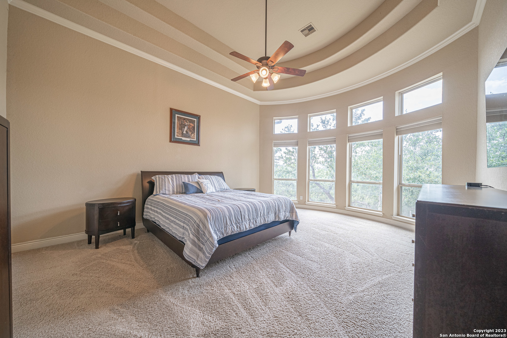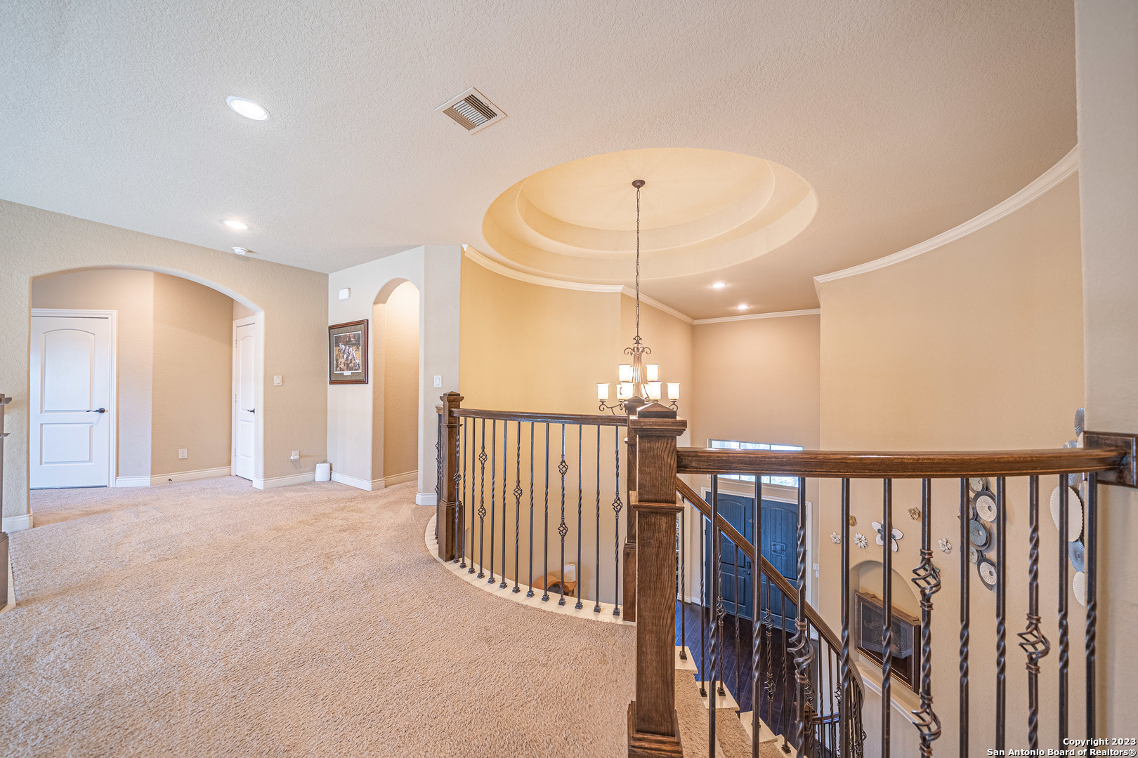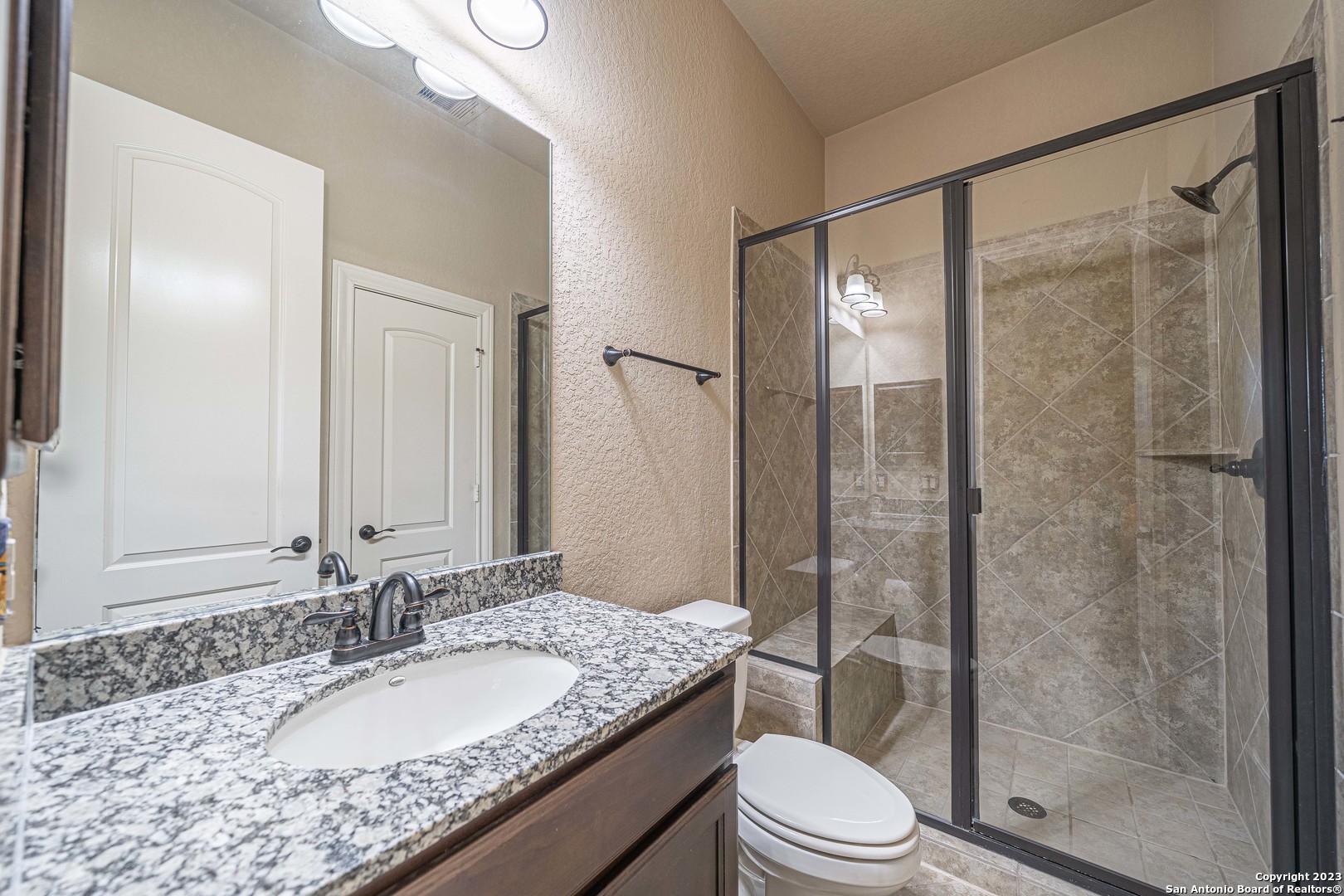Why wait to build when you can own this meticulously maintained home sooner? Inviting & abundance are the cornerstones of this Gem nestled in the highly desirable community of Vintage Oaks! 1+ acres and Slightly shy of 5000 sqft, with 5 bedrooms and 4.5 baths & 4-Car Garage, there's plenty of space for your whole family to spread out & enjoy. As you enter the home, you'll be greeted by a Grand Mahogany front door and stunning hardwood floors. The Rotunda foyer & curved staircase w/ iron balusters add elegance while the study/library w/French doors and the formal dining room provide space for work & fine dining. The various arched entries throughout the home are intrinsic to the soaring ceilings, open floorplan, and exquisite features creating a spacious welcoming atmosphere. Whether for relaxation or socializing, the living room exudes a sense of refined aesthetics. The plethora of large windows allows an abundance of natural light to fill the space, highlighting the room's expansive & creative layout. The placement of the cast stone fireplace blends harmoniously, not only providing a functional purpose but also serving as a visually appealing centerpiece. The overall architectural design creates a balance between modern elegance and timeless charm. Not only is this home stunning, but it is also energy-efficient. With features such as a New Water heater, FreshAir Intake system, Techshield radiant barrier, Energy Star appliances, and a PEX plumbing system for water quality, you can enjoy a comfortable eco-friendly lifestyle and savings year-round! The stunning Owner's suite allows for a serene escape after a long day. Thoughtfully located on the first level, offers privacy & elegance w/ its sense of grandeur beveled ceilings & large bay windows, allowing for picturesque views of nature. The bedroom exudes a sense of tranquility w/ an enhanced atmosphere of comfort. Indulge in luxurious relaxation as you step into this spa-like oasis -where a gorgeous walk-in shower & the enchanting garden tub awaits beneath the gentle glow of natural light. The Guest suite also located on the first level offers convenience & privacy for your guests, providing the ultimate retreat experience. Entertain family & friends as this home also features a massive game room and a theater room, complete with a built-in state-of-the-art surround sound speaker system, elevated flooring, & ambient changing hue lighting. Bringing the unparalleled cinematic experience home & enjoying endless entertainment options! Ignite your culinary creativity in the bold & vibrant kitchen, where the warm embrace of crimson walls sets the stage for delicious creations & lively conversations. With granite countertops, a beautiful backsplash, rich cabinetry & stainless-steel appliances including a gas stove, it's a chef's dream! The refrigerator is a special order for a custom fit. 1 of the 2 refrigerators conveys! The Extraordinary arched entry, island w/ built-in seating space, and butler's pantry add to its opulence & beauty. Take in the beauty of nature & deer from the large extended covered patio which is perfect for enjoying a cup of coffee or engaging in conversations with/ loved ones. The lot boasts mature trees & includes planted lemon & lime trees, cherry blossom, fragrant lavender, and Fully Covered Gutters to help eliminate leaf cleaning. A spectacular Pool plan w/ extended decking & concrete is also available for review. Let your imagination soar as you picture yourself in this luxurious abode, enjoying all that the Historic Hill Country of New Braunfels has to offer. Located w/in a convenient commute to the neighboring cities of San Antonio & Austin, as well as the historic town of Gruene & Canyon Lake. The List goes on! Definitely a MUST SEE!! **A seller's Concession to assist with Closing costs, Interest Rate buy-downs, etc. may be available with an acceptable offer**