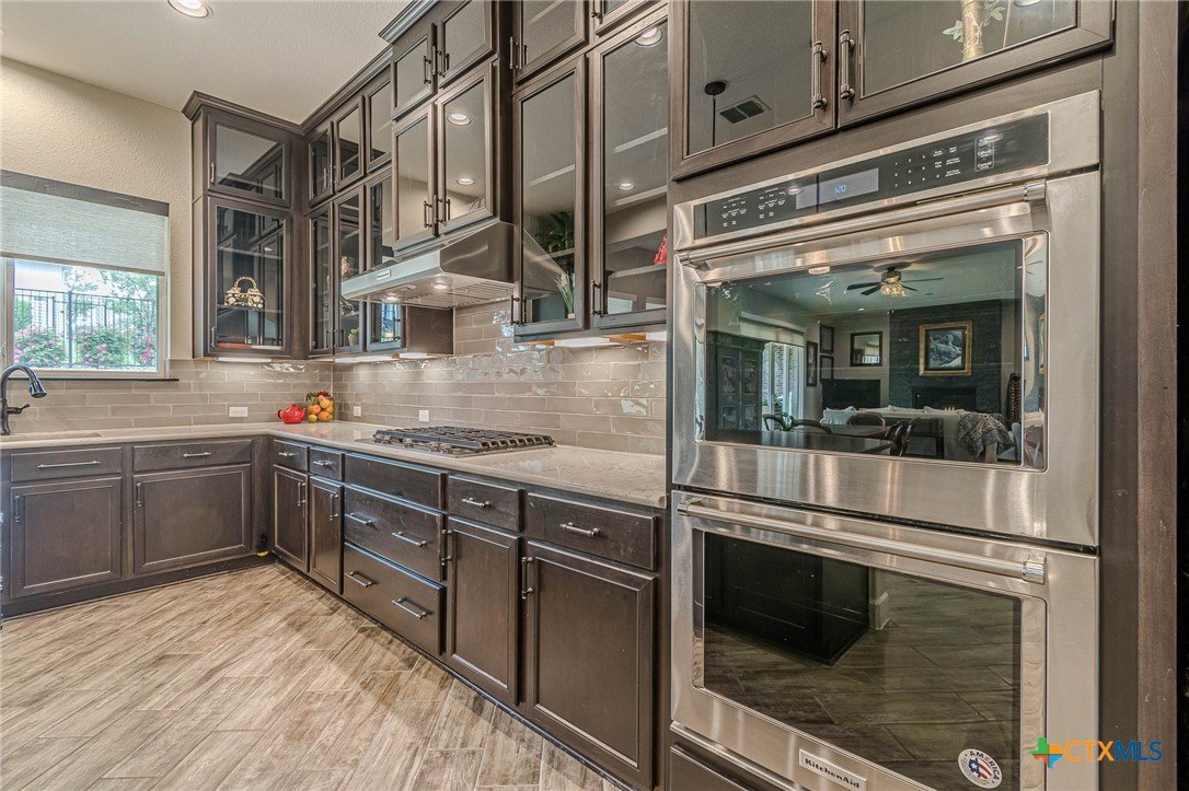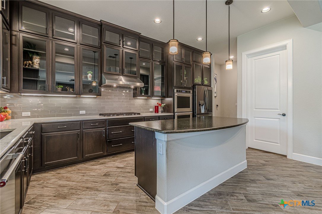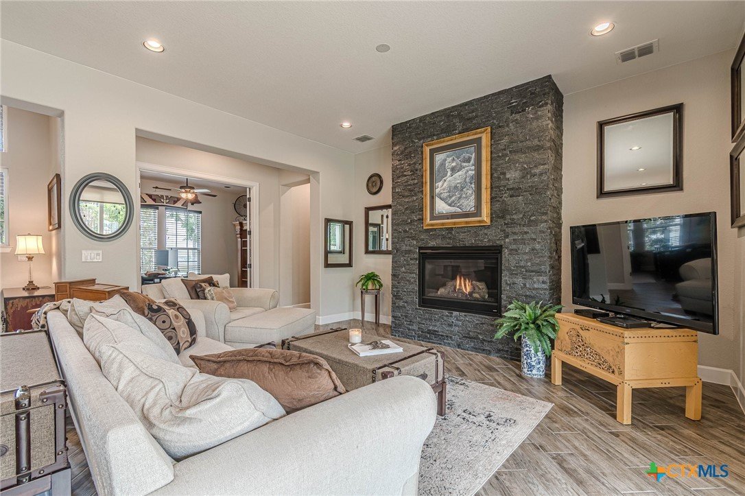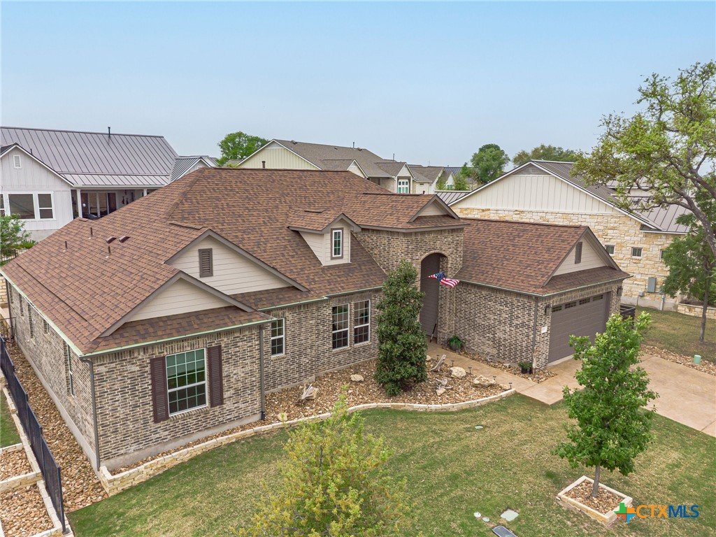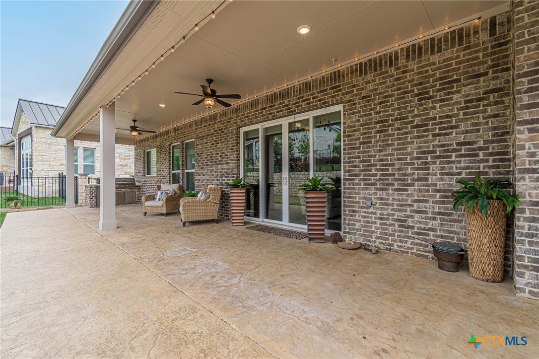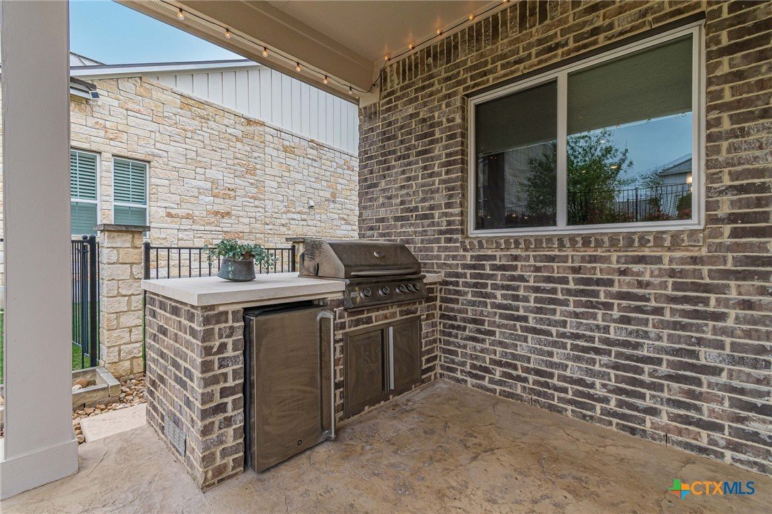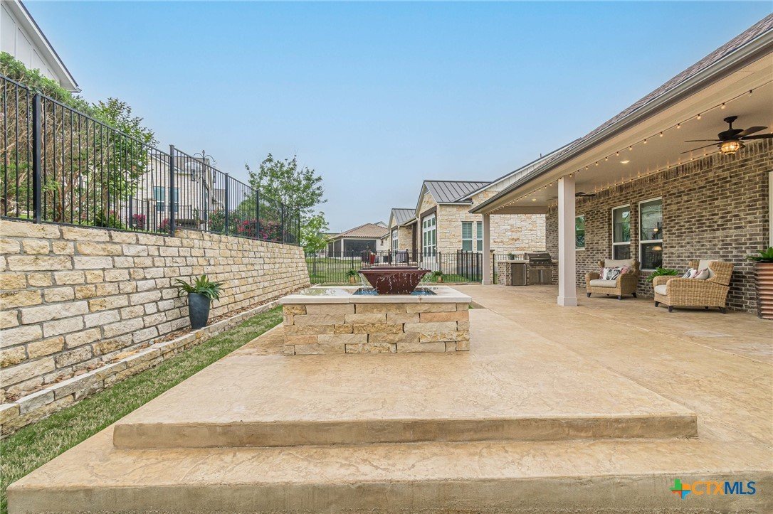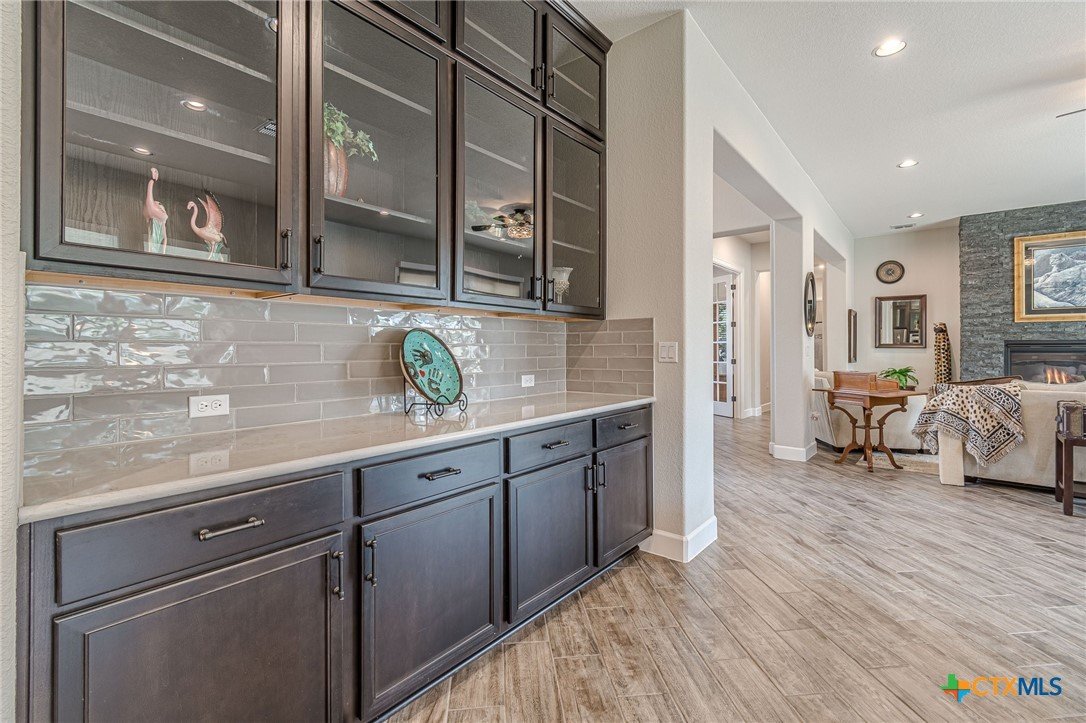 If you've been looking for a home with a real WOW factor - you just found it! No exaggeration on all that this home has to offer. Located on a corner lot, features and upgrades are extensive - starting with the stained cement textured patio in front and in the back yard - full 4 sides brick home, with 2 story entry ceilings for a grand entry! Walk into comfort and luxury with this open concept living/dining/kitchen. Living room features a beautiful stacked stone fireplace with lots of natural light and a double door entry to a spacious study - to give that maximum open feel. Take a look at this beautiful kitchen with custom glass front cabinets extended to the ceiling, butler pantry/dry bar for entertaining guests - and an oversized island kitchen to check every box you could want. Double ovens, built in microwave, five burner gas stove top and huge walk in pantry make this a dream kitchen! The oversized main bedroom gives a true owner retreat with a beautiful large bathroom featuring double vanities and a grand walk in shower with seat and frameless shower glass. But just when you think all the boxes are checked, step out into the back yard for a true entertainment delight with a water/fire feature to relax and enjoy, an extensive back covered patio the length of the home, a built in BBQ/outdoor kitchen and an extra large outdoor gathering spot to maximize your outdoor living options. Bonus included is the oversized garage which gives plenty of room for a golf cart and/or extra storage with the four foot garage extension and a whole house generator in case of emergency. This is a very active 55 plus adult community that allows for living the best of life! Come check out all the amenities; including bocce ball, pickleball, golf, putt putt golf, a community restaurant, biergarten, library, dart depot, art studio, - and so much more. This home checks all the boxes - call now to schedule your private showing.