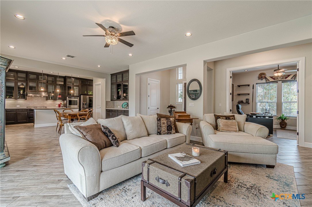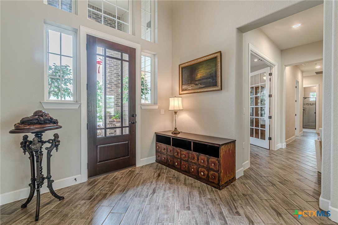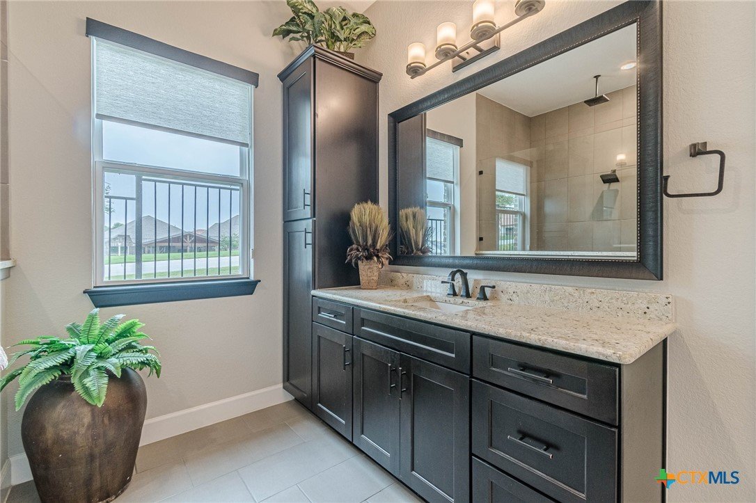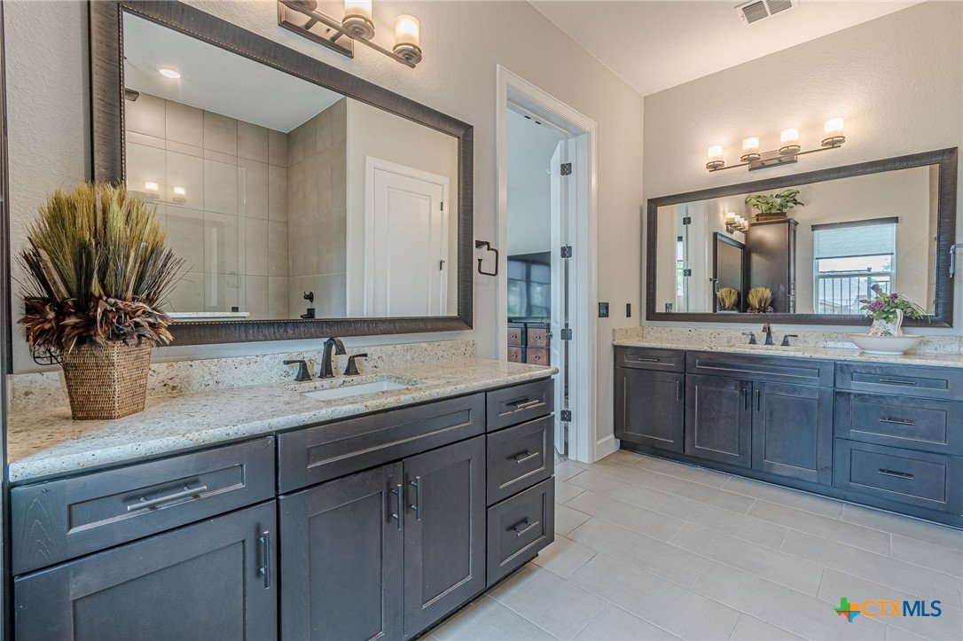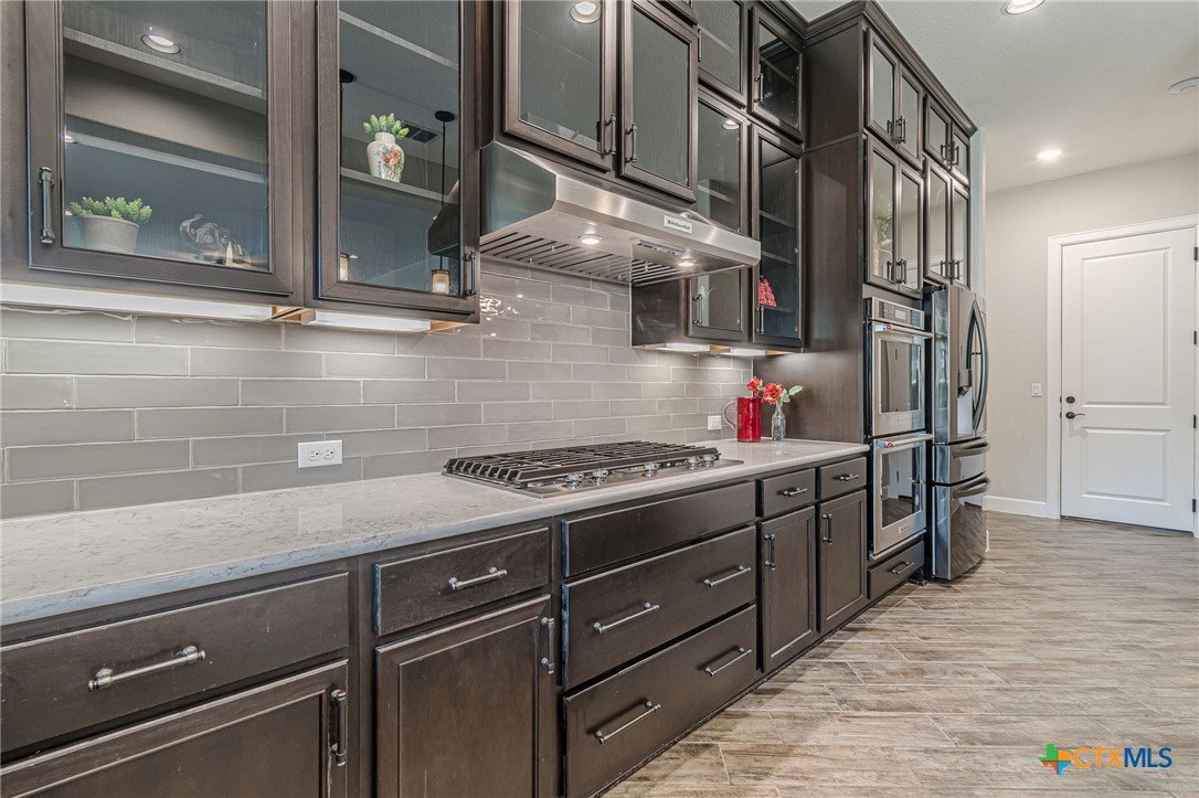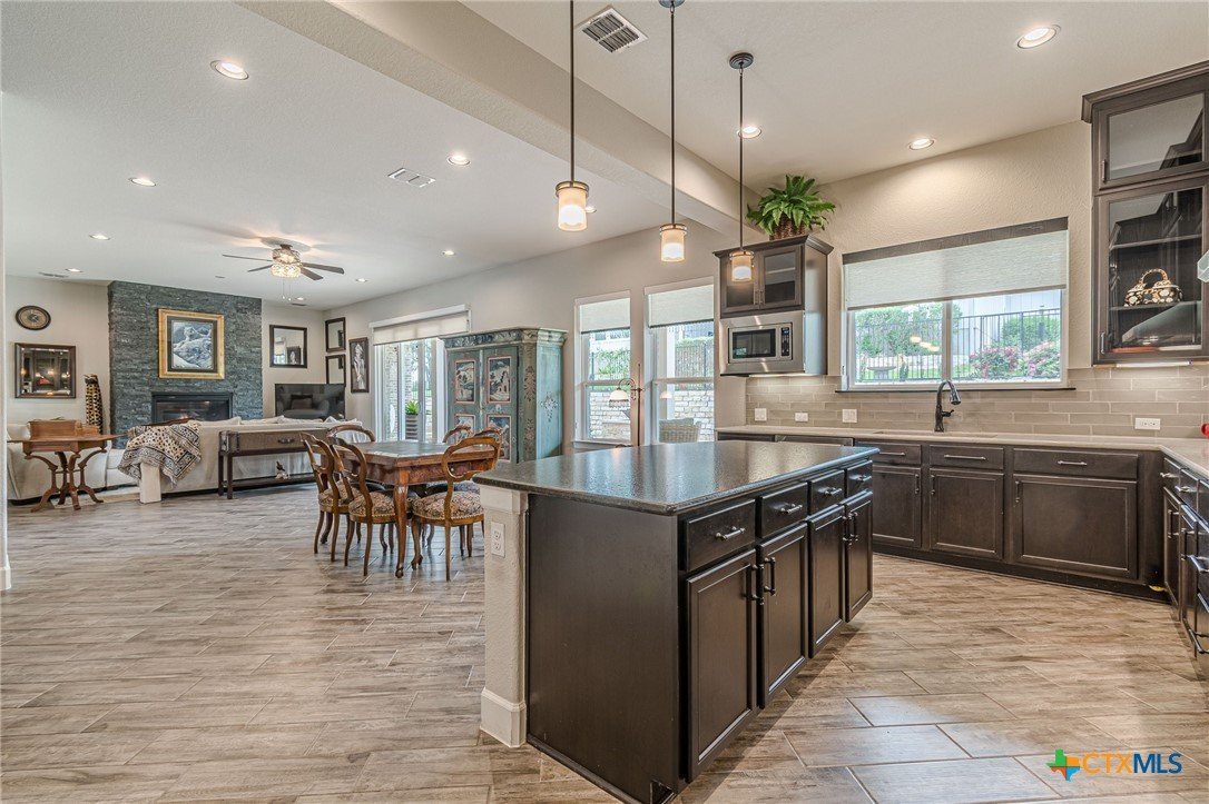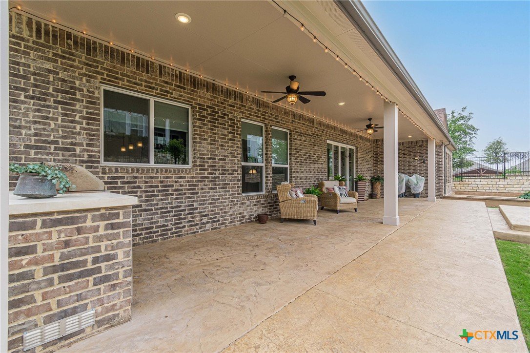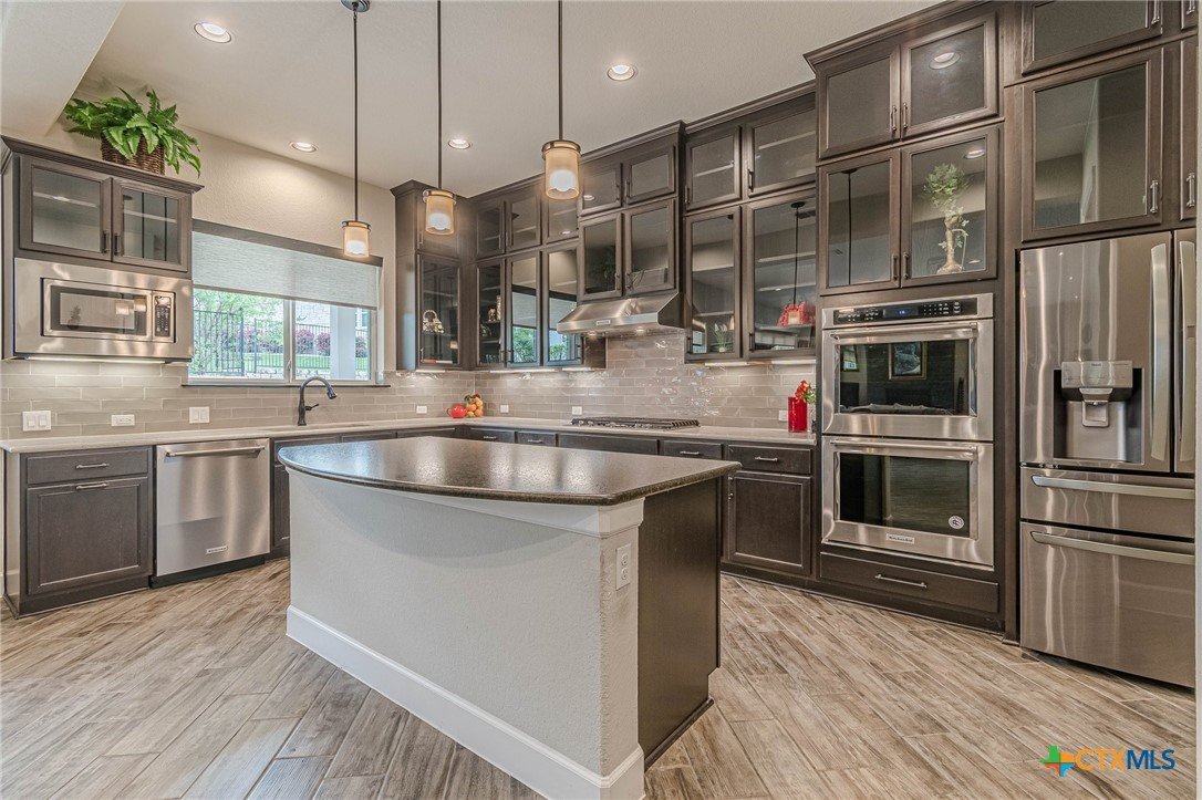 If you've been looking for a home with a real WOW factor - you just found it! No exaggeration on all that this home has to offer. Located on a corner lot, features and upgrades are extensive - starting with the stained cement textured patio in front and in the back yard - full 4 sides brick home, with 2 story entry ceilings for a grand entry! Walk into comfort and luxury with this open concept living/dining/kitchen. Living room features a beautiful stacked stone fireplace with lots of natural light and a double door entry to a spacious study - to give that maximum open feel. Take a look at this beautiful kitchen with custom glass front cabinets extended to the ceiling, butler pantry/dry bar for entertaining guests - and an oversized island kitchen to check every box you could want. Double ovens, built in microwave, five burner gas stove top and huge walk in pantry make this a dream kitchen! The oversized main bedroom gives a true owner retreat with a beautiful large bathroom featuring double vanities and a grand walk in shower with seat and frameless shower glass. But just when you think all the boxes are checked, step out into the back yard for a true entertainment delight with a water/fire feature to relax and enjoy, an extensive back covered patio the length of the home, a built in BBQ/outdoor kitchen and an extra large outdoor gathering spot to maximize your outdoor living options. Bonus included is the oversized garage which gives plenty of room for a golf cart and/or extra storage with the four foot garage extension and a whole house generator in case of emergency. This is a very active 55 plus adult community that allows for living the best of life! Come check out all the amenities; including bocce ball, pickleball, golf, putt putt golf, a community restaurant, biergarten, library, dart depot, art studio, - and so much more. This home checks all the boxes - call now to schedule your private showing.