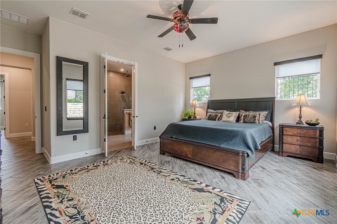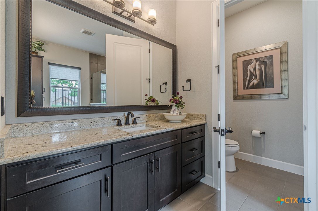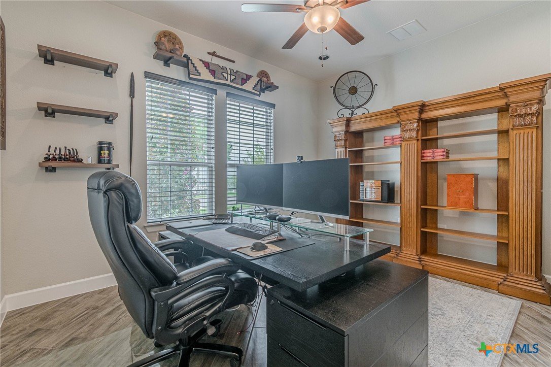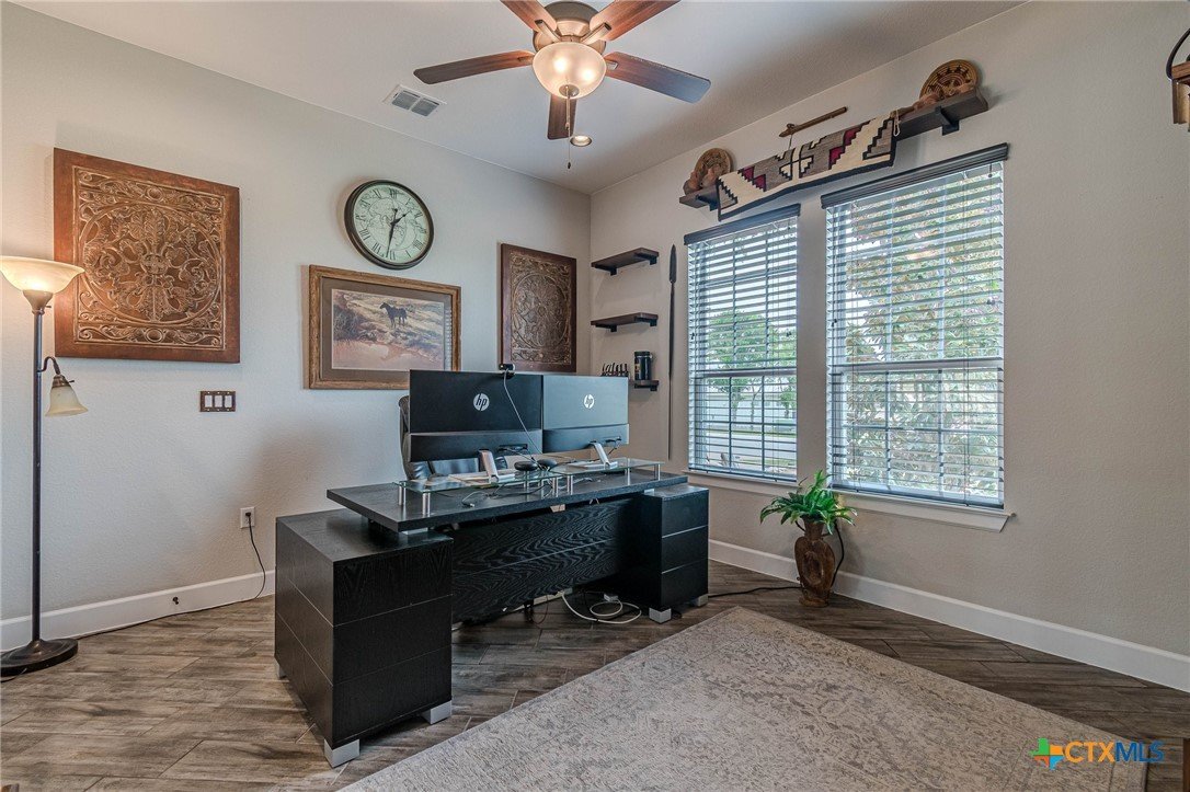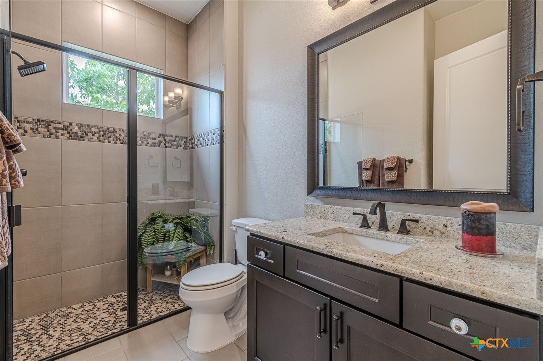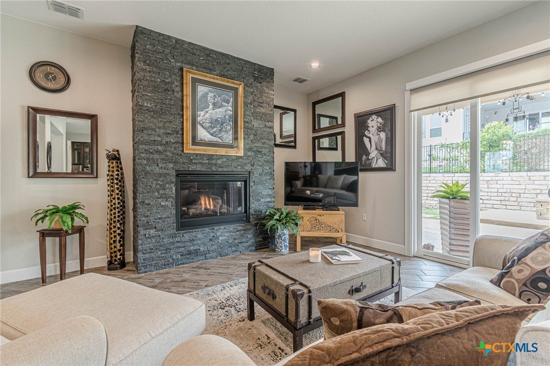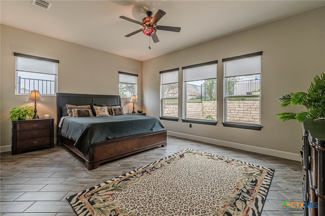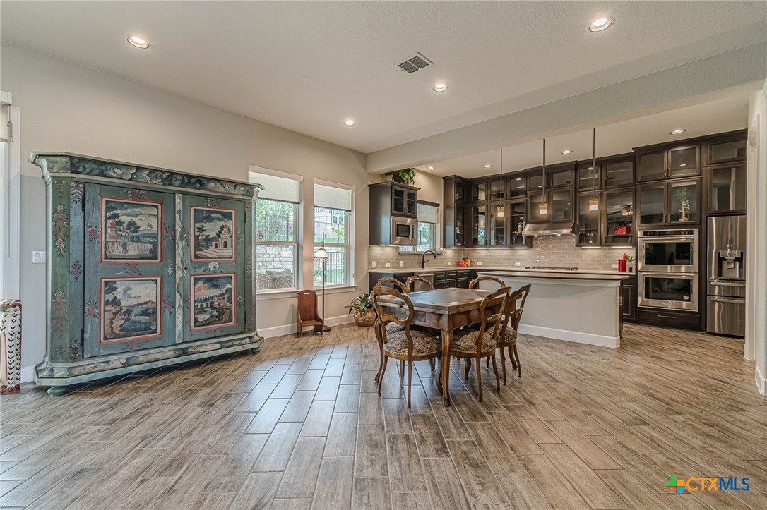 If you've been looking for a home with a real WOW factor - you just found it! No exaggeration on all that this home has to offer. Located on a corner lot, features and upgrades are extensive - starting with the stained cement textured patio in front and in the back yard - full 4 sides brick home, with 2 story entry ceilings for a grand entry! Walk into comfort and luxury with this open concept living/dining/kitchen. Living room features a beautiful stacked stone fireplace with lots of natural light and a double door entry to a spacious study - to give that maximum open feel. Take a look at this beautiful kitchen with custom glass front cabinets extended to the ceiling, butler pantry/dry bar for entertaining guests - and an oversized island kitchen to check every box you could want. Double ovens, built in microwave, five burner gas stove top and huge walk in pantry make this a dream kitchen! The oversized main bedroom gives a true owner retreat with a beautiful large bathroom featuring double vanities and a grand walk in shower with seat and frameless shower glass. But just when you think all the boxes are checked, step out into the back yard for a true entertainment delight with a water/fire feature to relax and enjoy, an extensive back covered patio the length of the home, a built in BBQ/outdoor kitchen and an extra large outdoor gathering spot to maximize your outdoor living options. Bonus included is the oversized garage which gives plenty of room for a golf cart and/or extra storage with the four foot garage extension and a whole house generator in case of emergency. This is a very active 55 plus adult community that allows for living the best of life! Come check out all the amenities; including bocce ball, pickleball, golf, putt putt golf, a community restaurant, biergarten, library, dart depot, art studio, - and so much more. This home checks all the boxes - call now to schedule your private showing.