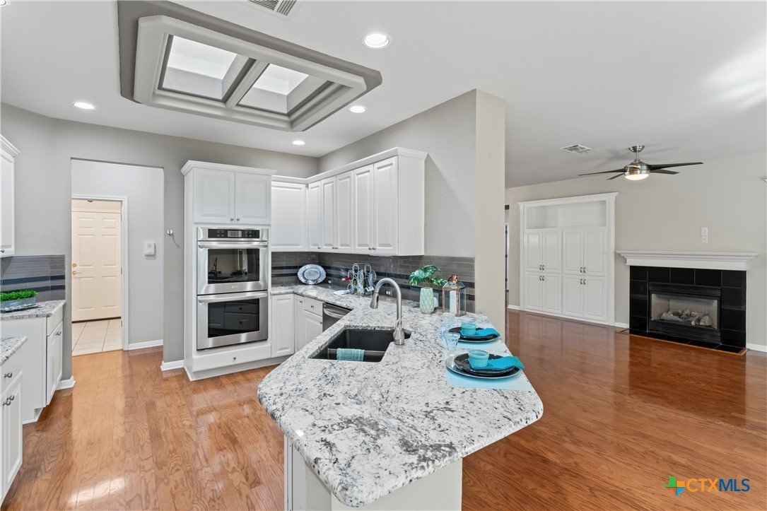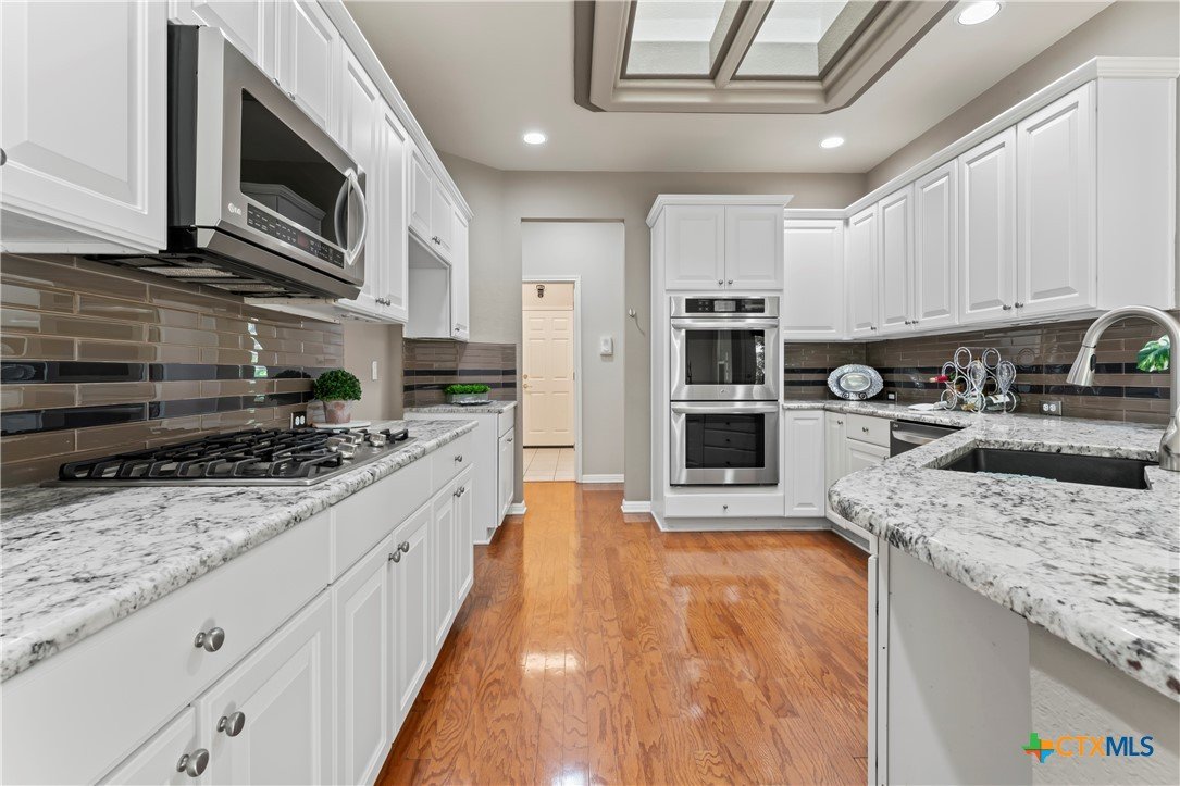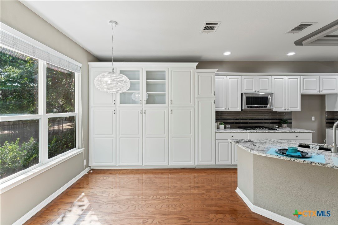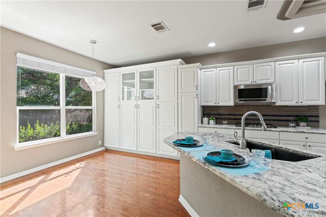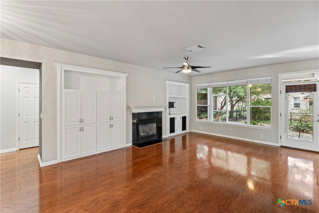 Tucked away on a peaceful street in Sun City, Texas, nestled among gorgeous oaks, your beautiful new home awaits. Featuring numerous upgrades including custom built-in cabinets, privacy blinds, built-in appliances, updated light fixtures and granite countertops. The home boasts relaxation. Make sure to check out its large screened in patio that opens out to the enchanting backyard, shaded by numerous trees. The backyard's low maintenance rock courtyard and zeroscape aesthetic are just one of the home's many added conveniences! The ample storage and Bowie floor plan make this home incredibly functional. Schedule a private showing today!