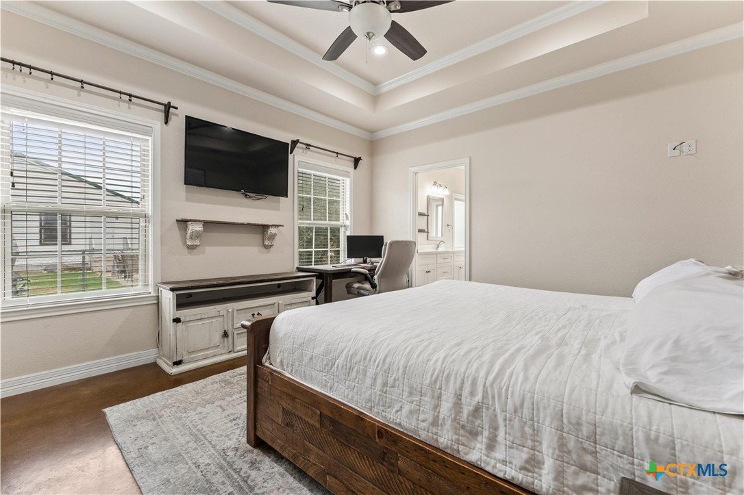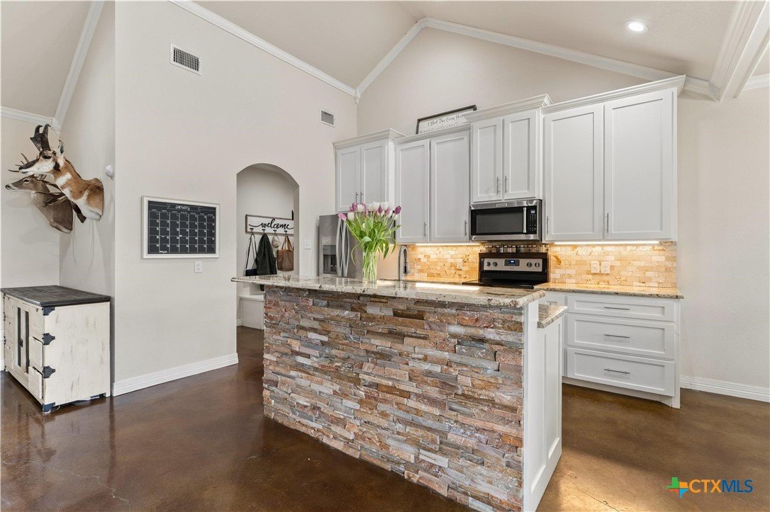 Tucked just behind Griff’s off China Spring Road in the highly sought-after China Spring ISD, 10514 Mesa Drive offers quiet neighborhood living with easy access to Waco and just a stone’s throw from locally owned coffee shops, boutiques, and dining. This thoughtfully designed home maximizes every square foot with a split-concept floor plan, privacy hallways to each bedroom, and ample storage throughout. The open living, kitchen, and dining area features vaulted ceilings, a stone, wood-burning fireplace, and low-maintenance stained concrete flooring, creating an airy, cohesive space perfect for everyday living and entertaining. The kitchen flows seamlessly into the living area and boasts granite countertops, upgraded cabinetry, and generous prep and storage space. A dedicated mudroom keeps daily routines organized and functional. The primary suite is a private retreat with a tray ceiling, dual vanities, separate soaking tub, and walk-in shower. Additional highlights include a laundry room with built-in storage, double-pane windows, foam insulation, and a two-year-old roof for peace of mind. Step outside to a spacious backyard with an extended covered patio, ideal for morning coffee, cookouts, or relaxing in the shade. Out front, a fruitful pecan tree adds charm and natural beauty. With thoughtful design, modern upgrades, and a location that balances comfort, convenience, and highly rated schools, this home is truly move-in ready.