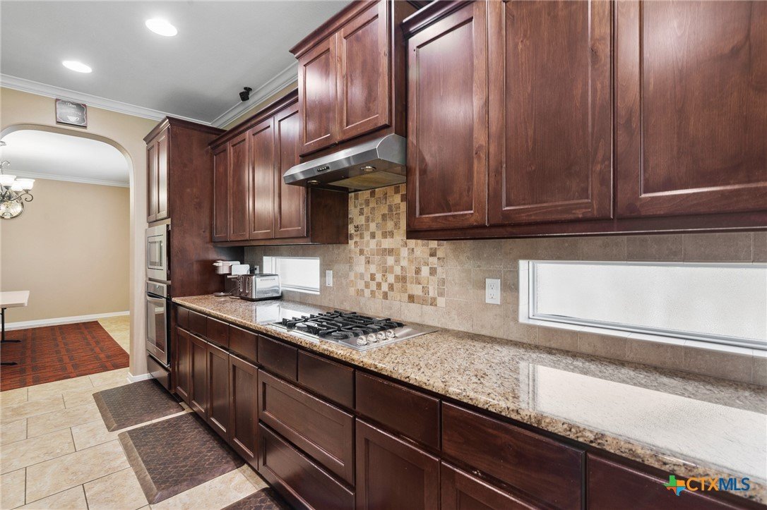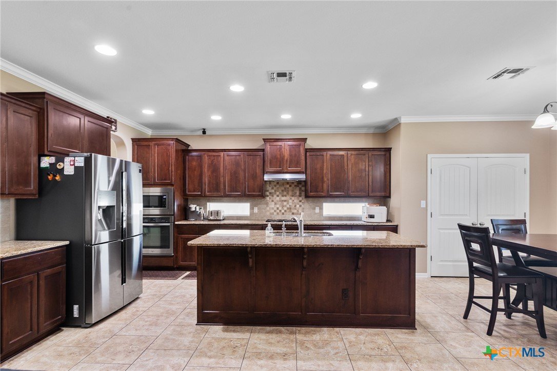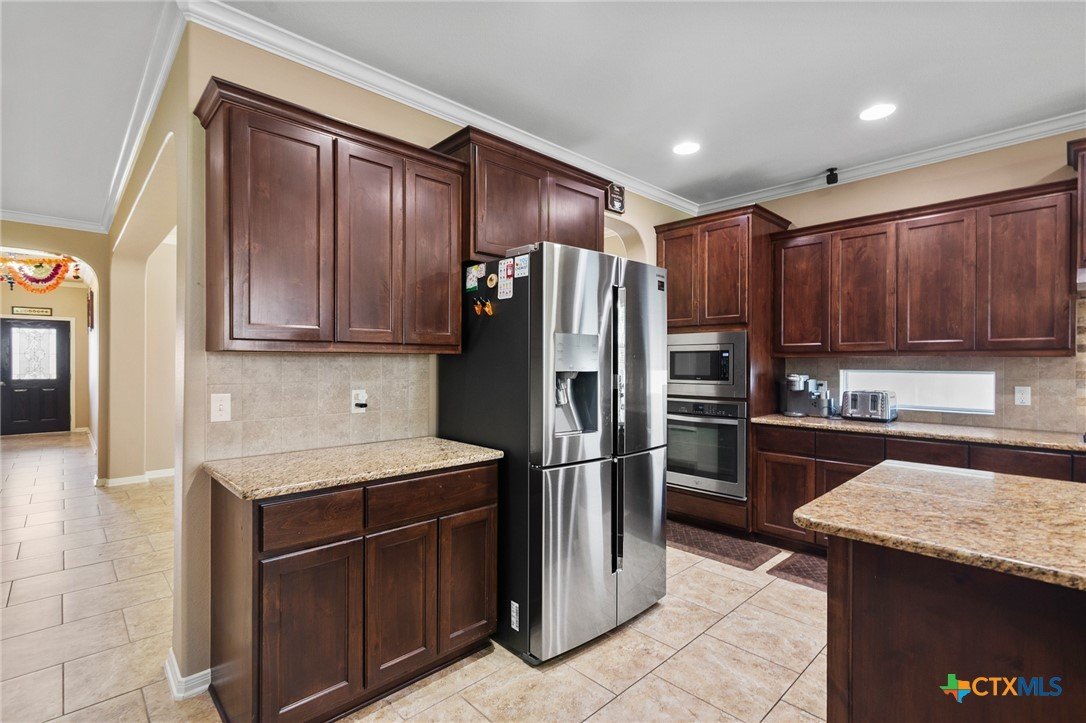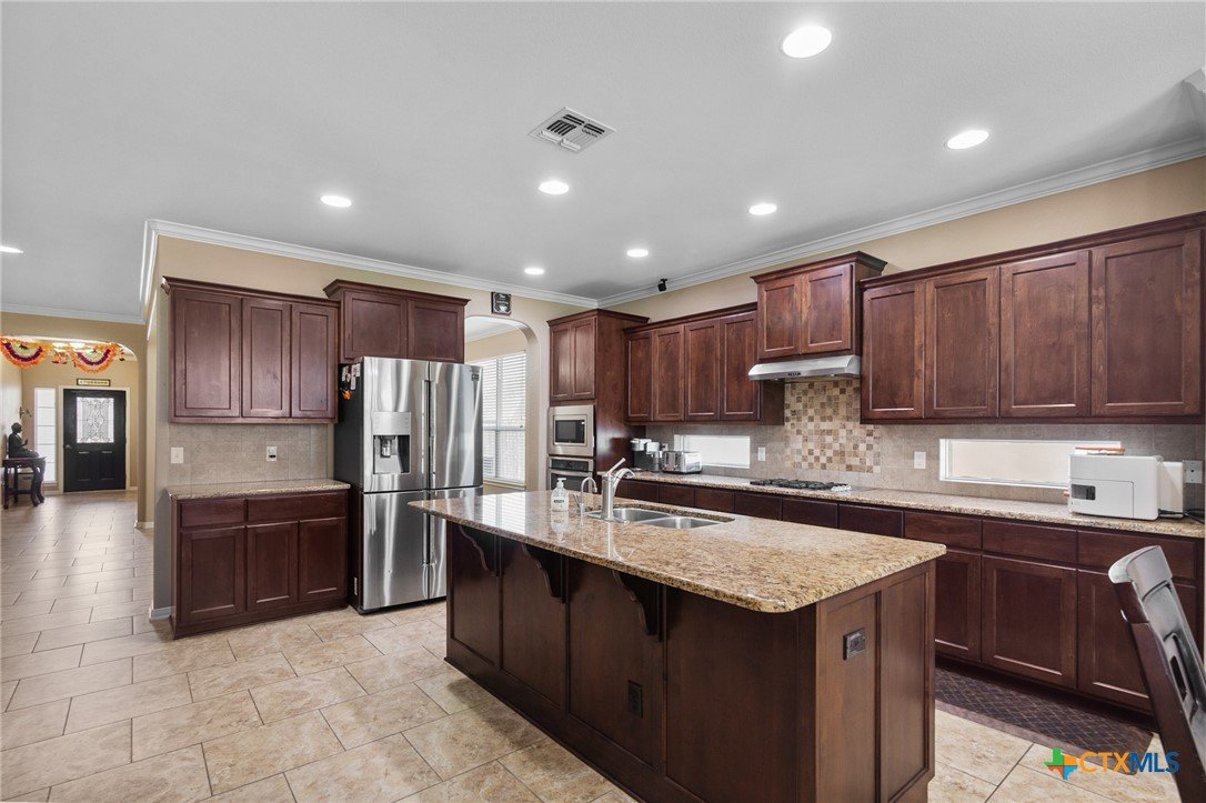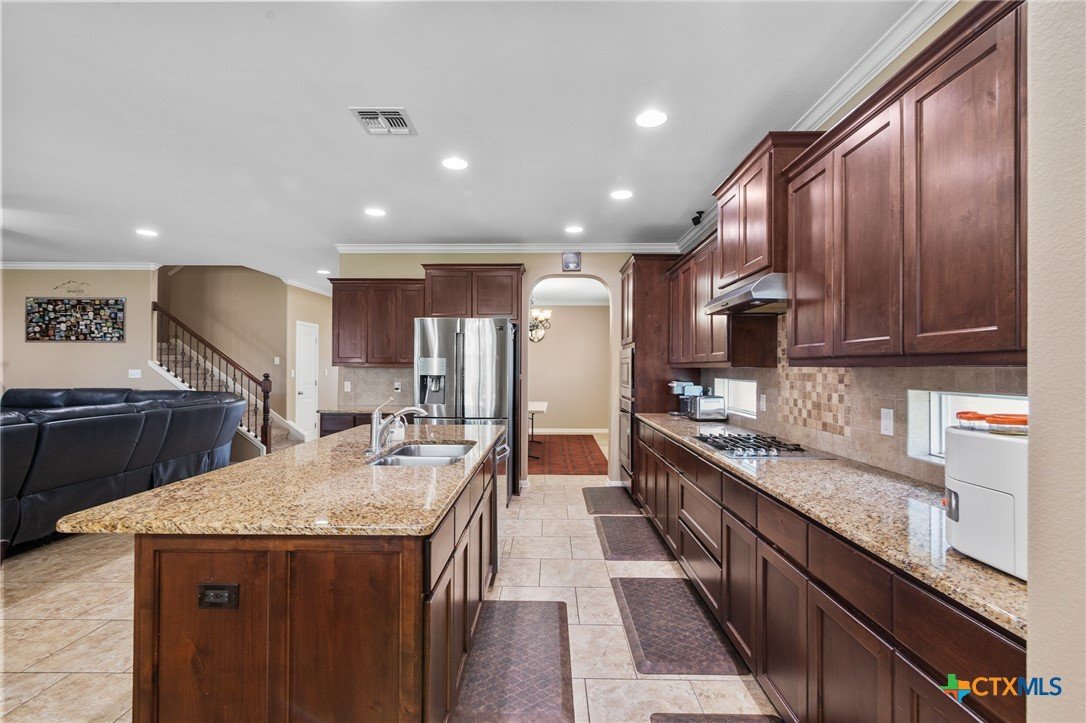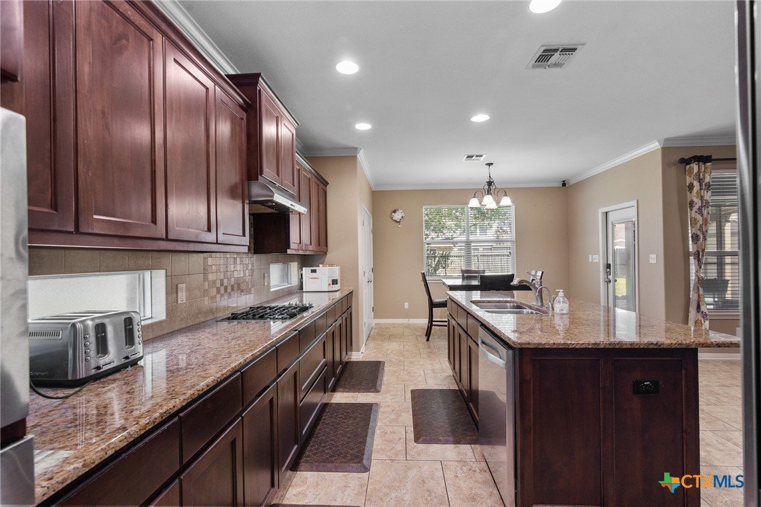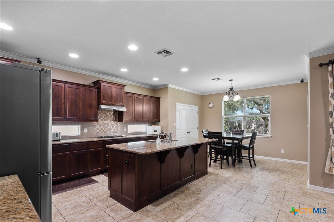 Attractive and spacious gem in Terra Vista! This 5 bedroom and 4 full bath home has it all-multiple living and dining spaces, a split floor plan with an additional flex space or game room upstairs, and a centrally located laundry room with additional storage. The kitchen opens into the large living space and has a huge granite central island, gas cook top, separate oven, large pantry, and breakfast area. The primary bedroom features tray ceilings and a beautiful en-suite bath with large walk-in closet. Check out the large screened in porch and get ready to host all-season backyard events!
