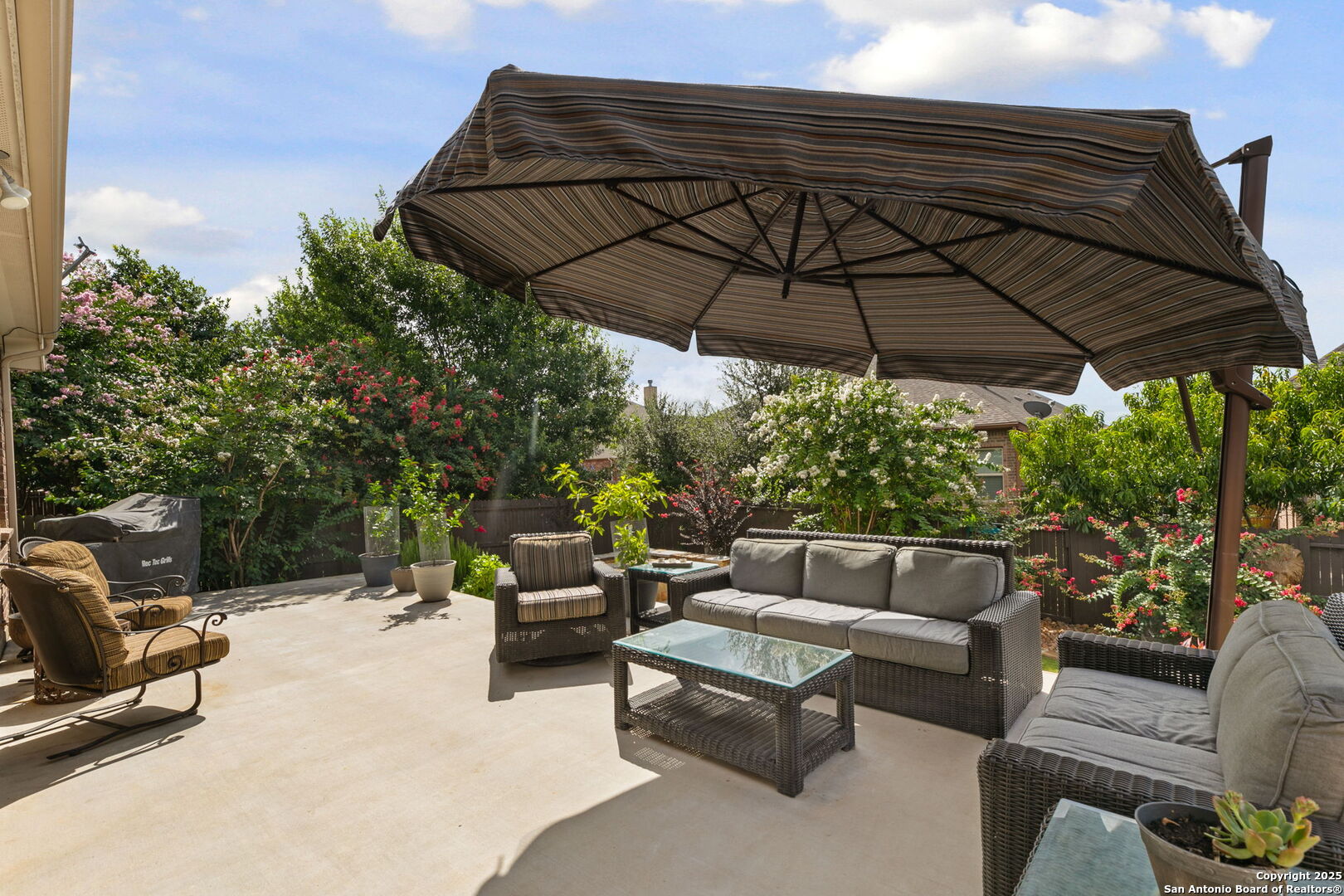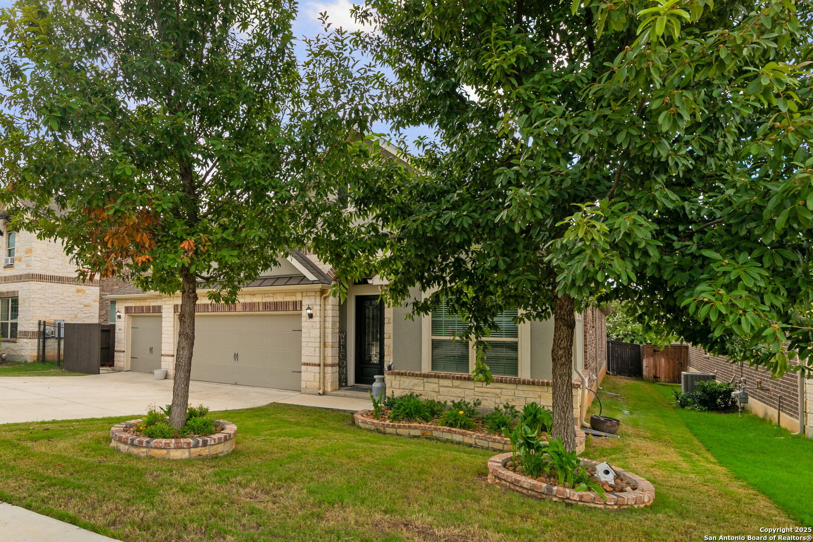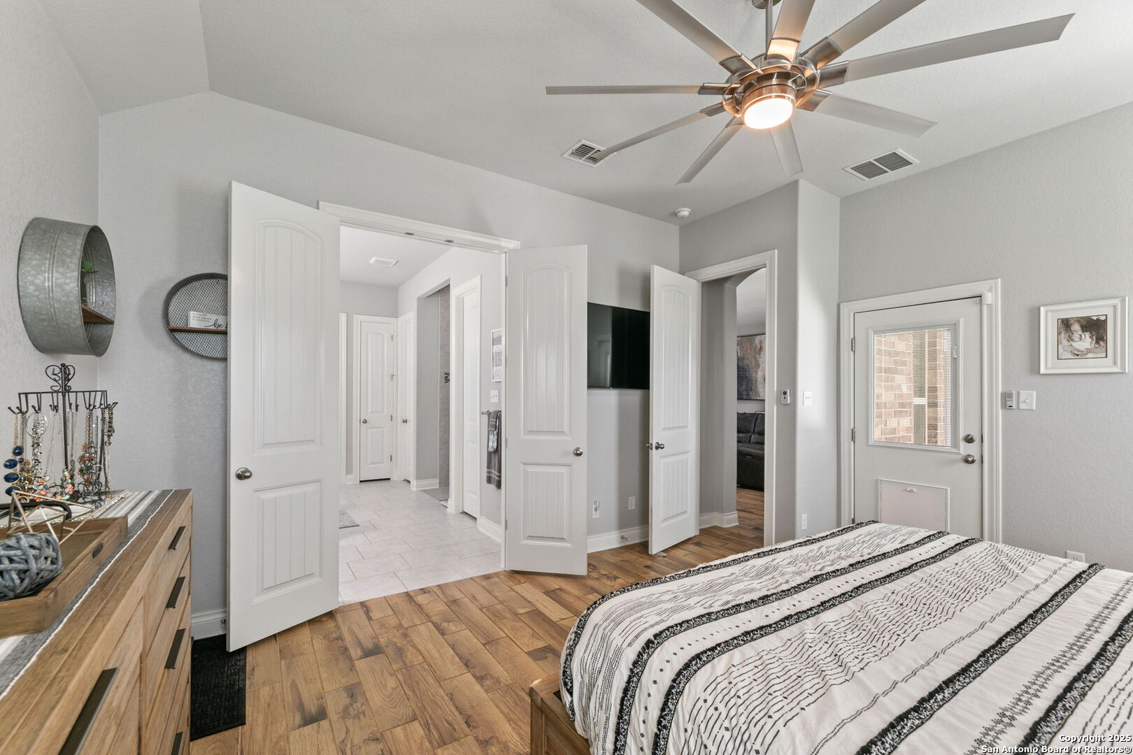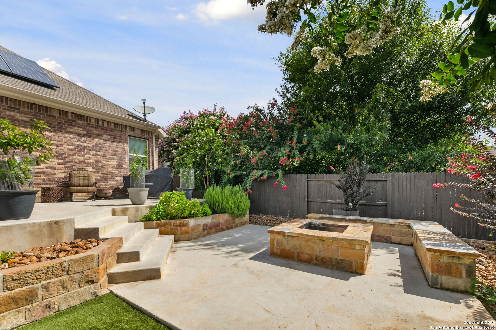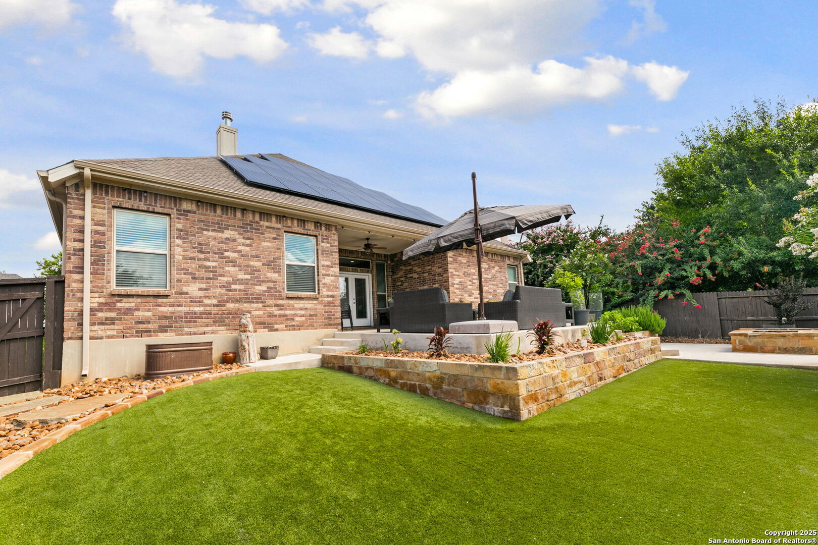 Discover the unique features of this wonderfully designed Ashton Woods home, boasting a multi-generational plan and numerous builder's upgrades. The flexible upper-level show cases a wet bar, sink, refrigerator, and a spacious 4th bedroom complete with a walk-in closet. Luxurious amenities abound, including a walk-in jet tub, and bidet toilet. The Master Suite, which is conveniently situated on the main level alongside a primary bath featuring separate vanities and walk-in closets. Enhanced by wood-look tiles and 8' doors throughout the lower level, this residence also offers carpeting in the two-guest bedrooms. Additional highlights encompass a separate office, a formal dining room or use as a flex room, a generous kitchen with a gas cooktop, and an abundance of storage space. Noteworthy seller upgrades include 26 solar panels to reduce monthly electricity costs, a Solaris PCO, IAQ Air Purifier system, and water softener. Delight in approximately 480 sq ft of expanded patio space featuring a charming fire pit, as well as a low maintenance fenced backyard with artificial grass. The property is equipped with a 7-zone irrigation system and two separate attics for added functionality. Short drive to medical, shopping, the rivers and Schlitterbahn activities. This home is a must see!