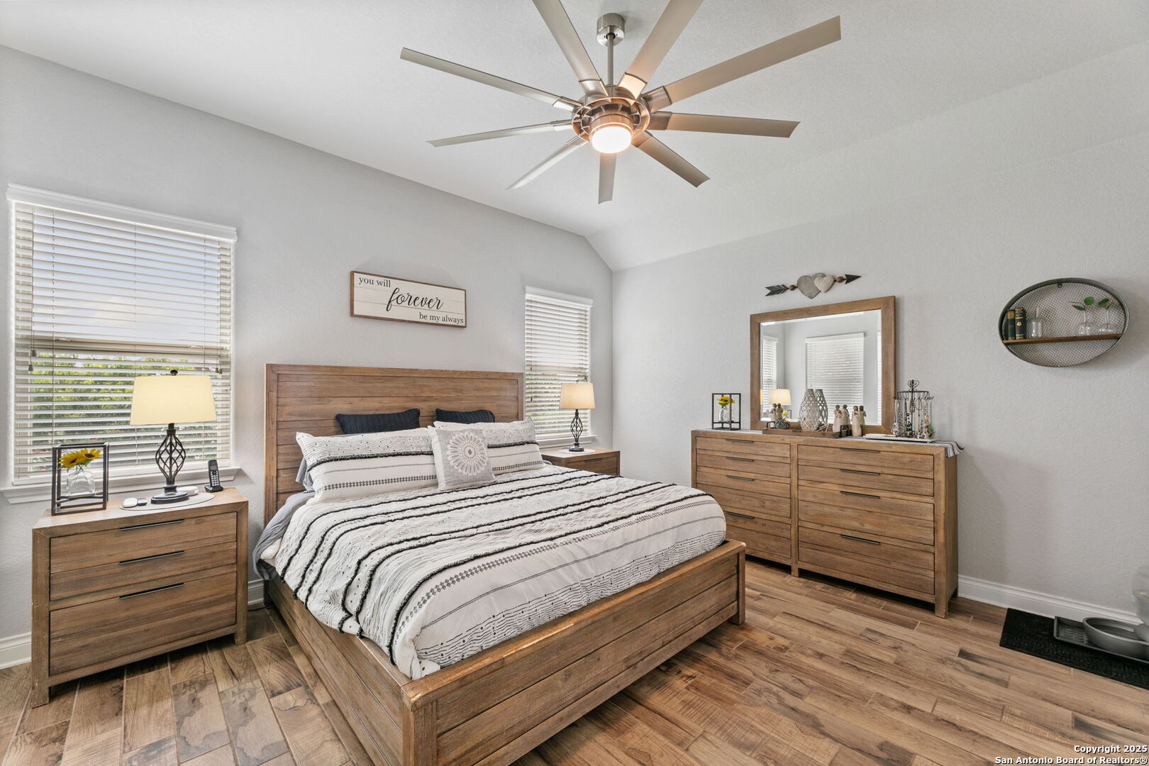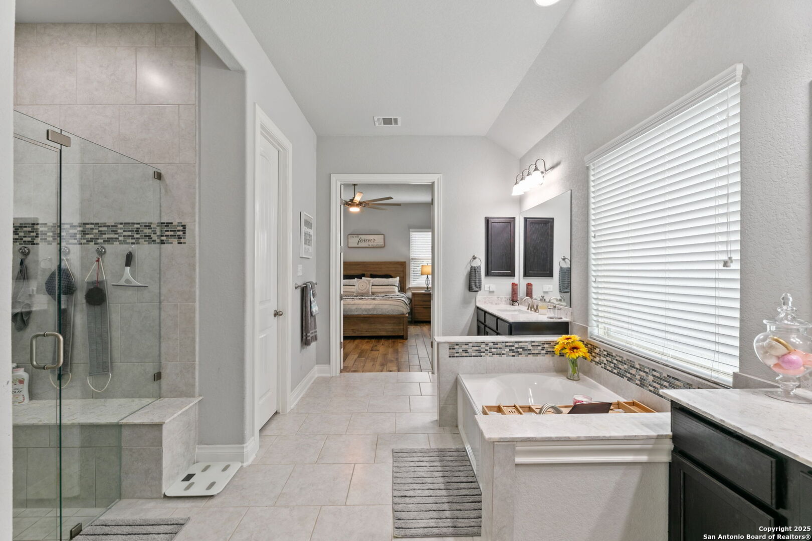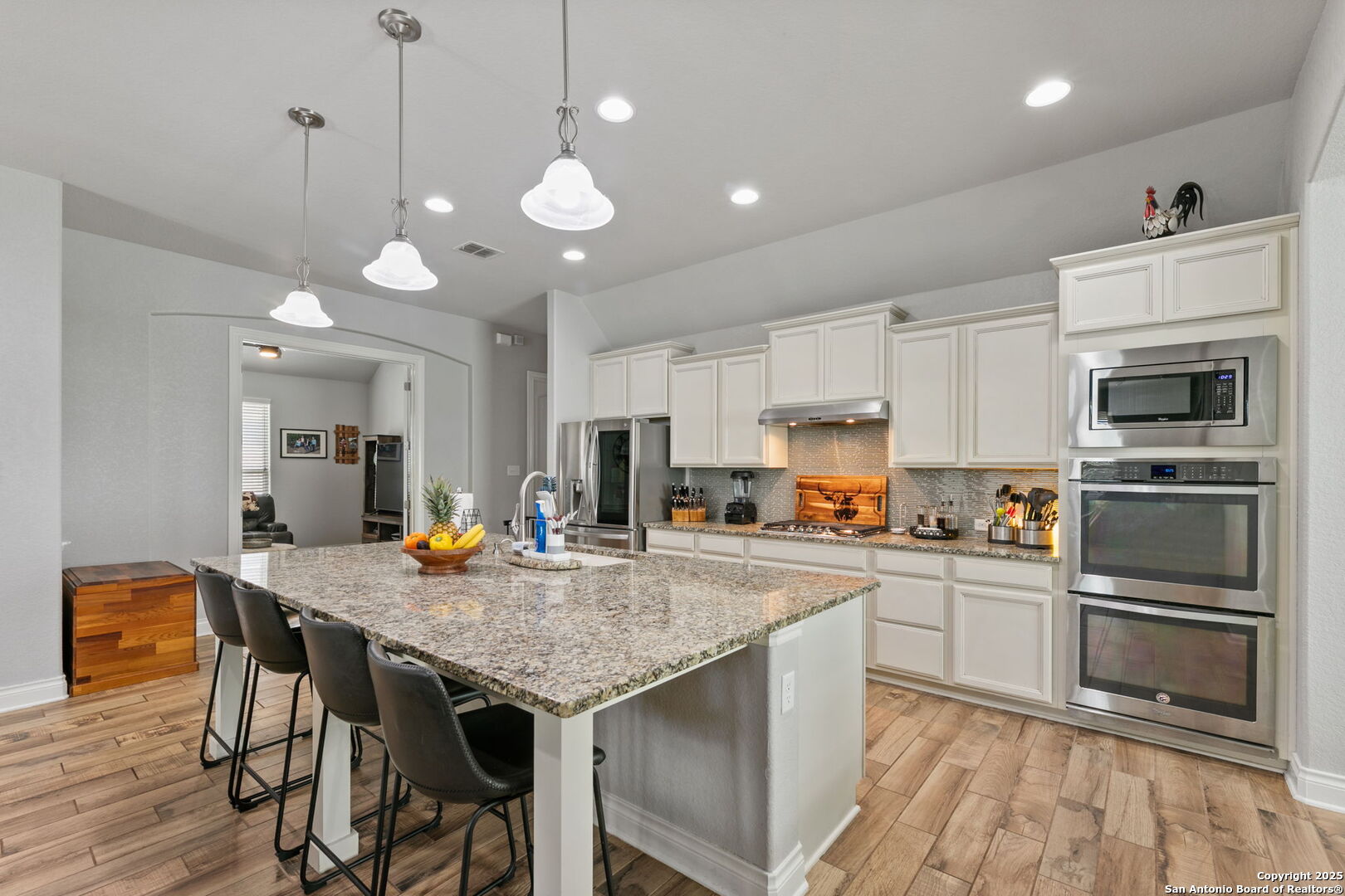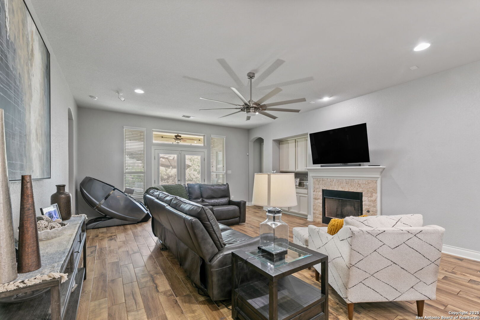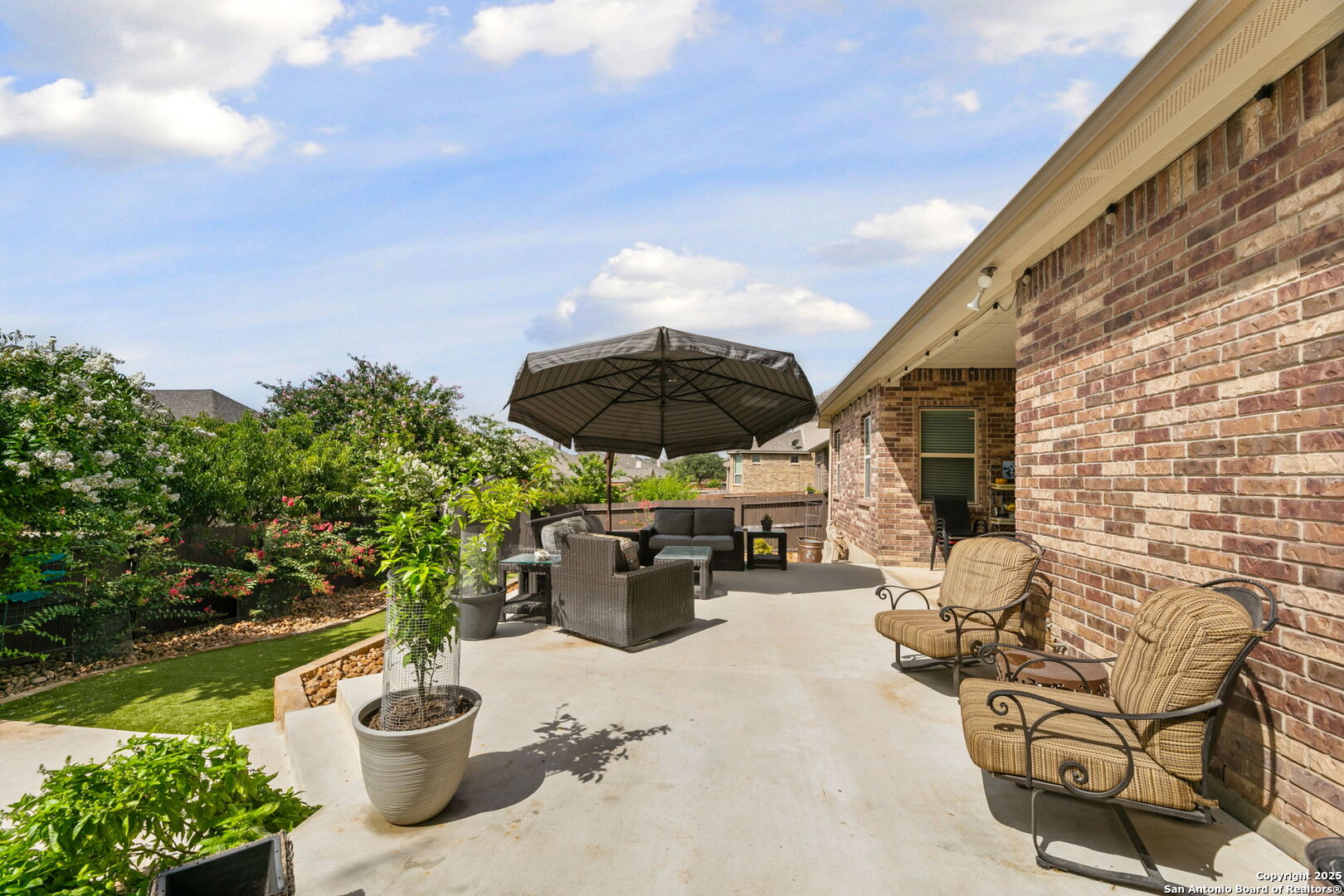 Discover the unique features of this wonderfully designed Ashton Woods home, boasting a multi-generational plan and numerous builder's upgrades. The flexible upper-level show cases a wet bar, sink, refrigerator, and a spacious 4th bedroom complete with a walk-in closet. Luxurious amenities abound, including a walk-in jet tub, and bidet toilet. The Master Suite, which is conveniently situated on the main level alongside a primary bath featuring separate vanities and walk-in closets. Enhanced by wood-look tiles and 8' doors throughout the lower level, this residence also offers carpeting in the two-guest bedrooms. Additional highlights encompass a separate office, a formal dining room or use as a flex room, a generous kitchen with a gas cooktop, and an abundance of storage space. Noteworthy seller upgrades include 26 solar panels to reduce monthly electricity costs, a Solaris PCO, IAQ Air Purifier system, and water softener. Delight in approximately 480 sq ft of expanded patio space featuring a charming fire pit, as well as a low maintenance fenced backyard with artificial grass. The property is equipped with a 7-zone irrigation system and two separate attics for added functionality. Short drive to medical, shopping, the rivers and Schlitterbahn activities. This home is a must see!