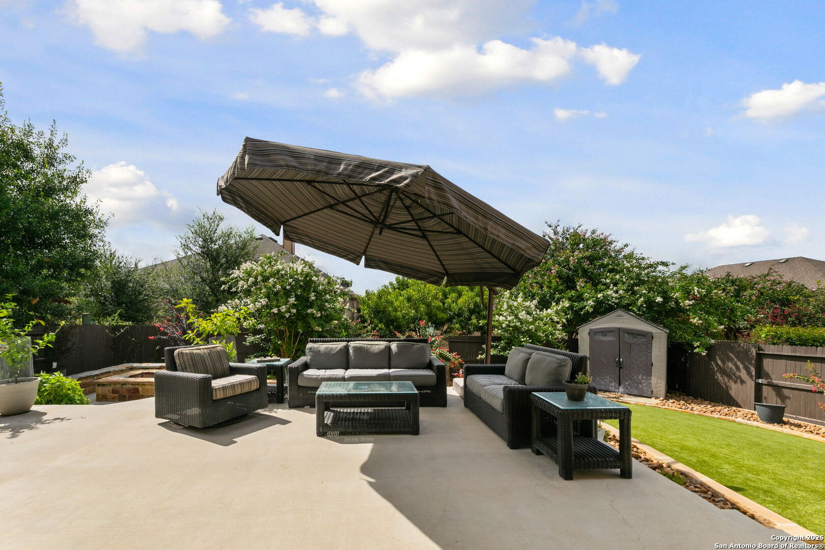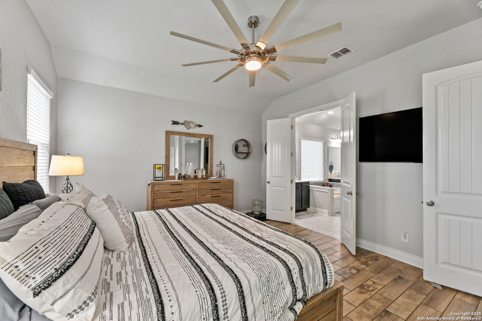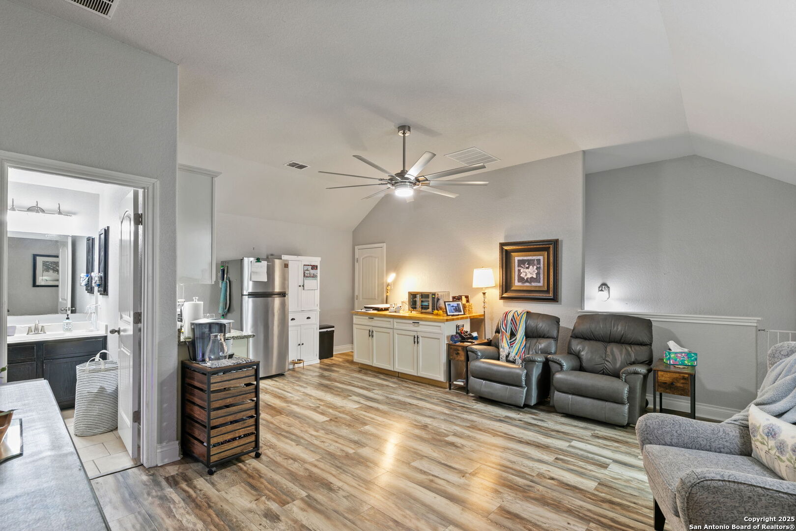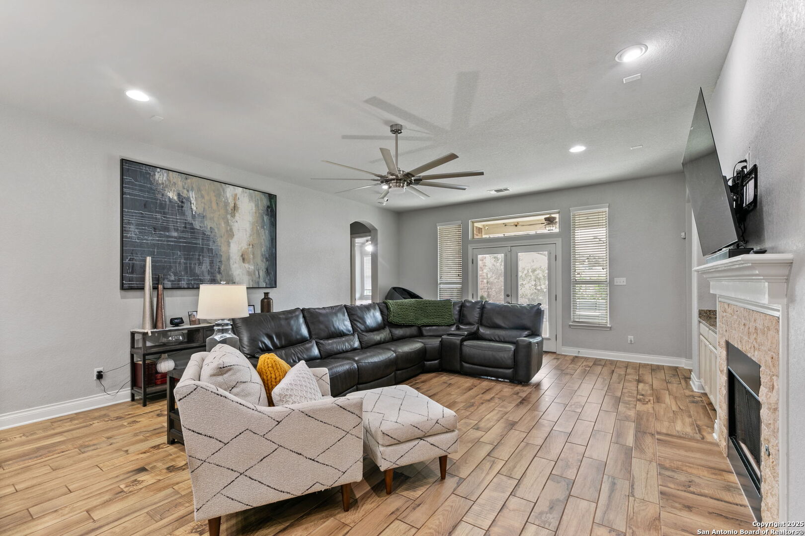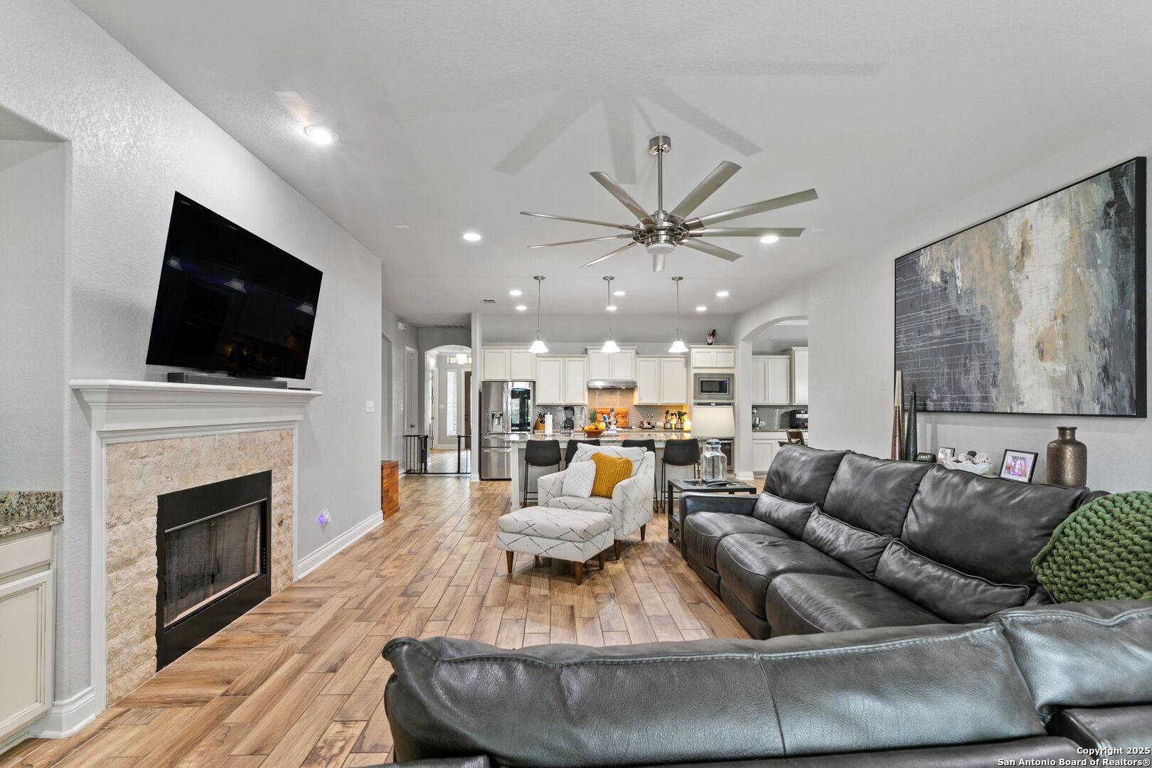 Discover the unique features of this wonderfully designed Ashton Woods home, boasting a multi-generational plan and numerous builder's upgrades. The flexible upper-level show cases a wet bar, sink, refrigerator, and a spacious 4th bedroom complete with a walk-in closet. Luxurious amenities abound, including a walk-in jet tub, and bidet toilet. The Master Suite, which is conveniently situated on the main level alongside a primary bath featuring separate vanities and walk-in closets. Enhanced by wood-look tiles and 8' doors throughout the lower level, this residence also offers carpeting in the two-guest bedrooms. Additional highlights encompass a separate office, a formal dining room or use as a flex room, a generous kitchen with a gas cooktop, and an abundance of storage space. Noteworthy seller upgrades include 26 solar panels to reduce monthly electricity costs, a Solaris PCO, IAQ Air Purifier system, and water softener. Delight in approximately 480 sq ft of expanded patio space featuring a charming fire pit, as well as a low maintenance fenced backyard with artificial grass. The property is equipped with a 7-zone irrigation system and two separate attics for added functionality. Short drive to medical, shopping, the rivers and Schlitterbahn activities. This home is a must see!