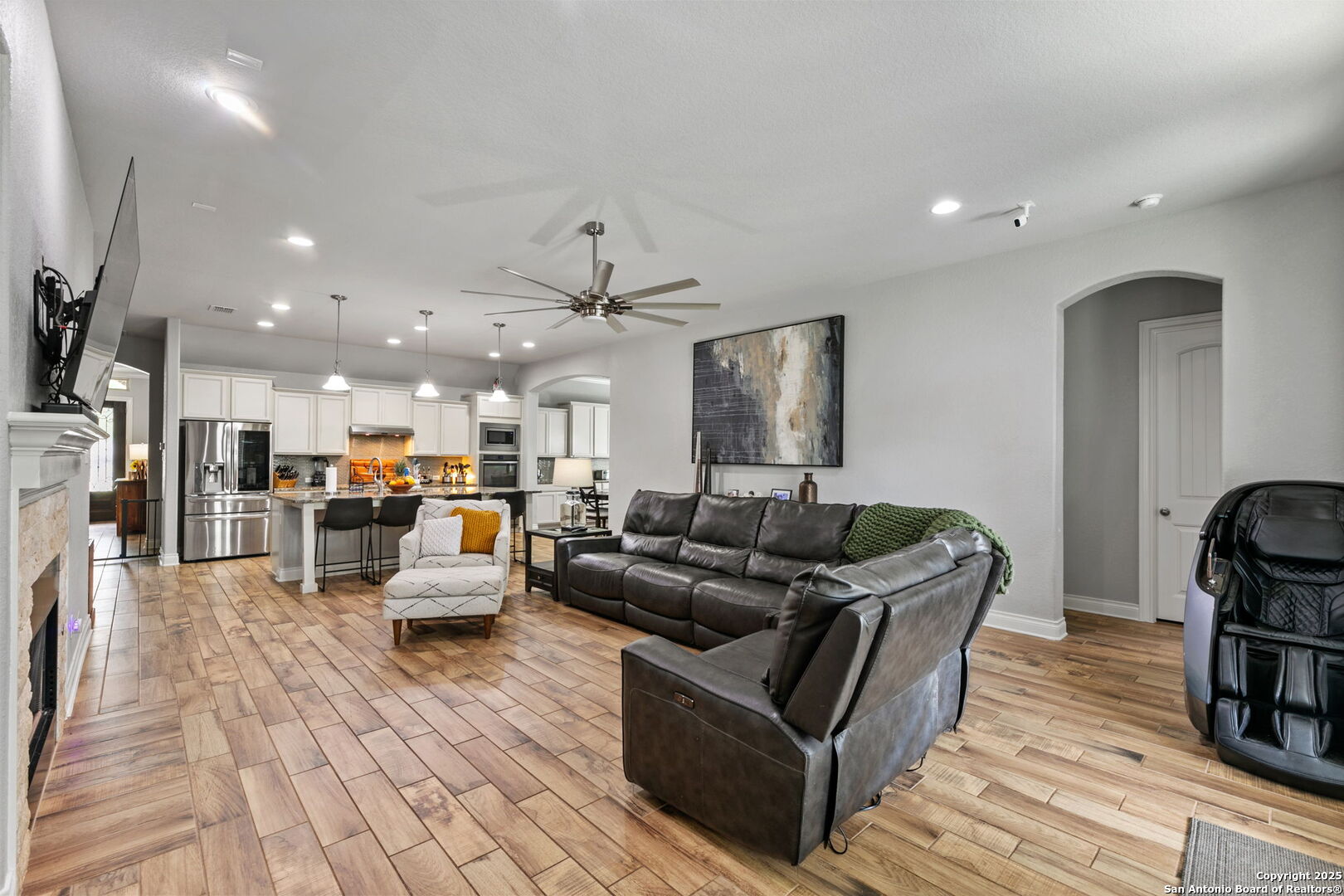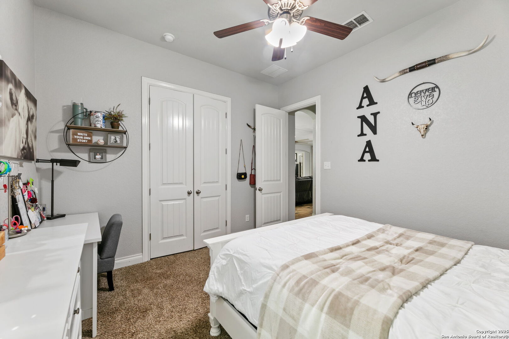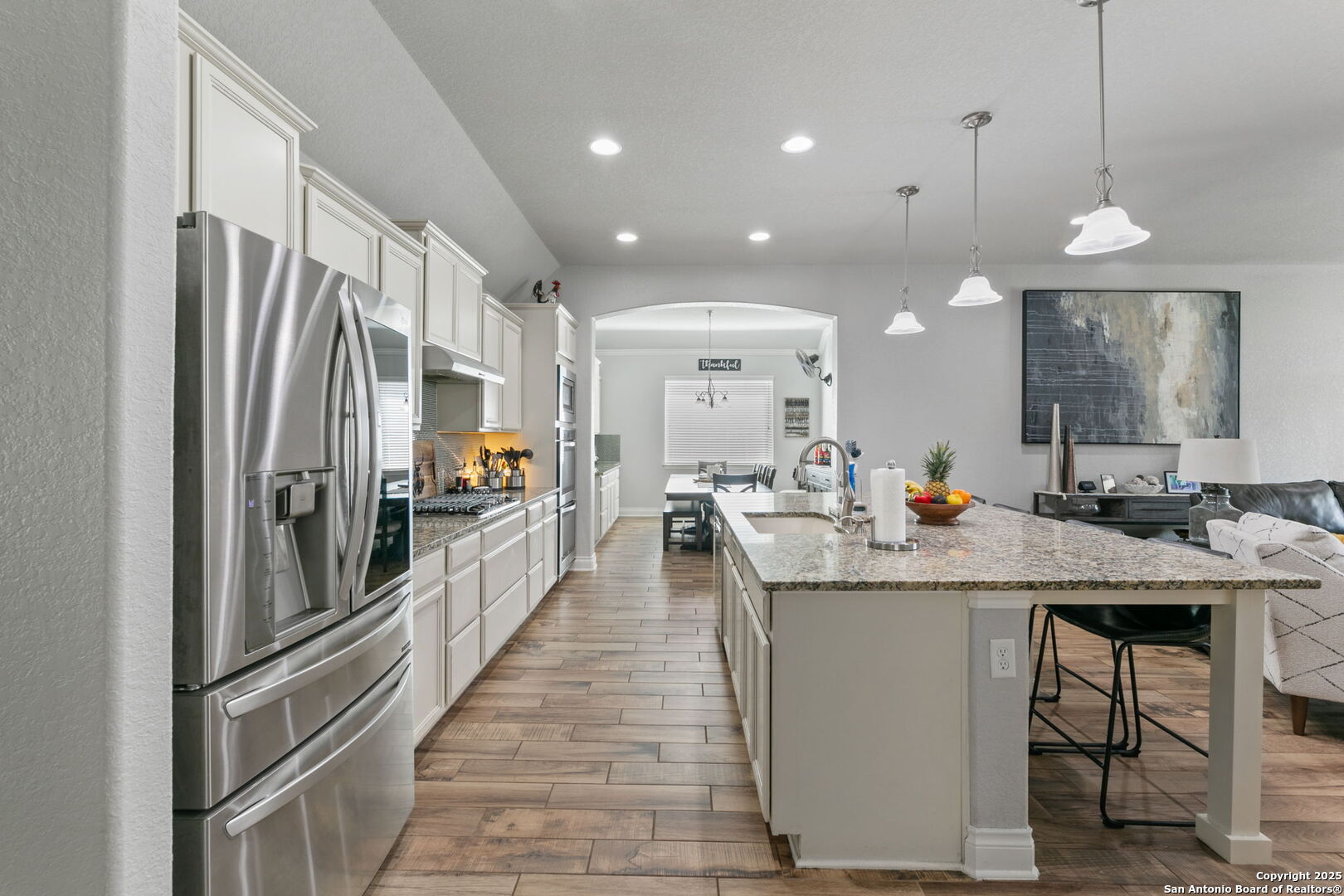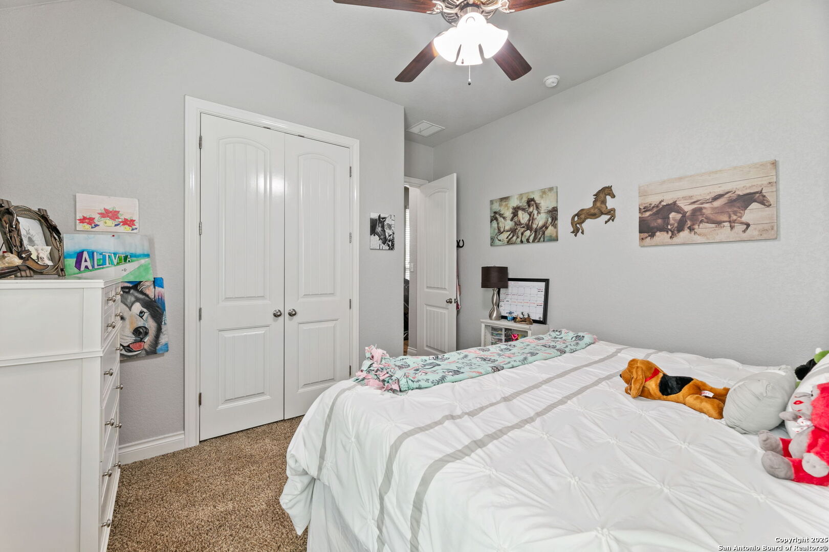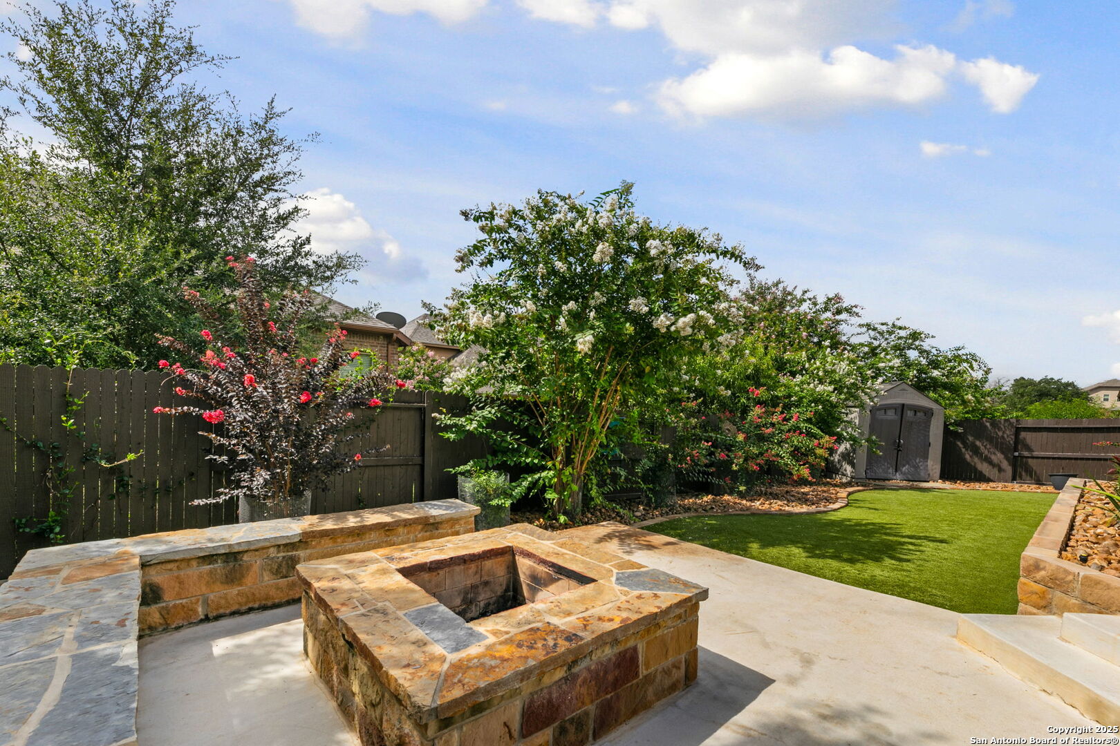 Discover the unique features of this wonderfully designed Ashton Woods home, boasting a multi-generational plan and numerous builder's upgrades. The flexible upper-level show cases a wet bar, sink, refrigerator, and a spacious 4th bedroom complete with a walk-in closet. Luxurious amenities abound, including a walk-in jet tub, and bidet toilet. The Master Suite, which is conveniently situated on the main level alongside a primary bath featuring separate vanities and walk-in closets. Enhanced by wood-look tiles and 8' doors throughout the lower level, this residence also offers carpeting in the two-guest bedrooms. Additional highlights encompass a separate office, a formal dining room or use as a flex room, a generous kitchen with a gas cooktop, and an abundance of storage space. Noteworthy seller upgrades include 26 solar panels to reduce monthly electricity costs, a Solaris PCO, IAQ Air Purifier system, and water softener. Delight in approximately 480 sq ft of expanded patio space featuring a charming fire pit, as well as a low maintenance fenced backyard with artificial grass. The property is equipped with a 7-zone irrigation system and two separate attics for added functionality. Short drive to medical, shopping, the rivers and Schlitterbahn activities. This home is a must see!