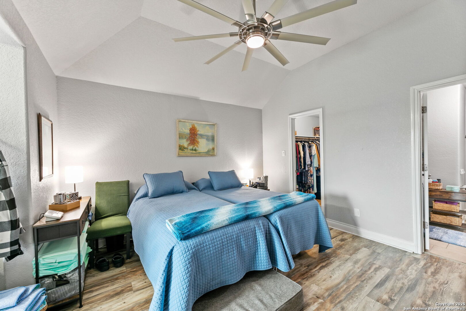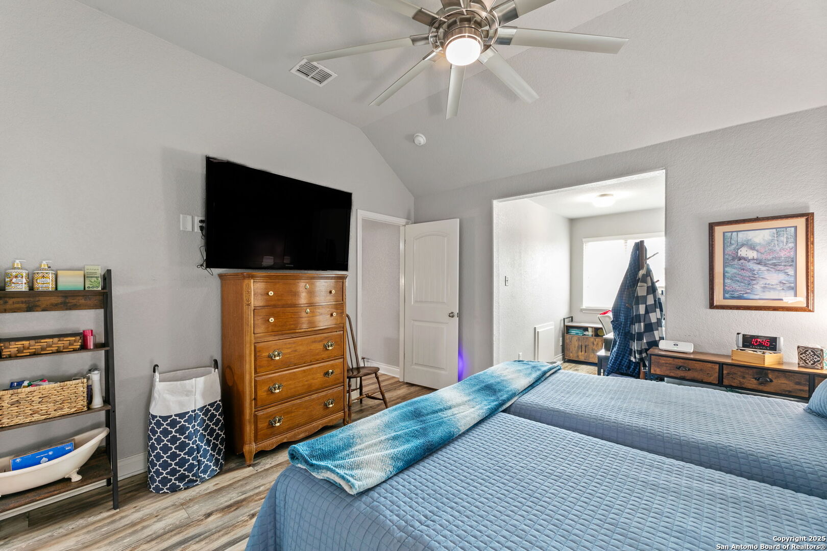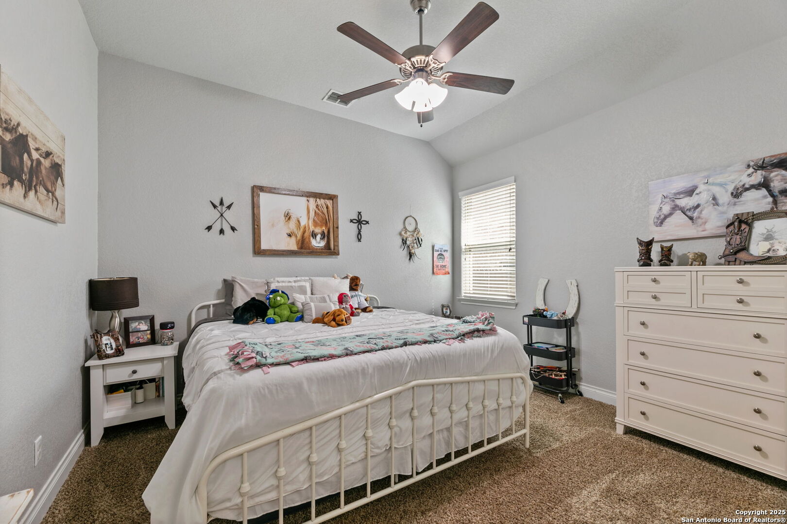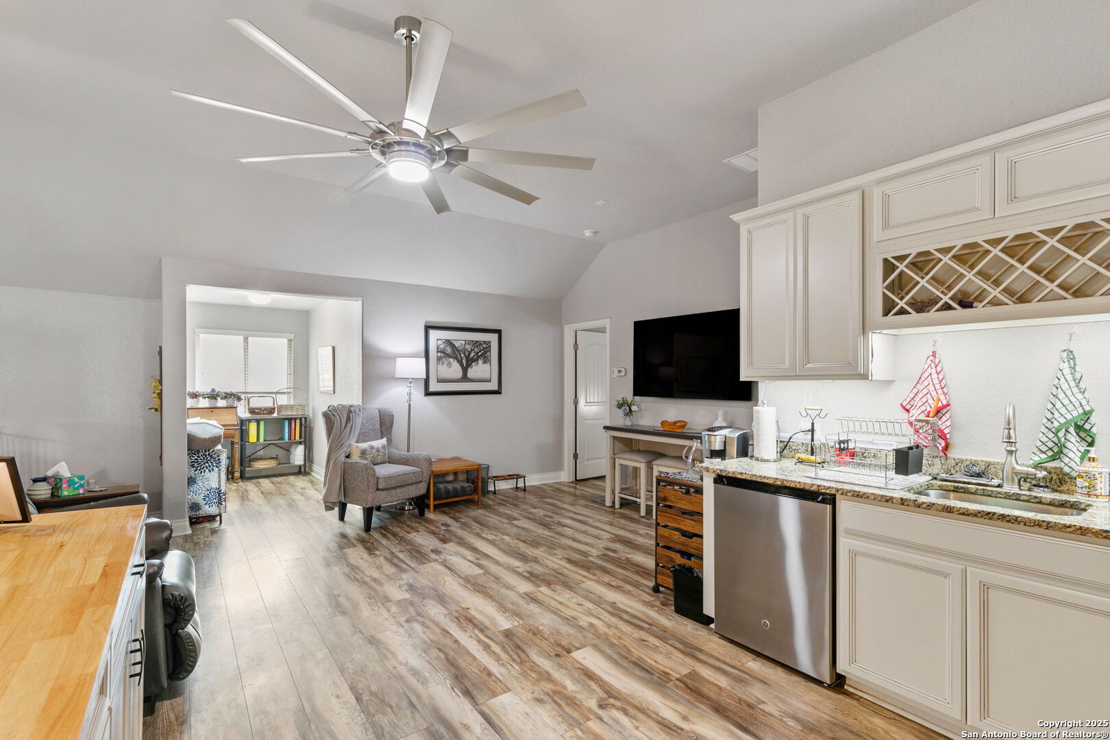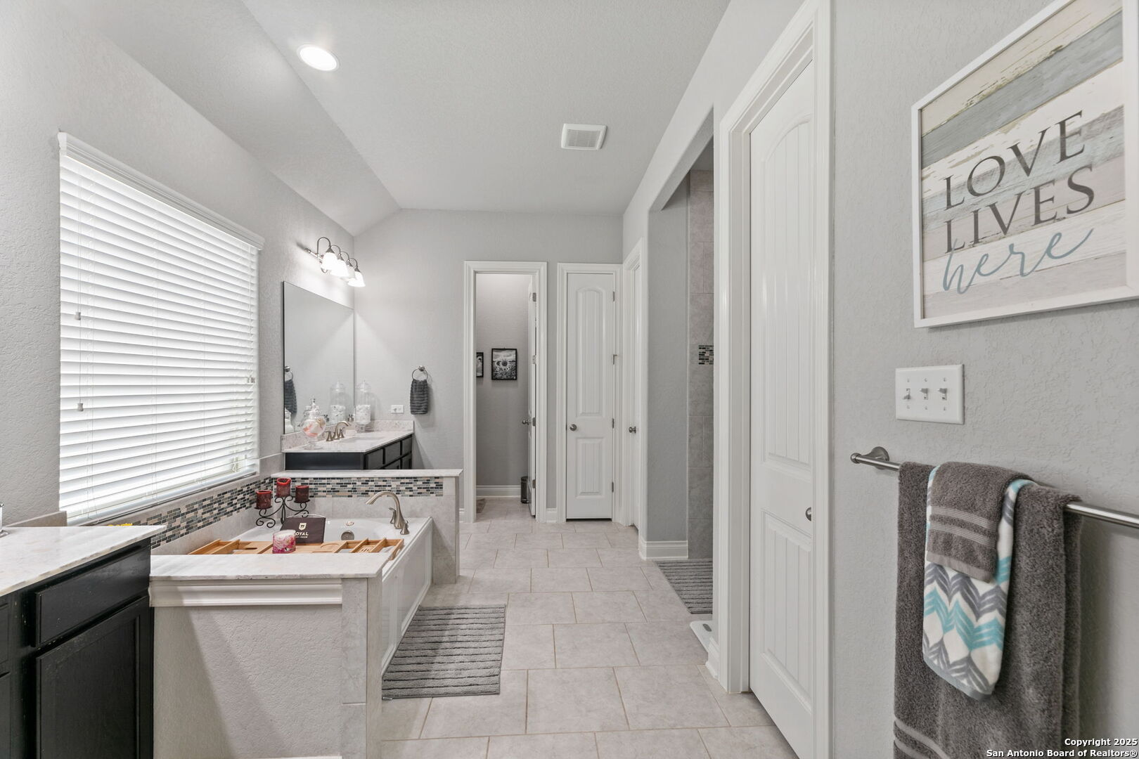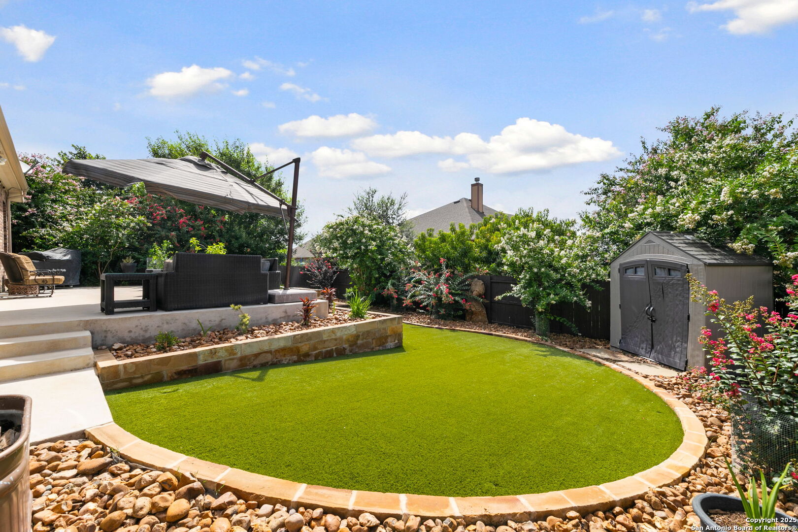 Discover the unique features of this wonderfully designed Ashton Woods home, boasting a multi-generational plan and numerous builder's upgrades. The flexible upper-level show cases a wet bar, sink, refrigerator, and a spacious 4th bedroom complete with a walk-in closet. Luxurious amenities abound, including a walk-in jet tub, and bidet toilet. The Master Suite, which is conveniently situated on the main level alongside a primary bath featuring separate vanities and walk-in closets. Enhanced by wood-look tiles and 8' doors throughout the lower level, this residence also offers carpeting in the two-guest bedrooms. Additional highlights encompass a separate office, a formal dining room or use as a flex room, a generous kitchen with a gas cooktop, and an abundance of storage space. Noteworthy seller upgrades include 26 solar panels to reduce monthly electricity costs, a Solaris PCO, IAQ Air Purifier system, and water softener. Delight in approximately 480 sq ft of expanded patio space featuring a charming fire pit, as well as a low maintenance fenced backyard with artificial grass. The property is equipped with a 7-zone irrigation system and two separate attics for added functionality. Short drive to medical, shopping, the rivers and Schlitterbahn activities. This home is a must see!