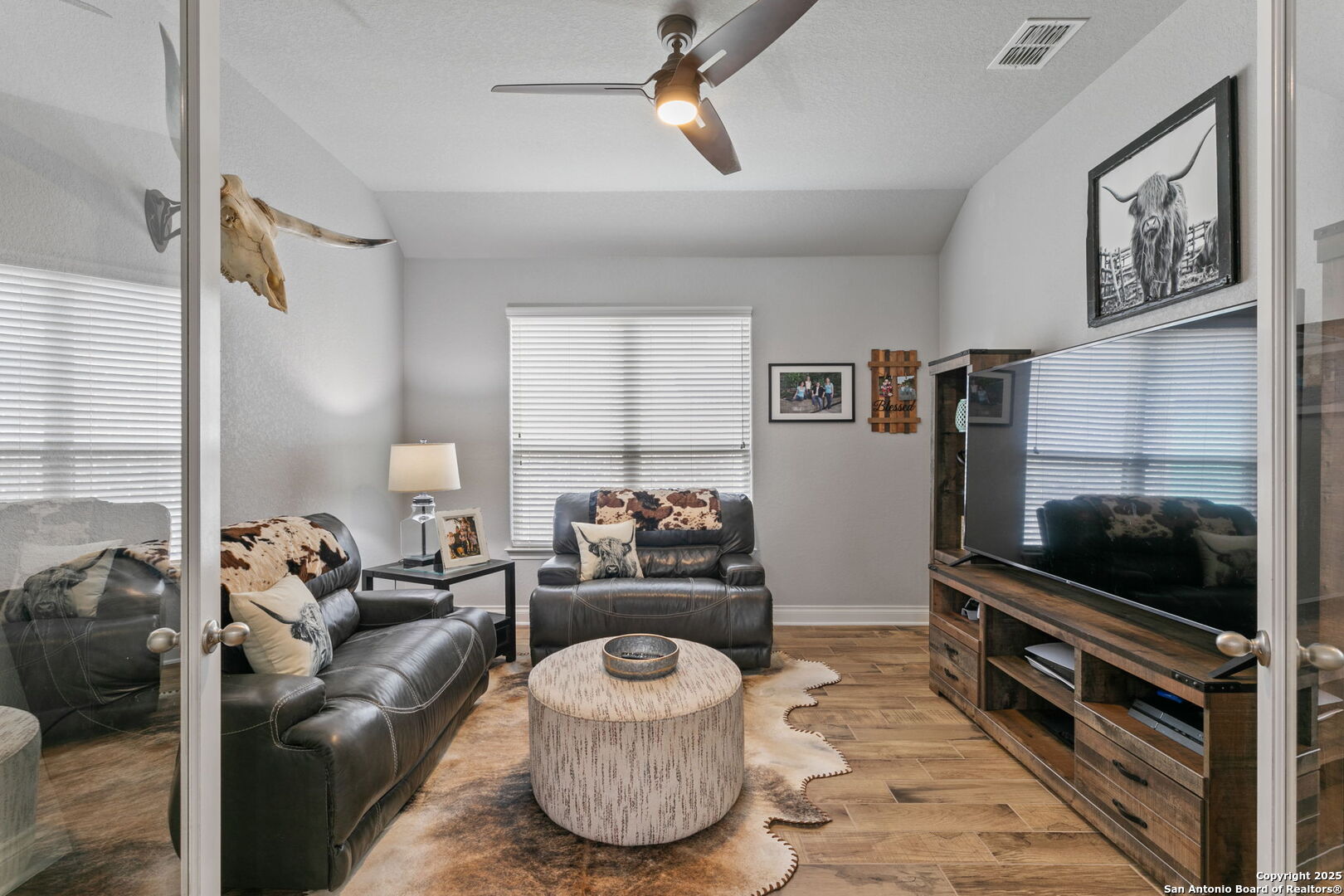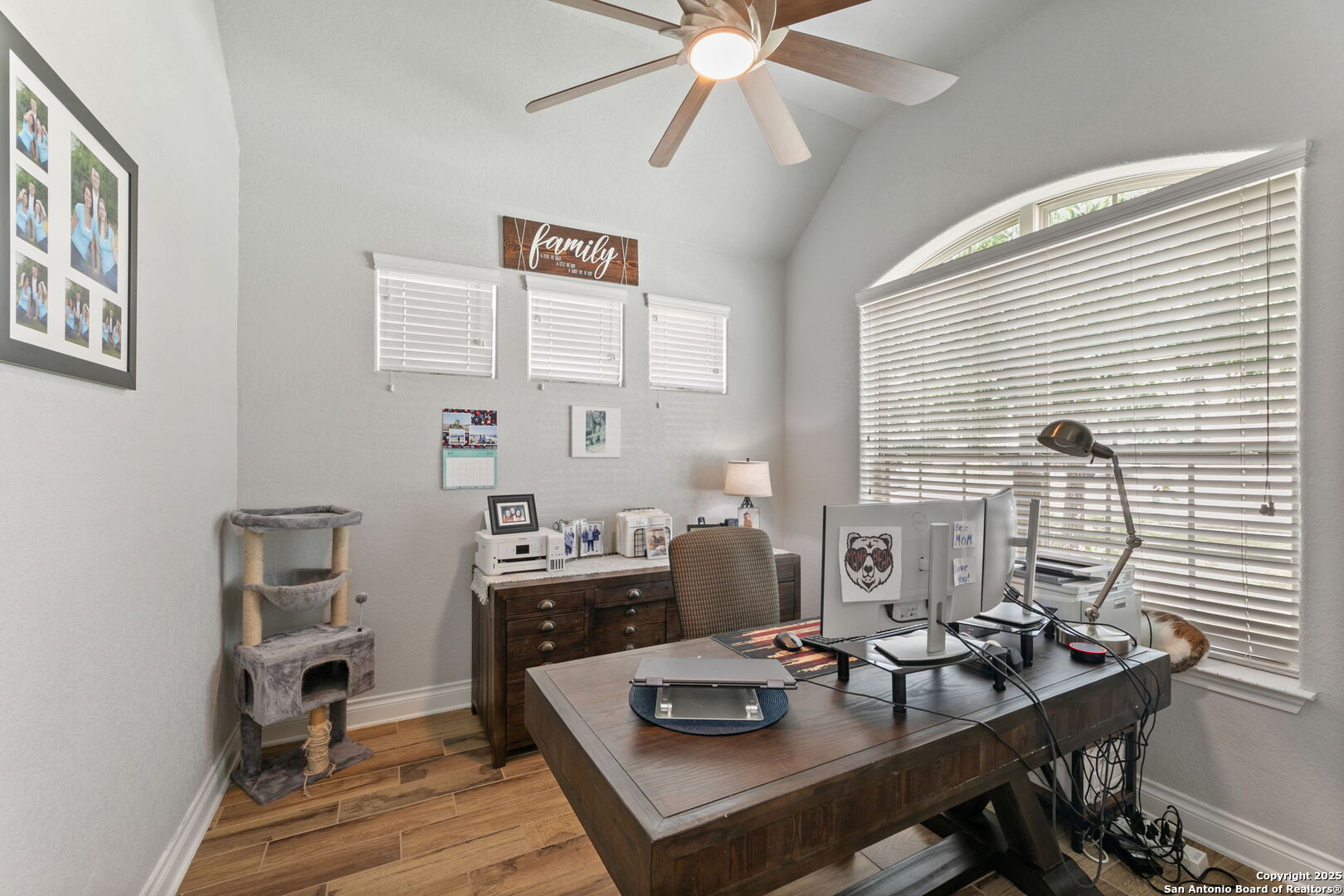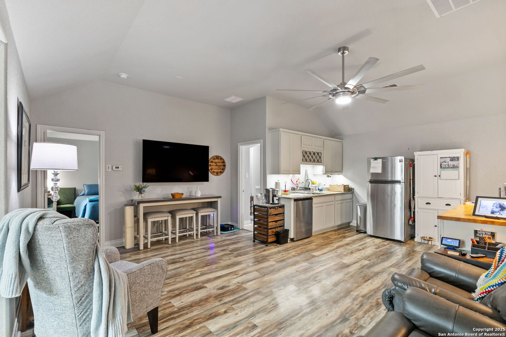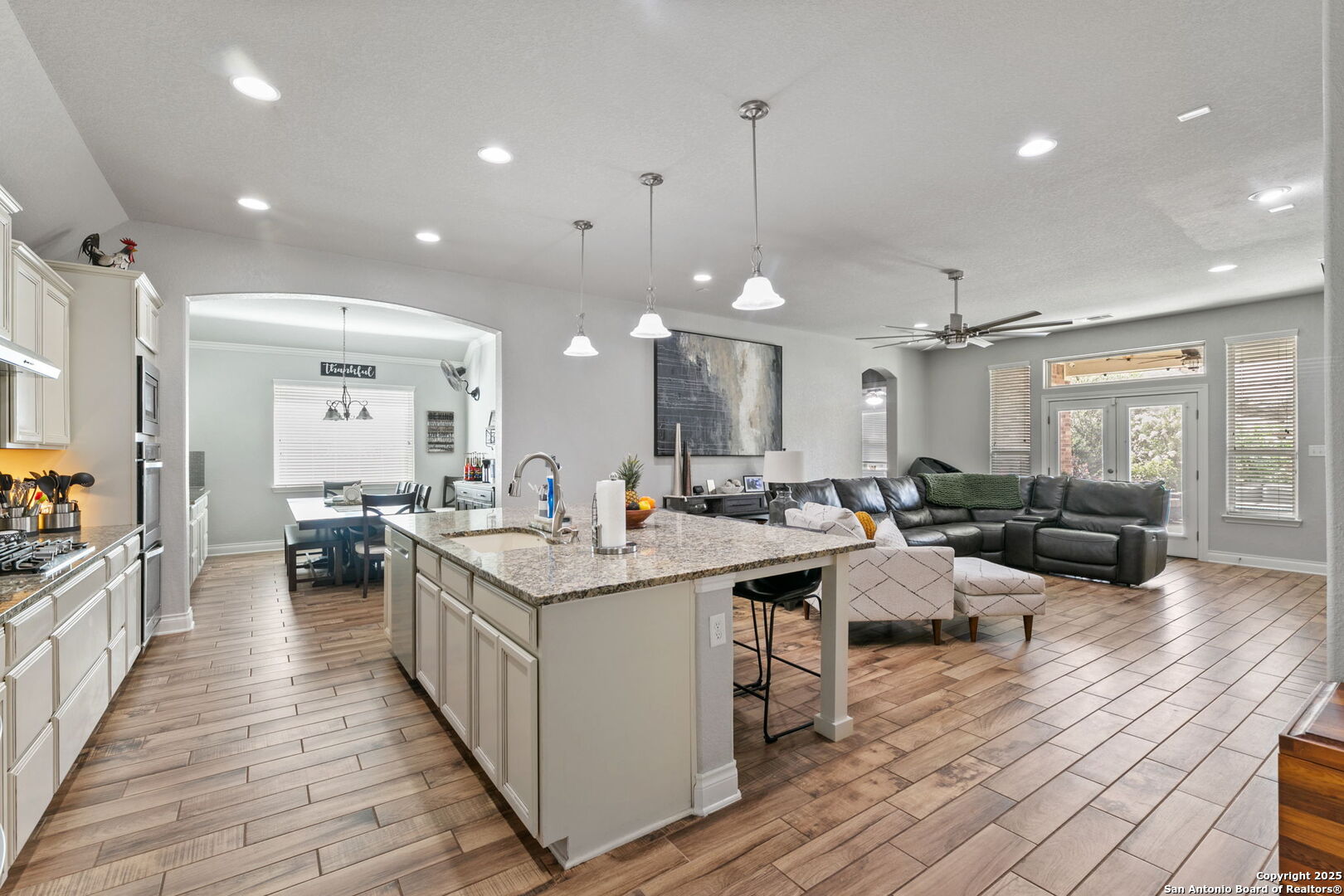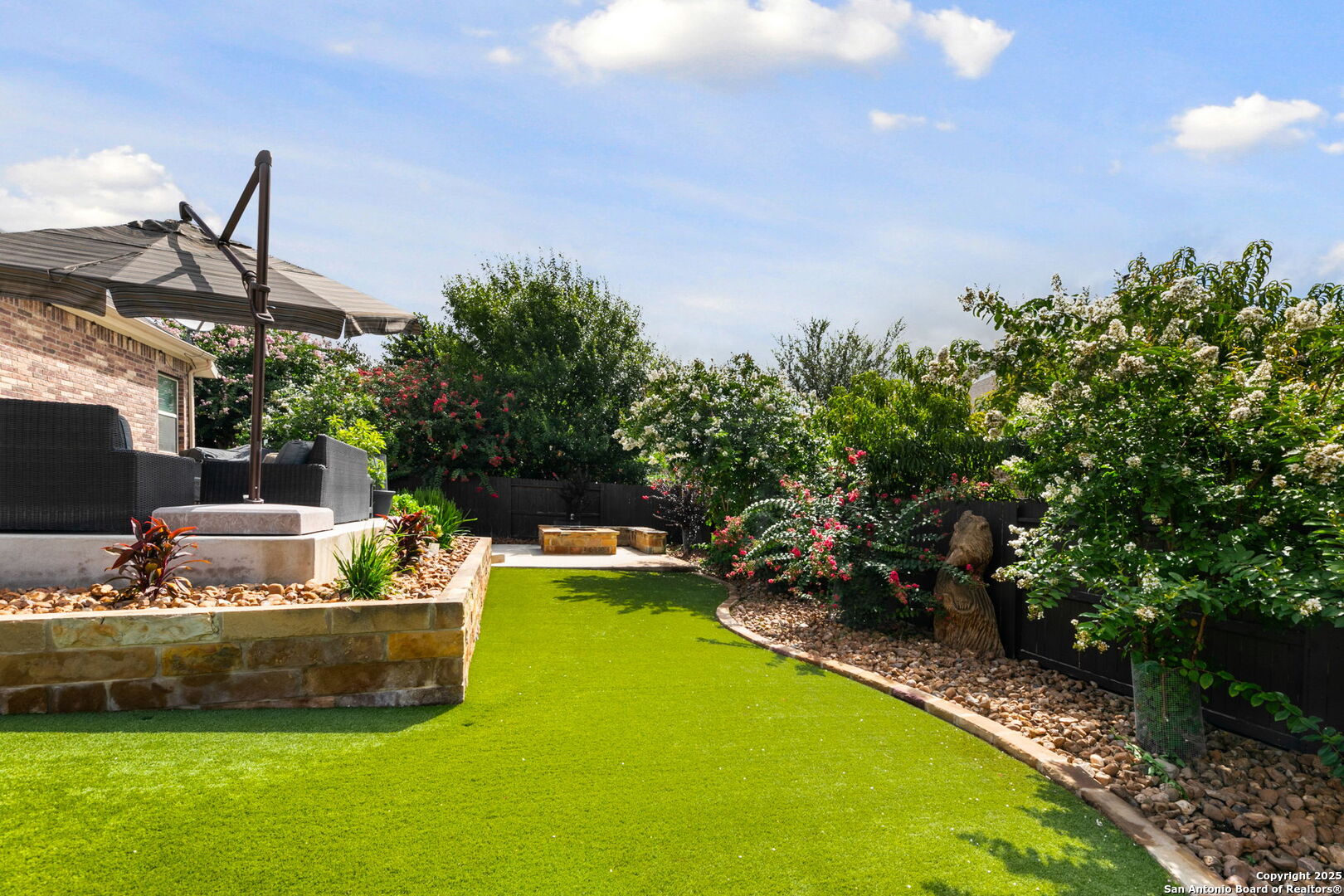 Discover the unique features of this wonderfully designed Ashton Woods home, boasting a multi-generational plan and numerous builder's upgrades. The flexible upper-level show cases a wet bar, sink, refrigerator, and a spacious 4th bedroom complete with a walk-in closet. Luxurious amenities abound, including a walk-in jet tub, and bidet toilet. The Master Suite, which is conveniently situated on the main level alongside a primary bath featuring separate vanities and walk-in closets. Enhanced by wood-look tiles and 8' doors throughout the lower level, this residence also offers carpeting in the two-guest bedrooms. Additional highlights encompass a separate office, a formal dining room or use as a flex room, a generous kitchen with a gas cooktop, and an abundance of storage space. Noteworthy seller upgrades include 26 solar panels to reduce monthly electricity costs, a Solaris PCO, IAQ Air Purifier system, and water softener. Delight in approximately 480 sq ft of expanded patio space featuring a charming fire pit, as well as a low maintenance fenced backyard with artificial grass. The property is equipped with a 7-zone irrigation system and two separate attics for added functionality. Short drive to medical, shopping, the rivers and Schlitterbahn activities. This home is a must see!