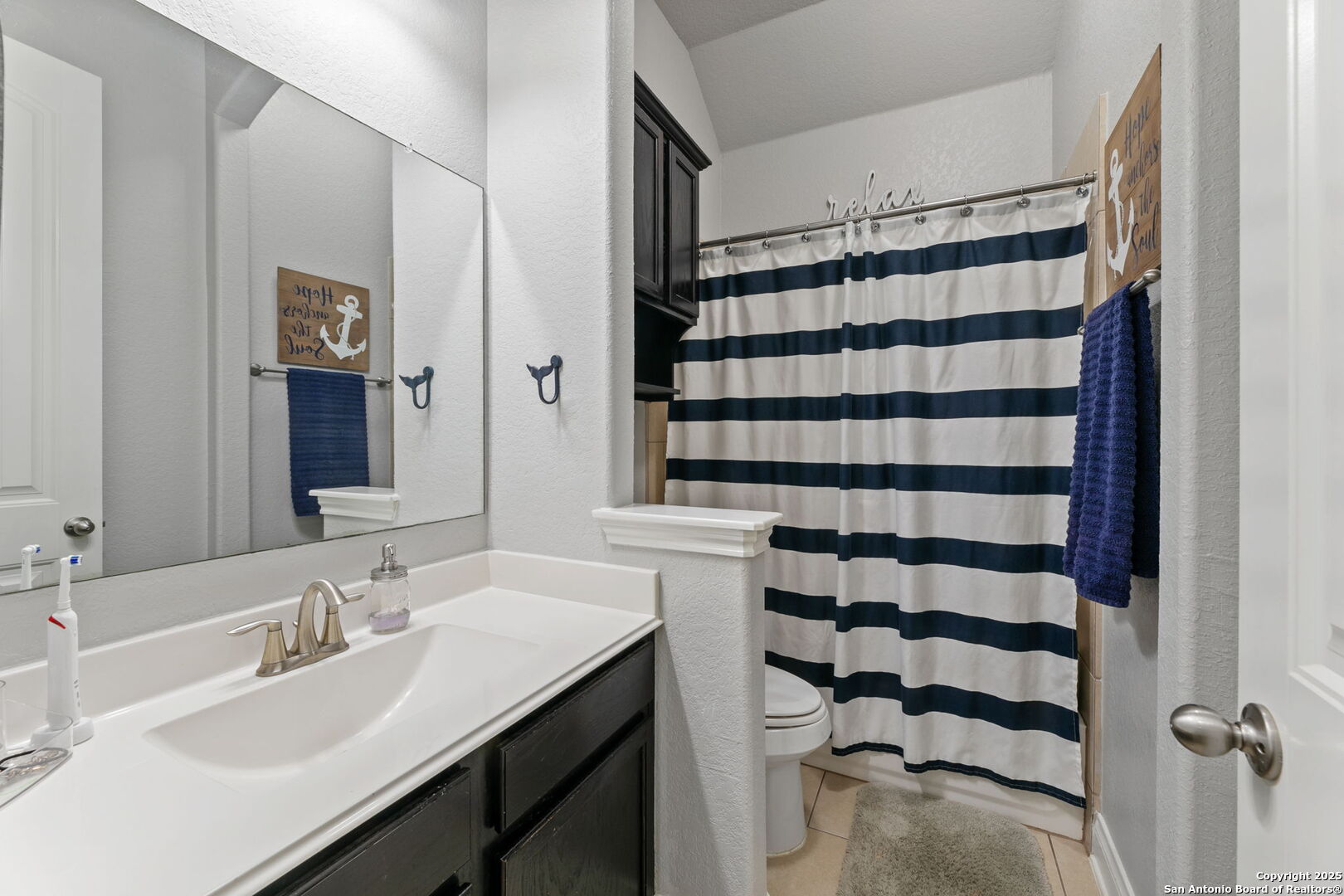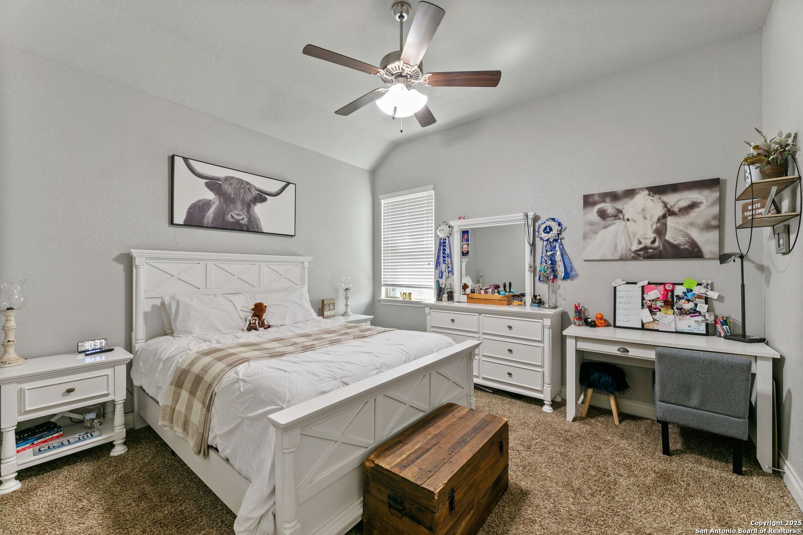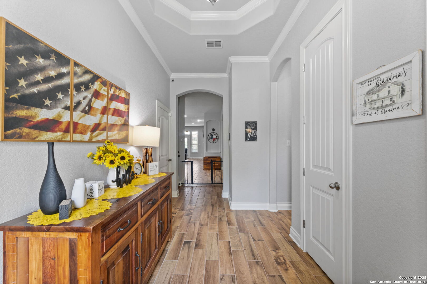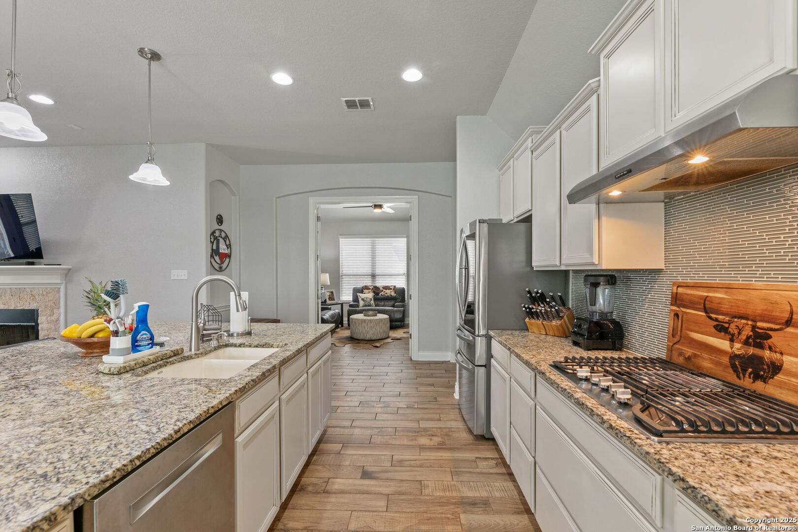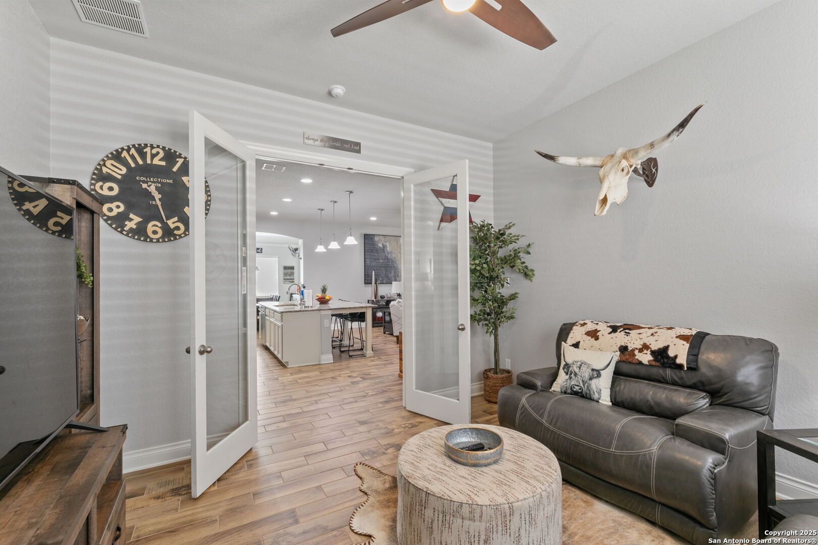 Discover the unique features of this wonderfully designed Ashton Woods home, boasting a multi-generational plan and numerous builder's upgrades. The flexible upper-level show cases a wet bar, sink, refrigerator, and a spacious 4th bedroom complete with a walk-in closet. Luxurious amenities abound, including a walk-in jet tub, and bidet toilet. The Master Suite, which is conveniently situated on the main level alongside a primary bath featuring separate vanities and walk-in closets. Enhanced by wood-look tiles and 8' doors throughout the lower level, this residence also offers carpeting in the two-guest bedrooms. Additional highlights encompass a separate office, a formal dining room or use as a flex room, a generous kitchen with a gas cooktop, and an abundance of storage space. Noteworthy seller upgrades include 26 solar panels to reduce monthly electricity costs, a Solaris PCO, IAQ Air Purifier system, and water softener. Delight in approximately 480 sq ft of expanded patio space featuring a charming fire pit, as well as a low maintenance fenced backyard with artificial grass. The property is equipped with a 7-zone irrigation system and two separate attics for added functionality. Short drive to medical, shopping, the rivers and Schlitterbahn activities. This home is a must see!