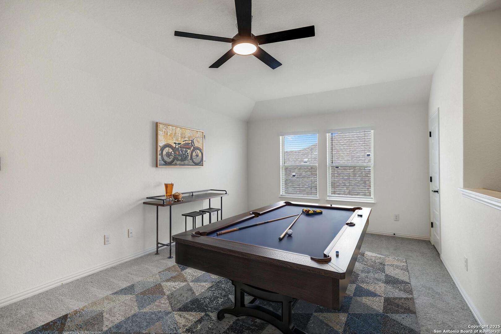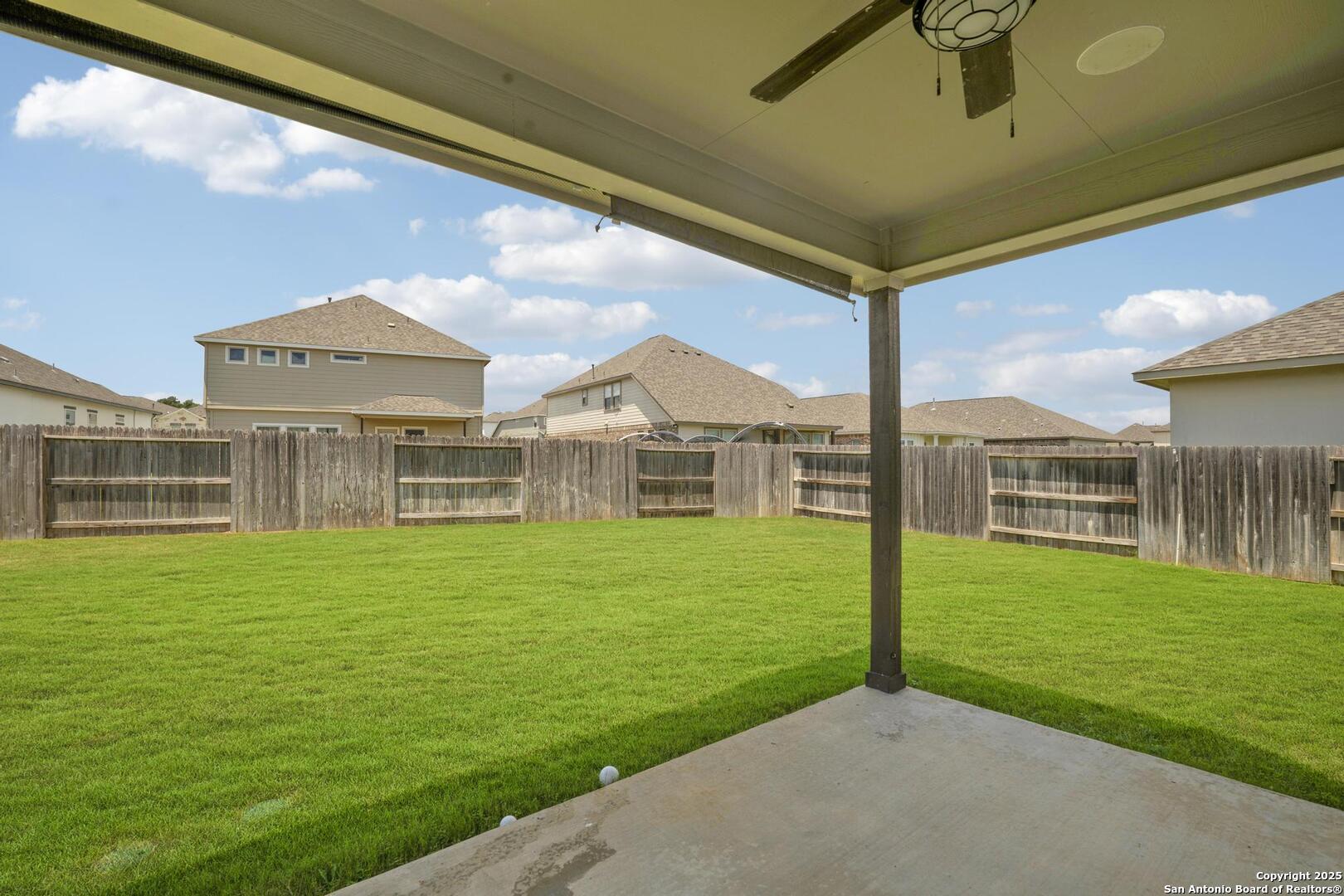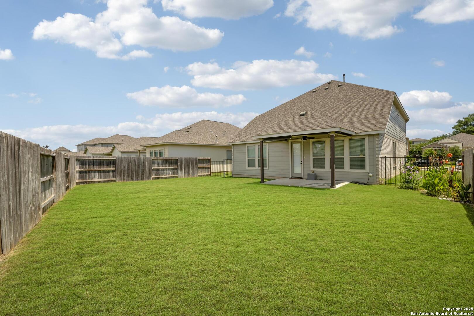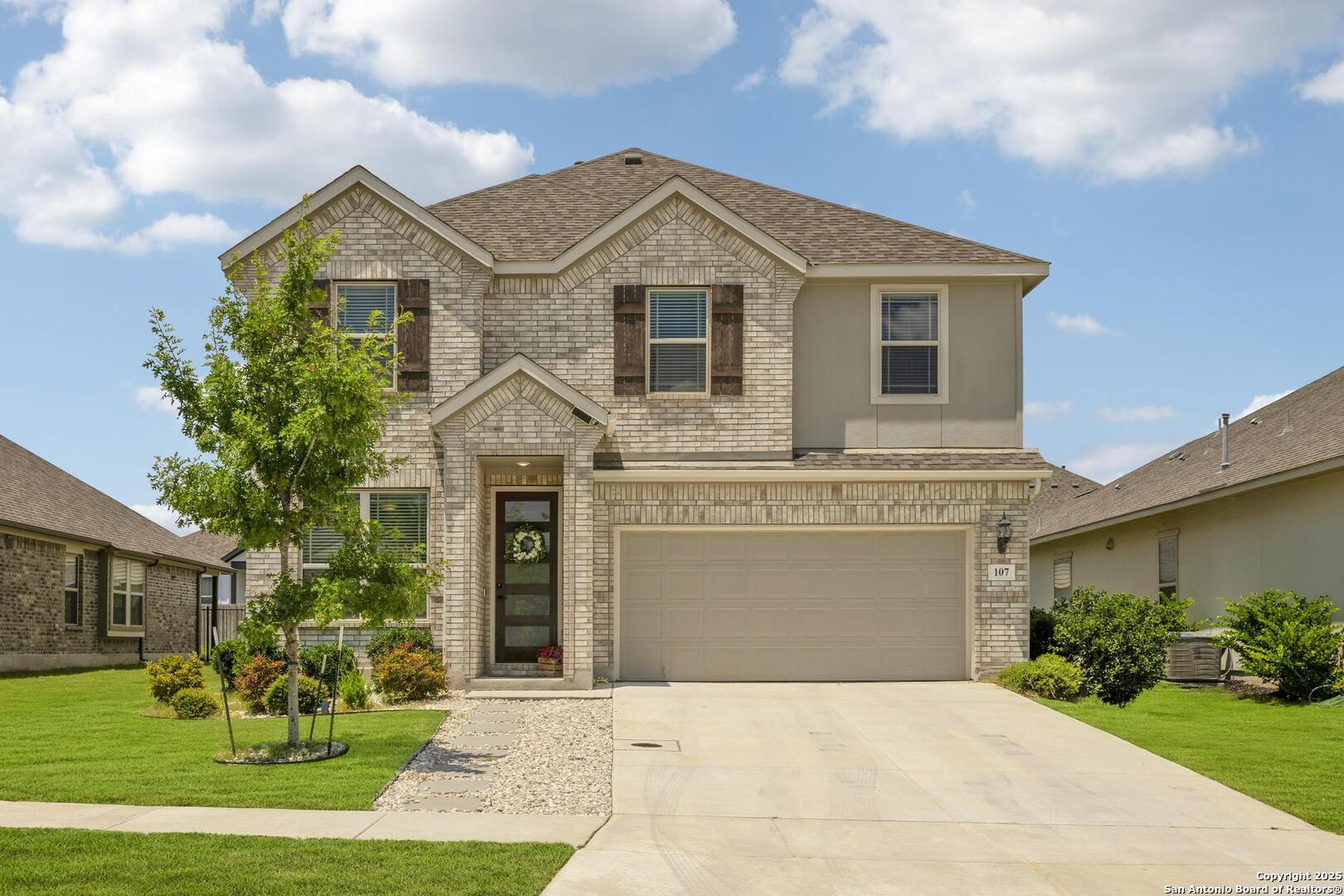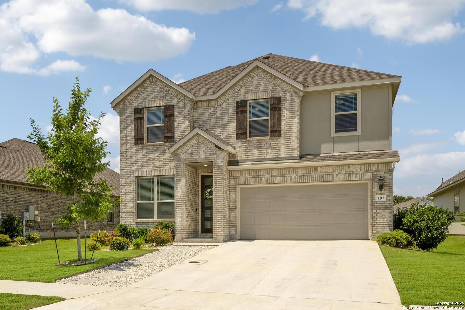 Location !Easy access on and off IH10, but beautifully tucked away for the hill country feel. Close to Boerne and San Antonio. Least expensive per- sq-ft home in this beautiful subdivision! Welcome to 107 Giverny. Sitting on a cul-de-sac street, this 4 bedroom, 3- and a- half- baths starts with a foyer as you enter. Continuing, you will find a large office space just off the entryway, a half bath and a utility room. Just past the utility room you see a beautiful open kitchen, diningroom, living room floorplan with high ceilings-- great for entertaining or just sitting with friends or family. The Kitchen has stainless- steel gas range, microwave and dishwasher, large island, solid counter tops. 1st floor master bedroom with a oversized walk in closet, masterbath with double vanity, oversized shower, giving you a spa like feel. Upstairs (new carpet as of 2025) is a great space to entertain as well : a game room for family game night or having friends over, and a Media space with a 5.1 system with in-ceiling speakers,wires are connected to speakers in the kitchen and diningrm ceiling and back patio ceiling speakers as well. Off the game room are 3 large bedrooms and 2 full baths. Large backyard with covered patio and privacy fencing. Undergound Sprinkler system for front and back yard. This beautiful Subdivision has a Pool, playground, jogging trails and clubhouse. When you turn in to Regent Park, and 107 Giverny , you will feel like you are home Boerne Schools ! Lower taxes! As always, please verify measuments , schools and property details