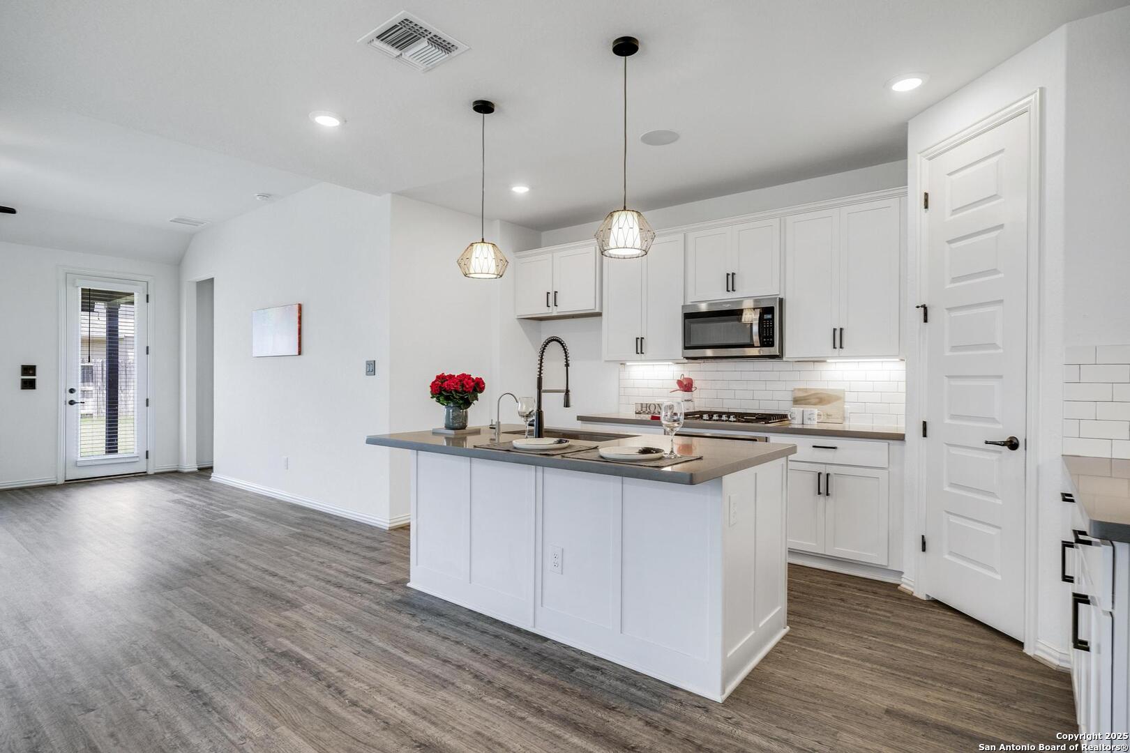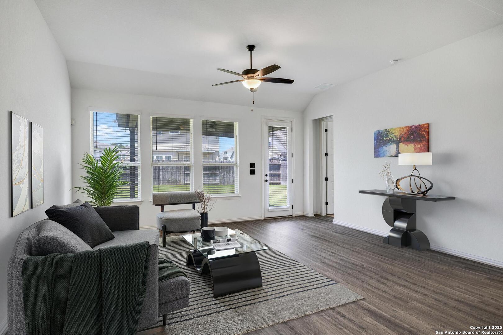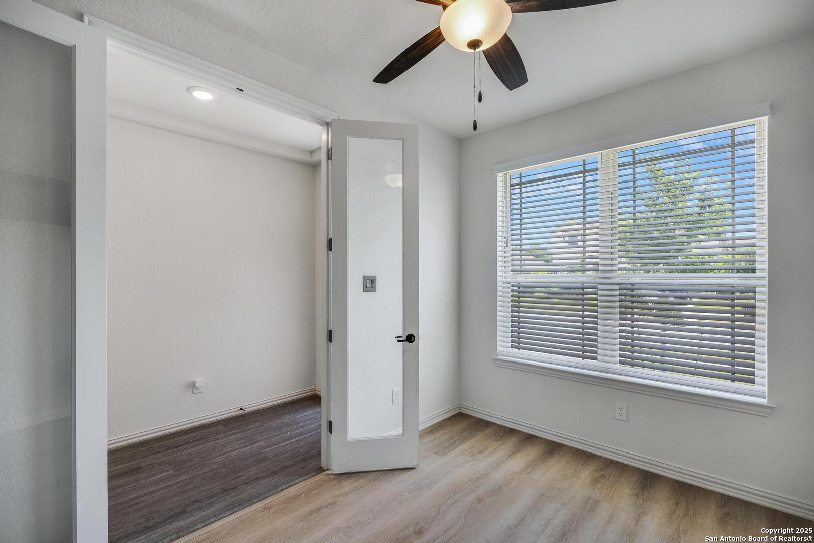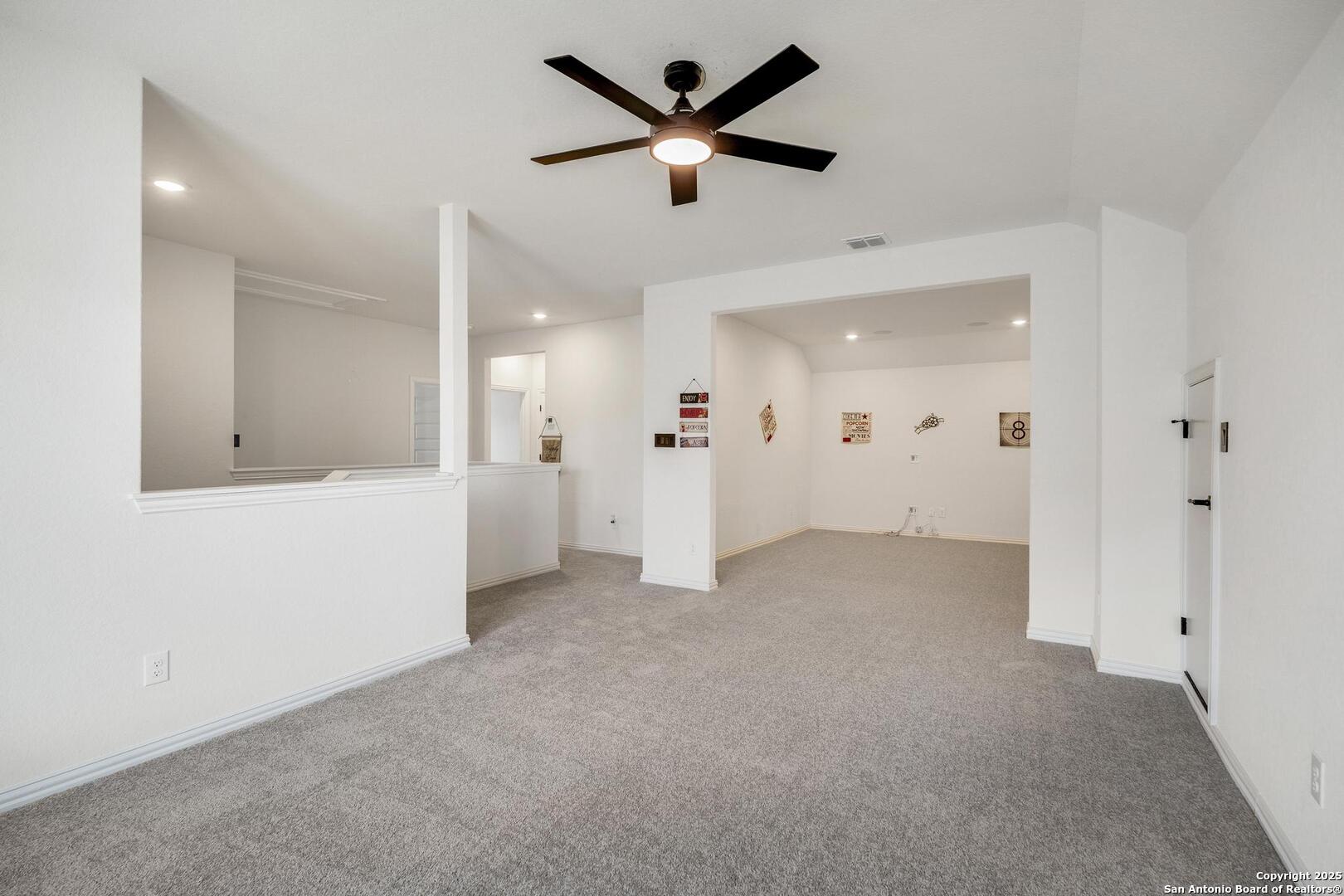 Location !Easy access on and off IH10, but beautifully tucked away for the hill country feel. Close to Boerne and San Antonio. Least expensive per- sq-ft home in this beautiful subdivision! Welcome to 107 Giverny. Sitting on a cul-de-sac street, this 4 bedroom, 3- and a- half- baths starts with a foyer as you enter. Continuing, you will find a large office space just off the entryway, a half bath and a utility room. Just past the utility room you see a beautiful open kitchen, diningroom, living room floorplan with high ceilings-- great for entertaining or just sitting with friends or family. The Kitchen has stainless- steel gas range, microwave and dishwasher, large island, solid counter tops. 1st floor master bedroom with a oversized walk in closet, masterbath with double vanity, oversized shower, giving you a spa like feel. Upstairs (new carpet as of 2025) is a great space to entertain as well : a game room for family game night or having friends over, and a Media space with a 5.1 system with in-ceiling speakers,wires are connected to speakers in the kitchen and diningrm ceiling and back patio ceiling speakers as well. Off the game room are 3 large bedrooms and 2 full baths. Large backyard with covered patio and privacy fencing. Undergound Sprinkler system for front and back yard. This beautiful Subdivision has a Pool, playground, jogging trails and clubhouse. When you turn in to Regent Park, and 107 Giverny , you will feel like you are home Boerne Schools ! Lower taxes! As always, please verify measuments , schools and property details