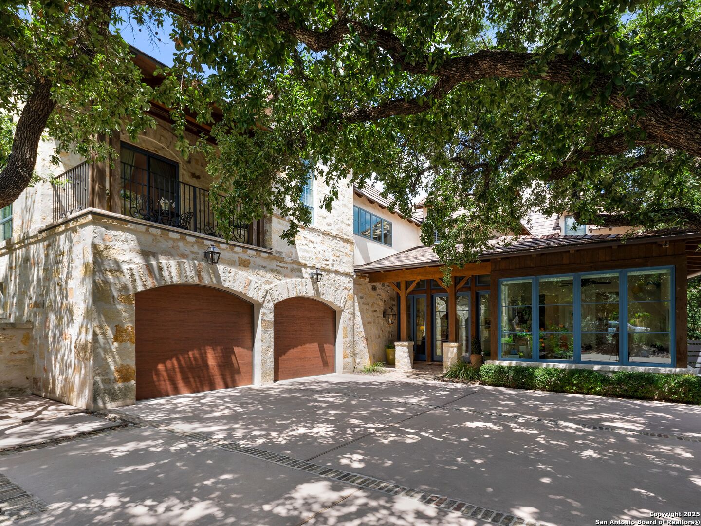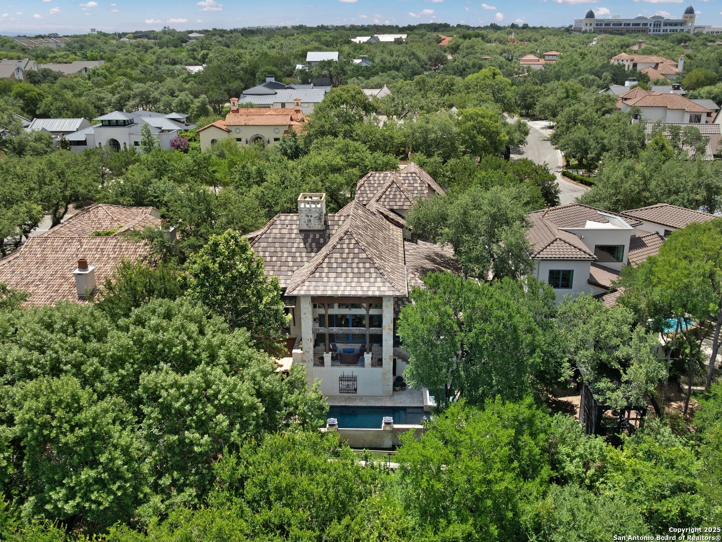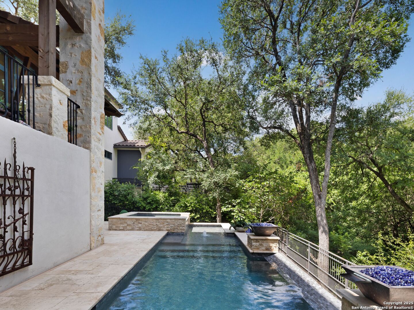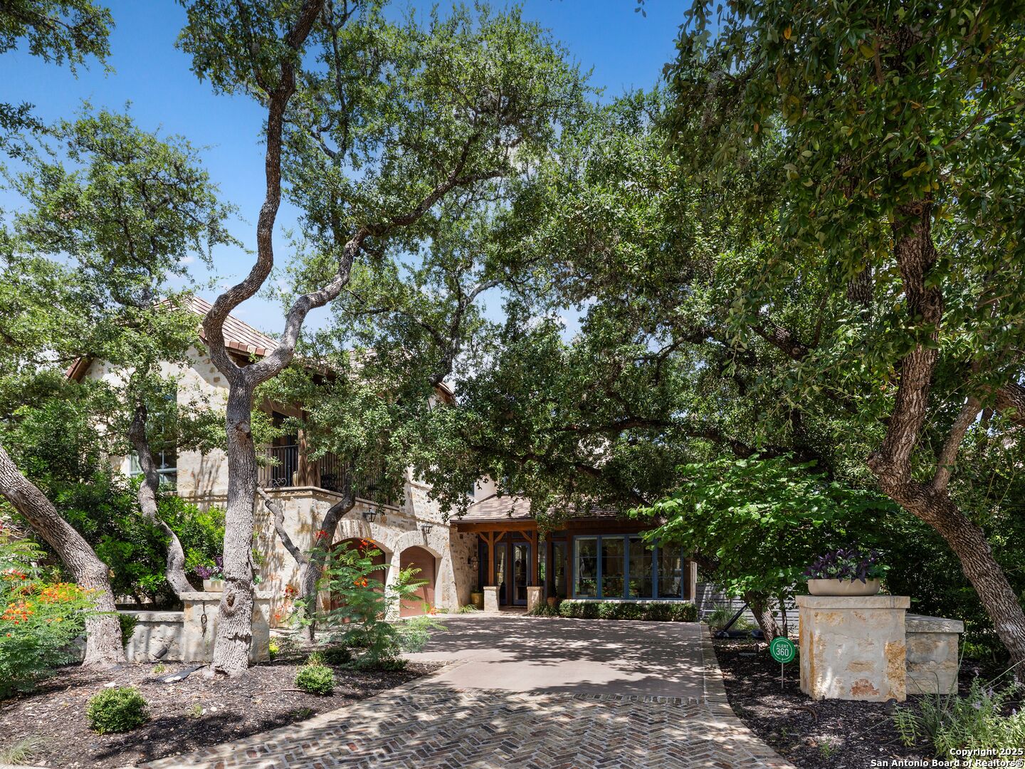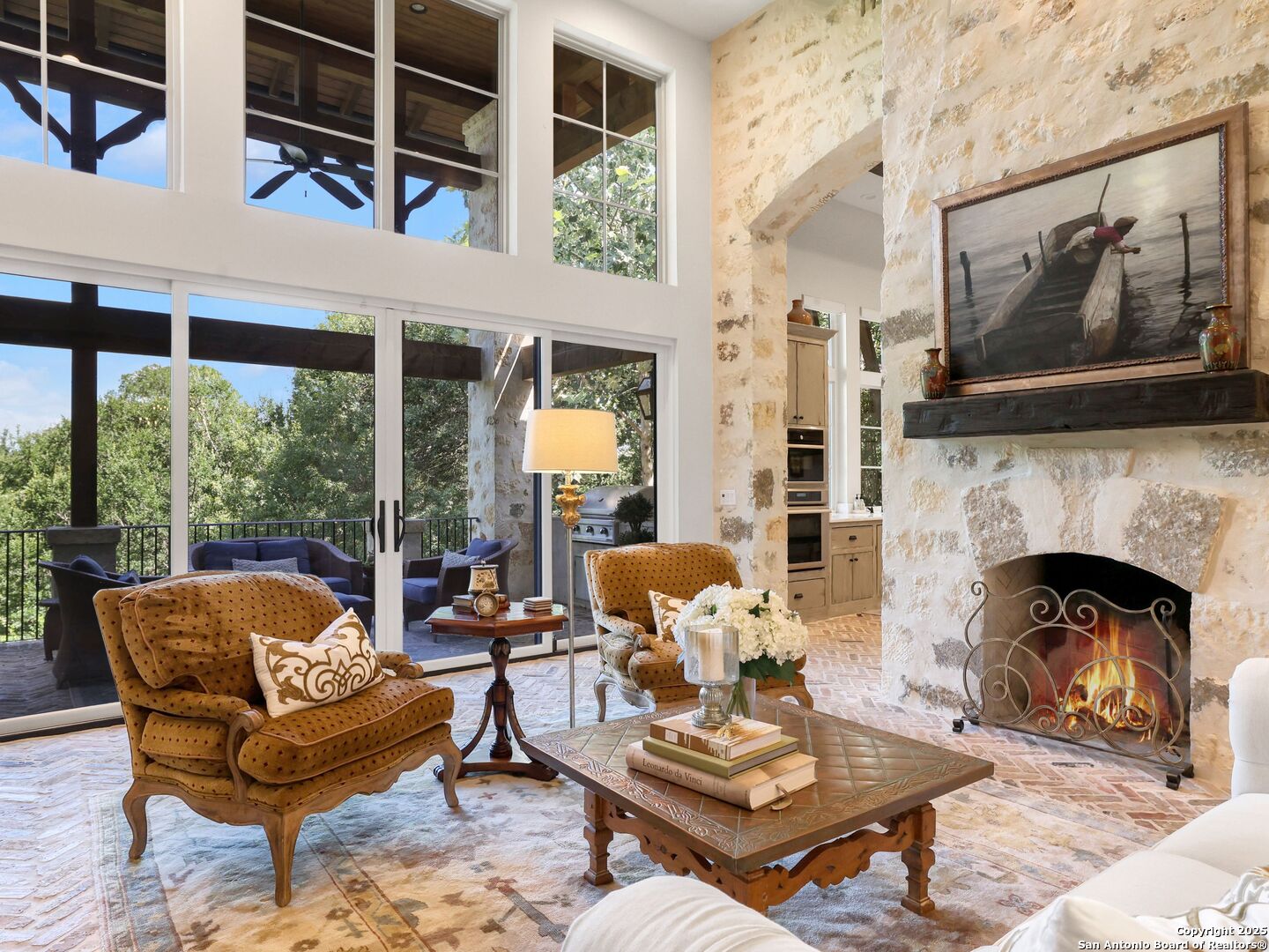 A refined expression of modern French design, this architectural masterpiece by world renowned Roy Braswell and masterfully built by Omni Custom Homes blends elegance, comfort, and functionality. Exuding timeless sophistication, the residence showcases a harmonious indoor to outdoor flow with light filled interiors and a gracious floor plan tailored for everyday living and grand entertaining. Impeccable craftsmanship is evident throughout from smooth finish walls and solid wood doors to custom ceiling treatments and stacked brick accent walls. The chef's kitchen is a culinary showpiece, featuring an oversized island, custom solid wood cabinetry, and professional grade stainless steel appliances. The primary suite is a private retreat with a luxurious spa bath and a generously sized walk in closet outfitted with extensive built ins. A secondary bedroom with a full bath is located on the main level, while two additional guest suites and a loft area are positioned upstairs, each with en suite baths and large closets. Prewired for an elevator, the home allows for future adaptability. Outdoors, enjoy an expansive park like setting with a spacious covered patio, sparkling pool and spa with fire bowl features, maintenance free turf, and endless mature oaks offering privacy along the greenbelt lot creating a truly tranquil sanctuary.