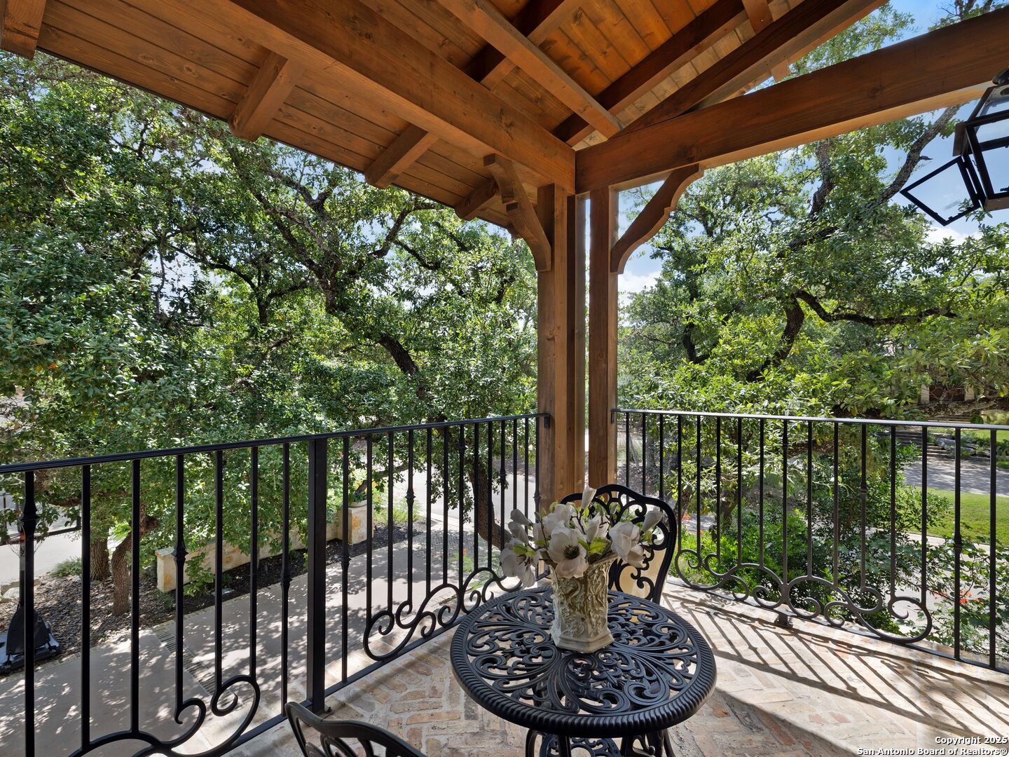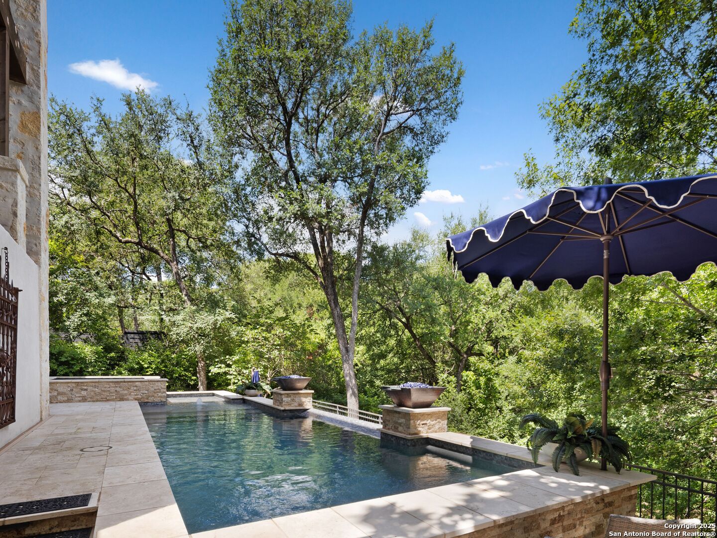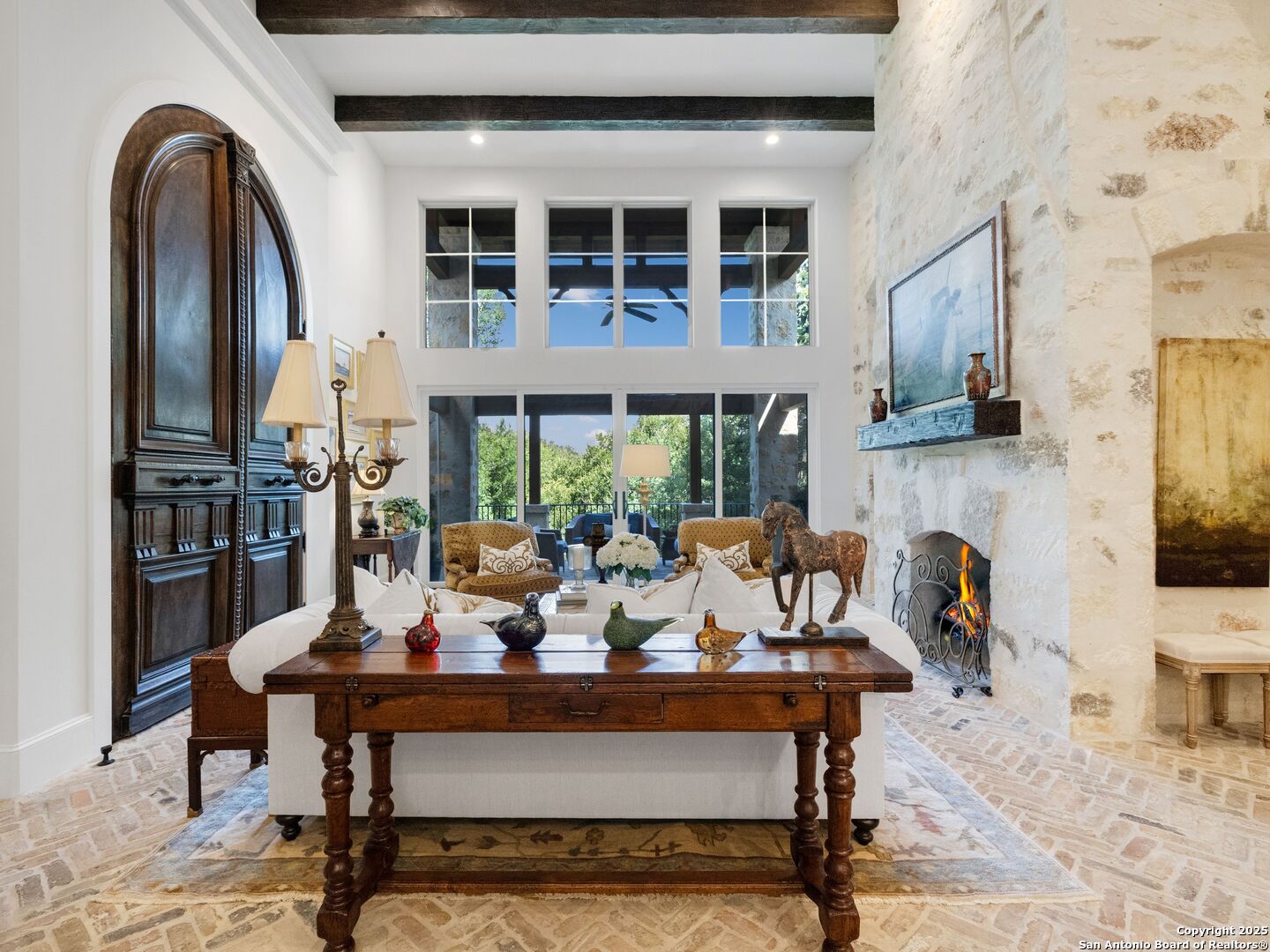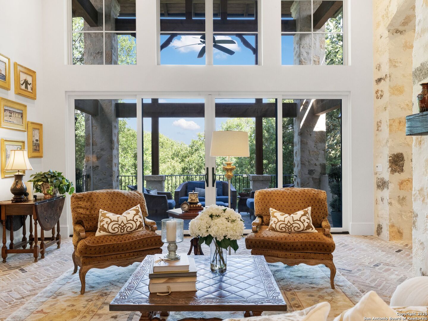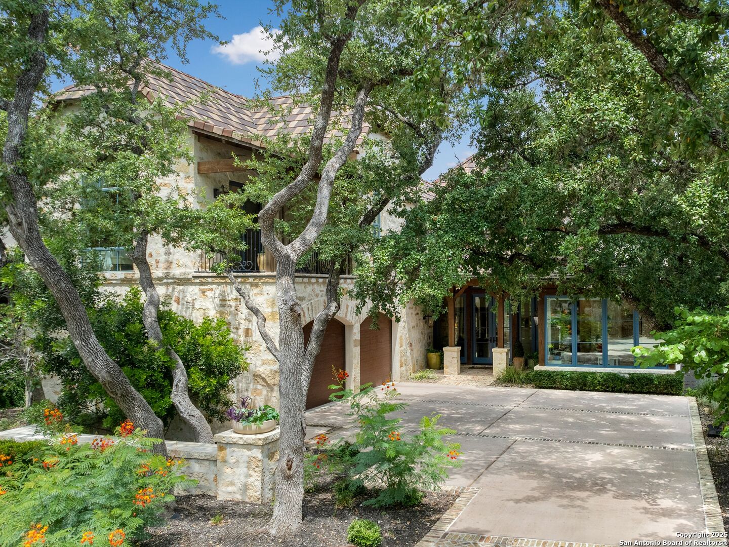 A refined expression of modern French design, this architectural masterpiece by world renowned Roy Braswell and masterfully built by Omni Custom Homes blends elegance, comfort, and functionality. Exuding timeless sophistication, the residence showcases a harmonious indoor to outdoor flow with light filled interiors and a gracious floor plan tailored for everyday living and grand entertaining. Impeccable craftsmanship is evident throughout from smooth finish walls and solid wood doors to custom ceiling treatments and stacked brick accent walls. The chef's kitchen is a culinary showpiece, featuring an oversized island, custom solid wood cabinetry, and professional grade stainless steel appliances. The primary suite is a private retreat with a luxurious spa bath and a generously sized walk in closet outfitted with extensive built ins. A secondary bedroom with a full bath is located on the main level, while two additional guest suites and a loft area are positioned upstairs, each with en suite baths and large closets. Prewired for an elevator, the home allows for future adaptability. Outdoors, enjoy an expansive park like setting with a spacious covered patio, sparkling pool and spa with fire bowl features, maintenance free turf, and endless mature oaks offering privacy along the greenbelt lot creating a truly tranquil sanctuary.