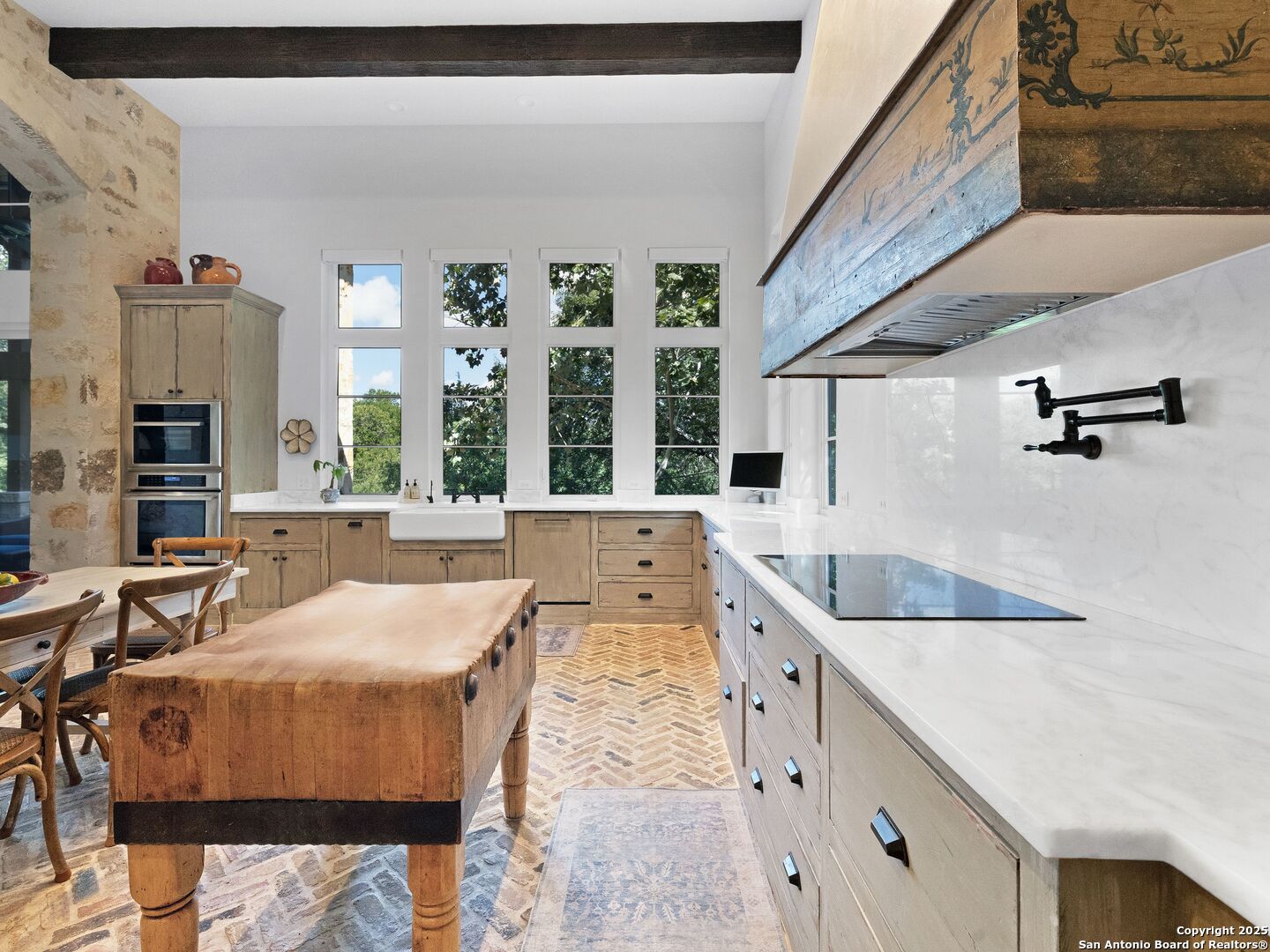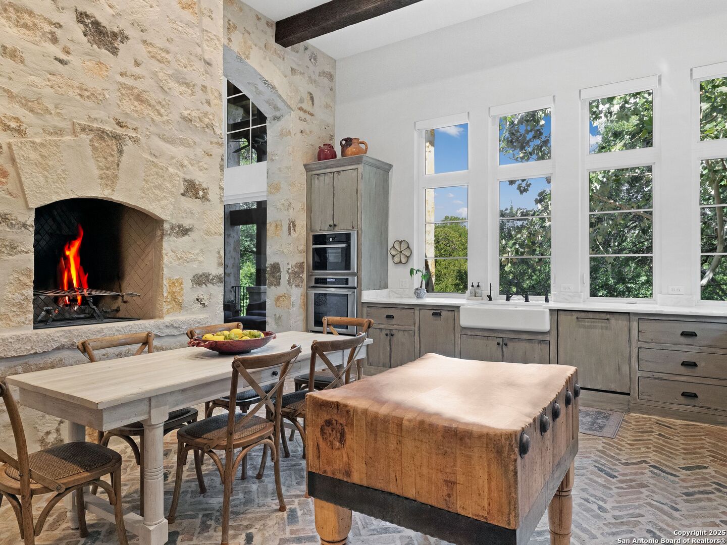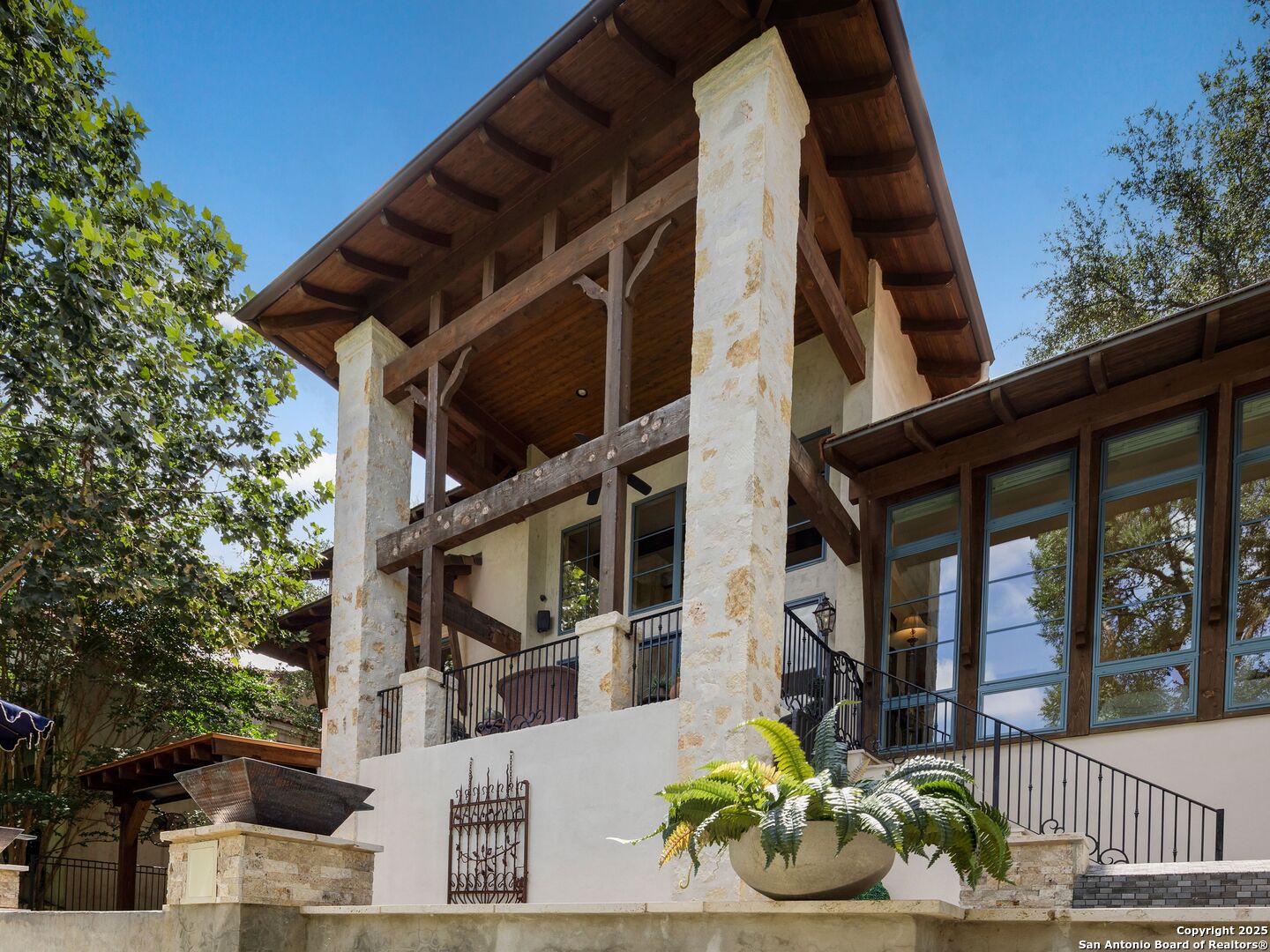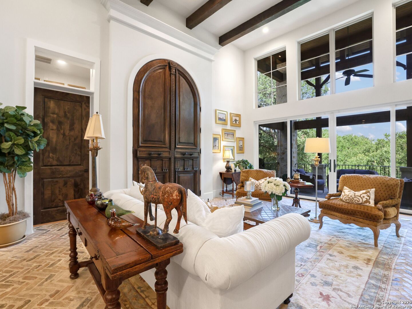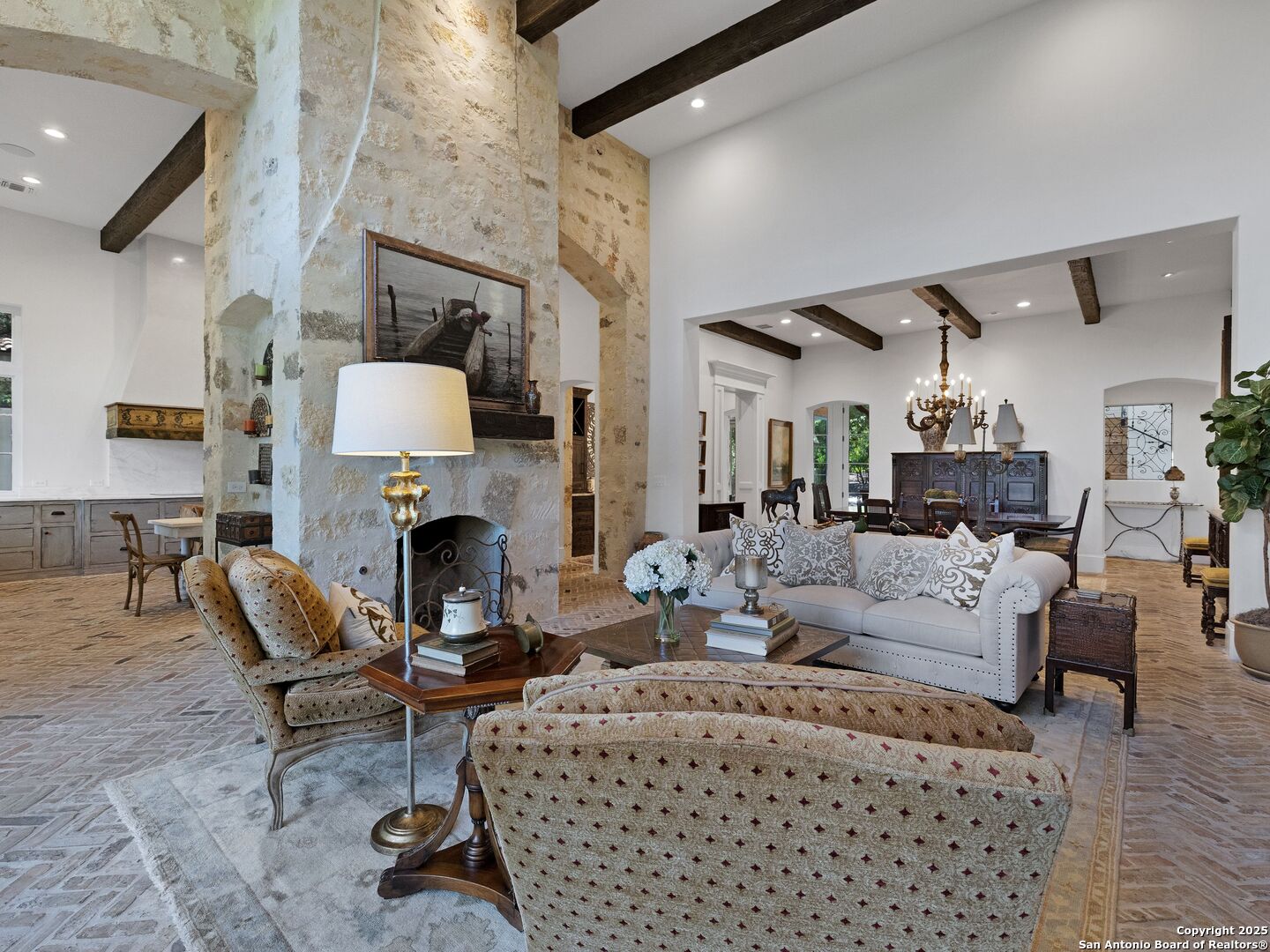A refined expression of modern French design, this architectural masterpiece by world renowned Roy Braswell and masterfully built by Omni Custom Homes blends elegance, comfort, and functionality. Exuding timeless sophistication, the residence showcases a harmonious indoor to outdoor flow with light filled interiors and a gracious floor plan tailored for everyday living and grand entertaining. Impeccable craftsmanship is evident throughout from smooth finish walls and solid wood doors to custom ceiling treatments and stacked brick accent walls. The chef's kitchen is a culinary showpiece, featuring an oversized island, custom solid wood cabinetry, and professional grade stainless steel appliances. The primary suite is a private retreat with a luxurious spa bath and a generously sized walk in closet outfitted with extensive built ins. A secondary bedroom with a full bath is located on the main level, while two additional guest suites and a loft area are positioned upstairs, each with en suite baths and large closets. Prewired for an elevator, the home allows for future adaptability. Outdoors, enjoy an expansive park like setting with a spacious covered patio, sparkling pool and spa with fire bowl features, maintenance free turf, and endless mature oaks offering privacy along the greenbelt lot creating a truly tranquil sanctuary.
