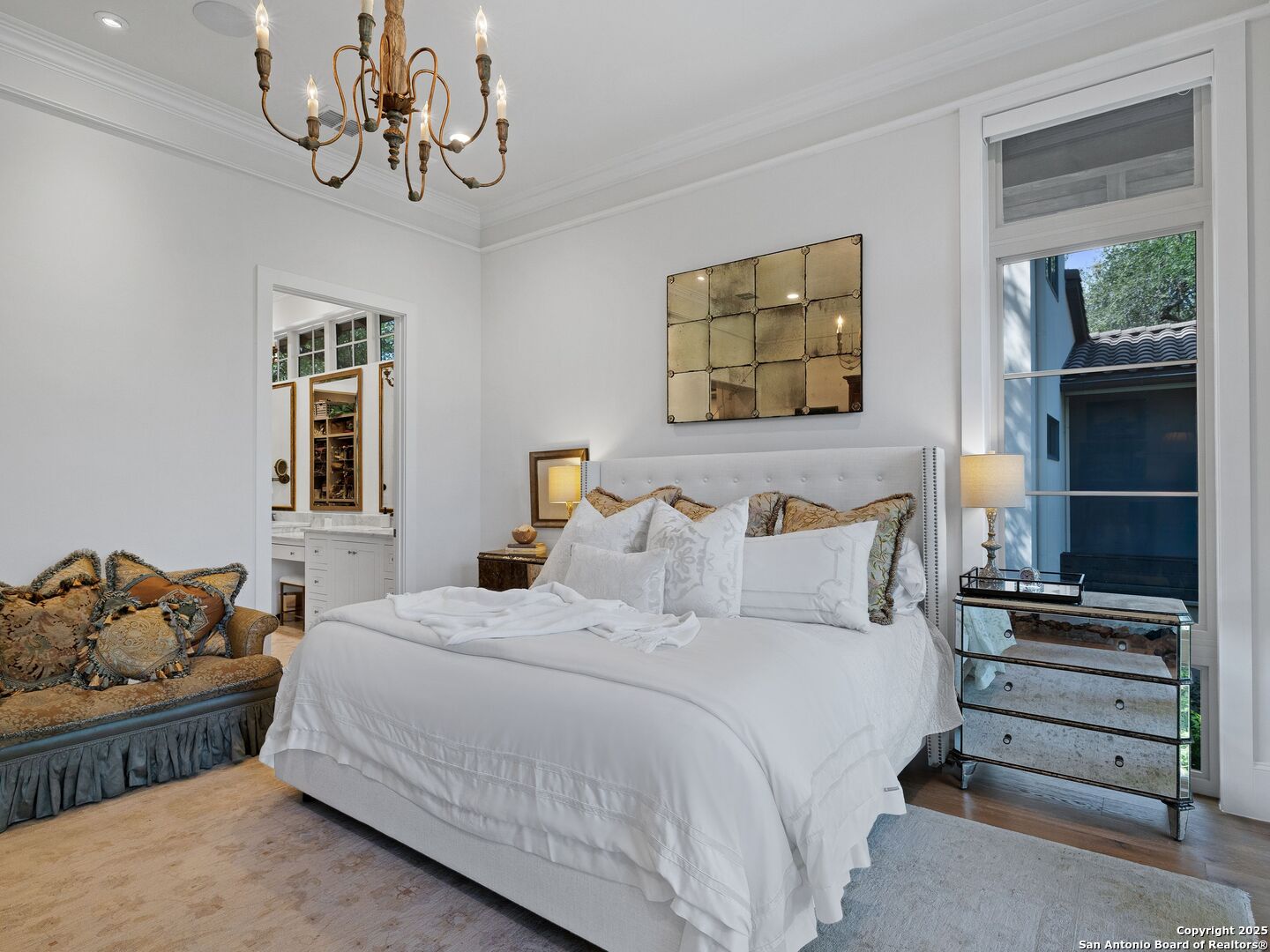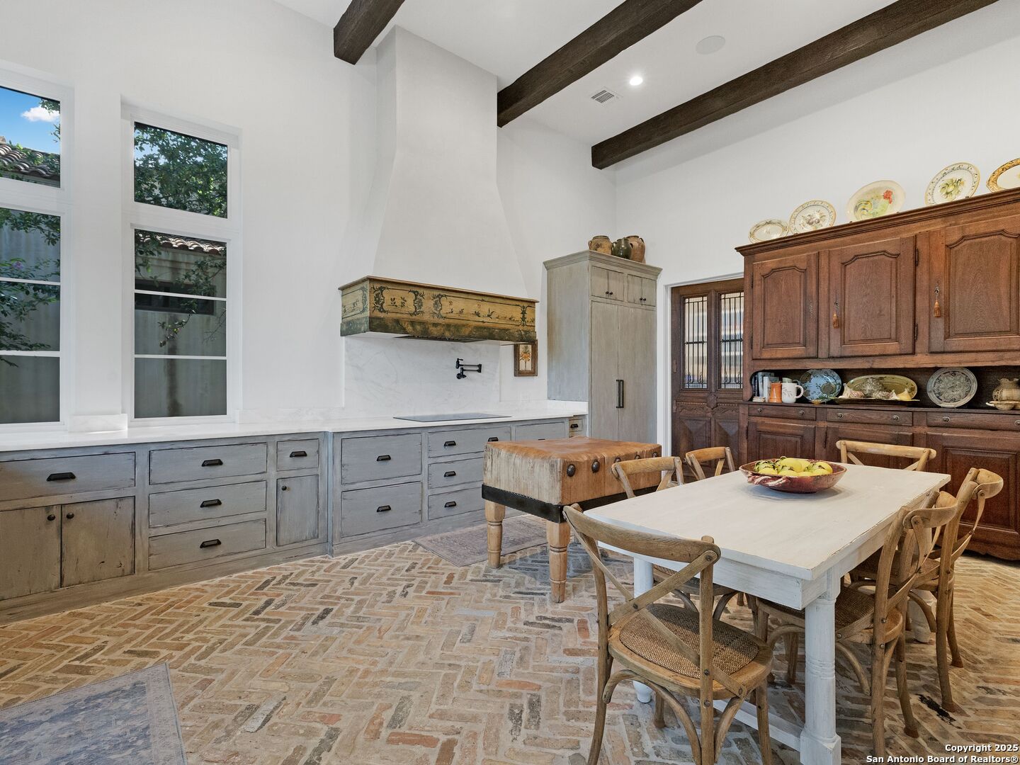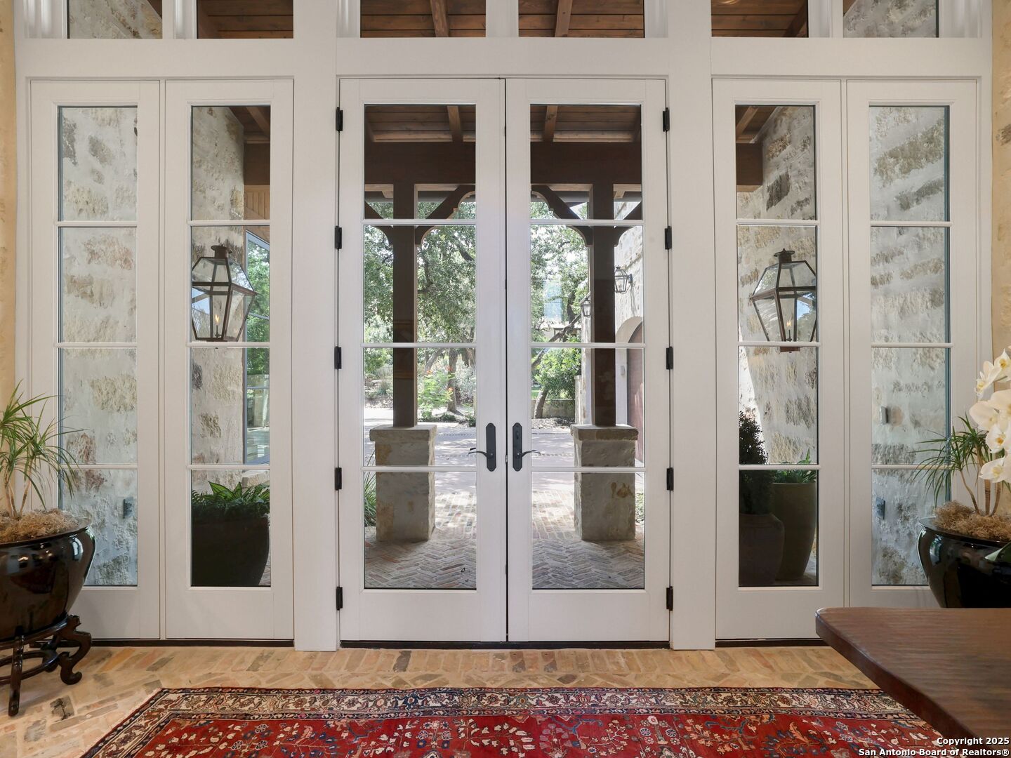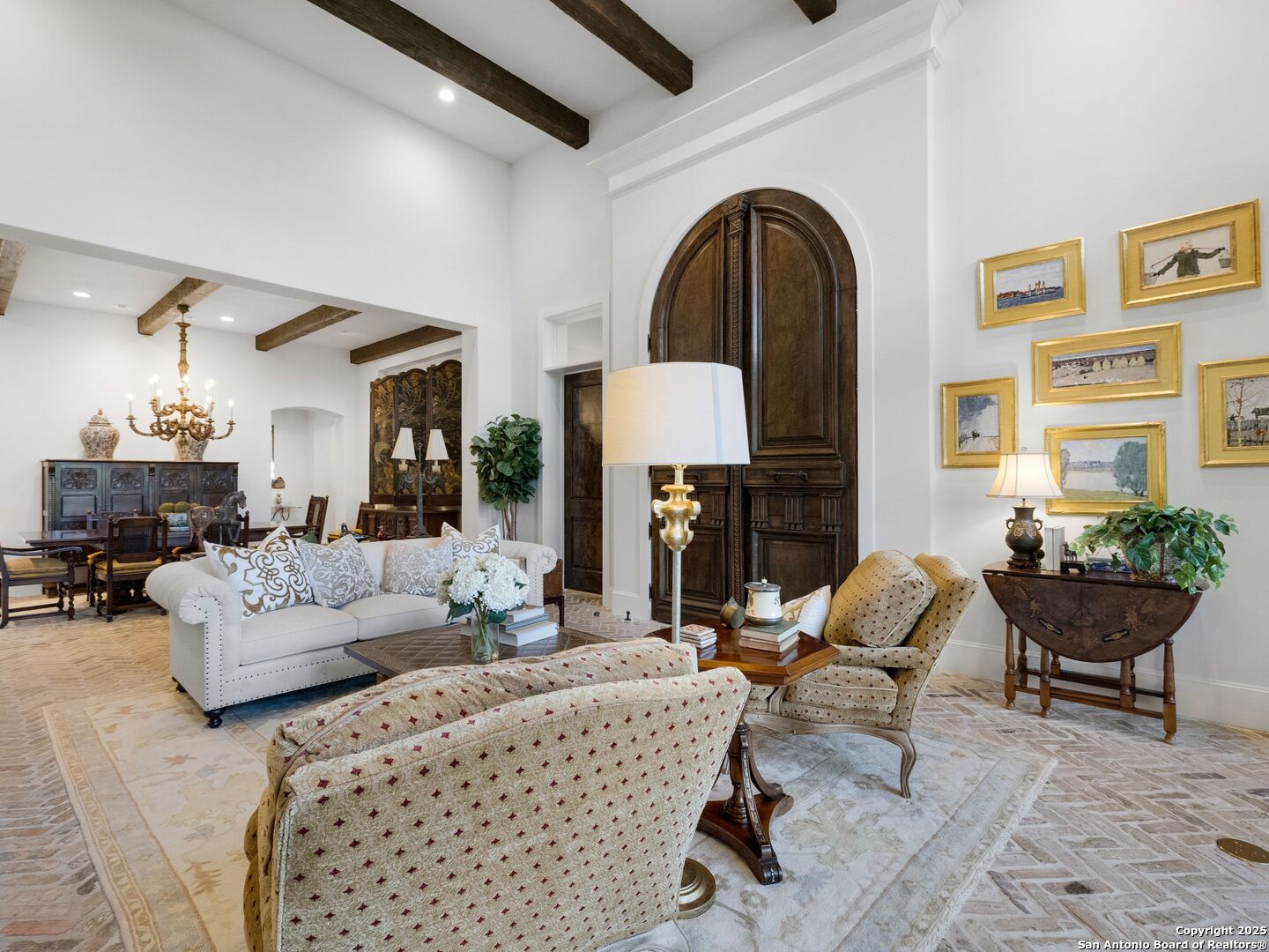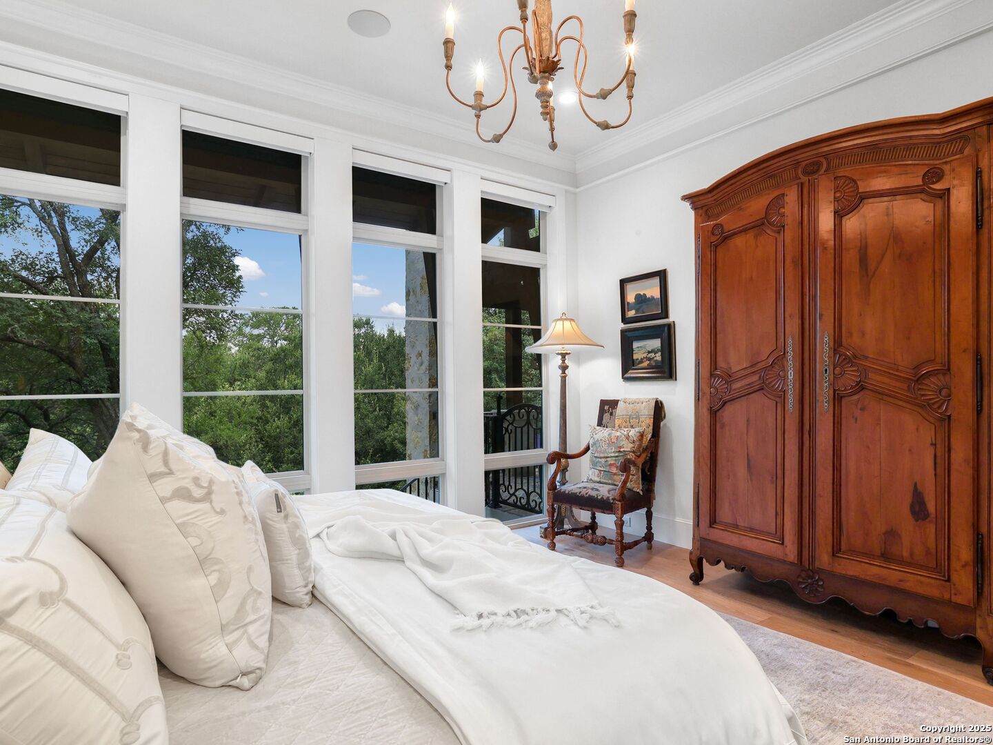A refined expression of modern French design, this architectural masterpiece by world renowned Roy Braswell and masterfully built by Omni Custom Homes blends elegance, comfort, and functionality. Exuding timeless sophistication, the residence showcases a harmonious indoor to outdoor flow with light filled interiors and a gracious floor plan tailored for everyday living and grand entertaining. Impeccable craftsmanship is evident throughout from smooth finish walls and solid wood doors to custom ceiling treatments and stacked brick accent walls. The chef's kitchen is a culinary showpiece, featuring an oversized island, custom solid wood cabinetry, and professional grade stainless steel appliances. The primary suite is a private retreat with a luxurious spa bath and a generously sized walk in closet outfitted with extensive built ins. A secondary bedroom with a full bath is located on the main level, while two additional guest suites and a loft area are positioned upstairs, each with en suite baths and large closets. Prewired for an elevator, the home allows for future adaptability. Outdoors, enjoy an expansive park like setting with a spacious covered patio, sparkling pool and spa with fire bowl features, maintenance free turf, and endless mature oaks offering privacy along the greenbelt lot creating a truly tranquil sanctuary.