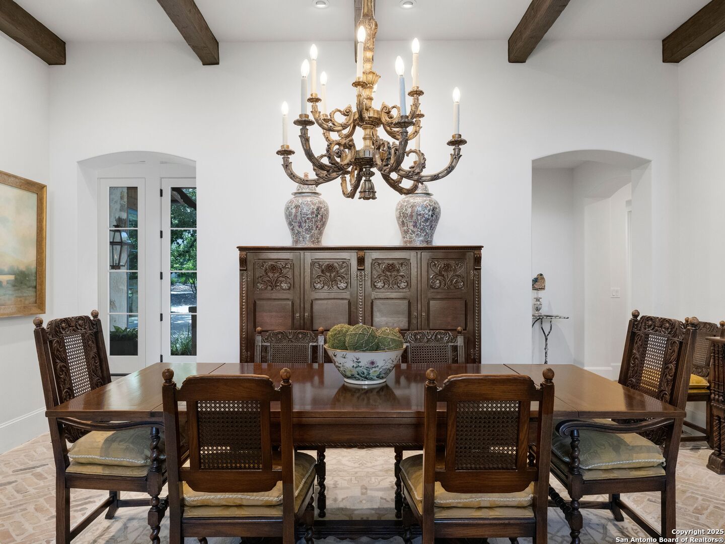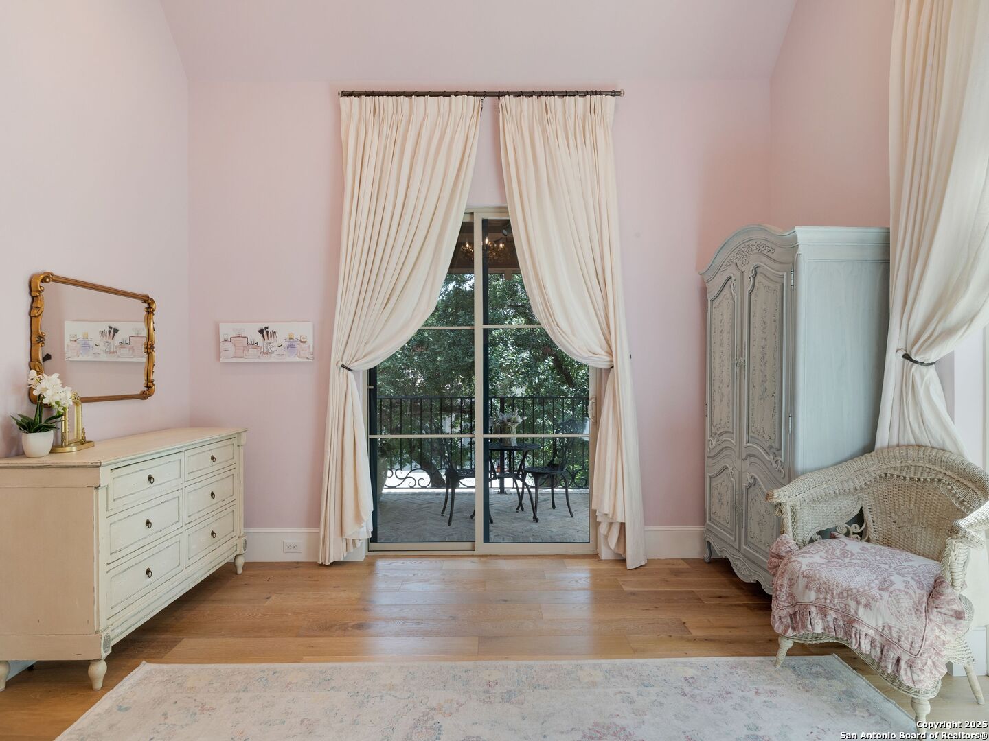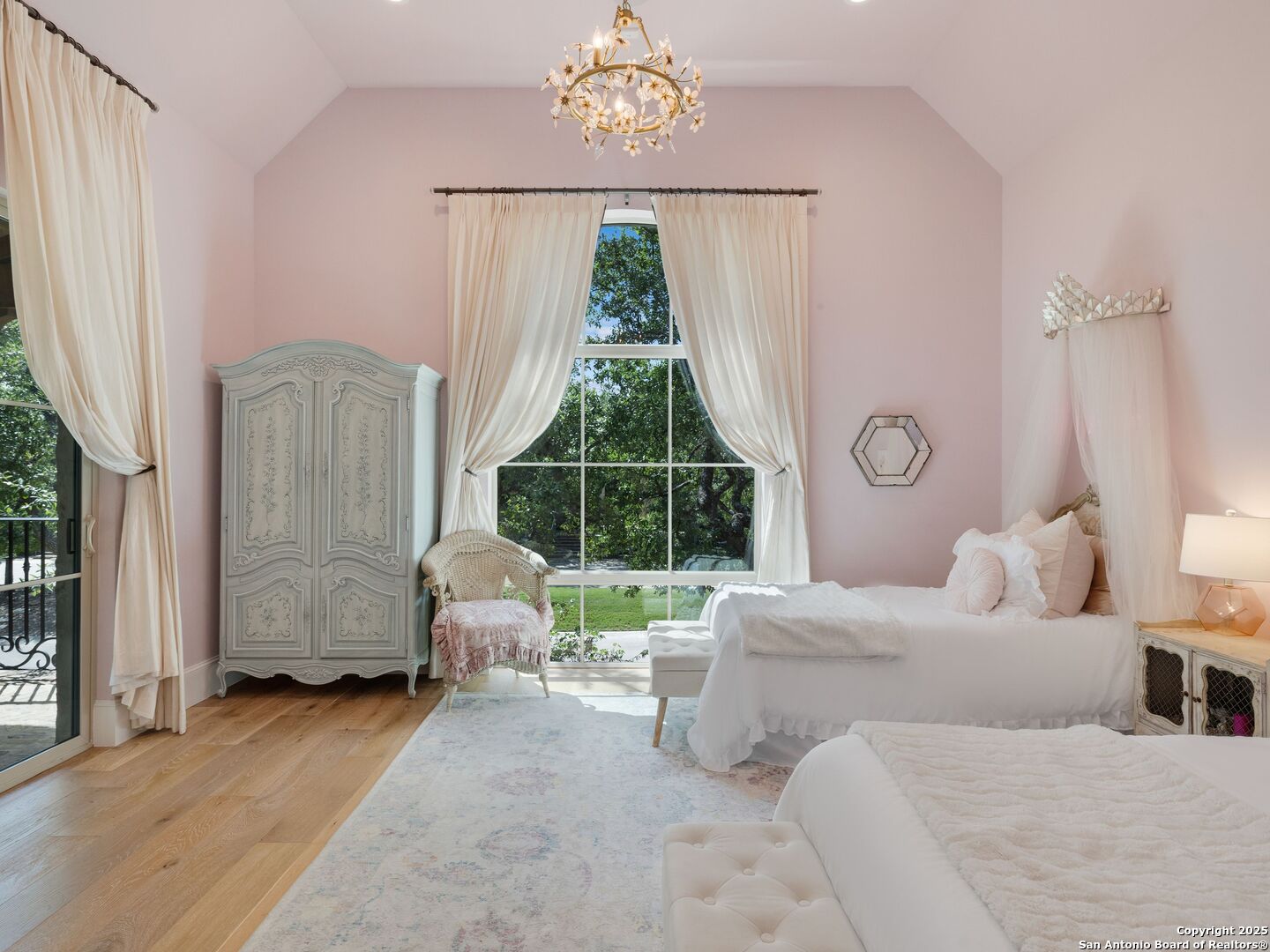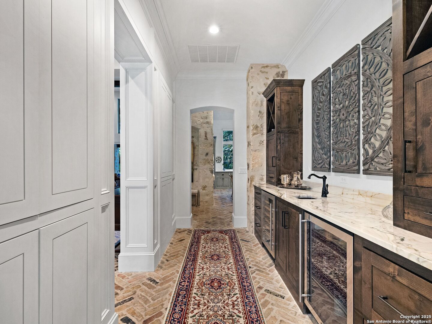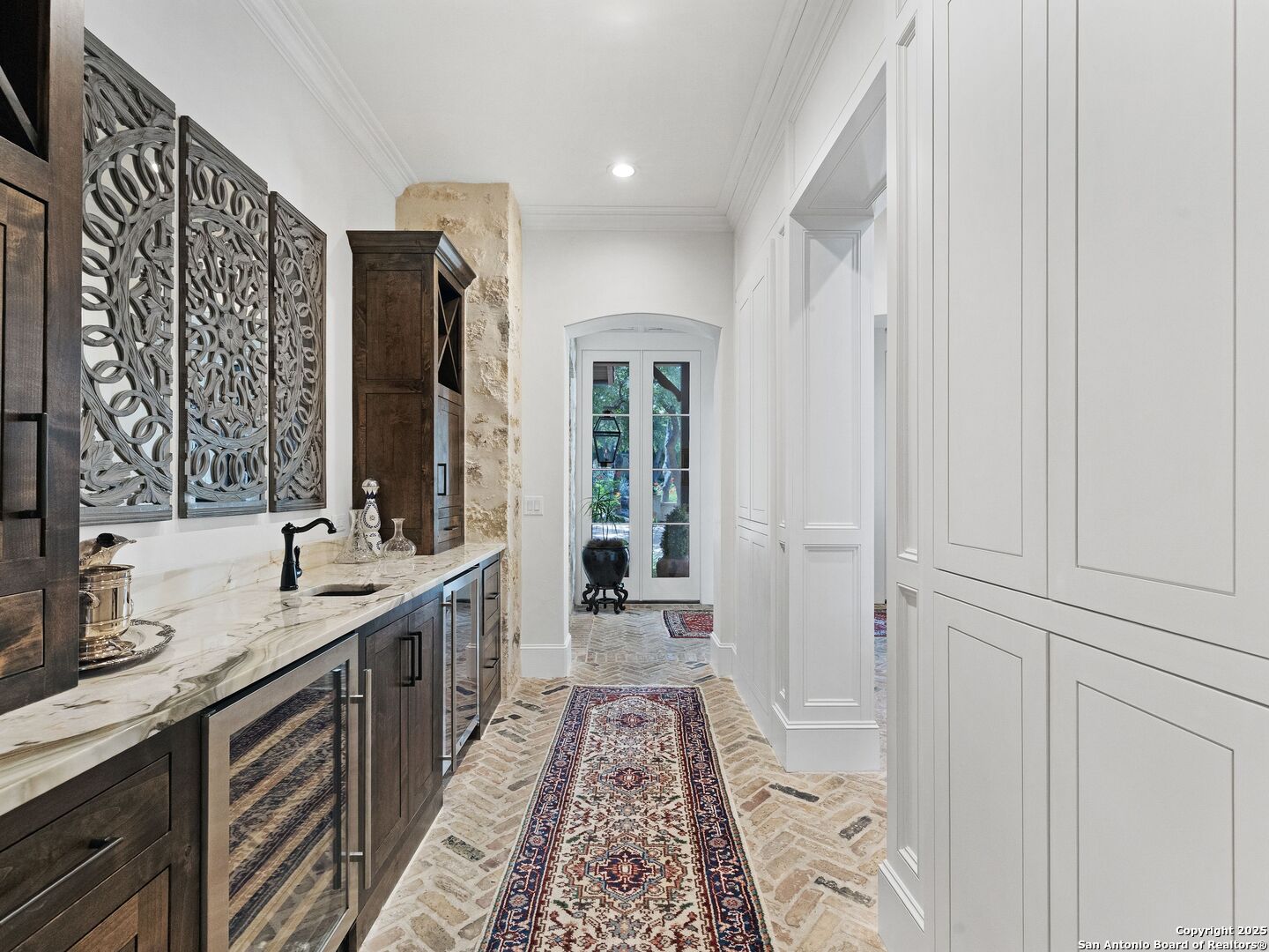 A refined expression of modern French design, this architectural masterpiece by world renowned Roy Braswell and masterfully built by Omni Custom Homes blends elegance, comfort, and functionality. Exuding timeless sophistication, the residence showcases a harmonious indoor to outdoor flow with light filled interiors and a gracious floor plan tailored for everyday living and grand entertaining. Impeccable craftsmanship is evident throughout from smooth finish walls and solid wood doors to custom ceiling treatments and stacked brick accent walls. The chef's kitchen is a culinary showpiece, featuring an oversized island, custom solid wood cabinetry, and professional grade stainless steel appliances. The primary suite is a private retreat with a luxurious spa bath and a generously sized walk in closet outfitted with extensive built ins. A secondary bedroom with a full bath is located on the main level, while two additional guest suites and a loft area are positioned upstairs, each with en suite baths and large closets. Prewired for an elevator, the home allows for future adaptability. Outdoors, enjoy an expansive park like setting with a spacious covered patio, sparkling pool and spa with fire bowl features, maintenance free turf, and endless mature oaks offering privacy along the greenbelt lot creating a truly tranquil sanctuary.