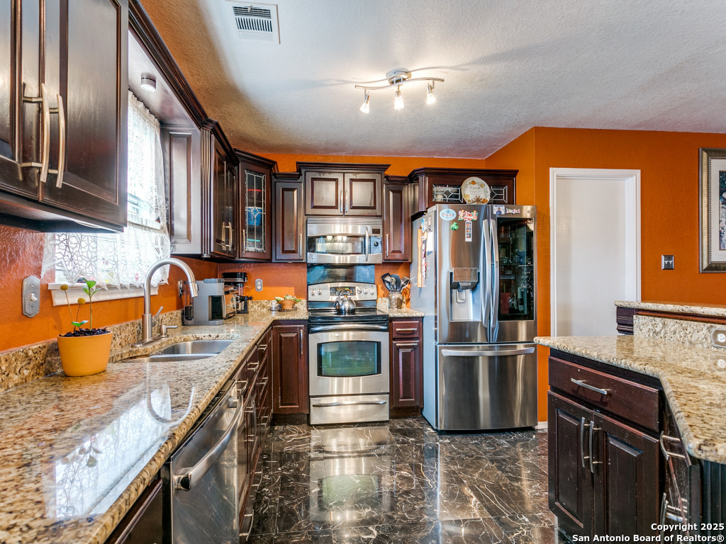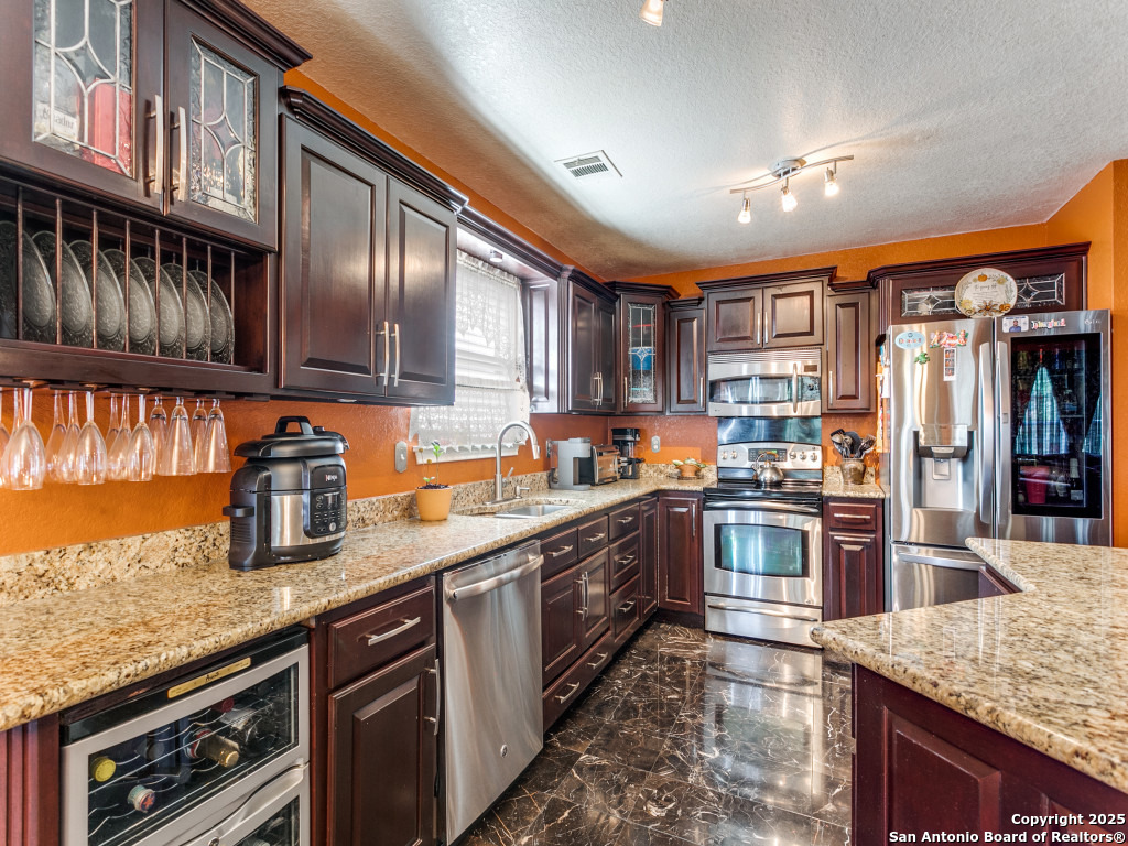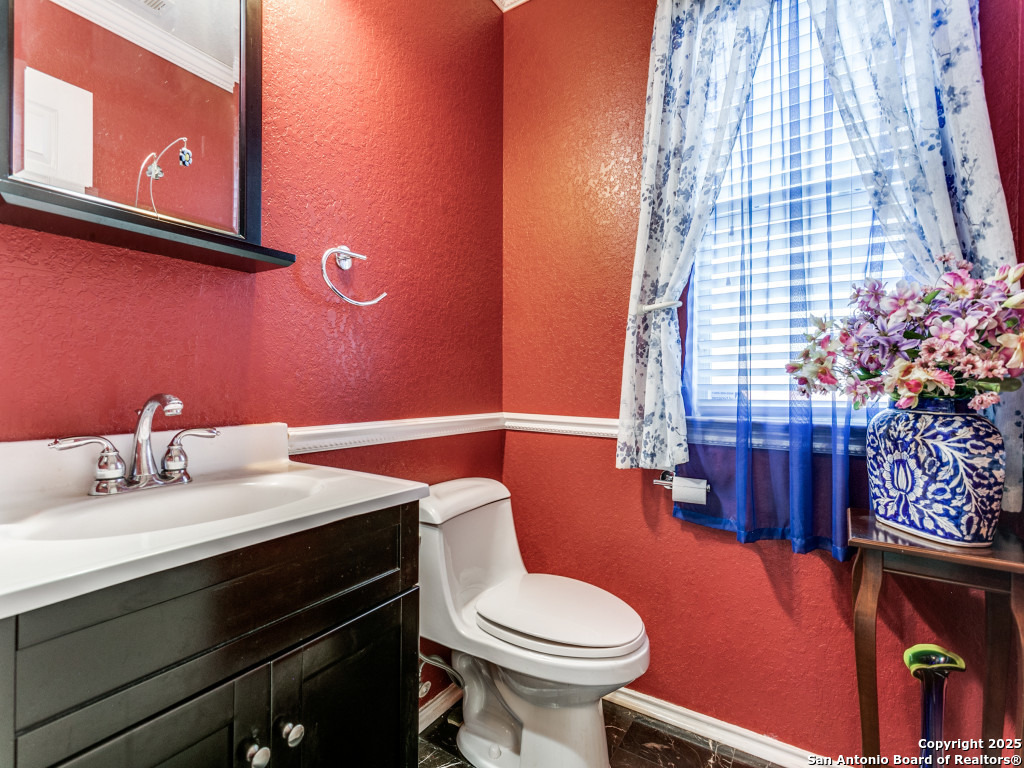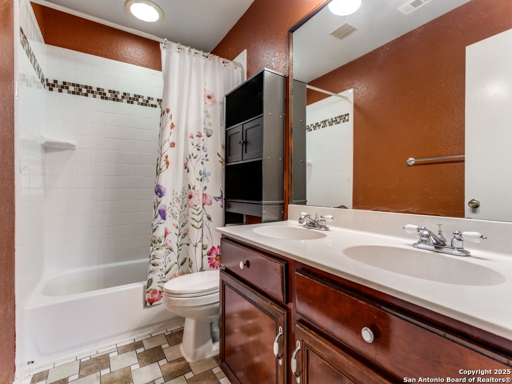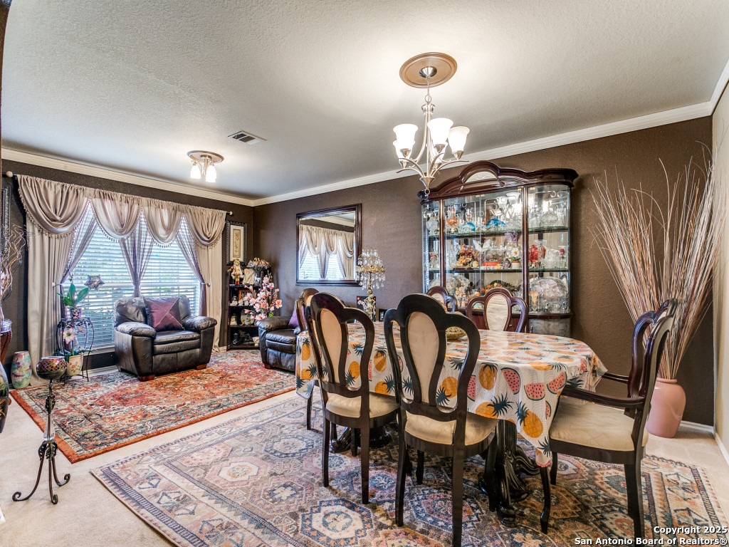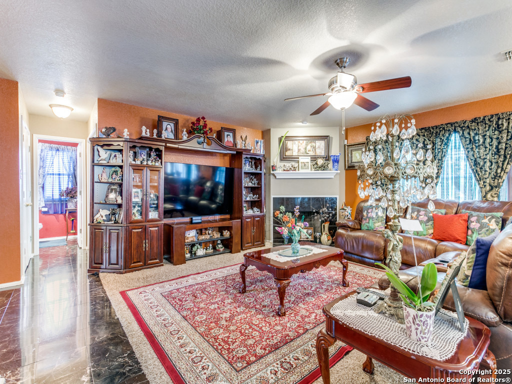 Don't miss out on this beautiful 4 Bedroom, 2.5 Bathroom home on corner lot with open floor plan designed for both entertaining and everyday living. The kitchen is a chef's dream-featuring mahogany-stained cherry cabinets with glass doors, granite countertops, stainless steel appliances, and wine chiller. The home also boasts two spacious living areas, two dining spaces, and a cozy fireplace. The downstairs spacious bonus room can be used as a study/office/gym or bedroom. Upstairs, the oversized primary suite offers a true retreat with a spa-style bath including garden tub, separate shower, dual vanities, and an enormous walk-in closet. Three additional large bedrooms, an upgraded bathroom with skylight, and a game room provide plenty of space for family and guests. Location is unbeatable-just off Potranco Road with quick access to Loop 1604, Lackland & Kelly AFBs, SeaWorld, shopping, dining, and everyday conveniences right across the street.
