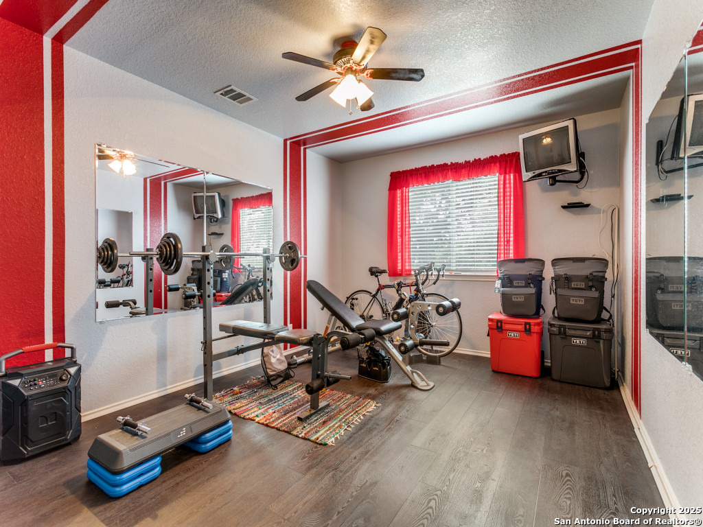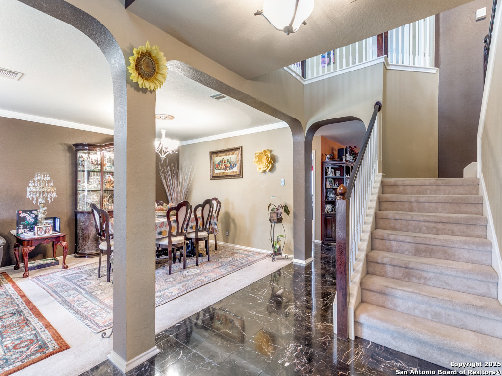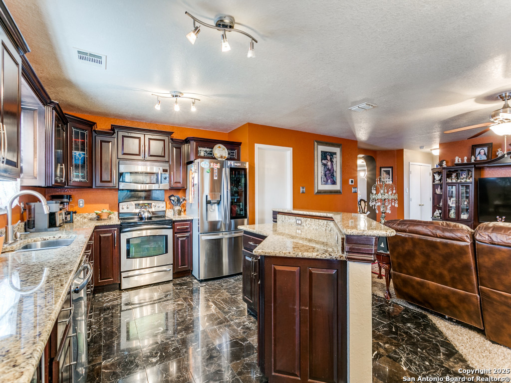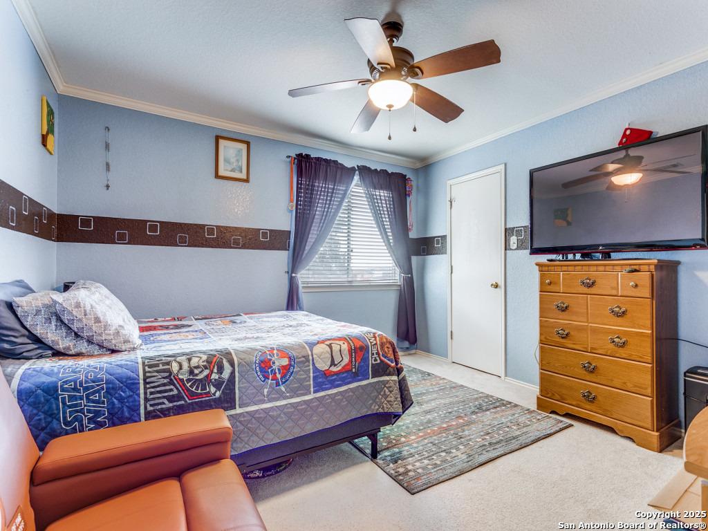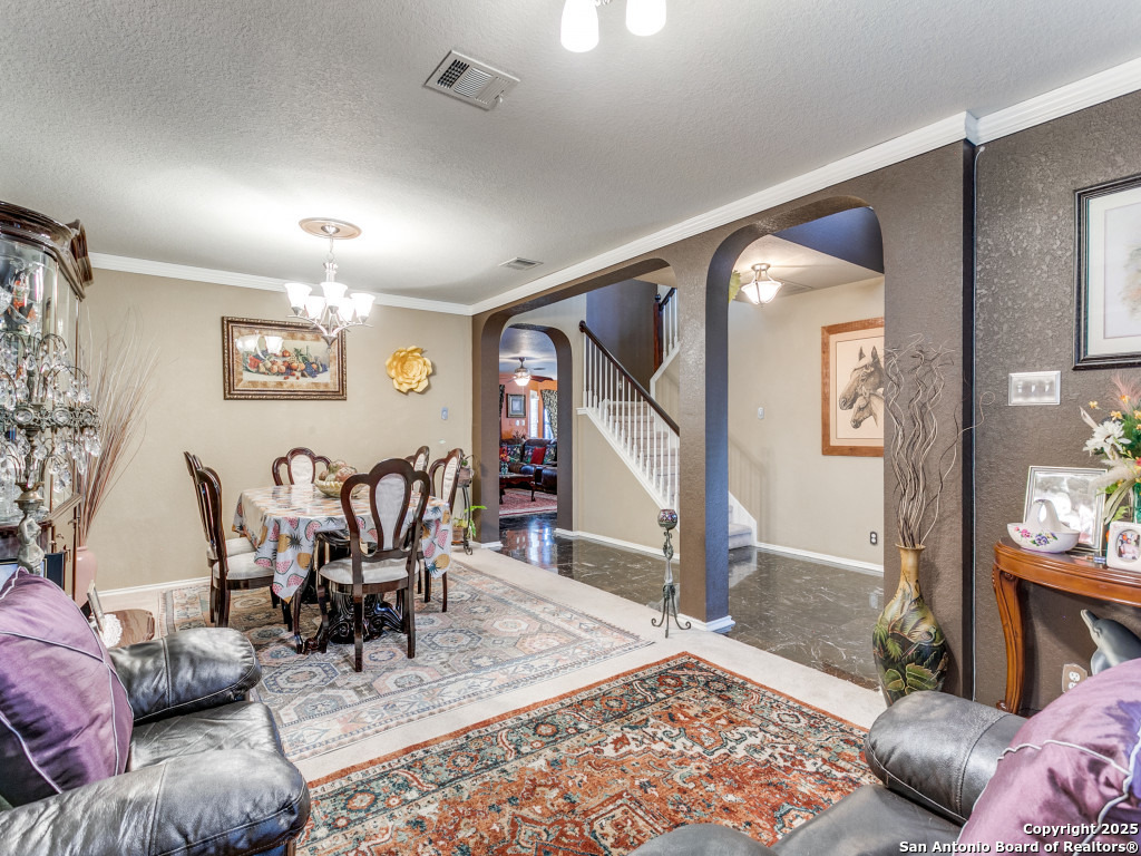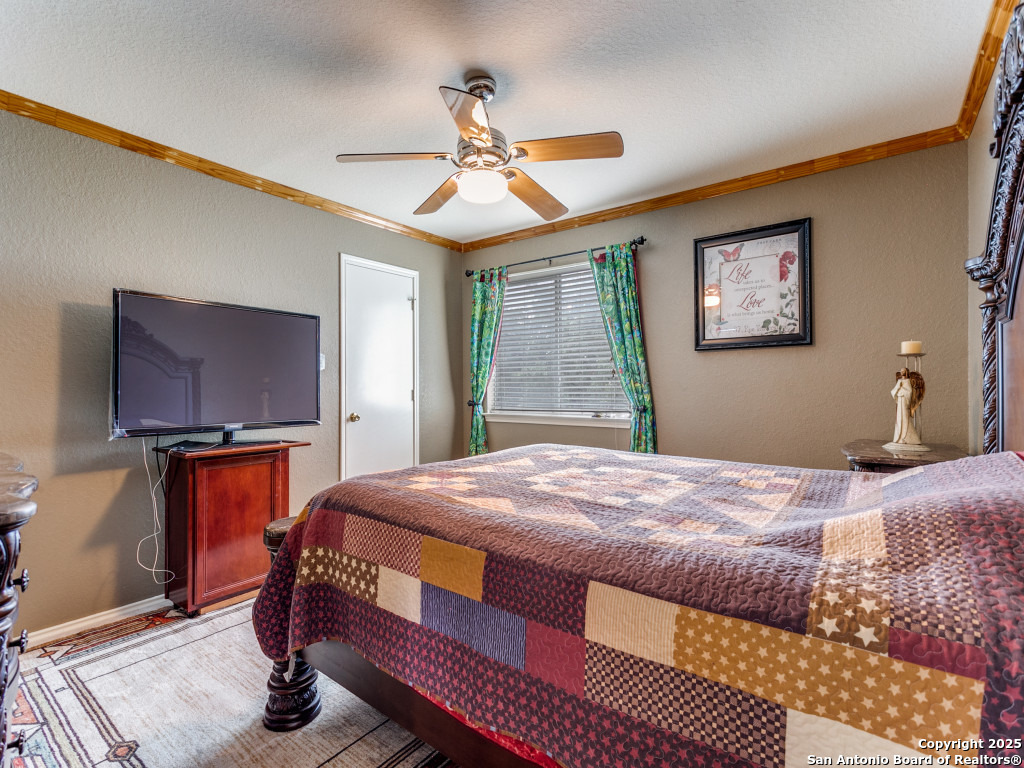 Don't miss out on this beautiful 4 Bedroom, 2.5 Bathroom home on corner lot with open floor plan designed for both entertaining and everyday living. The kitchen is a chef's dream-featuring mahogany-stained cherry cabinets with glass doors, granite countertops, stainless steel appliances, and wine chiller. The home also boasts two spacious living areas, two dining spaces, and a cozy fireplace. The downstairs spacious bonus room can be used as a study/office/gym or bedroom. Upstairs, the oversized primary suite offers a true retreat with a spa-style bath including garden tub, separate shower, dual vanities, and an enormous walk-in closet. Three additional large bedrooms, an upgraded bathroom with skylight, and a game room provide plenty of space for family and guests. Location is unbeatable-just off Potranco Road with quick access to Loop 1604, Lackland & Kelly AFBs, SeaWorld, shopping, dining, and everyday conveniences right across the street.