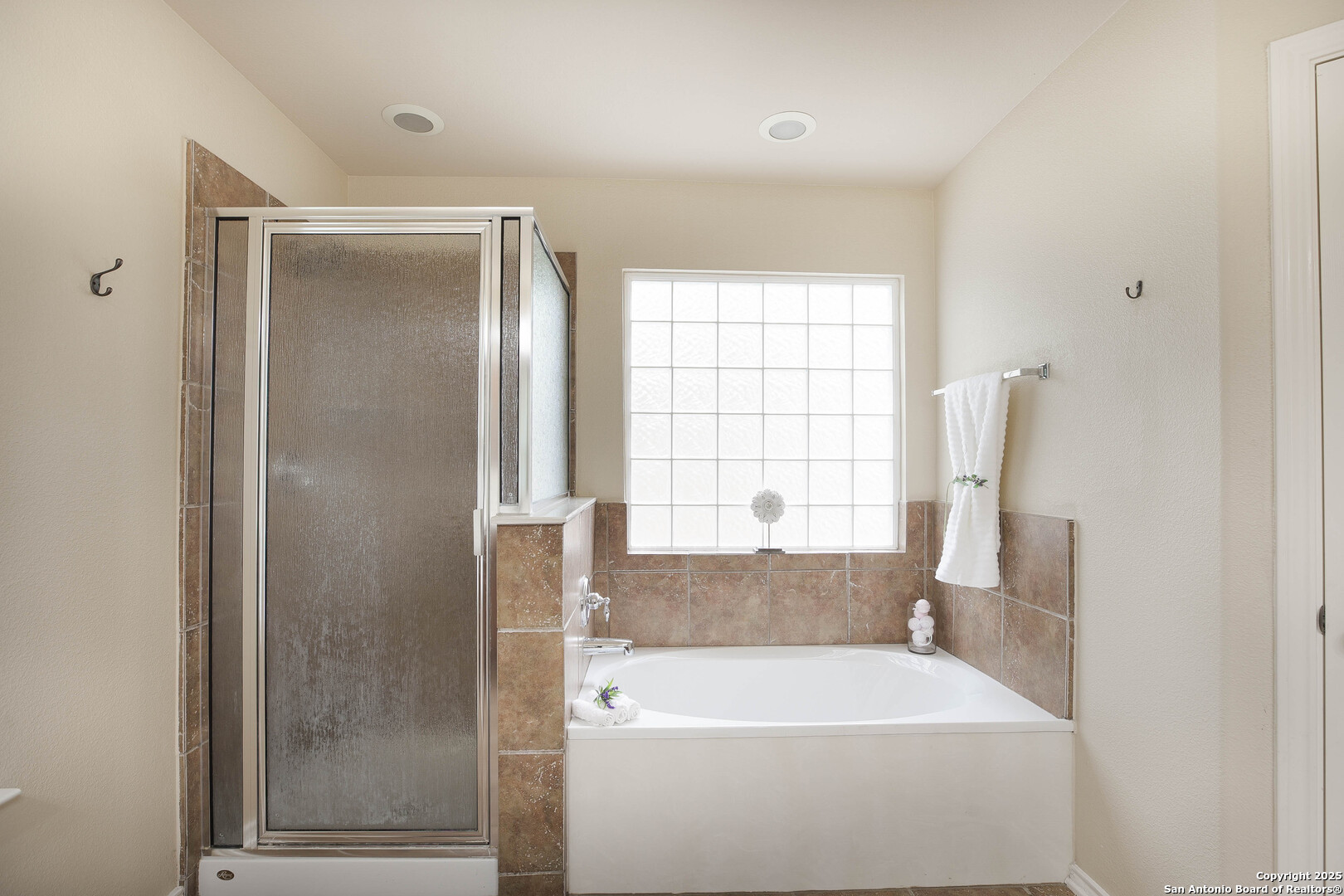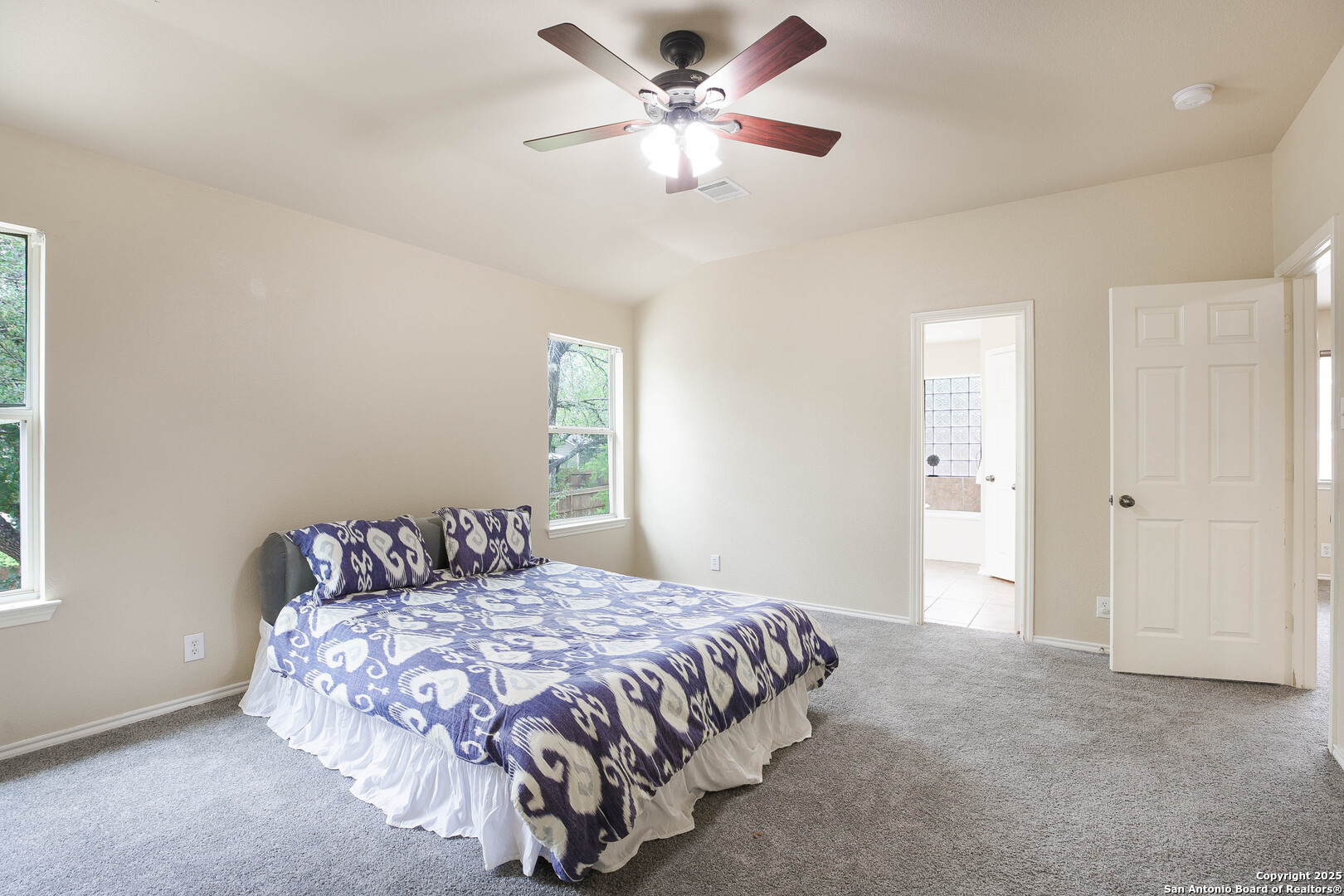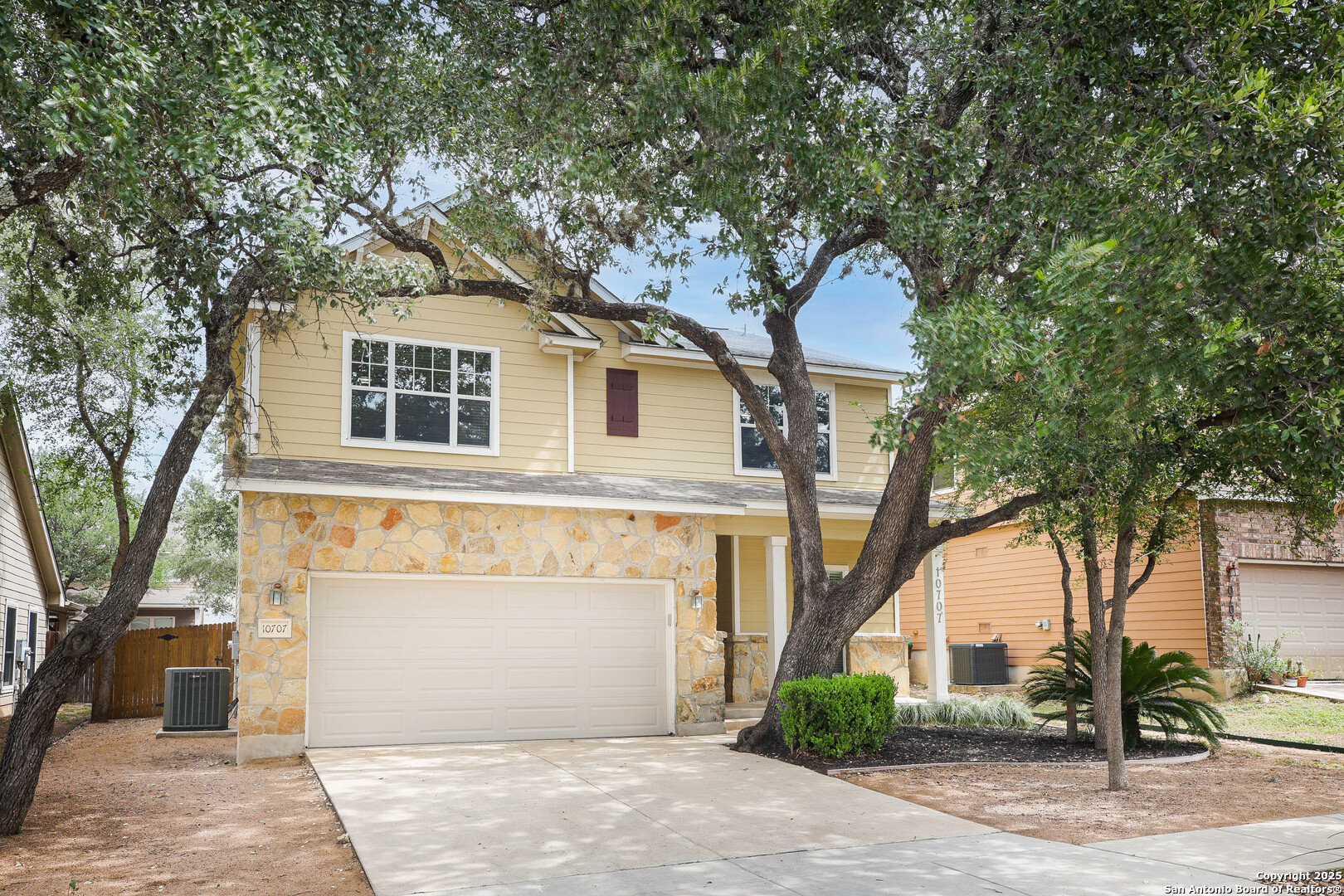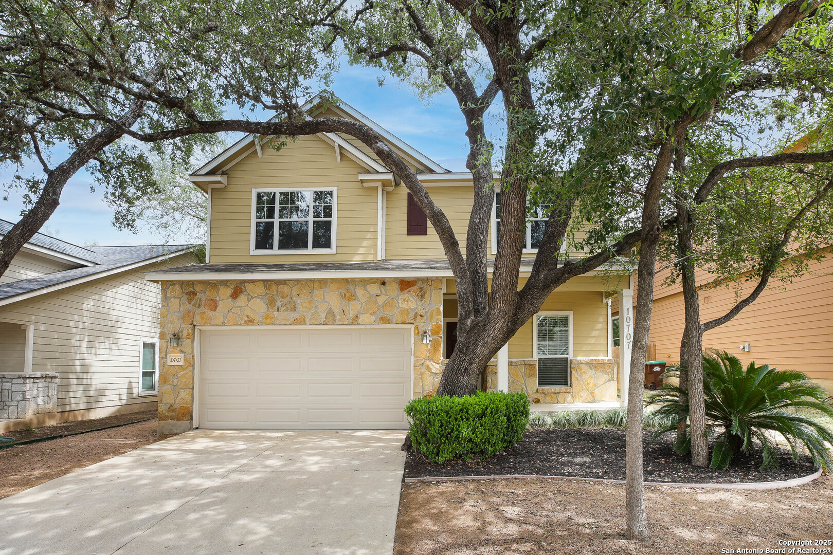 Step into this beautifully refreshed 2-story home that's truly better than ever! With recent upgrades and thoughtful improvements throughout, this stunning property is now completely turn-key - even the refrigerator and washer/dryer convey. Just pack your bags and move right in! VA assumable and willing to allow entitlement to be used. This oversized backyard shaded by incredible, mature oak trees - including one that's perfect for a treehouse or the ultimate climbing tree. Very low maintenance front yard. Enjoy outdoor living year-round under the extended covered patio, ideal for BBQs and gatherings. Inside, the spacious family room features beautiful flooring and a cozy fireplace, setting the perfect scene for relaxing or entertaining. The chef's kitchen boasts abundant cabinetry, generous countertop space, and a bright eat-in breakfast area that opens seamlessly to the dining space. Work or study in style in the elegant home office, complete with French doors, custom trim, and built-in shelving. Upstairs, you'll find a split-bedroom layout with exceptionally large rooms, plus a spacious game room and an extended loft area - perfect as a flex space for reading, study nook, or home gym. Retreat to your expansive primary suite with a huge walk-in closet, garden tub, separate shower, and double vanity. A custom-lit alcove adds a touch of elegance for displaying your favorite art or decor pieces. Schedule a showing to view this move-in ready, upgraded home that offers space, charm, and versatility both inside and out. Not to mention, so very near is what will become your beloved HEB, conveniently located with quick access to 1604, the elementary school, great shopping and dining near-by.