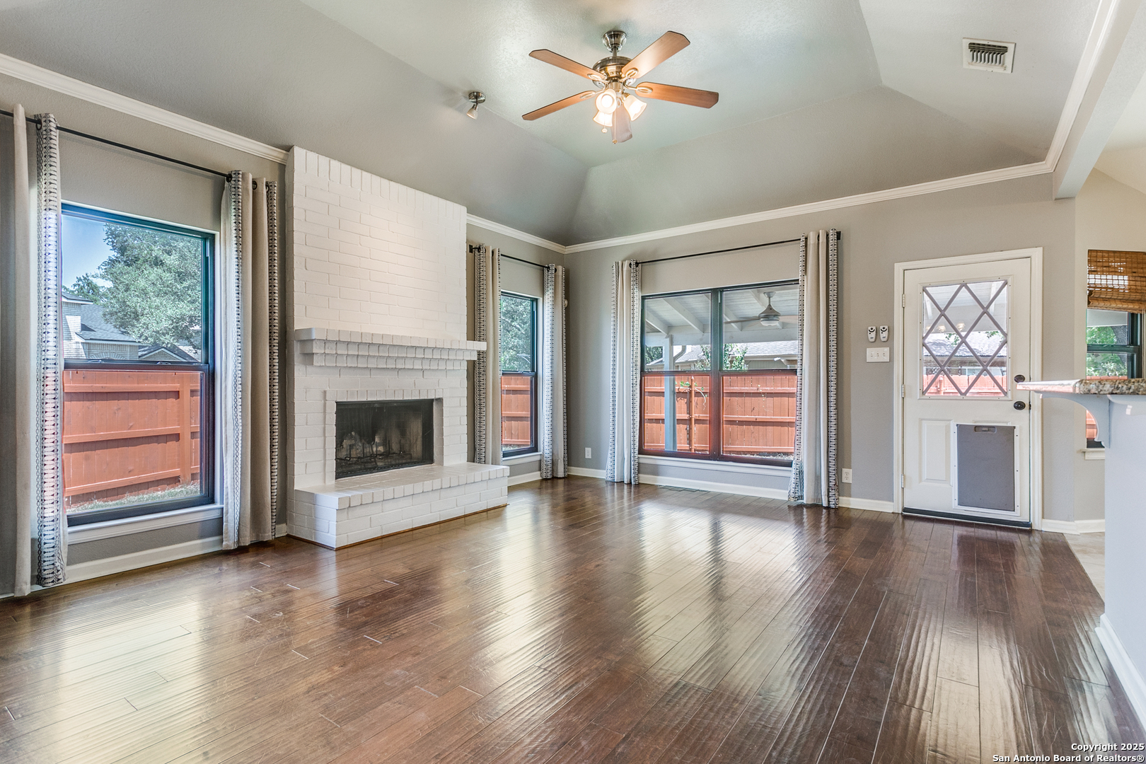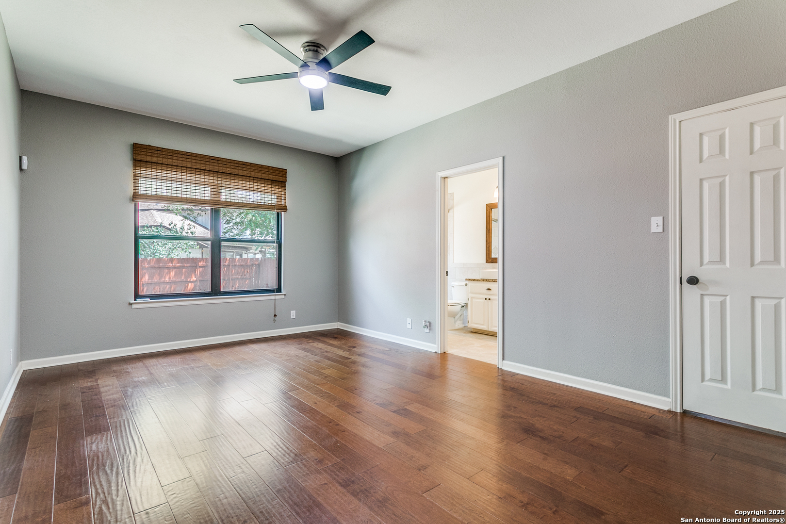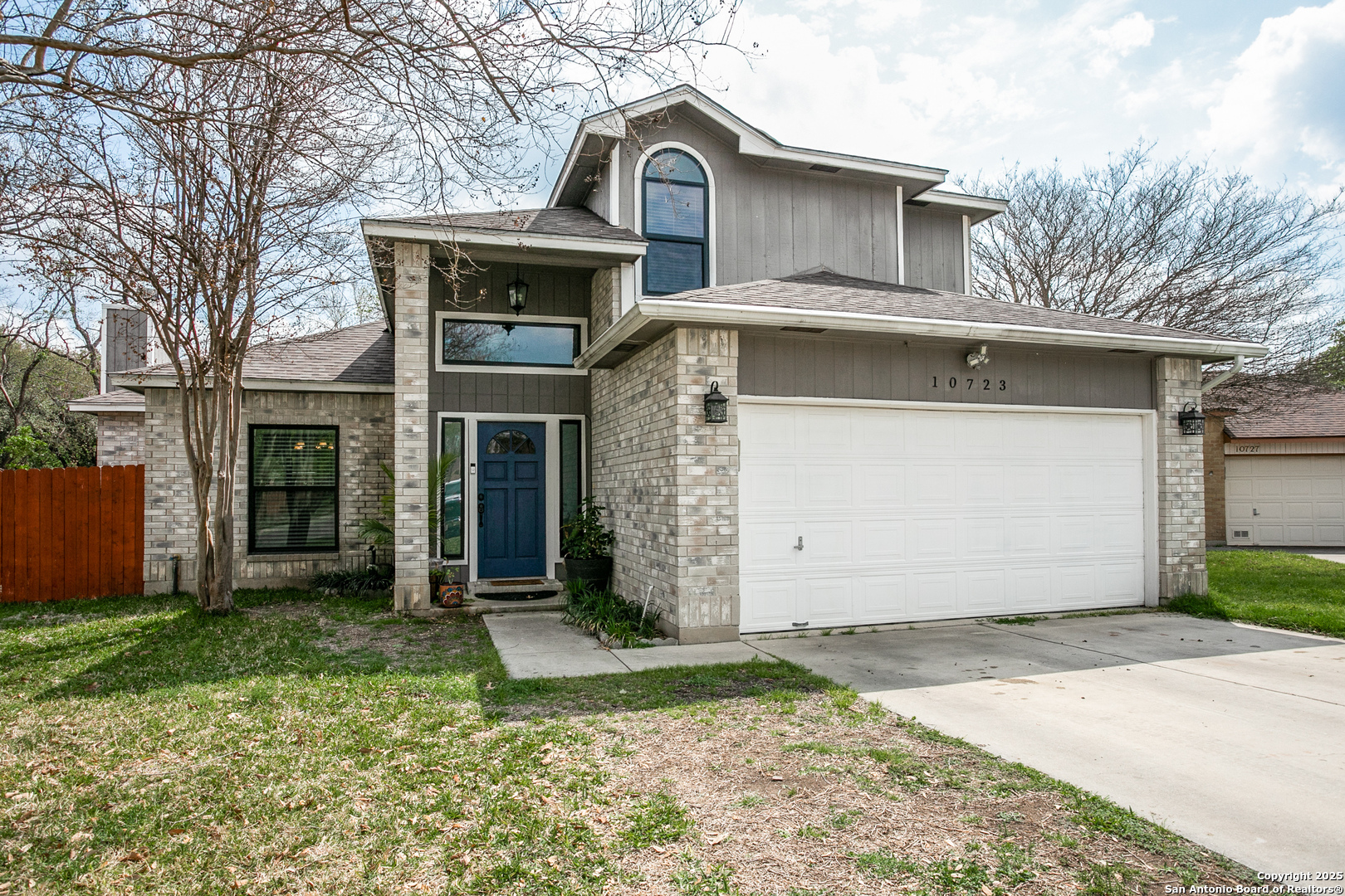 This spacious home is situated in the quiet, gated Towne Lake neighborhood with easy access to Salado Creek Greenway. This spacious home provides ample living space with high ceilings and open-concept light-filled main level. Warm wood floors through much of the home. The kitchen has a breakfast nook and opens to the living room with brick- surround fireplace. The second dining area is adjacent to the living space. Primary bedroom on the lower level with en-suite bath and walk-in closet. 3 more bedrooms upstairs share a hall bathroom. Great outdoor space with covered patio, privacy fence, and sprinkler system.