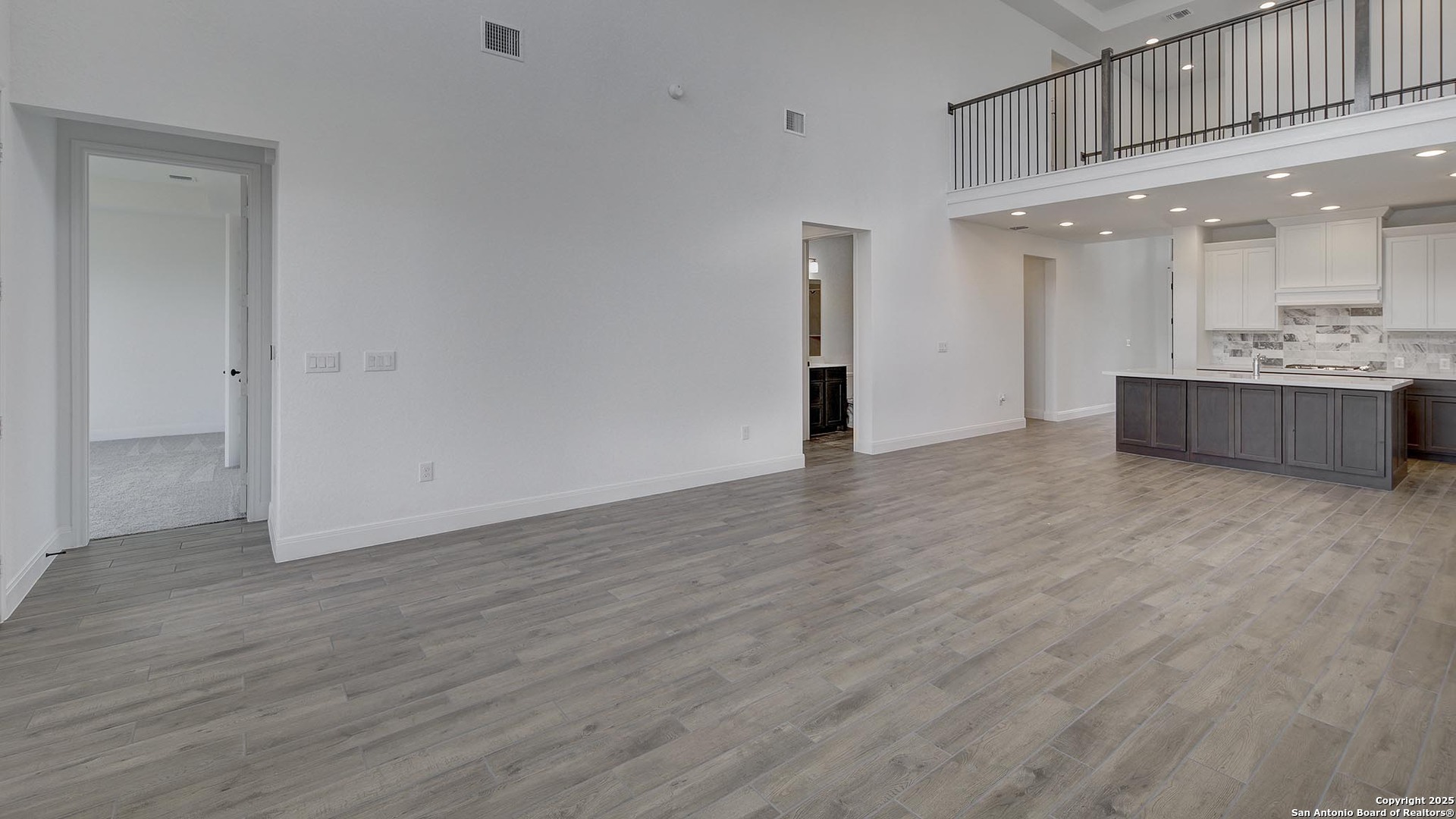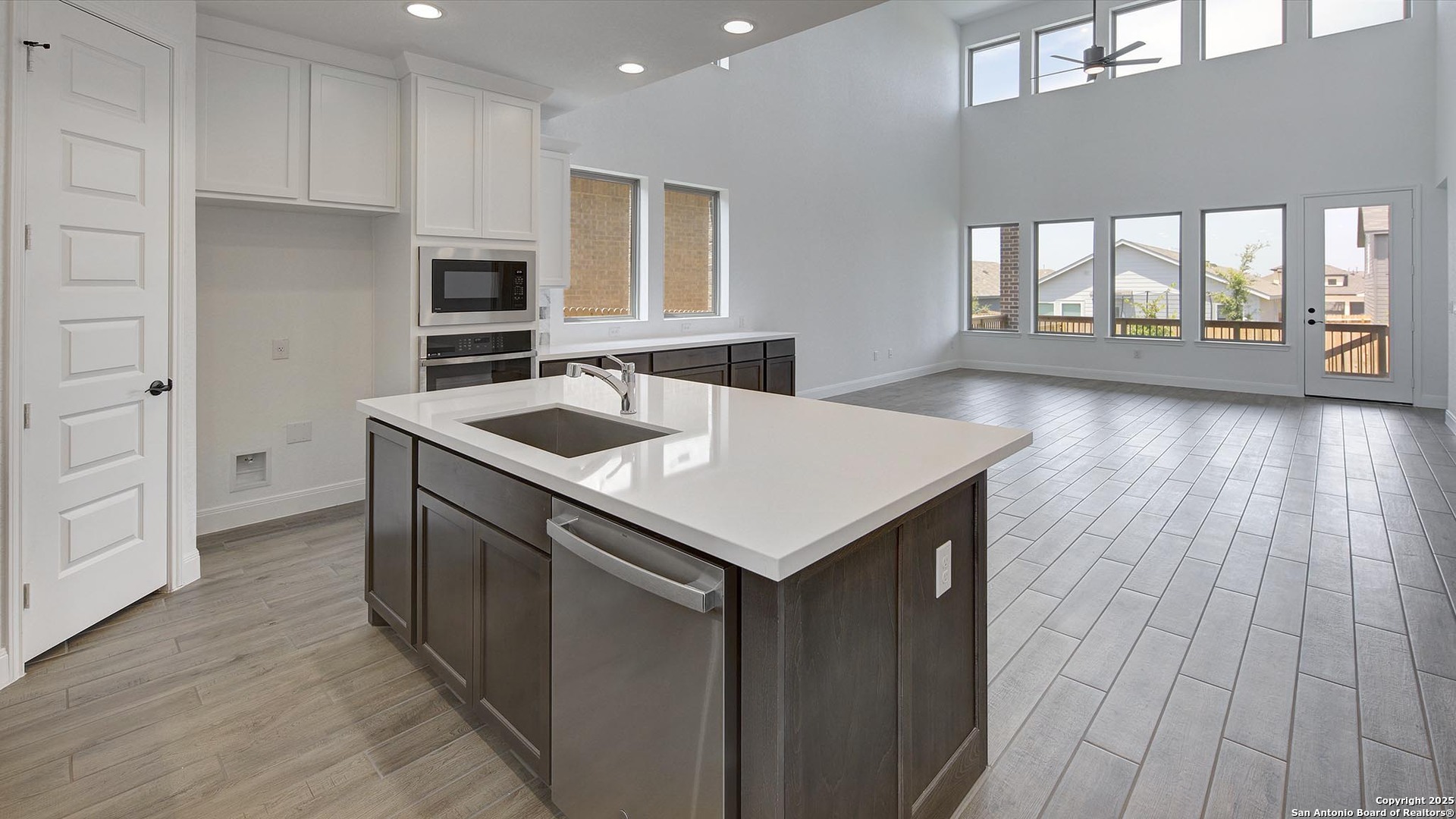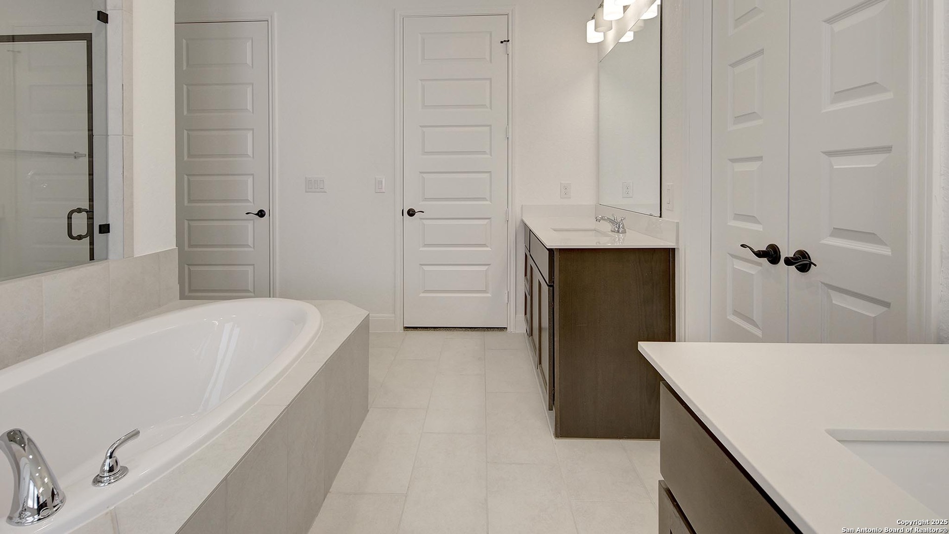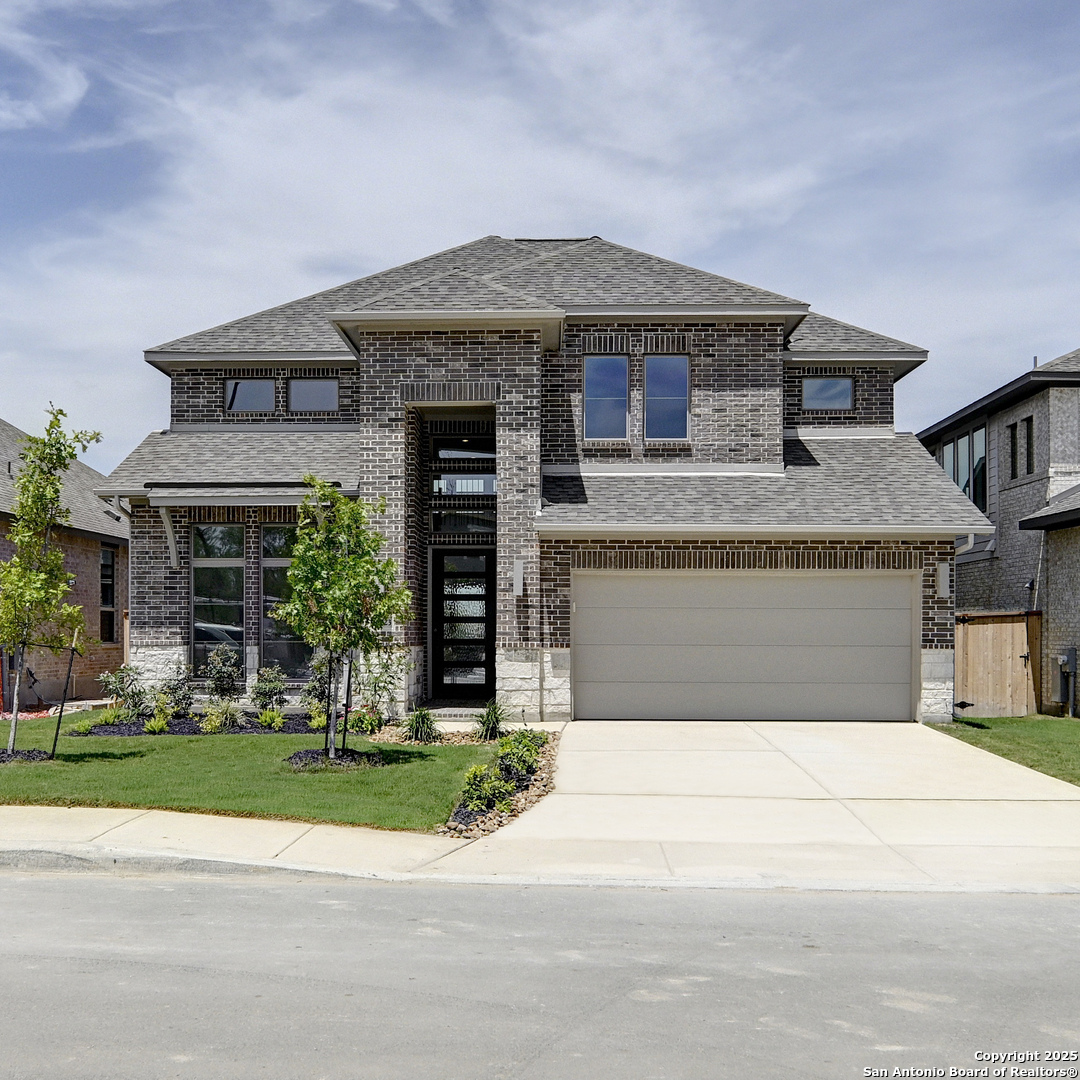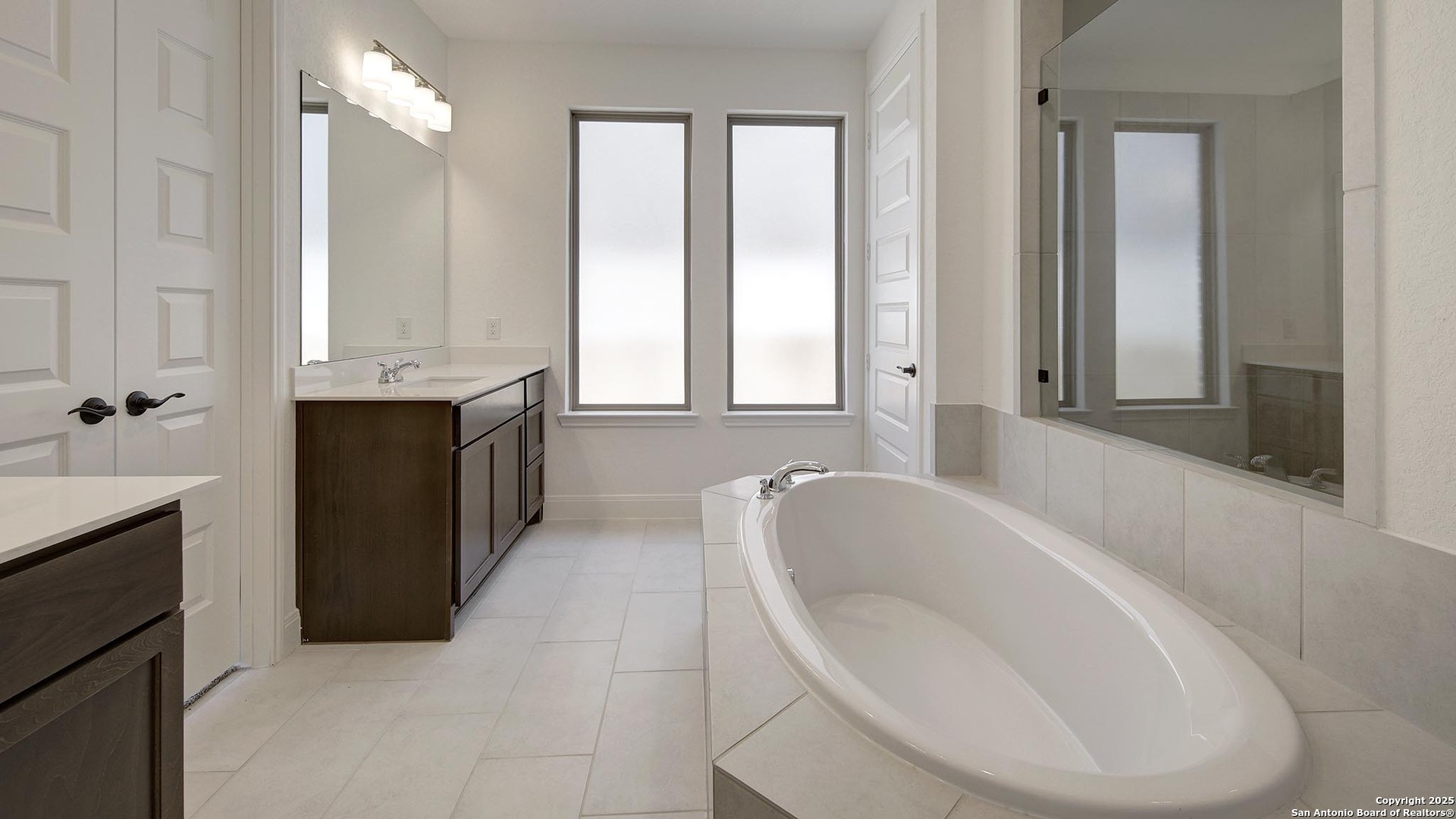 Home office with French doors frame the entry with 19-foot ceilings. Island kitchen offers built-in seating space and a corner walk-in pantry. Spacious family room with 19-foot ceilings and a wall of windows. Primary suite hosts a bedroom with three large windows, French door entry to primary bathroom with dual vanities, garden tub, separate glass enclosed shower and two-walk-in closets. Additional bedrooms with a walk-in closet on first level. Second level hosts a large game room, bathroom with dual sinks and secondary bedrooms. Utility room. Covered backyard patio with a 5-zone sprinkler system. Mud room just off the two-car garage.
