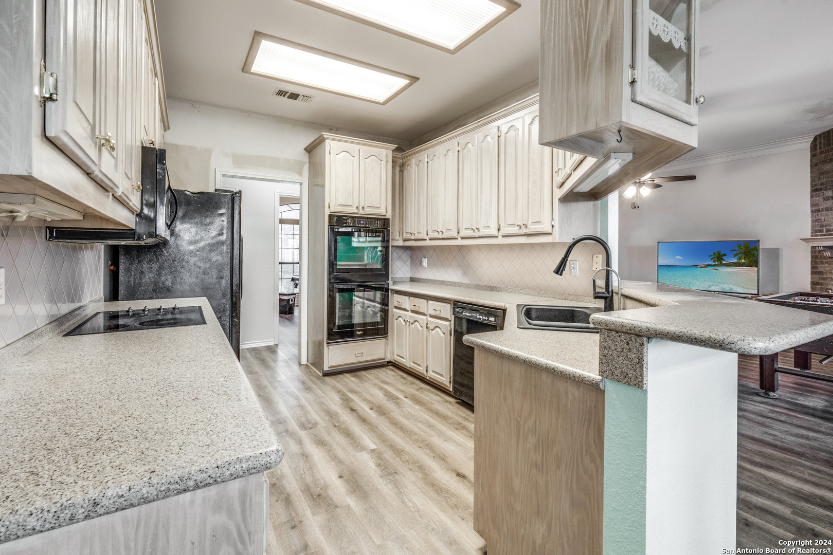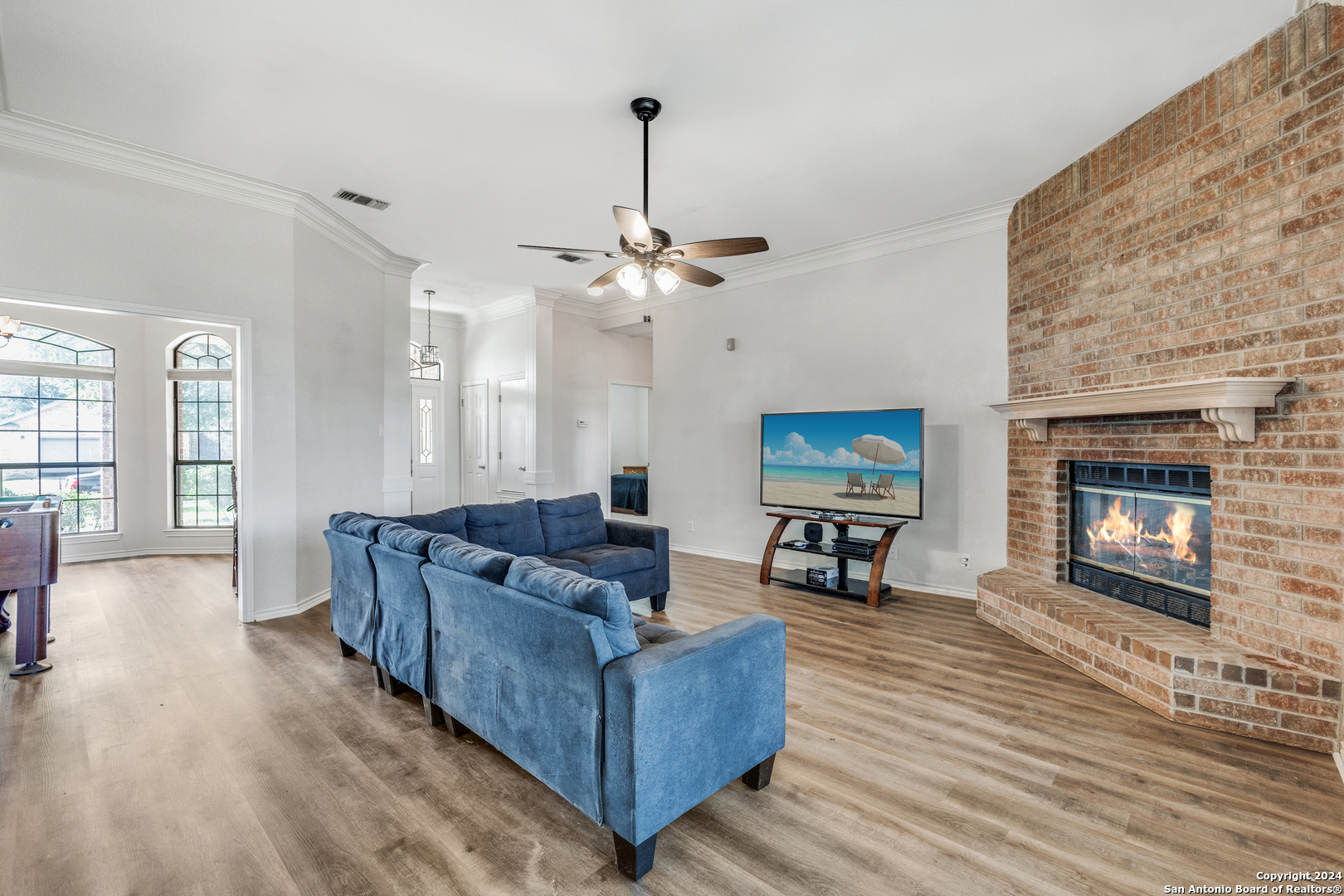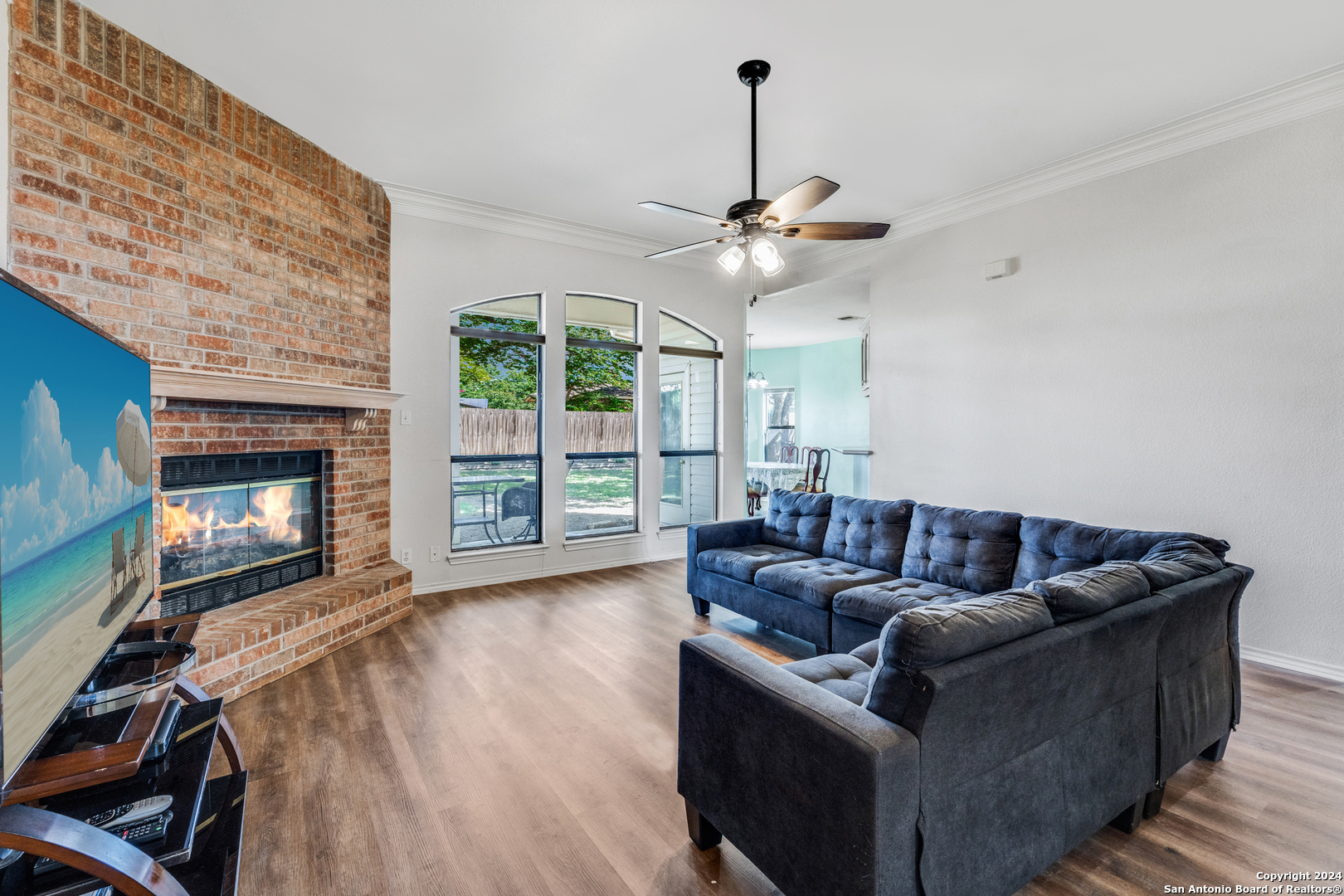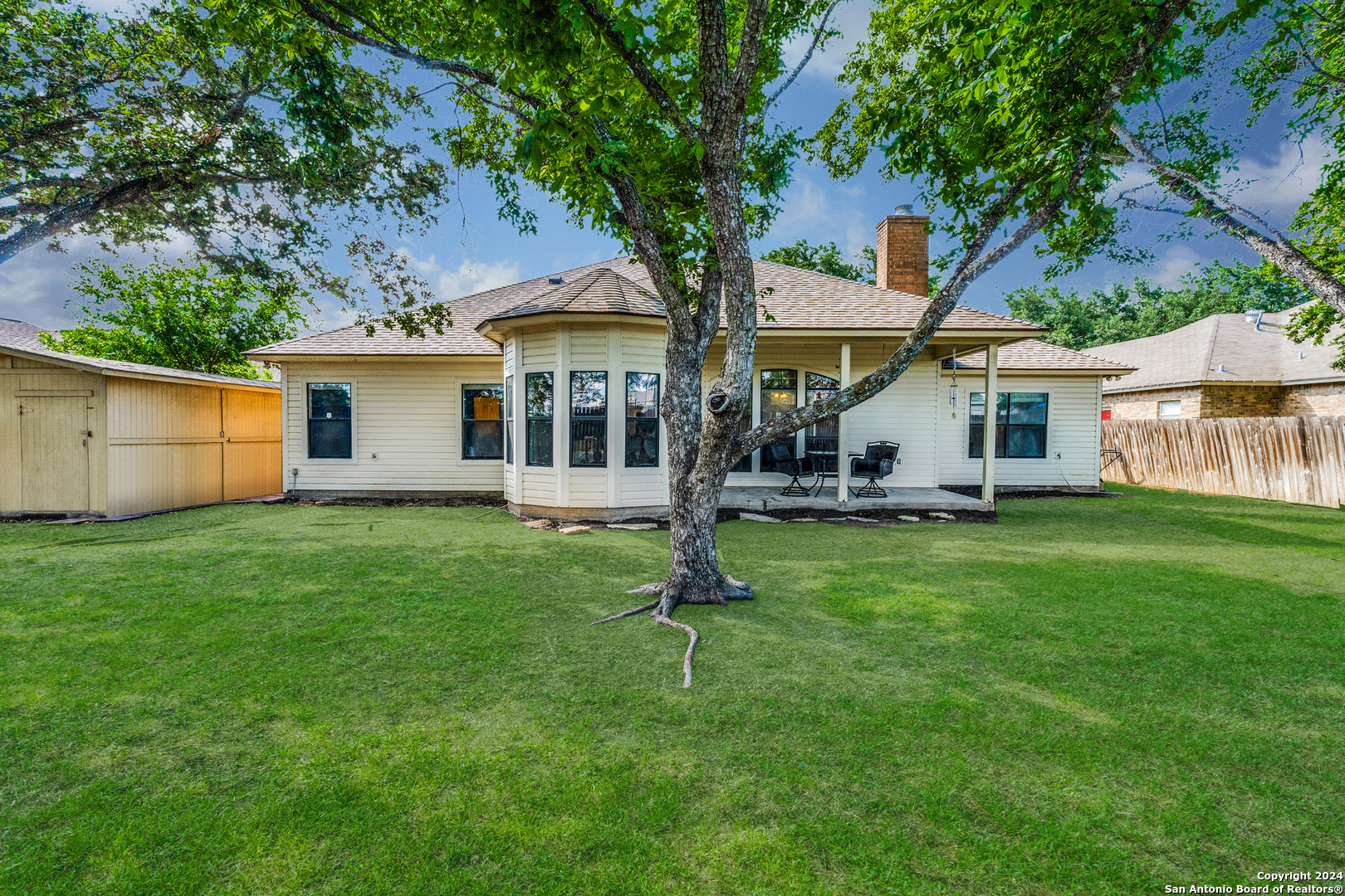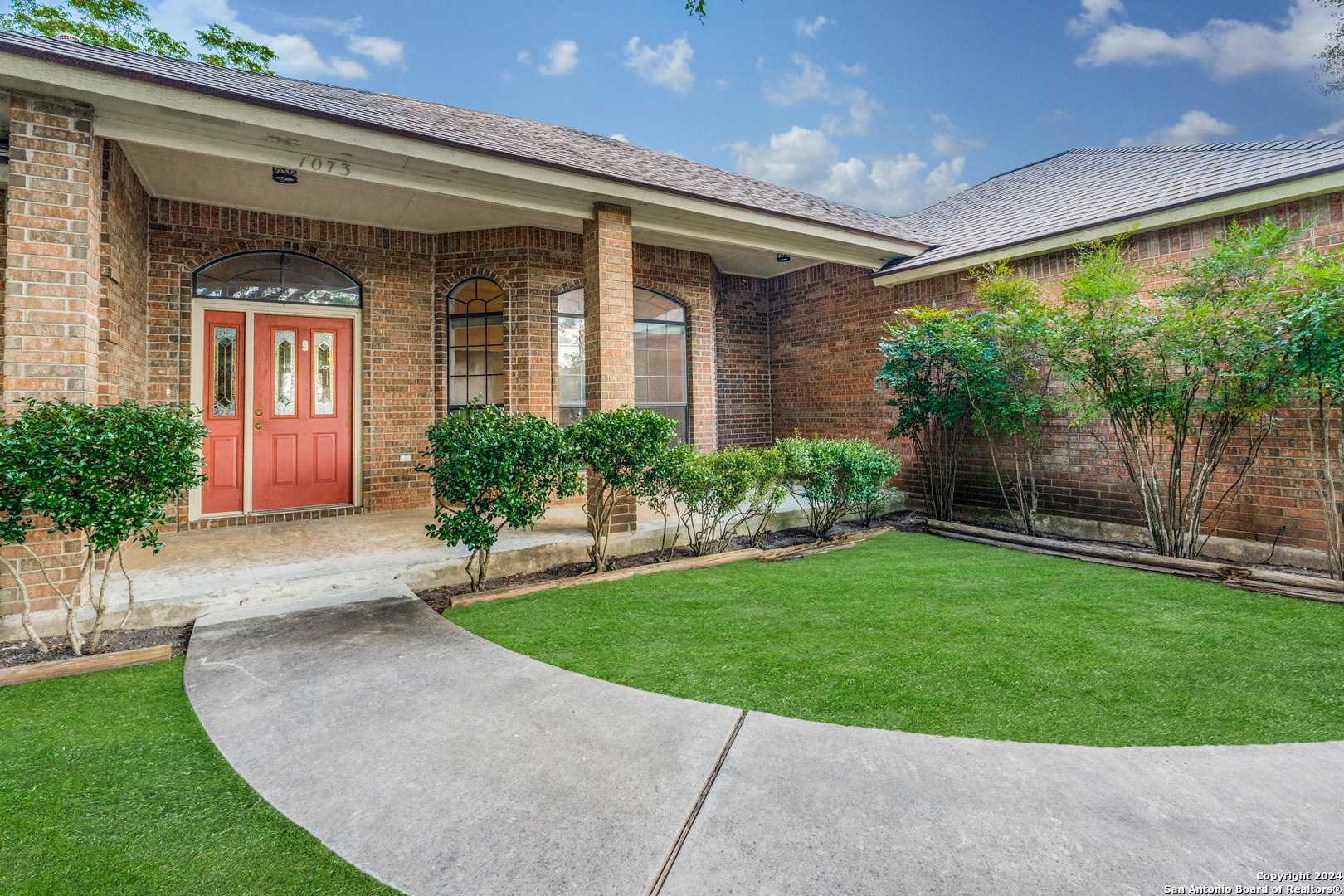 VA ASSUMABLE RATE of 3.375%. Charming Rolling Valley home just hit the market in New Braunfels! Nestled on an oversized 1/4 acre lot, this home is ideally located just minutes from shops, restaurants, and parks. It features 3 bedrooms, 2 bathrooms, and a spacious 1,948 sq ft of living space. Enter through a gracious southern porch into an elegant foyer that leads to a sunlit home brimming with unique touches rarely found in newer homes. Enjoy large bay windows, crown molding, multi-tiered and vaulted ceilings, and a stunning floor-to-ceiling brick fireplace with gas. Modern touches like stunning new wood vinyl flooring blend seamlessly with the home's character, offering an opportunity for personalized cosmetic finishes. The eat-in kitchen is a chef's dream with double ovens, durable solid Corian counters, a walk-in pantry, a dual-bowl Silgranite sink with built-in water filtration, and abundant counter and cabinet space. This split floor plan includes a breakfast nook and a dining room, providing flexibility for a home office or gym if both eating areas are not needed. The primary bedroom features dual walk-in closets and a spa-like bathroom with dual vanities and an oversized shower. On the opposite side of the home, you'll find a hallway with two large secondary bedrooms and a bathroom, both with new lush carpet. Enjoy summer entertaining on your covered back patio or greet neighbors from a rocking chair on your front porch. The property boasts mature trees, a fully fenced yard, and a convenient outdoor shed. Located on an established street in the highly-coveted New Braunfels ISD, this home is zoned for Memorial ES (within walking distance!), New Braunfels MS, and New Braunfels HS. This gem won't last long. Call your favorite agent today to schedule a viewing!