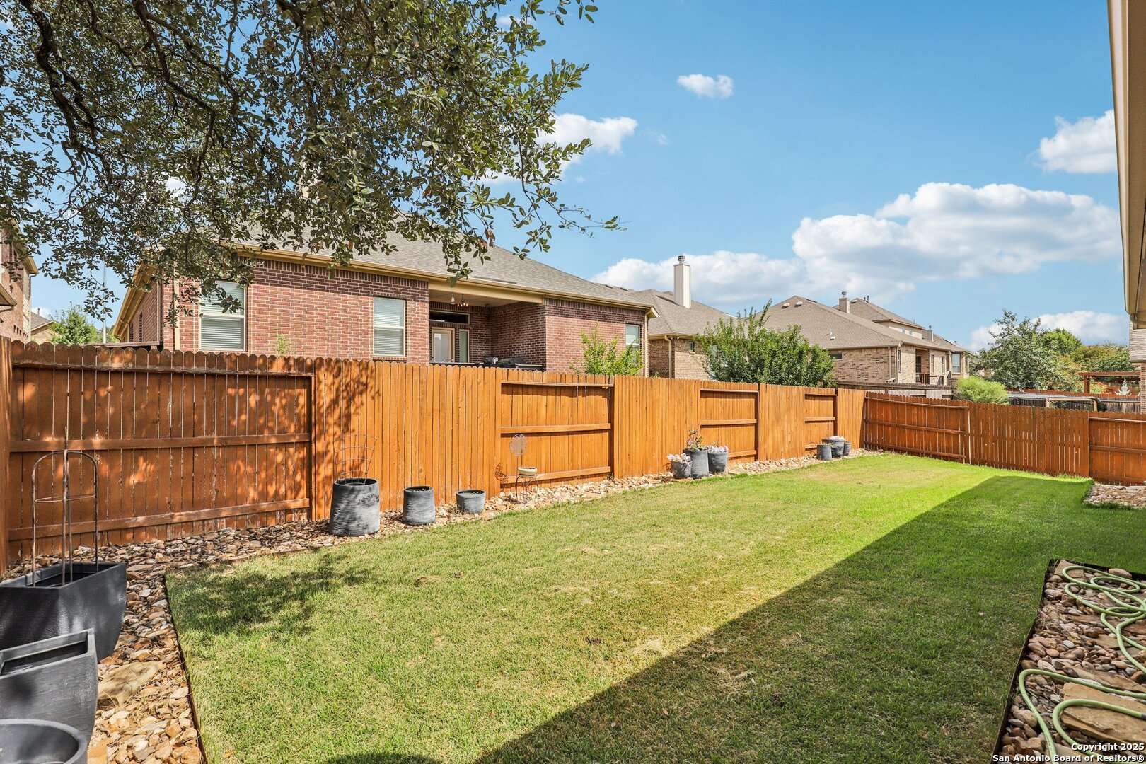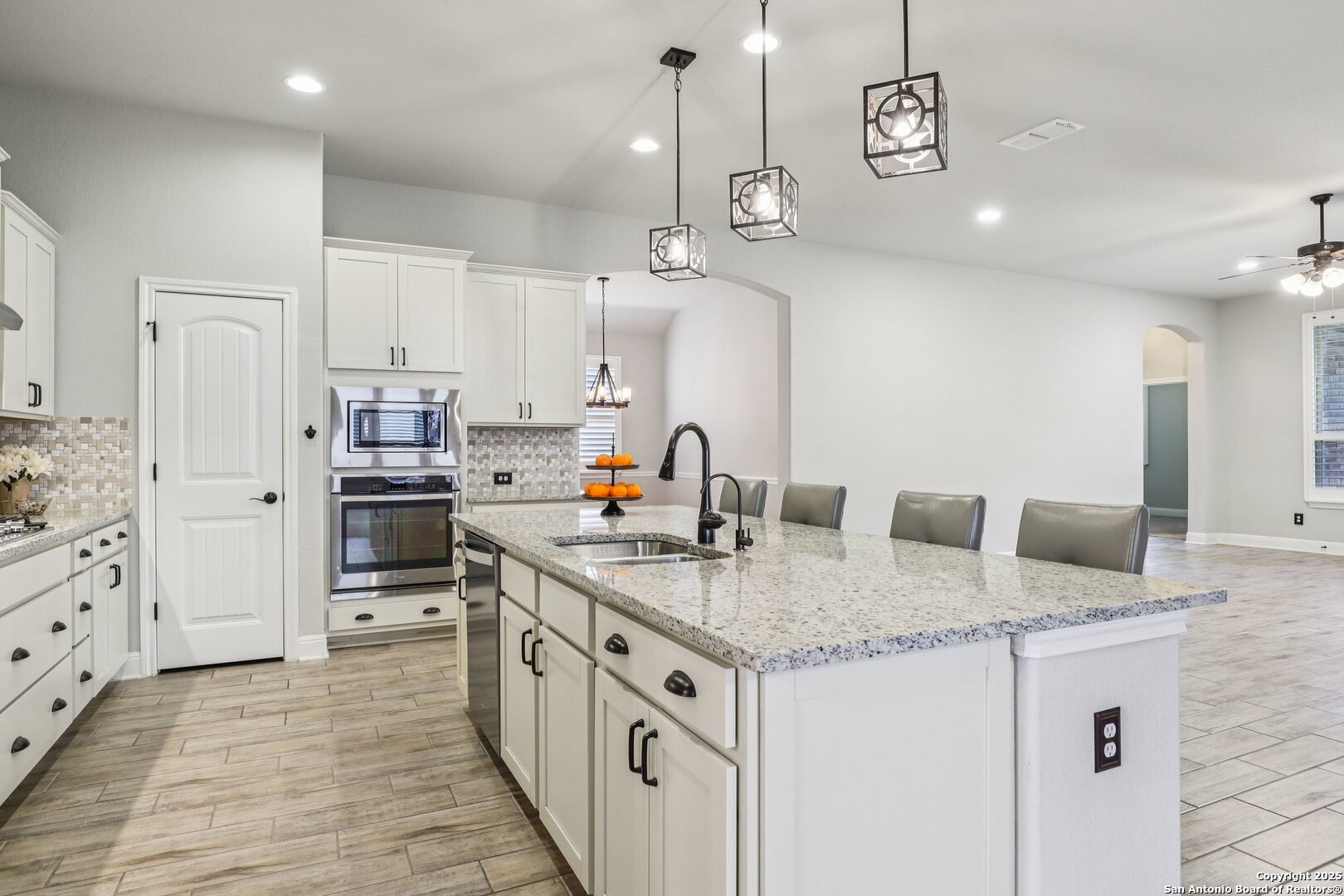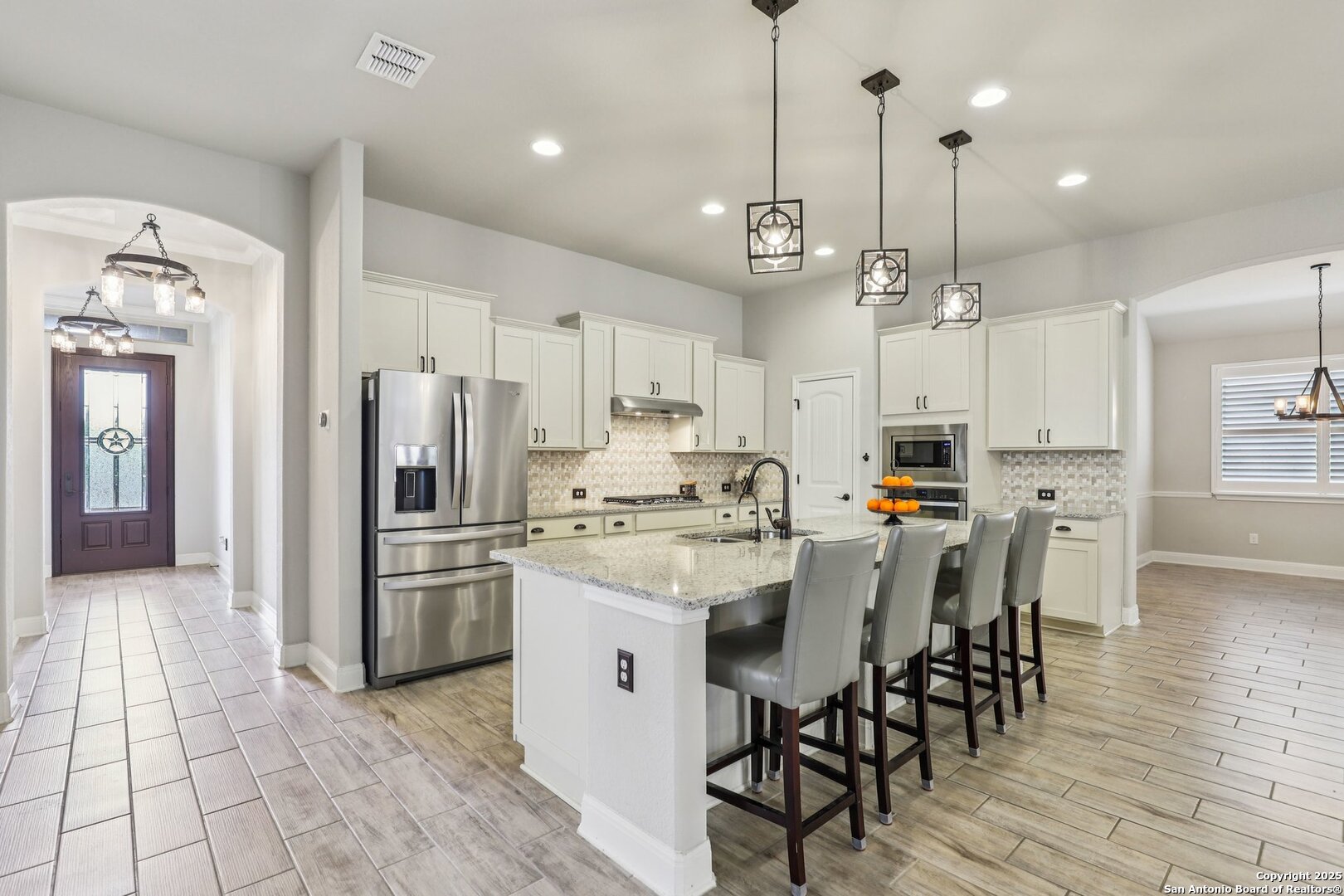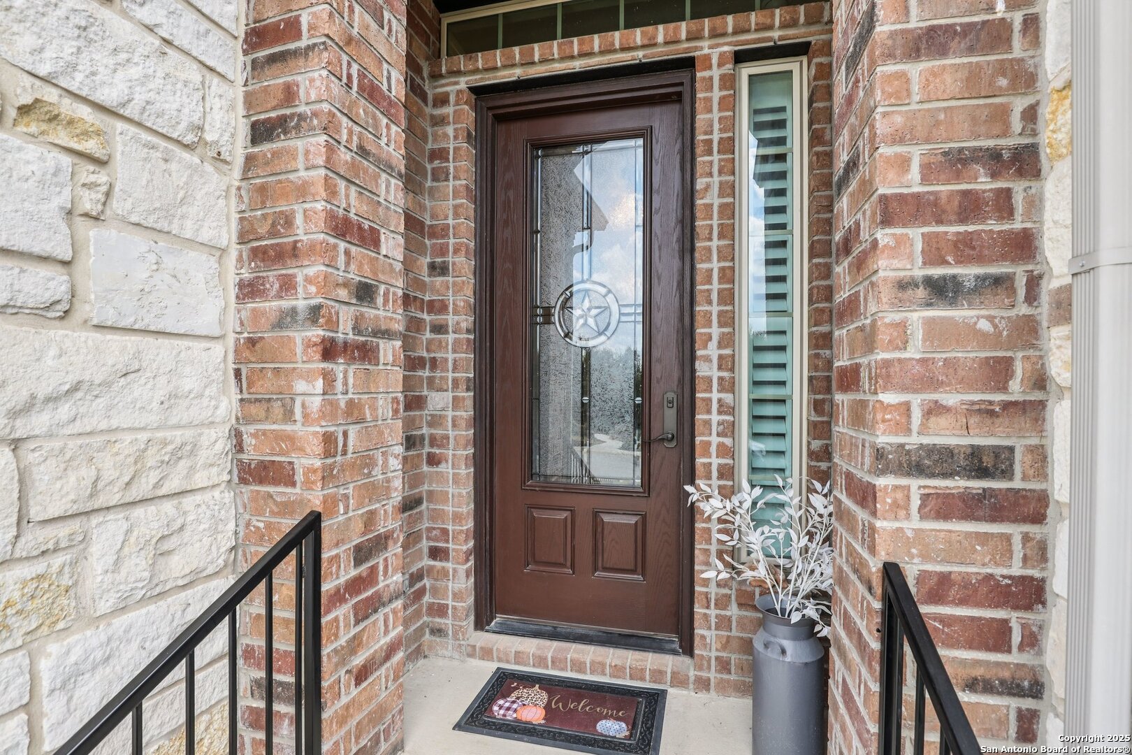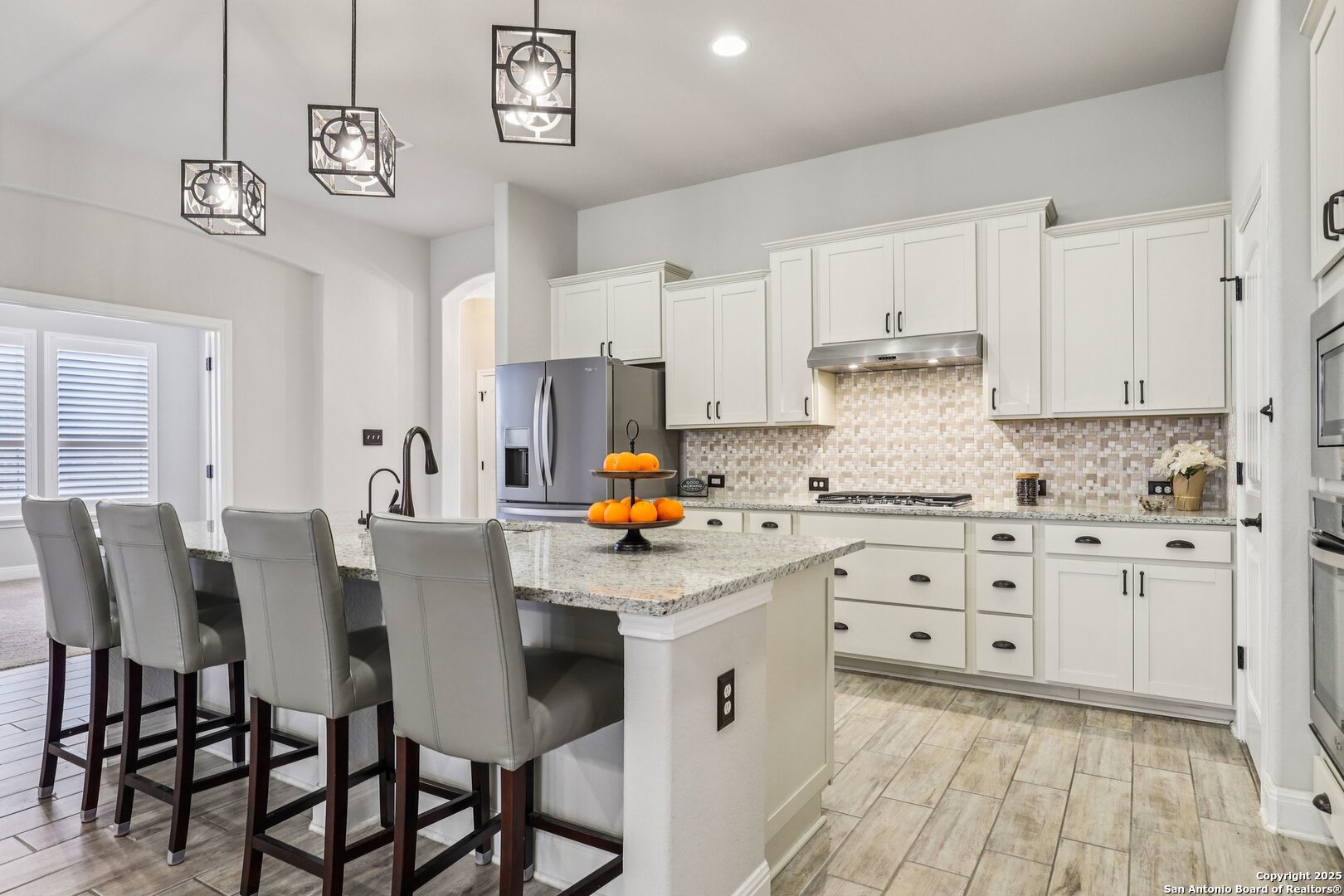 Discover the perfect blend of elegance and functionality in this stunning one-story residence, designed for both relaxation and entertaining. As you step through the inviting etched glass front door featuring a Texas Star, you'll be greeted by a warm foyer with exquisite hand-laid ceramic tiles that resemble rich hardwood flooring. The spacious open floor plan effortlessly guides you from a sophisticated study to a gourmet kitchen that will delight any chef. With gorgeous granite countertops, a high-end gas cooktop, and a striking island highlighted by Texas Star pendants, this kitchen is a culinary masterpiece. The breakfast bar flows seamlessly into a charming family room, complete with a fireplace and custom built-ins, creating the ideal space for unforgettable gatherings. An elegant formal dining room awaits, ready to host all your celebrations and family dinners. Retreat to your private primary suite, a true sanctuary featuring a luxurious en-suite bath with dual vanities, his and hers closets, a relaxing garden tub, and an oversized shower designed for ultimate serenity. Two additional well-appointed bedrooms and a spacious hall bath provide comfort for family and guests. Plus, the dedicated media room is perfect for cozy movie nights and entertainment! Step outside to your expansive covered patio and beautifully landscaped backyard-a true outdoor oasis for summer barbecues and peaceful afternoons in the fresh air. Don't forget the spacious three-car garage for all your storage and parking needs! Nestled in a friendly neighborhood with fantastic amenities, including a charming park and playground, this exceptional home perfectly combines classic Texas charm with modern conveniences. Discover the extraordinary features this Hill Country gem has to offer!