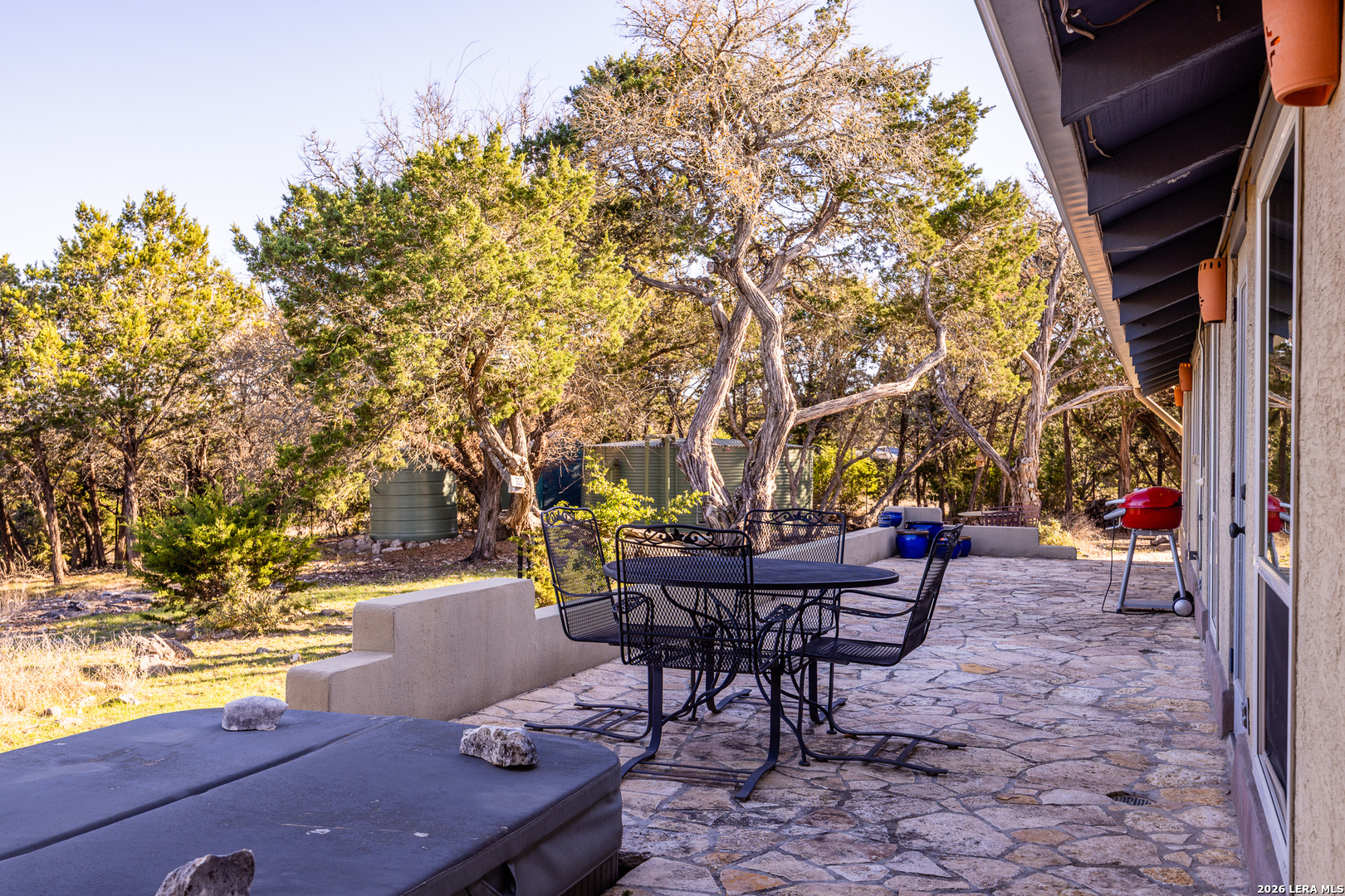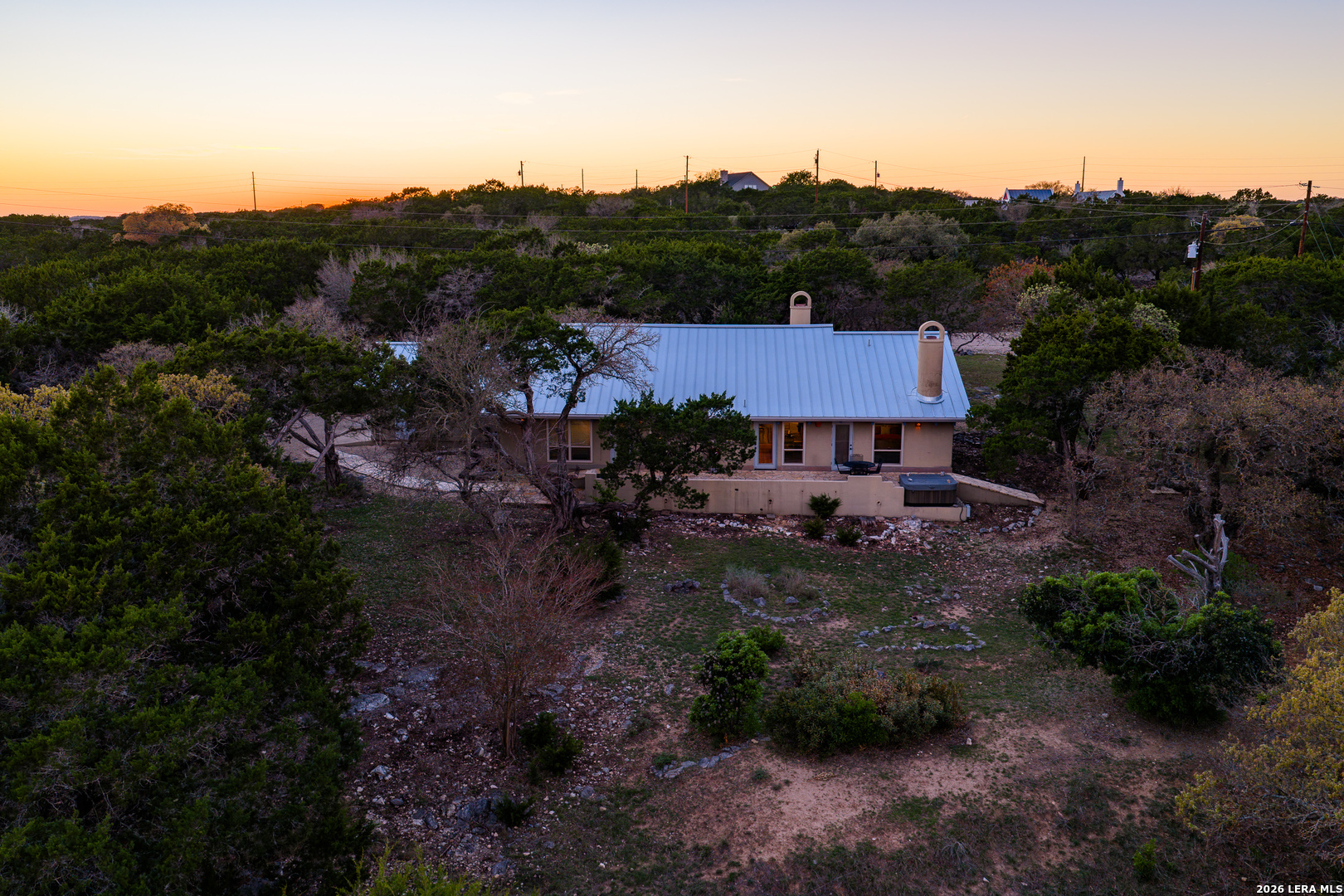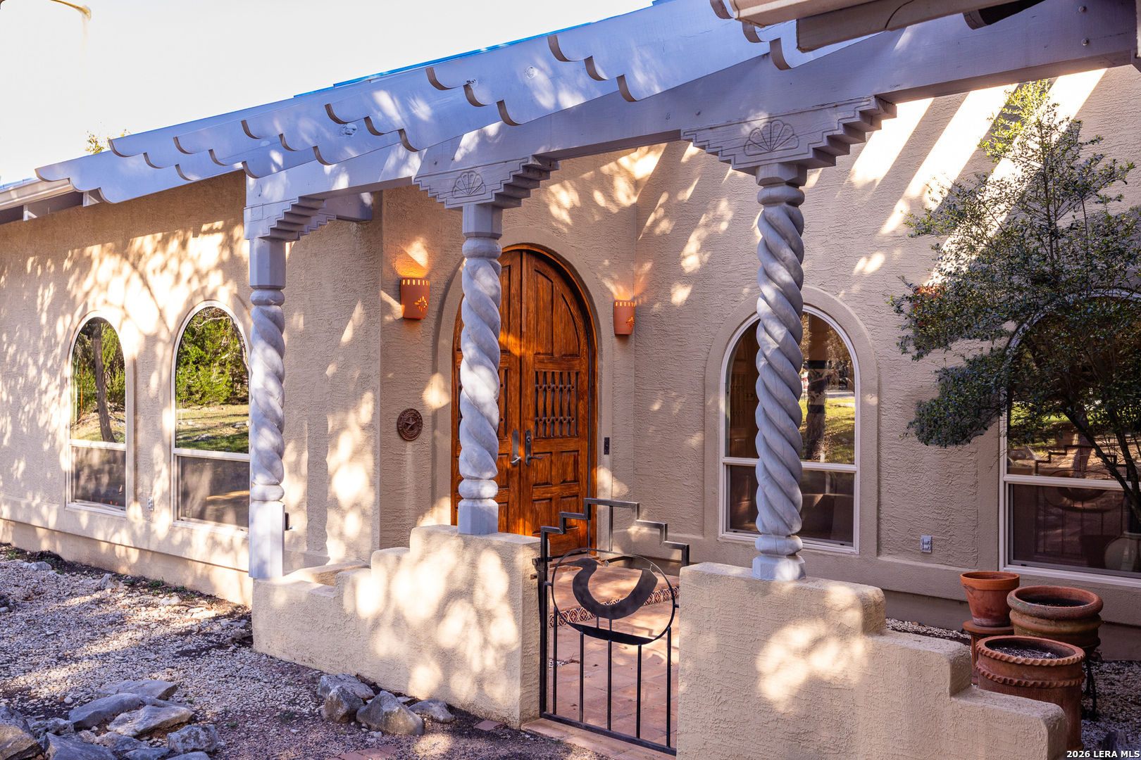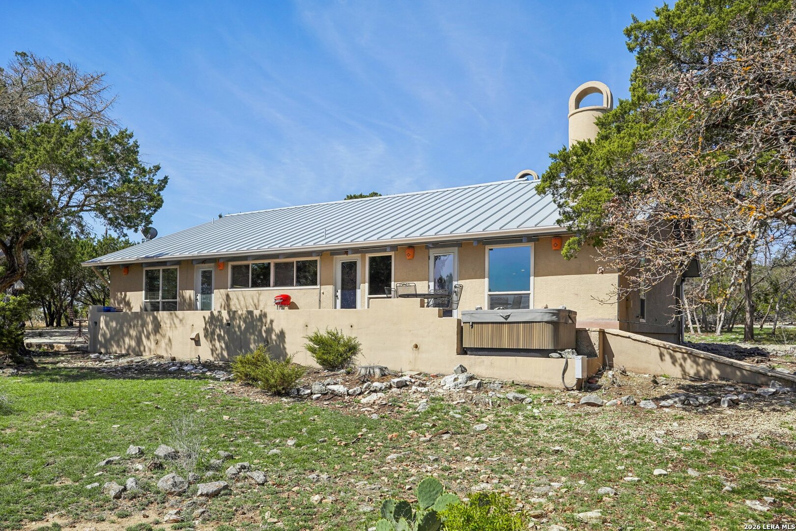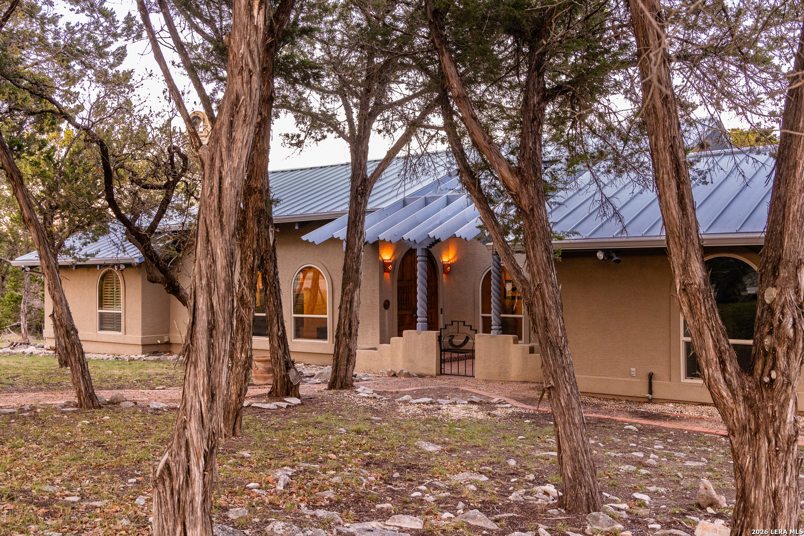 Set on 9.73 acres in Canyon Springs Ranch with extraordinary long-range Hill Country views and private Guadalupe River park access, this 1,892-sqft single-story home showcases Southwest and Santa Fe-inspired architecture with timeless character. The stucco exterior, standing-seam metal roof, flagstone patios, and side-entry two-car garage create classic curb appeal, while the expansive patio is perfectly positioned to capture the scenery. Inside, the open kitchen, living, and dining area features vaulted ceilings, Saltillo tile floors, a traditional kiva fireplace, and abundant windows framing the views. The split-bedroom layout lives like two primary suites, with the main suite offering two walk-in closets and nearby laundry. Artistic details include a hand-carved wood entry door and Talavera tile accents. Water is supplied by a rainwater harvesting system. The property includes 1.83 acres within Canyon Springs Ranch and ~7.9 acres that are minimally restricted, and sits adjacent to the community's 94-acre Wilderness Park.