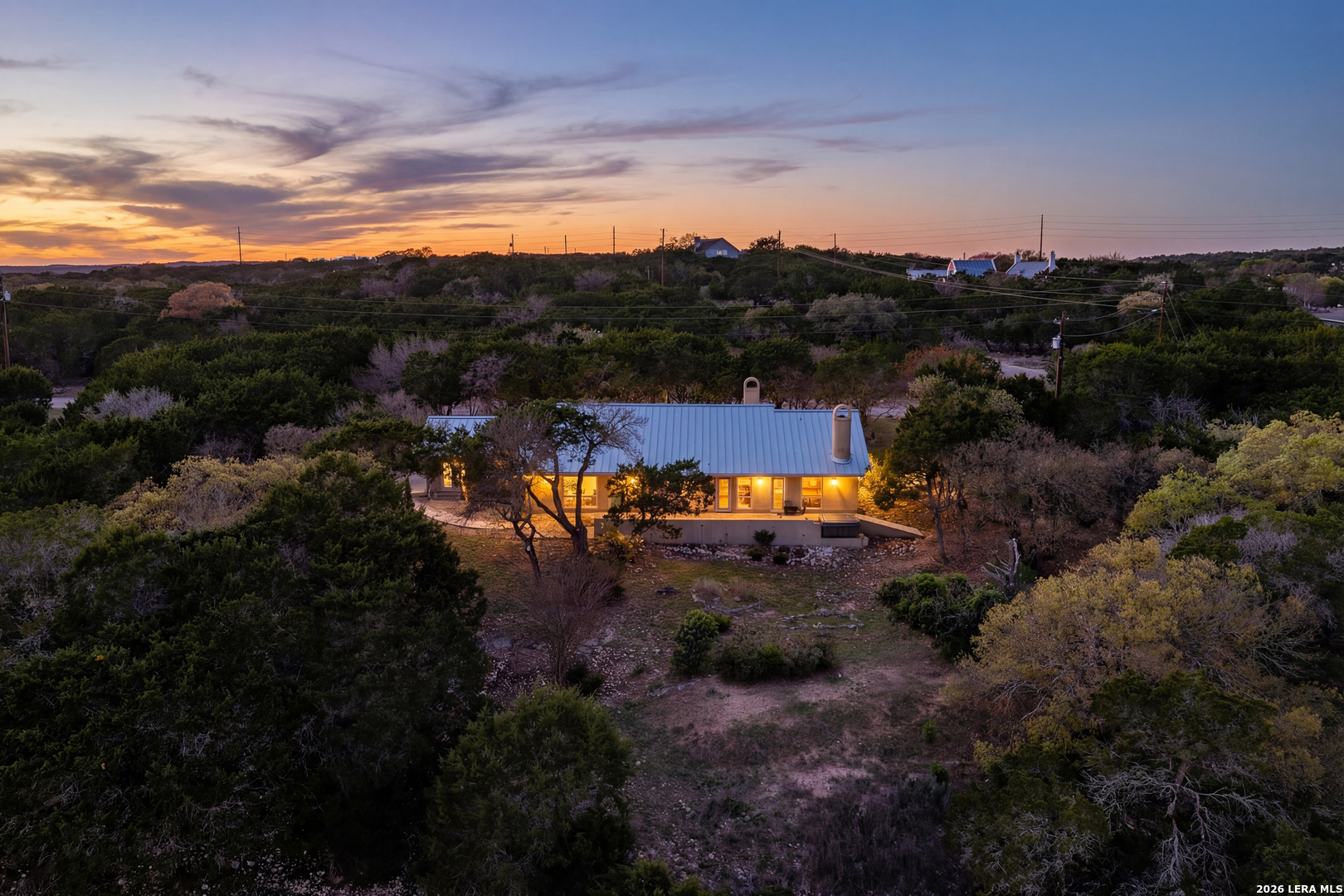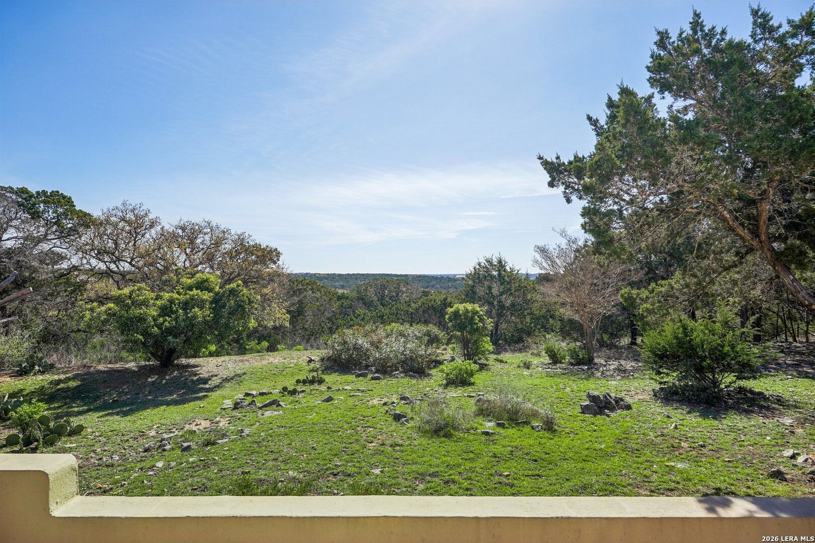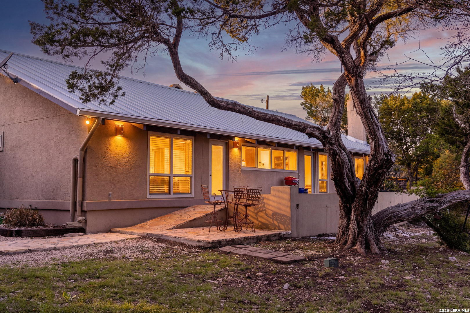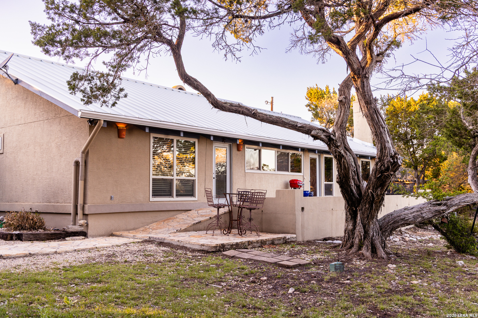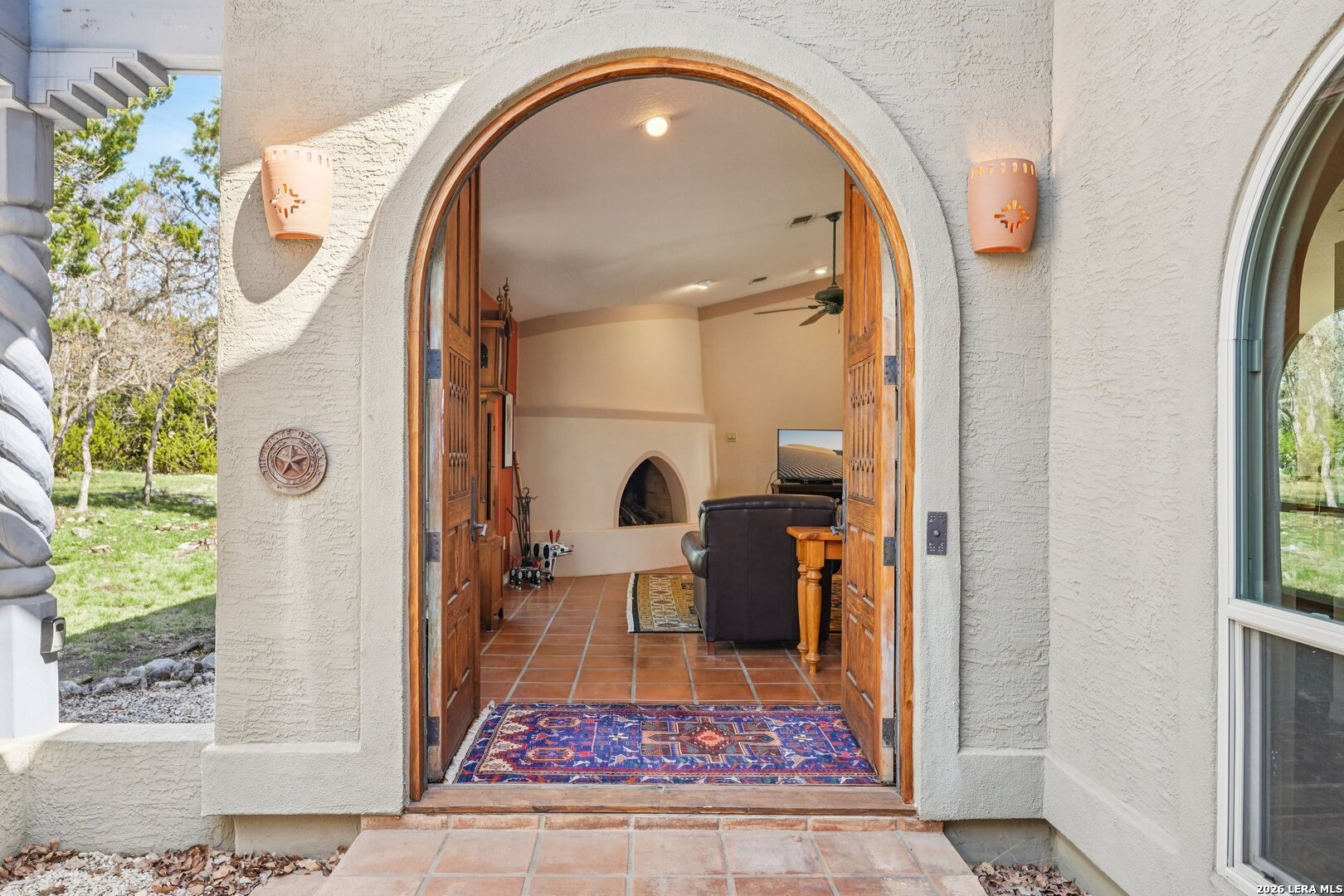 Set on 9.73 acres in Canyon Springs Ranch with extraordinary long-range Hill Country views and private Guadalupe River park access, this 1,892-sqft single-story home showcases Southwest and Santa Fe-inspired architecture with timeless character. The stucco exterior, standing-seam metal roof, flagstone patios, and side-entry two-car garage create classic curb appeal, while the expansive patio is perfectly positioned to capture the scenery. Inside, the open kitchen, living, and dining area features vaulted ceilings, Saltillo tile floors, a traditional kiva fireplace, and abundant windows framing the views. The split-bedroom layout lives like two primary suites, with the main suite offering two walk-in closets and nearby laundry. Artistic details include a hand-carved wood entry door and Talavera tile accents. Water is supplied by a rainwater harvesting system. The property includes 1.83 acres within Canyon Springs Ranch and ~7.9 acres that are minimally restricted, and sits adjacent to the community's 94-acre Wilderness Park.