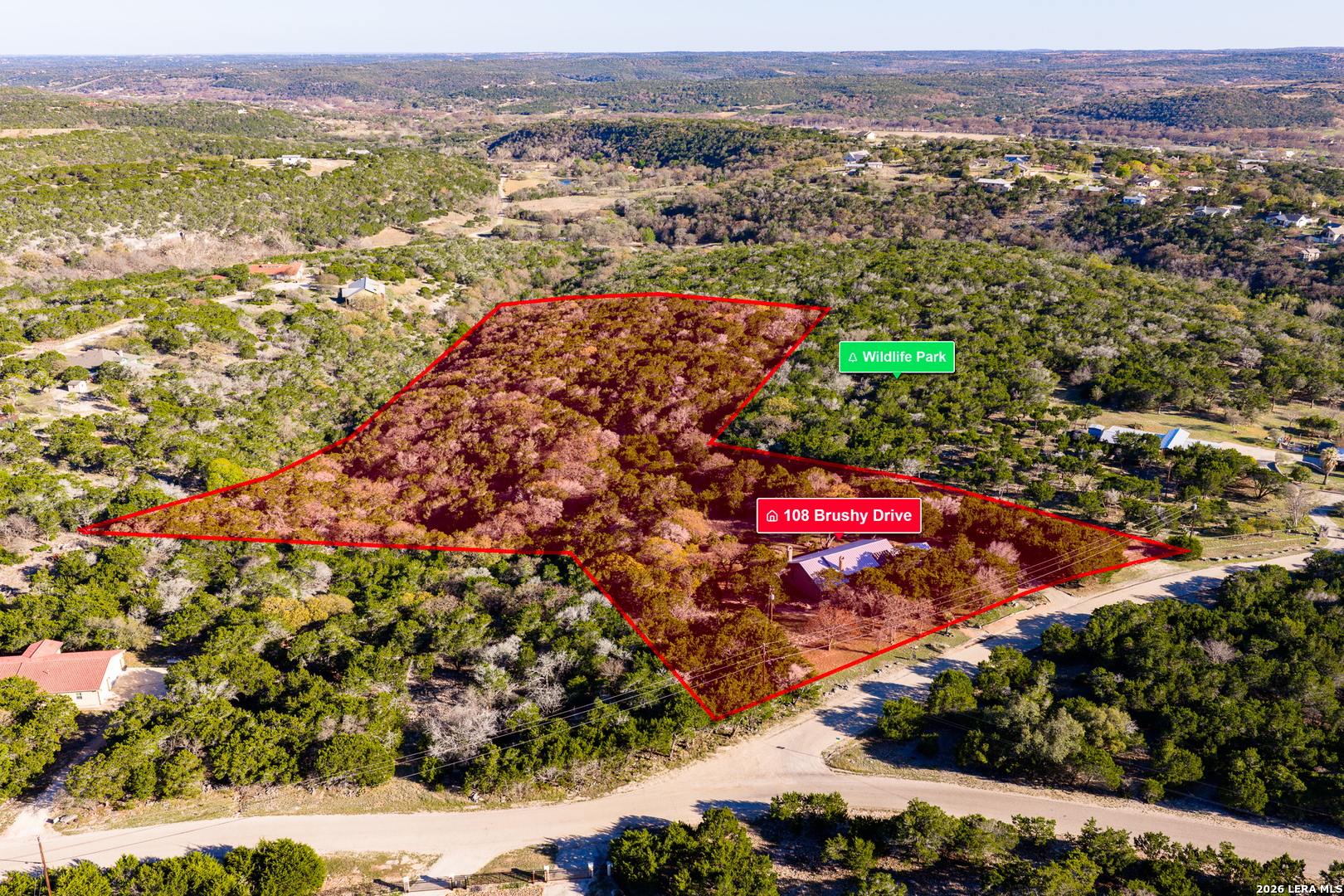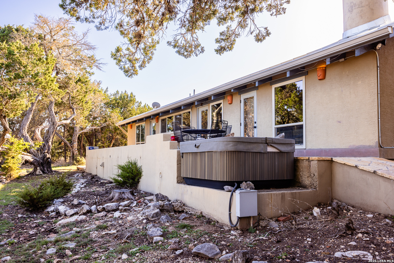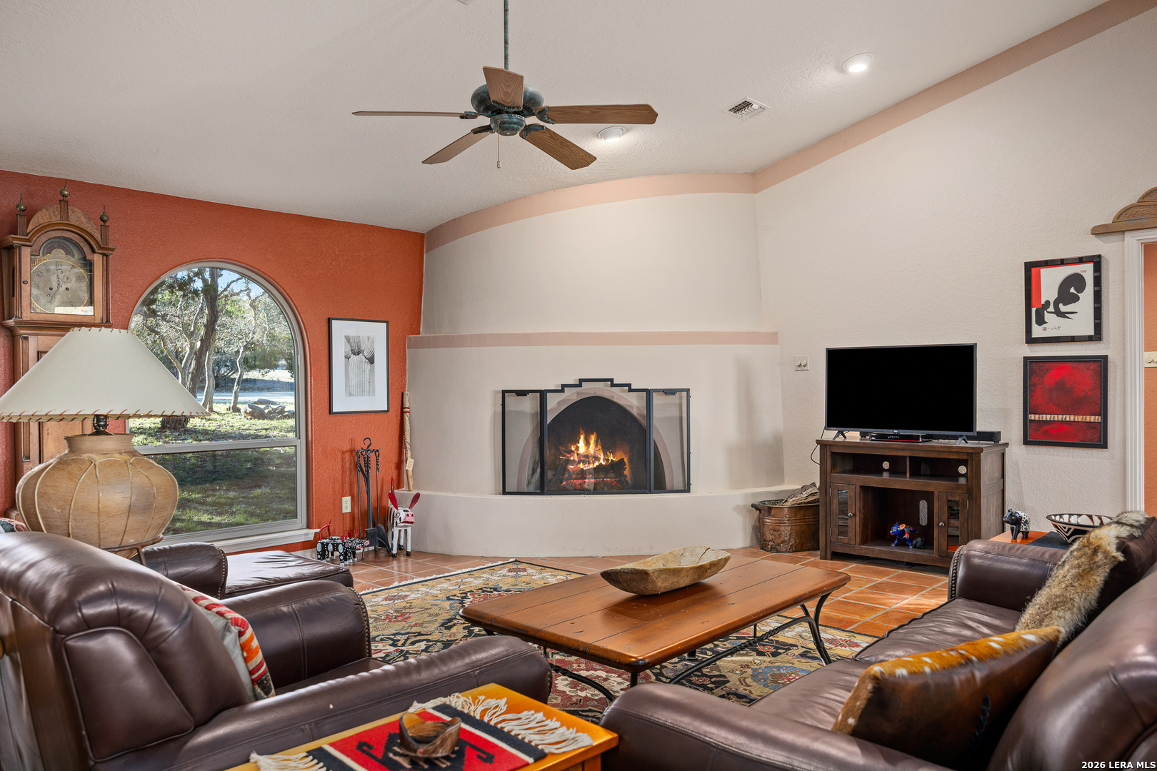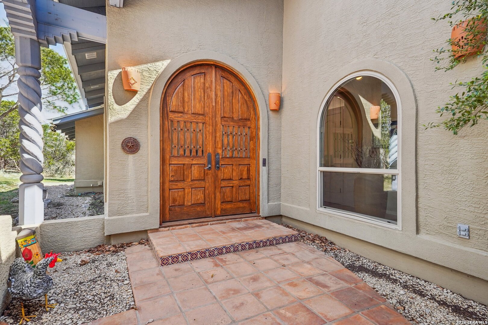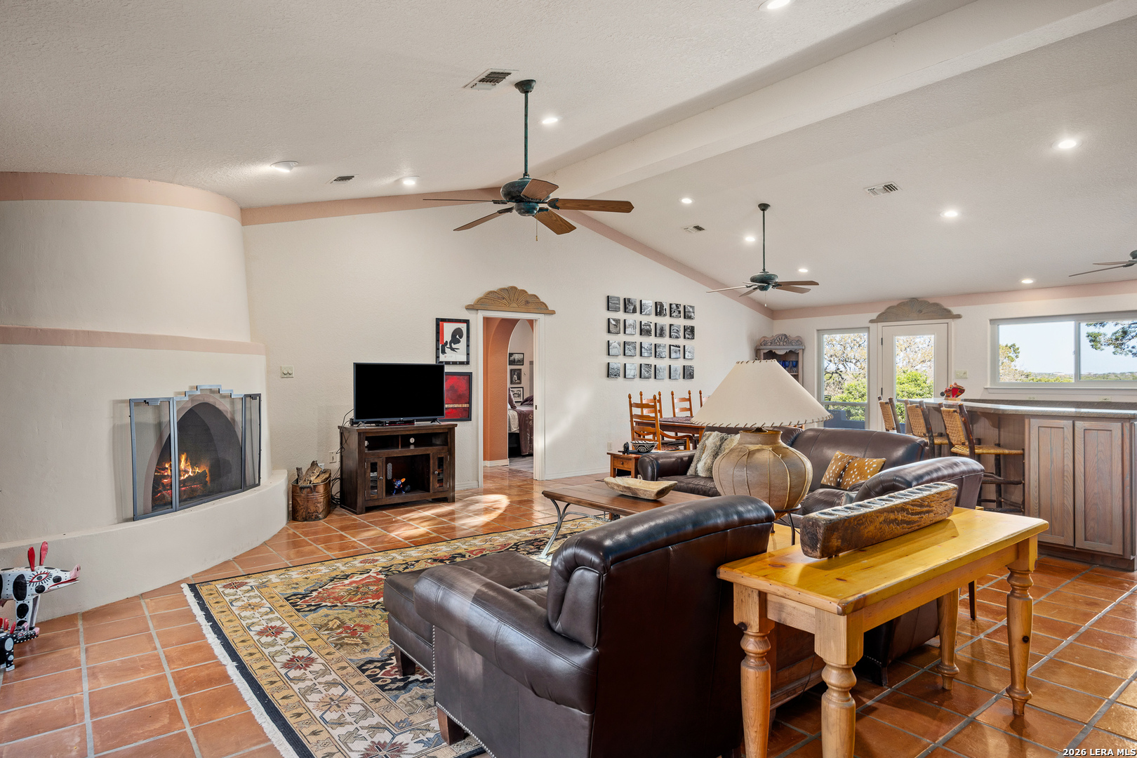 Set on 9.73 acres in Canyon Springs Ranch with extraordinary long-range Hill Country views and private Guadalupe River park access, this 1,892-sqft single-story home showcases Southwest and Santa Fe-inspired architecture with timeless character. The stucco exterior, standing-seam metal roof, flagstone patios, and side-entry two-car garage create classic curb appeal, while the expansive patio is perfectly positioned to capture the scenery. Inside, the open kitchen, living, and dining area features vaulted ceilings, Saltillo tile floors, a traditional kiva fireplace, and abundant windows framing the views. The split-bedroom layout lives like two primary suites, with the main suite offering two walk-in closets and nearby laundry. Artistic details include a hand-carved wood entry door and Talavera tile accents. Water is supplied by a rainwater harvesting system. The property includes 1.83 acres within Canyon Springs Ranch and ~7.9 acres that are minimally restricted, and sits adjacent to the community's 94-acre Wilderness Park.
