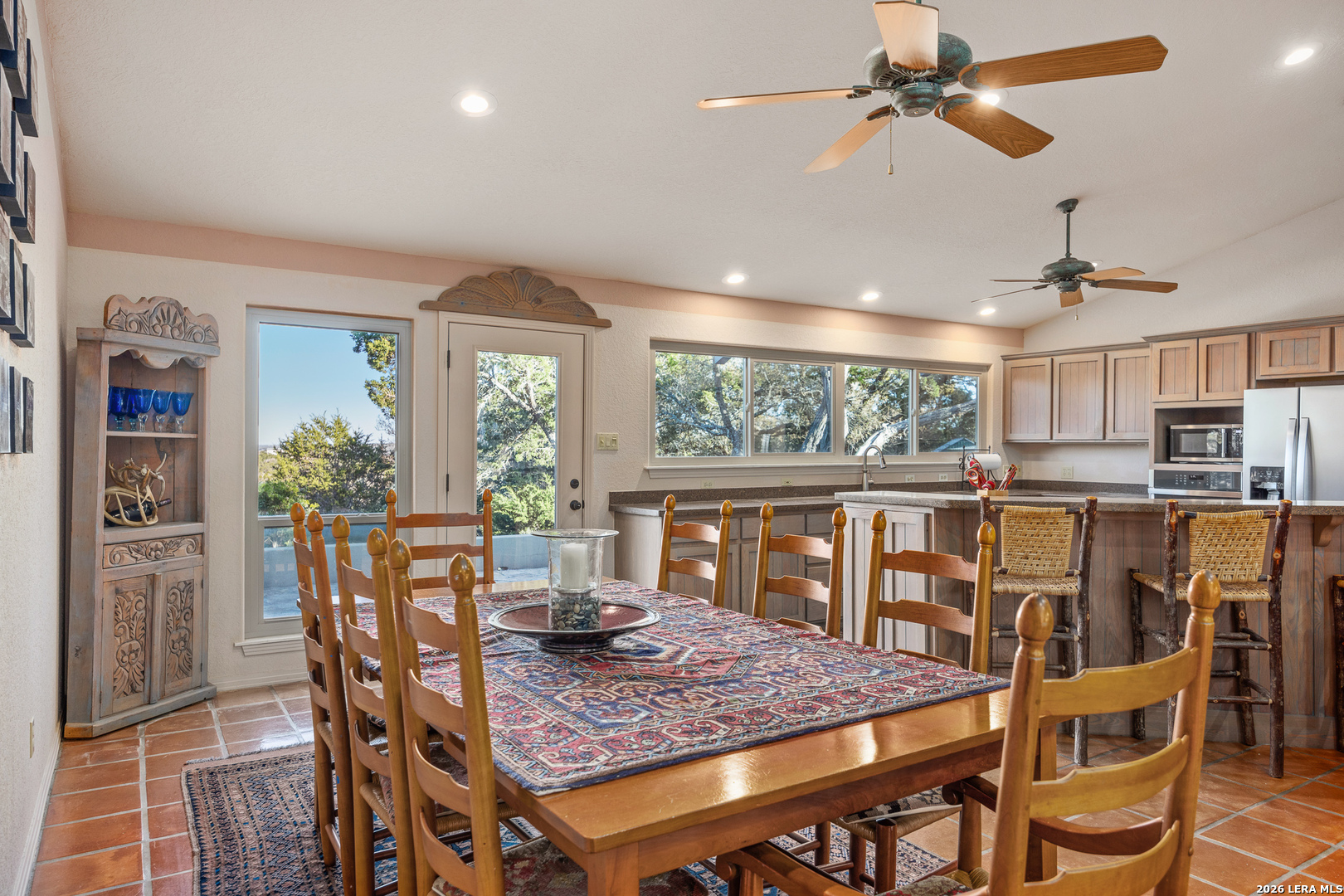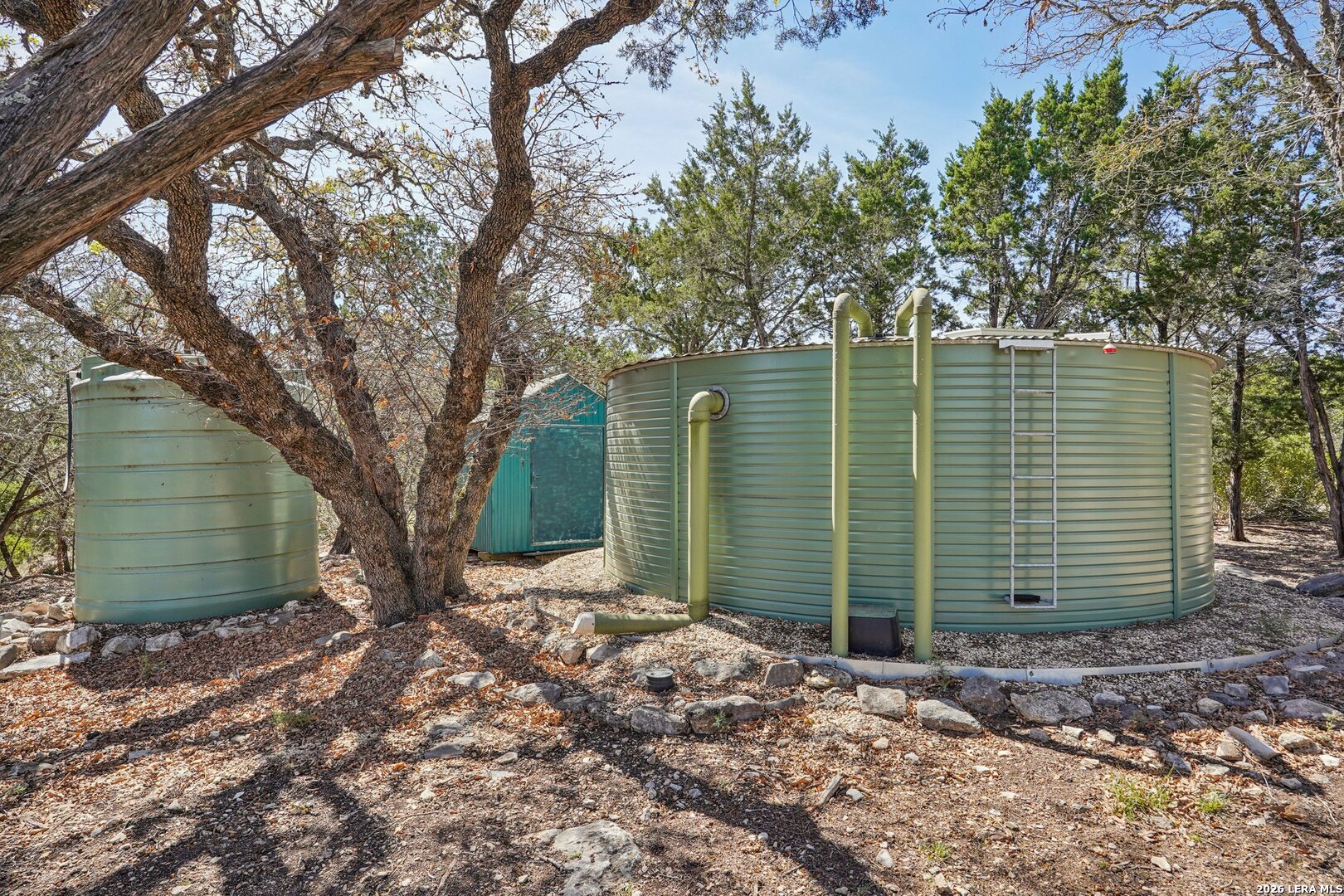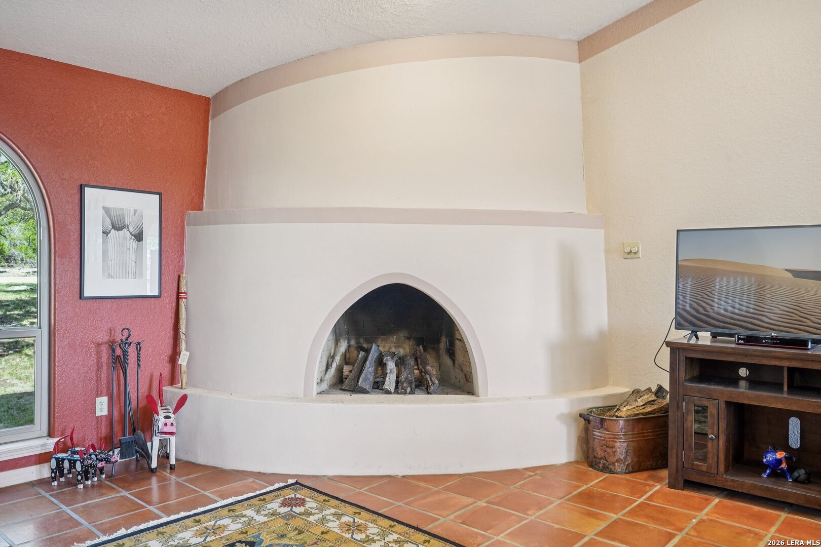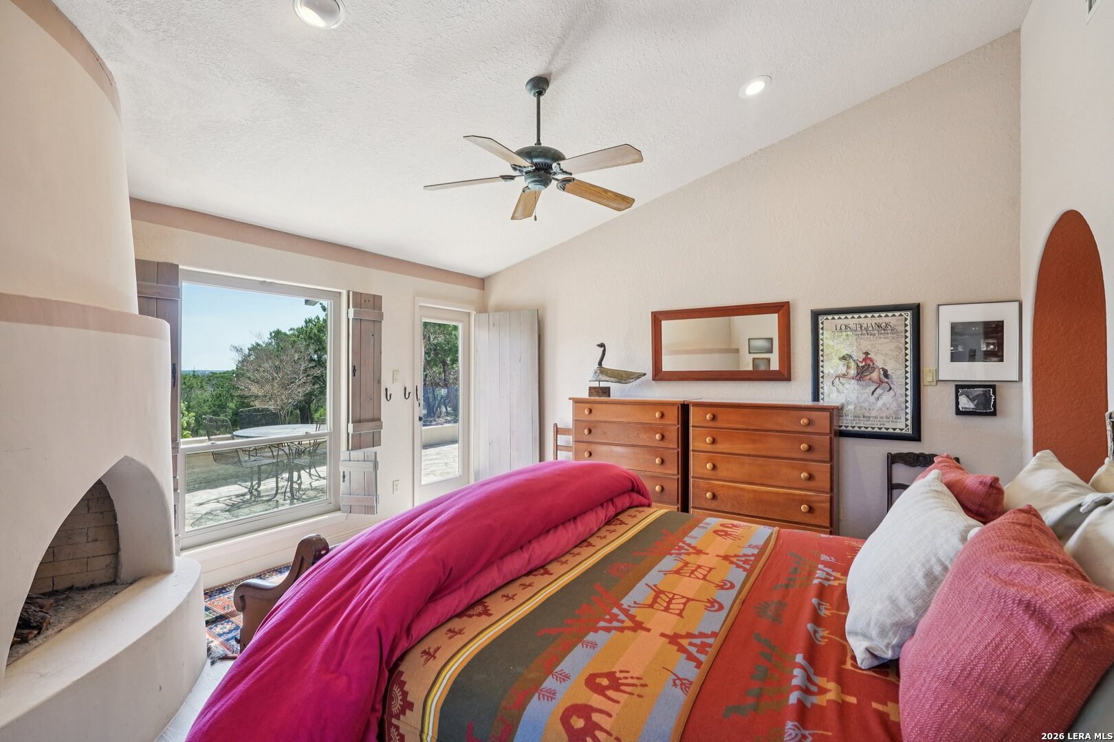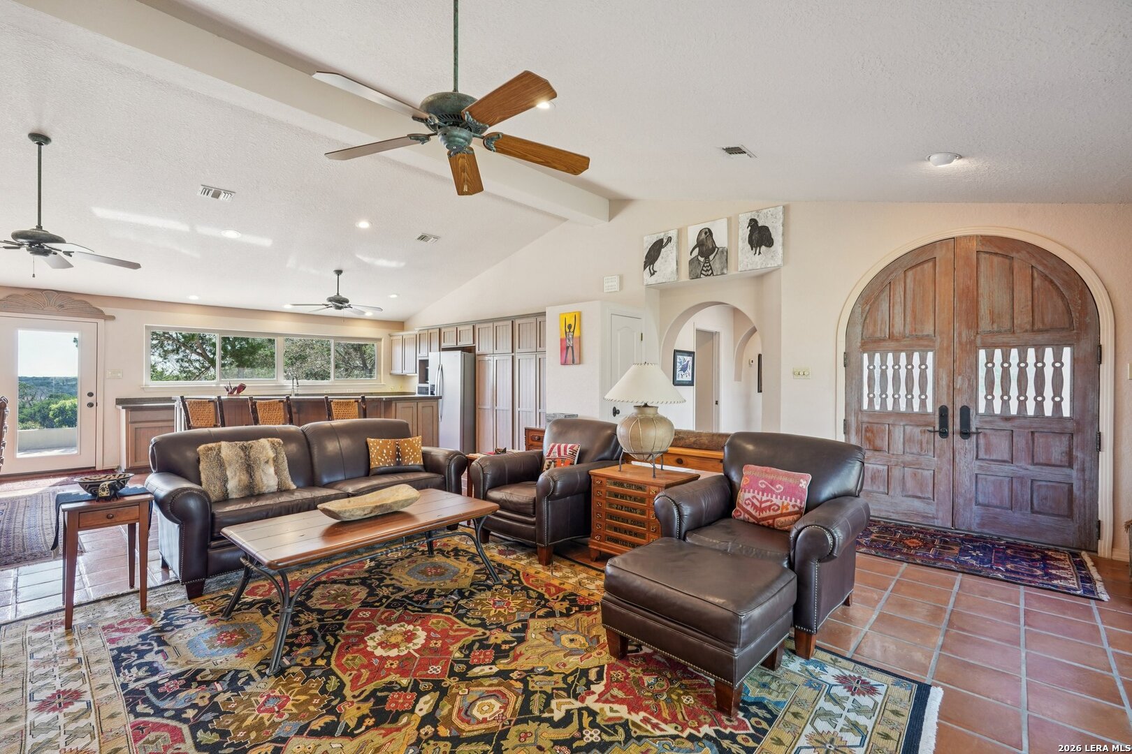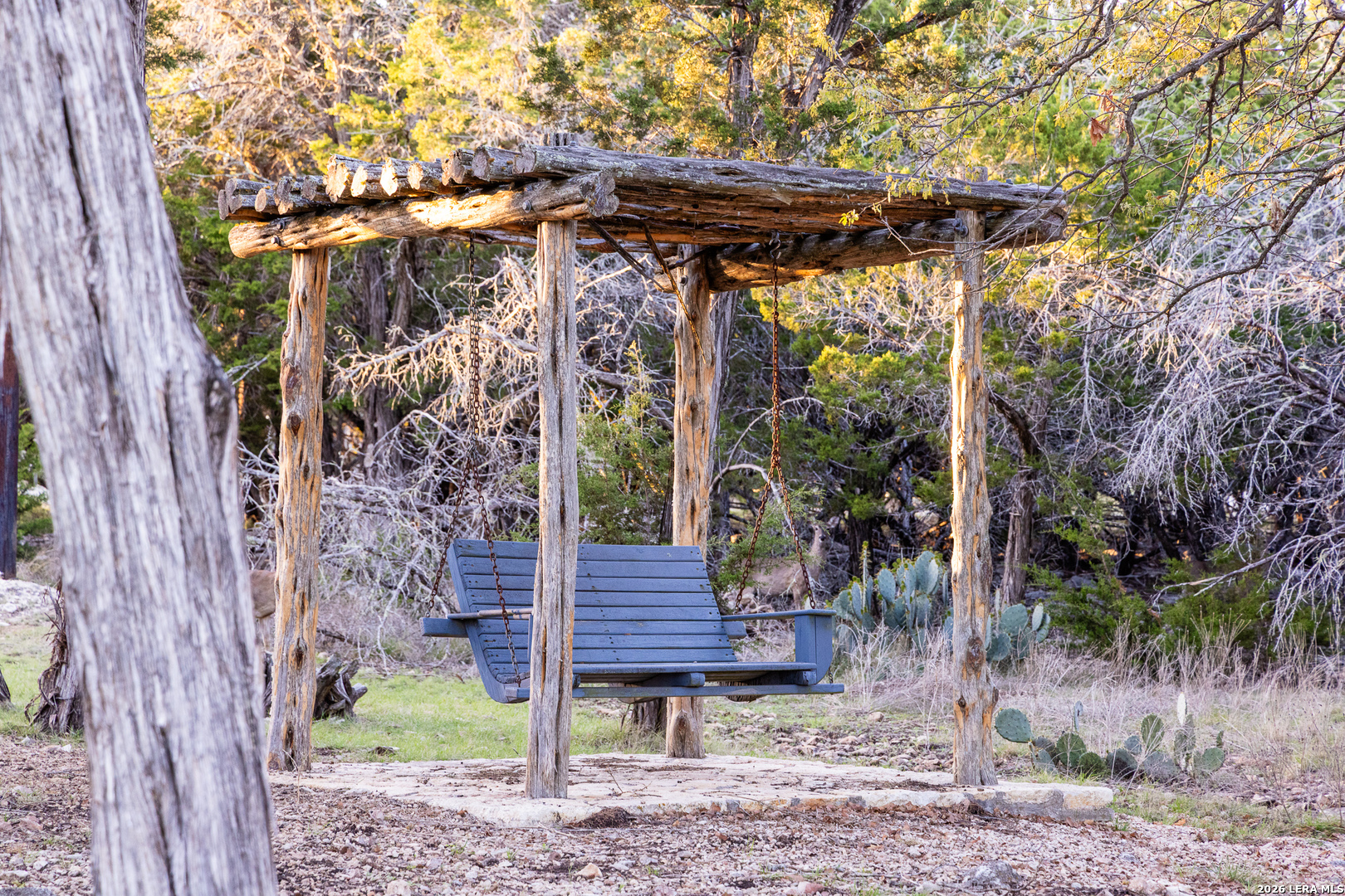 Set on 9.73 acres in Canyon Springs Ranch with extraordinary long-range Hill Country views and private Guadalupe River park access, this 1,892-sqft single-story home showcases Southwest and Santa Fe-inspired architecture with timeless character. The stucco exterior, standing-seam metal roof, flagstone patios, and side-entry two-car garage create classic curb appeal, while the expansive patio is perfectly positioned to capture the scenery. Inside, the open kitchen, living, and dining area features vaulted ceilings, Saltillo tile floors, a traditional kiva fireplace, and abundant windows framing the views. The split-bedroom layout lives like two primary suites, with the main suite offering two walk-in closets and nearby laundry. Artistic details include a hand-carved wood entry door and Talavera tile accents. Water is supplied by a rainwater harvesting system. The property includes 1.83 acres within Canyon Springs Ranch and ~7.9 acres that are minimally restricted, and sits adjacent to the community's 94-acre Wilderness Park.