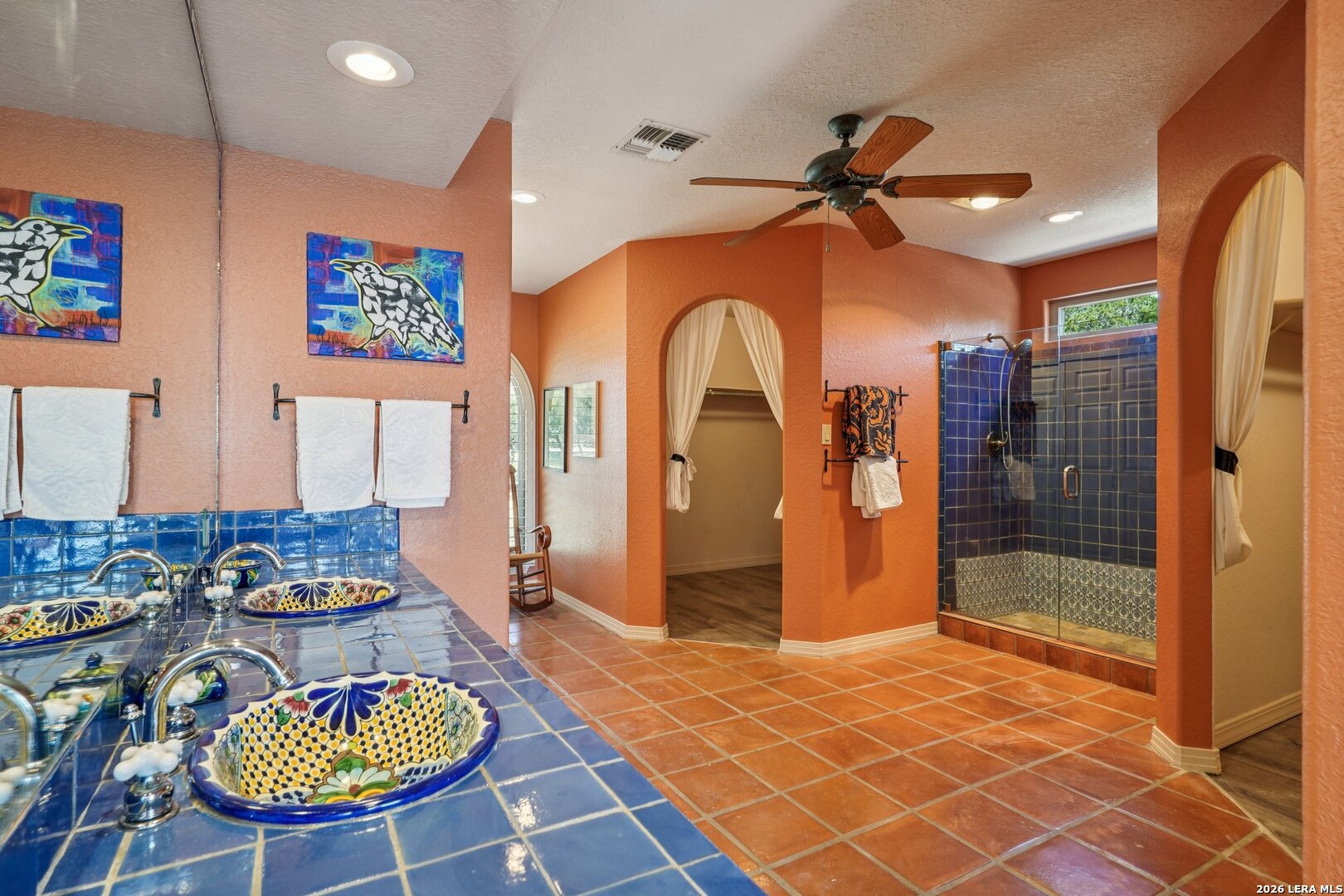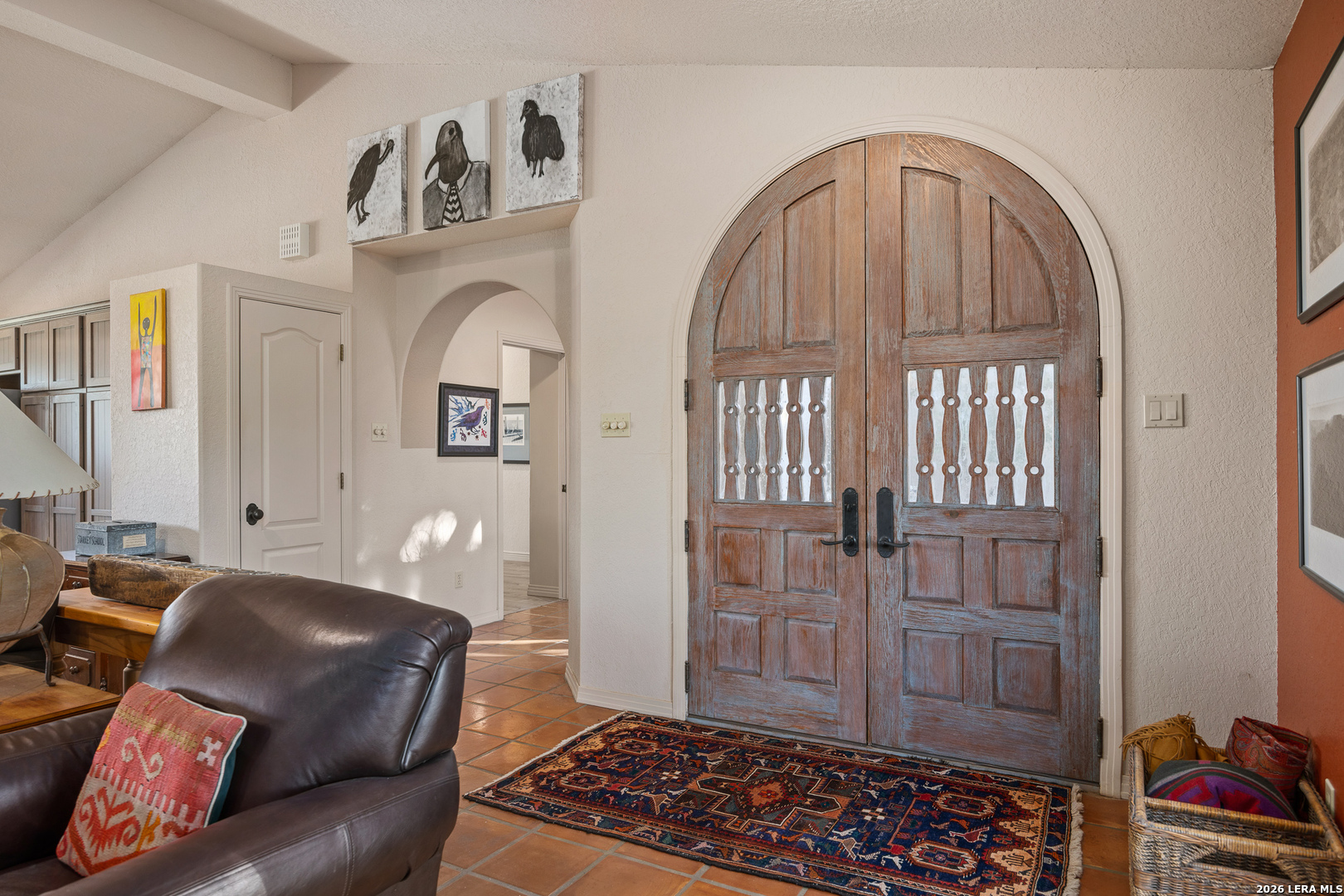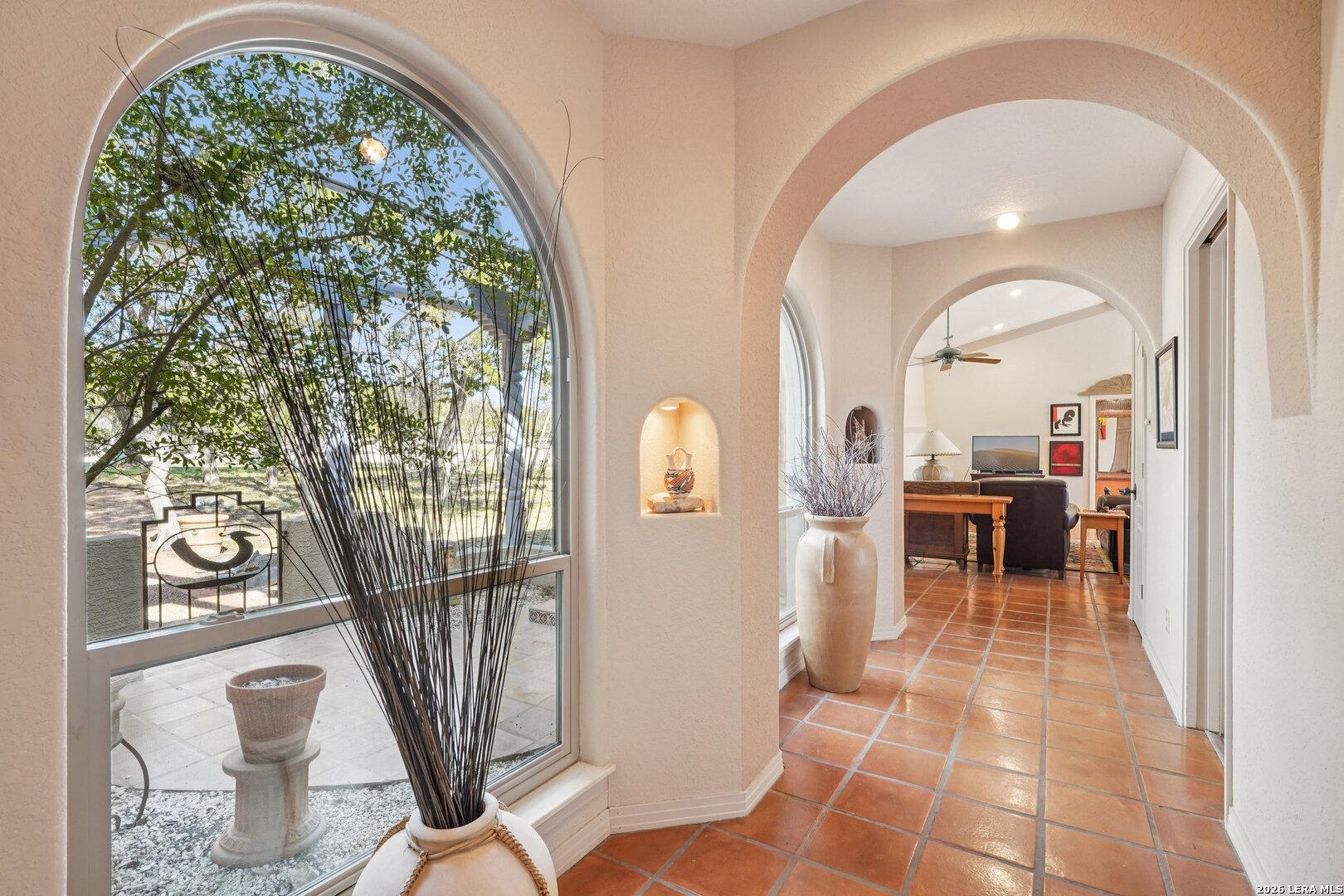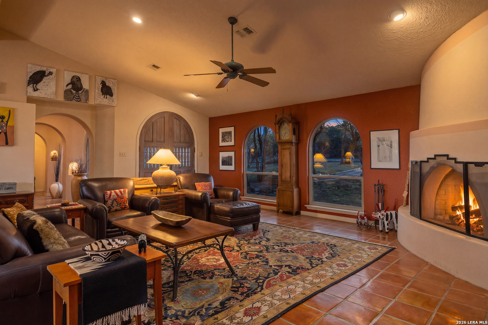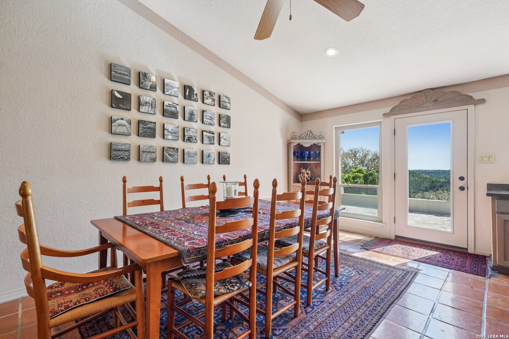 Set on 9.73 acres in Canyon Springs Ranch with extraordinary long-range Hill Country views and private Guadalupe River park access, this 1,892-sqft single-story home showcases Southwest and Santa Fe-inspired architecture with timeless character. The stucco exterior, standing-seam metal roof, flagstone patios, and side-entry two-car garage create classic curb appeal, while the expansive patio is perfectly positioned to capture the scenery. Inside, the open kitchen, living, and dining area features vaulted ceilings, Saltillo tile floors, a traditional kiva fireplace, and abundant windows framing the views. The split-bedroom layout lives like two primary suites, with the main suite offering two walk-in closets and nearby laundry. Artistic details include a hand-carved wood entry door and Talavera tile accents. Water is supplied by a rainwater harvesting system. The property includes 1.83 acres within Canyon Springs Ranch and ~7.9 acres that are minimally restricted, and sits adjacent to the community's 94-acre Wilderness Park.