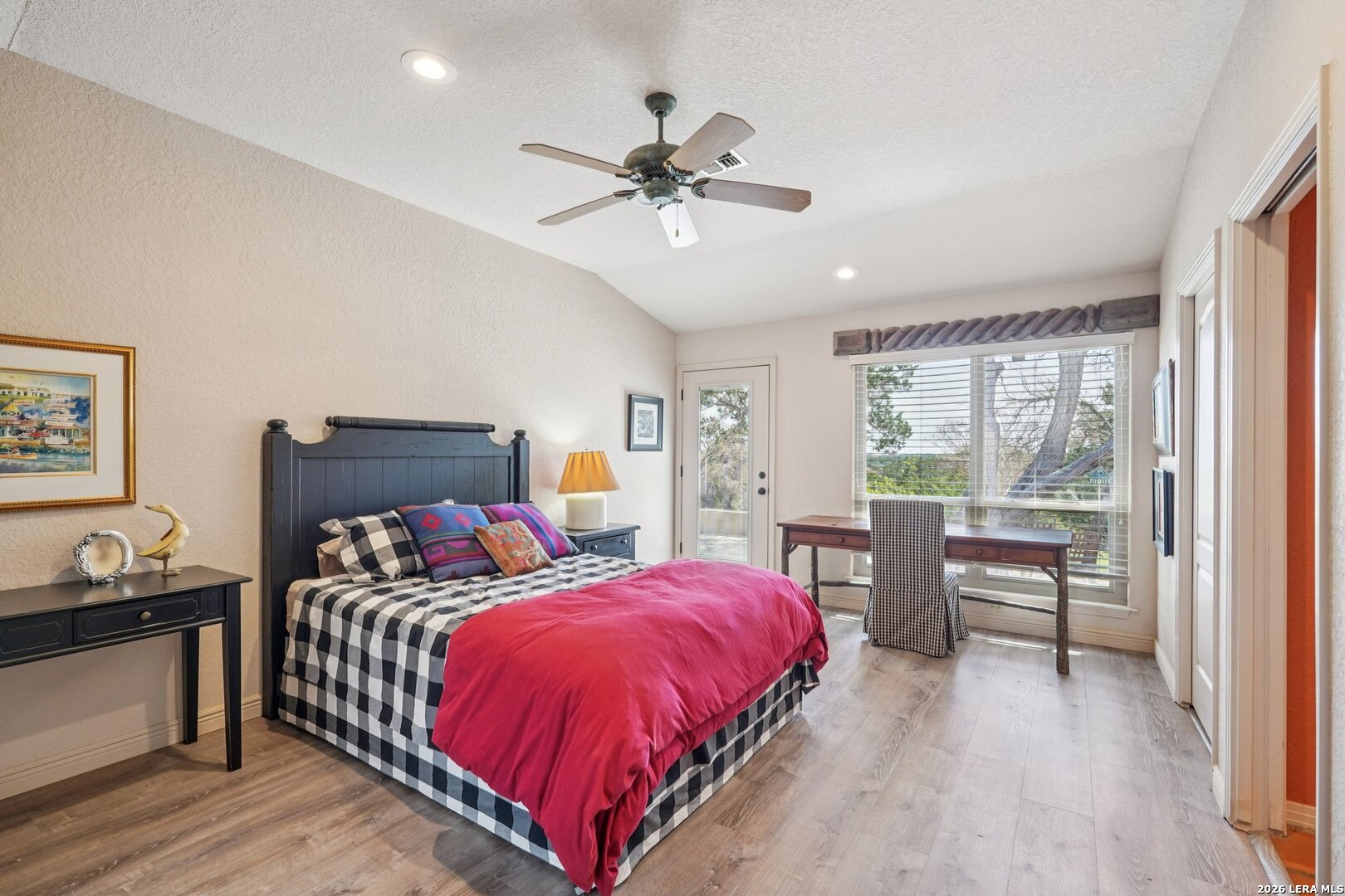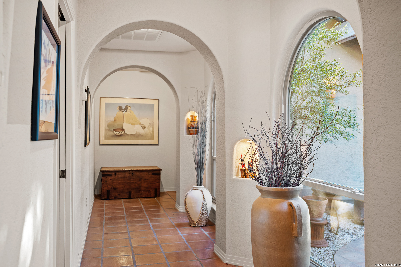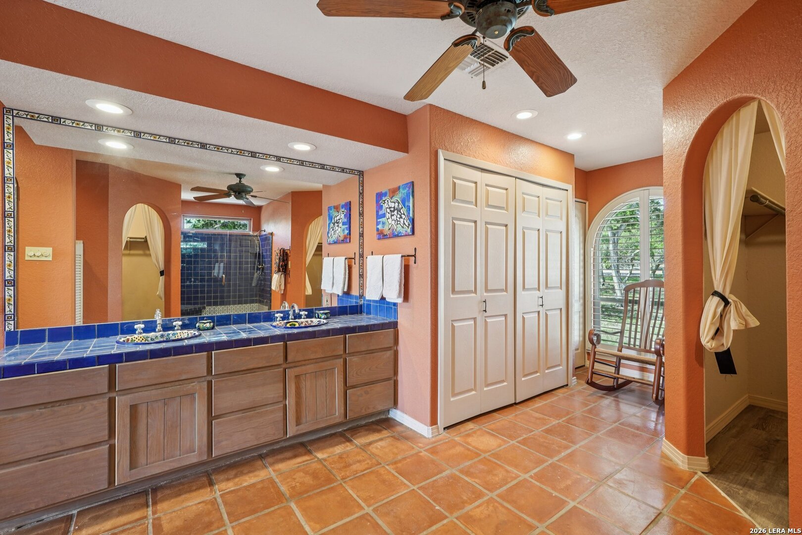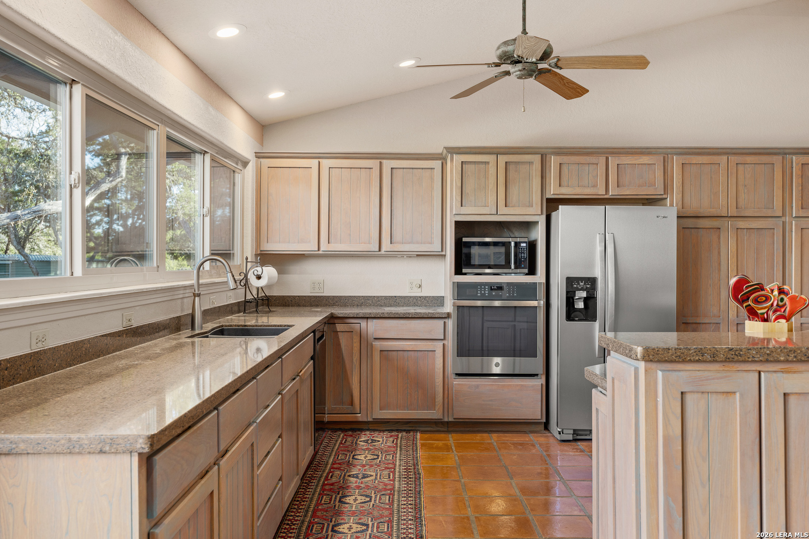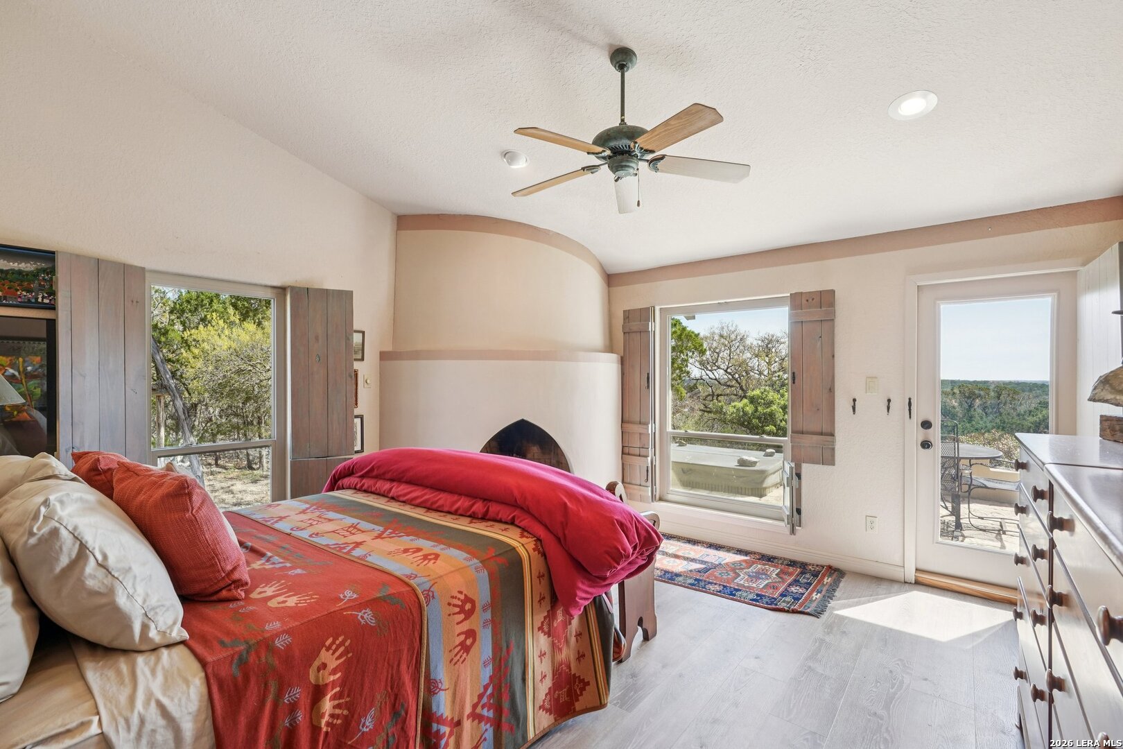Set on 9.73 acres in Canyon Springs Ranch with extraordinary long-range Hill Country views and private Guadalupe River park access, this 1,892-sqft single-story home showcases Southwest and Santa Fe-inspired architecture with timeless character. The stucco exterior, standing-seam metal roof, flagstone patios, and side-entry two-car garage create classic curb appeal, while the expansive patio is perfectly positioned to capture the scenery. Inside, the open kitchen, living, and dining area features vaulted ceilings, Saltillo tile floors, a traditional kiva fireplace, and abundant windows framing the views. The split-bedroom layout lives like two primary suites, with the main suite offering two walk-in closets and nearby laundry. Artistic details include a hand-carved wood entry door and Talavera tile accents. Water is supplied by a rainwater harvesting system. The property includes 1.83 acres within Canyon Springs Ranch and ~7.9 acres that are minimally restricted, and sits adjacent to the community's 94-acre Wilderness Park.