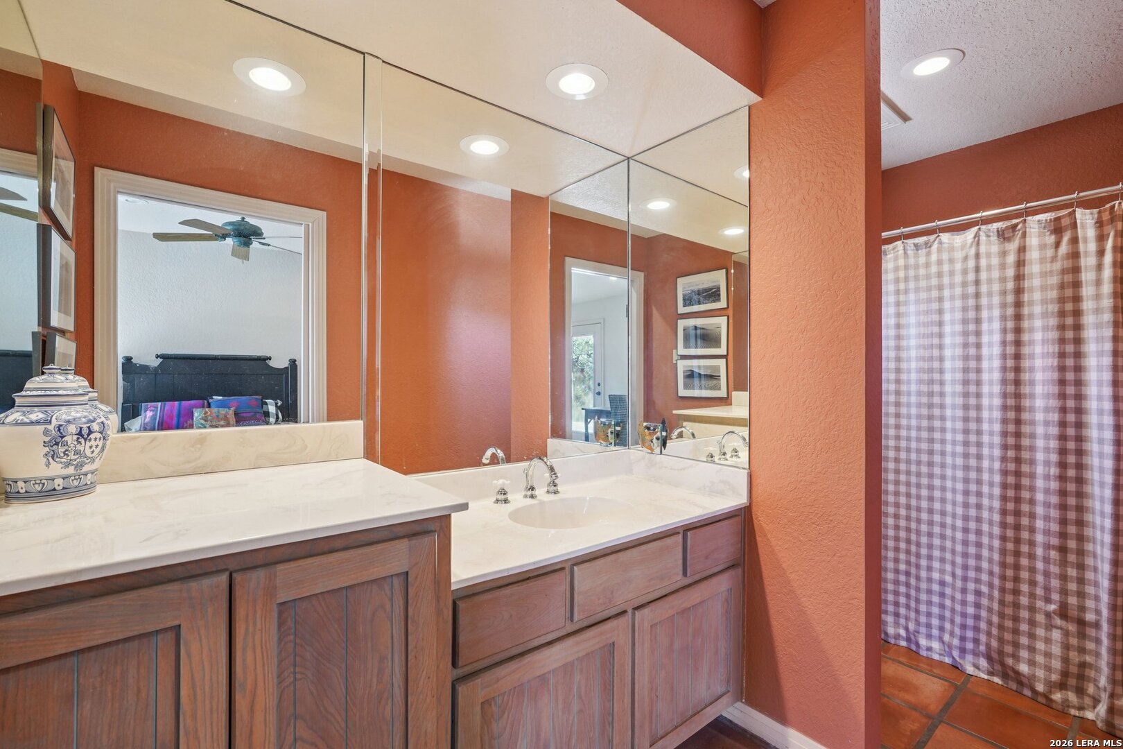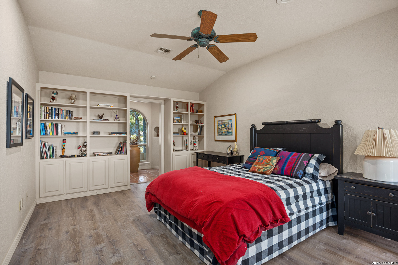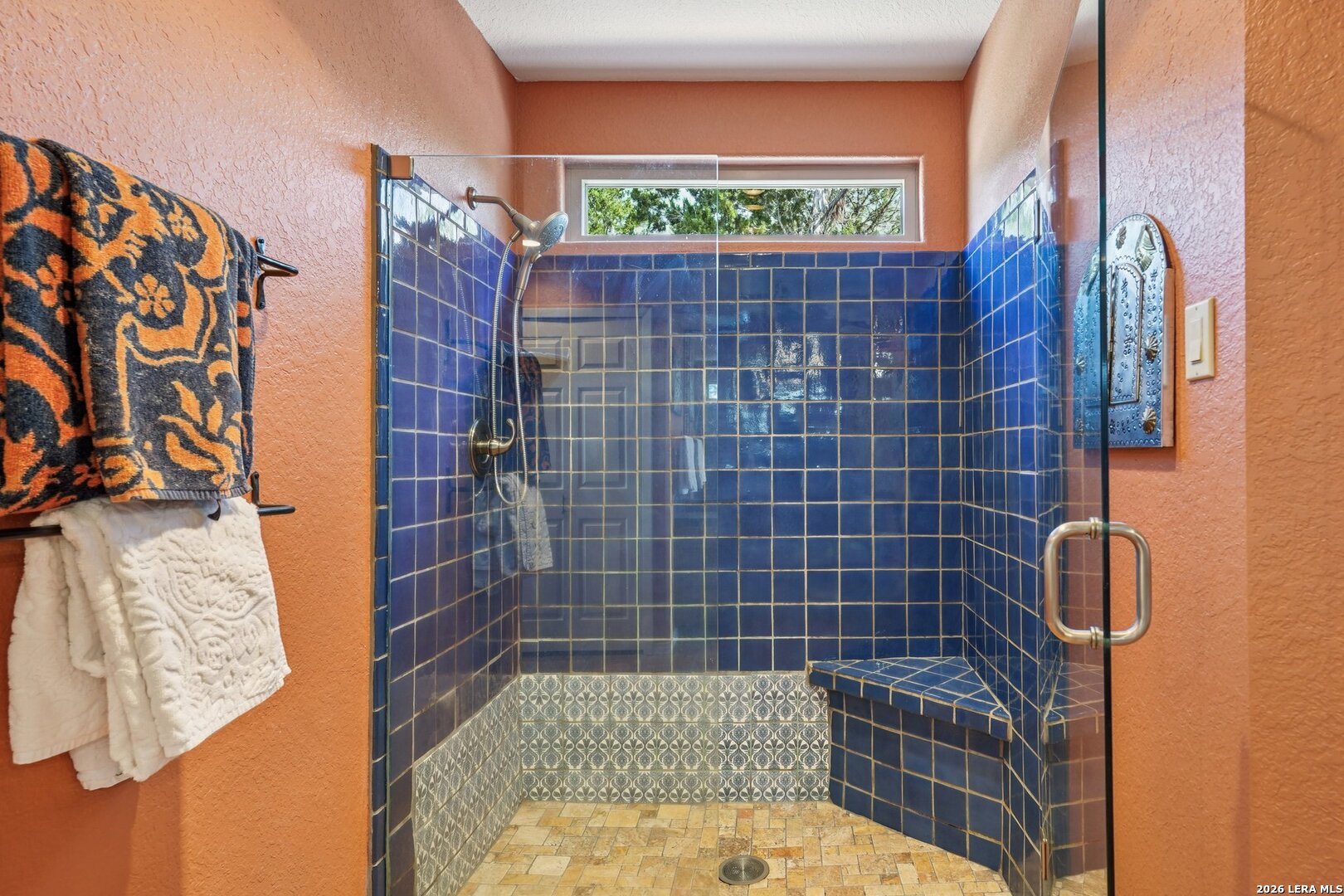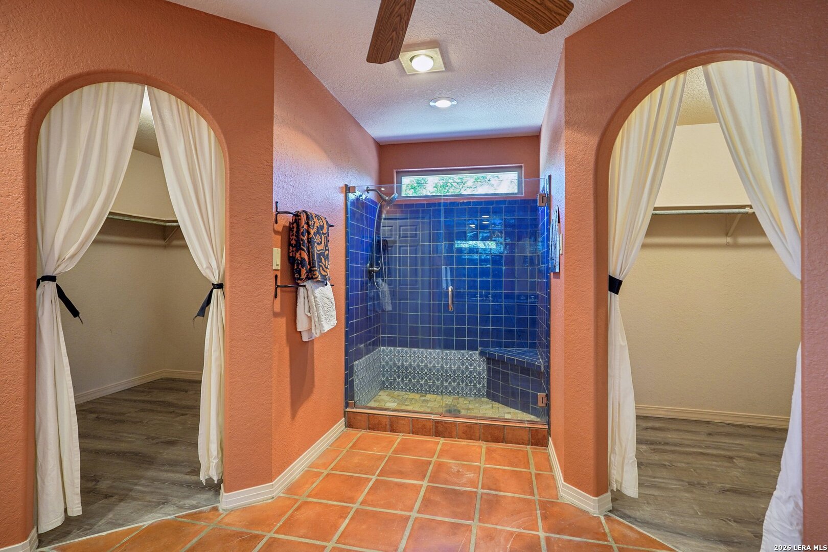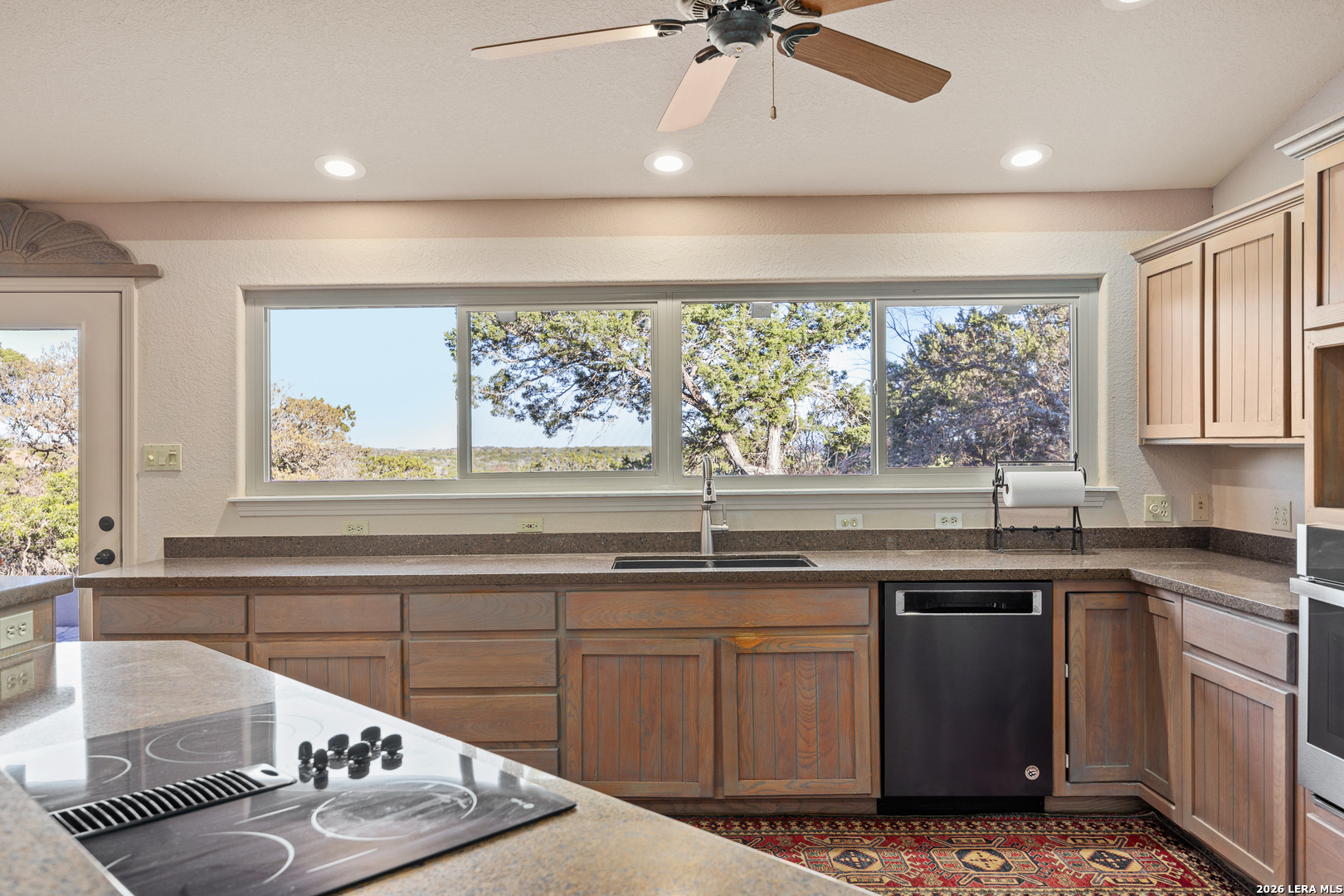 Set on 9.73 acres in Canyon Springs Ranch with extraordinary long-range Hill Country views and private Guadalupe River park access, this 1,892-sqft single-story home showcases Southwest and Santa Fe-inspired architecture with timeless character. The stucco exterior, standing-seam metal roof, flagstone patios, and side-entry two-car garage create classic curb appeal, while the expansive patio is perfectly positioned to capture the scenery. Inside, the open kitchen, living, and dining area features vaulted ceilings, Saltillo tile floors, a traditional kiva fireplace, and abundant windows framing the views. The split-bedroom layout lives like two primary suites, with the main suite offering two walk-in closets and nearby laundry. Artistic details include a hand-carved wood entry door and Talavera tile accents. Water is supplied by a rainwater harvesting system. The property includes 1.83 acres within Canyon Springs Ranch and ~7.9 acres that are minimally restricted, and sits adjacent to the community's 94-acre Wilderness Park.