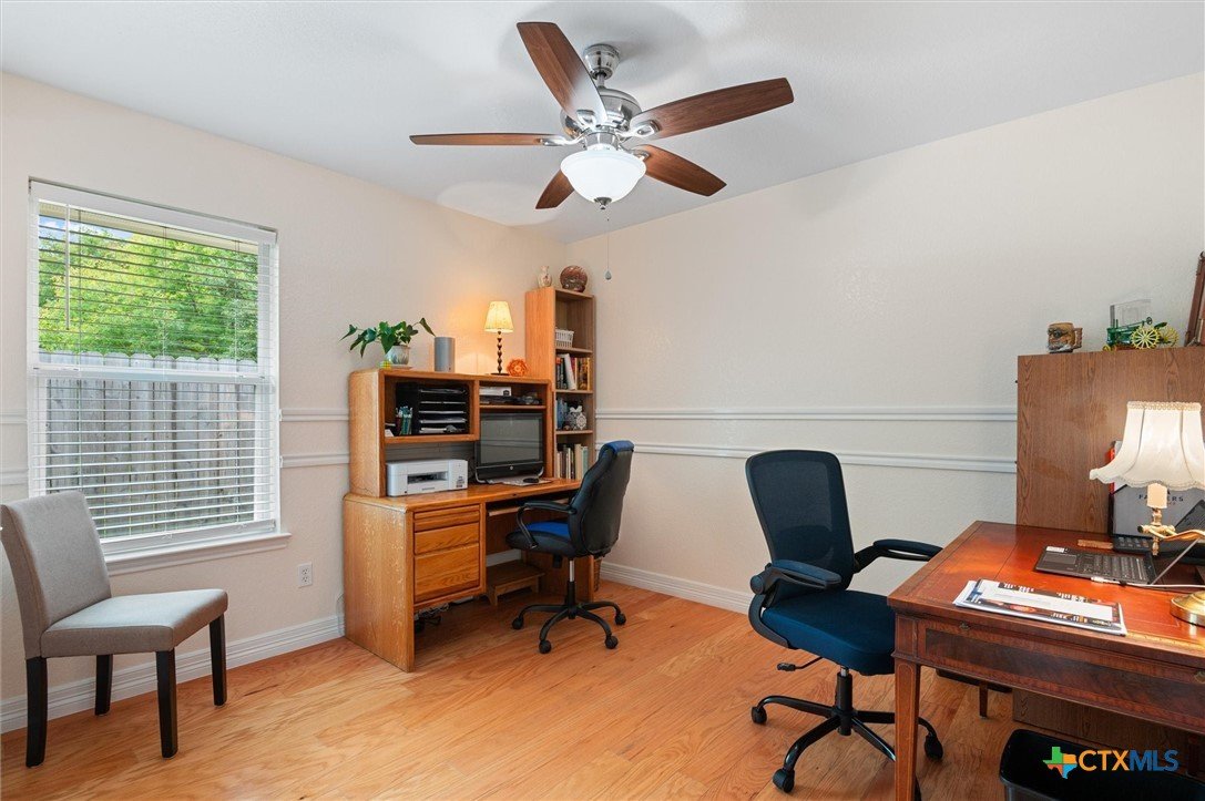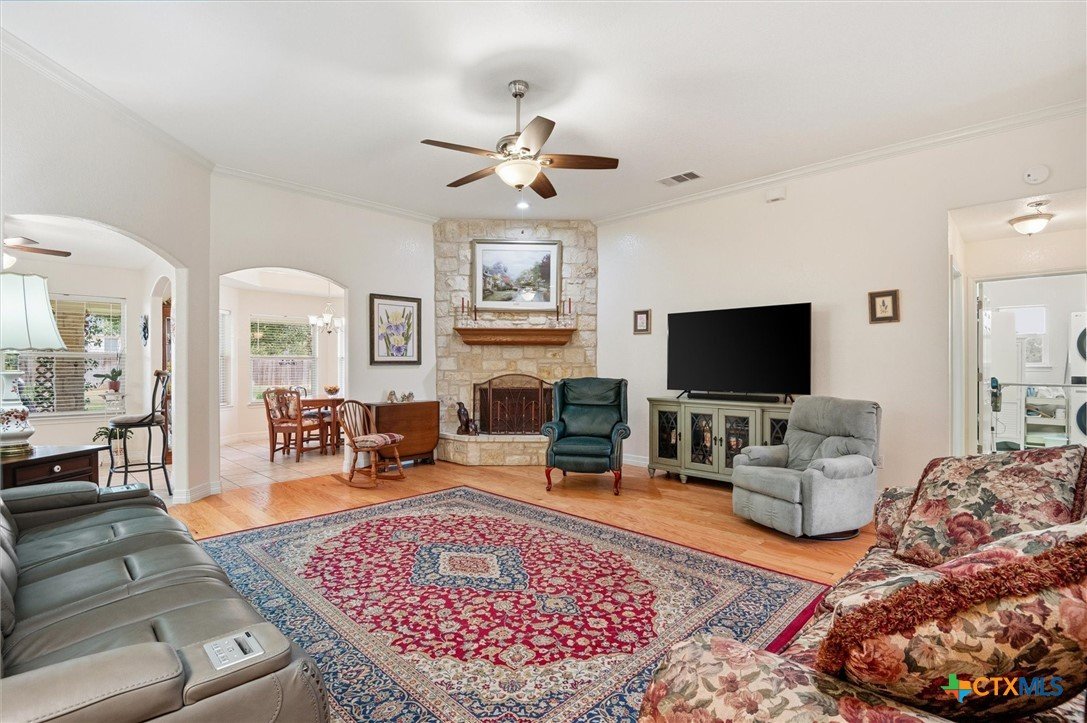 Beautiful spacious home with 4 bedrooms. Nice open living room with stone fireplace and high ceilings with crown molding. Open to kitchen with quartz counters and dining room. Fabulous windows with views of the pretty back yard from most of the home. Main bedroom is separate and spacious with light airy feeling. Walk in closet and dual vanity. The best part is the outdoor large yard with room to run, play and entertain, covered patio and 2 out buildings for great storage. Double side entry garage attached to the home and nice trees and landscaping. Fenced and ready for the holidays.
