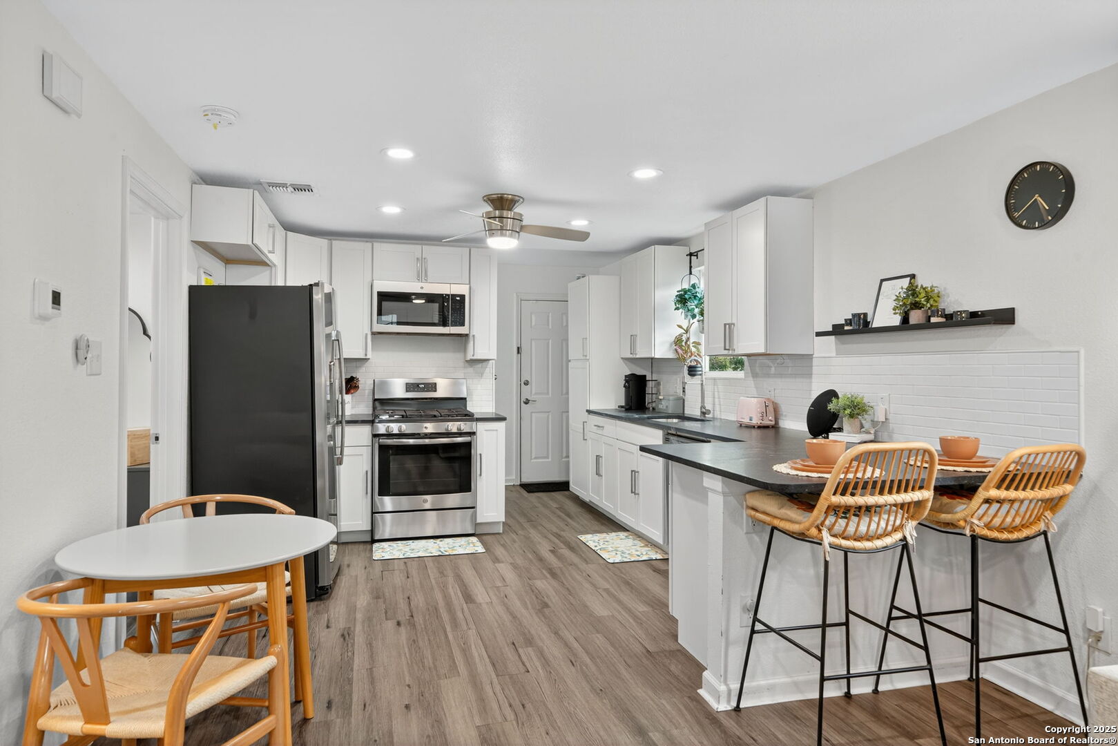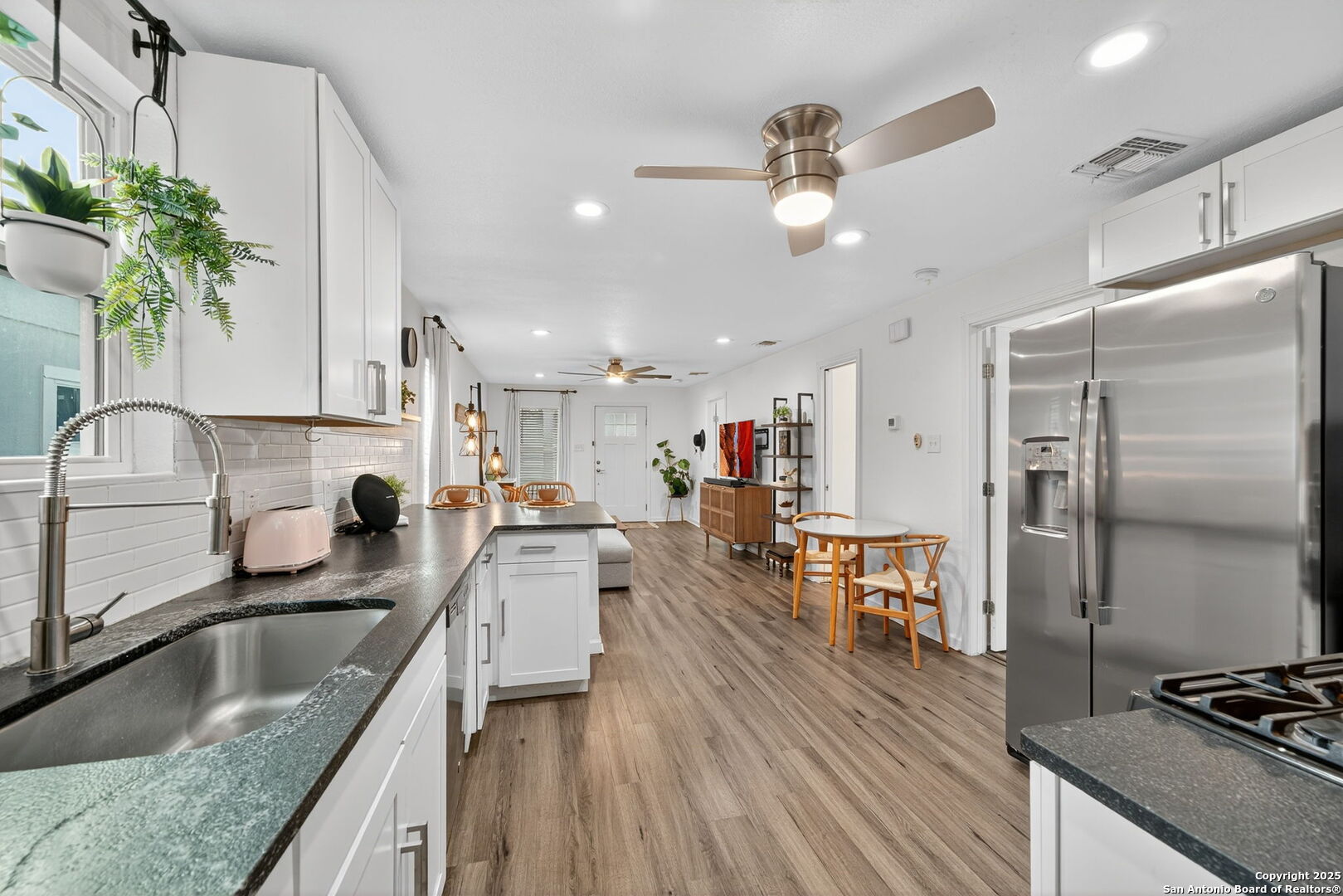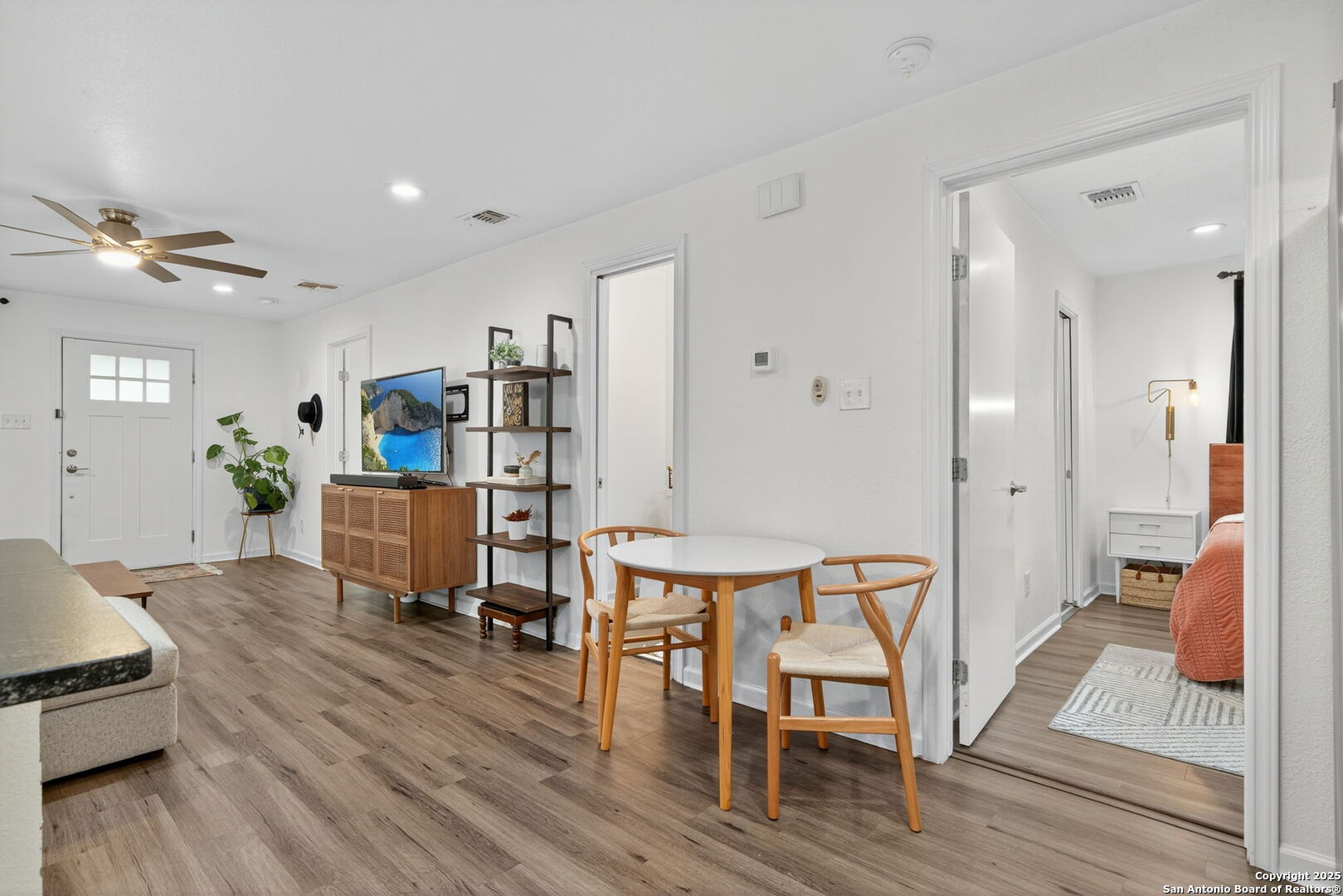 Welcome to this beautifully updated 2-bedroom, 2-bath home offering stylish, low-maintenance living in one of the city's most desirable central locations! Perfectly situated between Monte Vista, Trinity University, The St. Mary's Strip, and Tobin Hill/The Pearl, this home puts you within walking distance of iconic dining, vibrant nightlife, charming cafes, green spaces, and everyday conveniences. Step inside to discover easy-maintenance vinyl flooring throughout-no carpet anywhere-creating a clean, cohesive feel from room to room. The thoughtfully designed kitchen features stainless steel appliances, gas cooking, sleek white cabinetry, and gorgeous leathered granite countertops, making it both functional and stunning. Both bathrooms have been tastefully updated with modern finishes, offering a fresh, contemporary look. The inviting layout flows effortlessly, and the charming covered front porch with fenced-in yard provides the perfect spot to unwind, enjoy morning coffee, or relax after a day exploring the nearby neighborhood favorites. Whether you're a first-time buyer, downsizing, or searching for an investment property, this home delivers convenience, character, and modern style-all in a location that simply can't be beat. Don't miss your chance to make it yours!