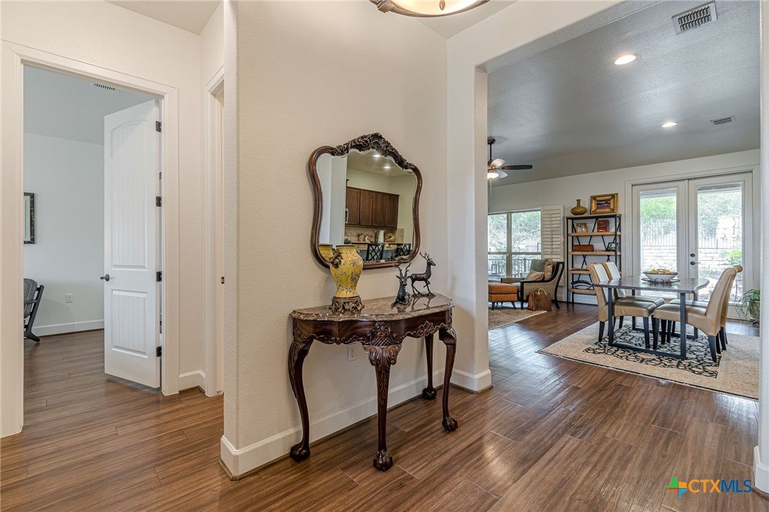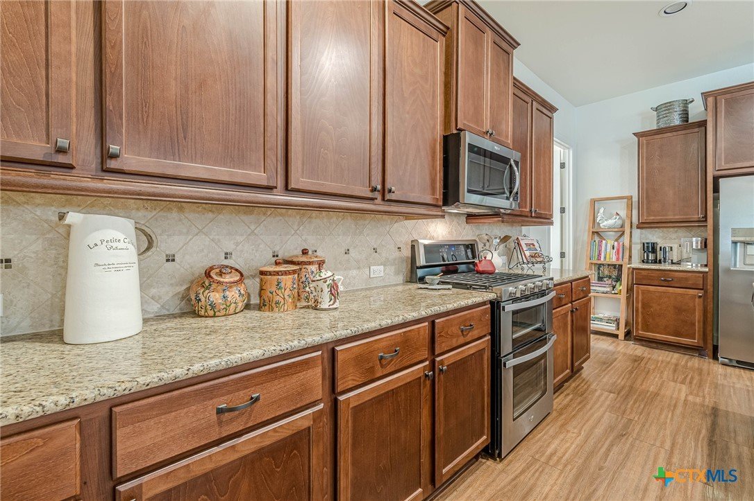 Unique home - Unique location - Start living your best life in this beautiful 55 plus community - at Kissing Tree in San Marcos. This house has all you can possibly want! The open kitchen/living/dining space has plenty of natural light - and offers a spacious gathering spot for friends and family. Beautiful finish outs with granite counters, warm brown stained cabinetry and built in appliance. The secondary bedroom is oversized and offers room for a large guest suite or a queen bed and a desk space - or it can be used as a den - so many options! The laundry room is a dream laundry room, plenty of storage and a utility sink. The oversized main bedroom has beautiful arch shutters, a spacious bathroom with large walk in shower. But the best part of this home is the private backyard with a large covered back porch - No rear neighbor, wooded trees views. Call now to see this beautiful. home!